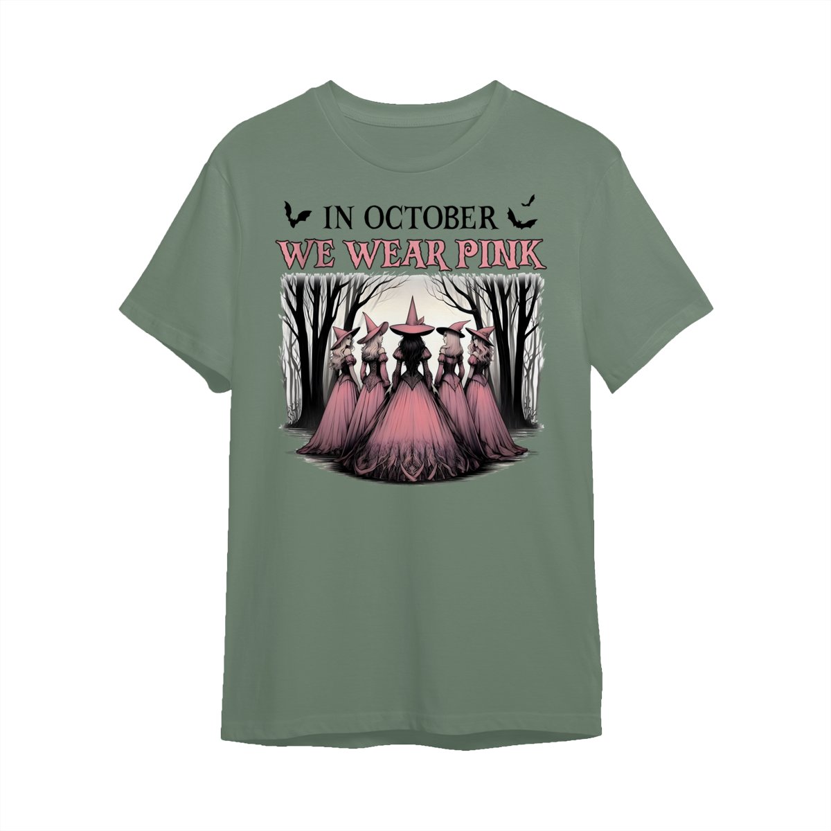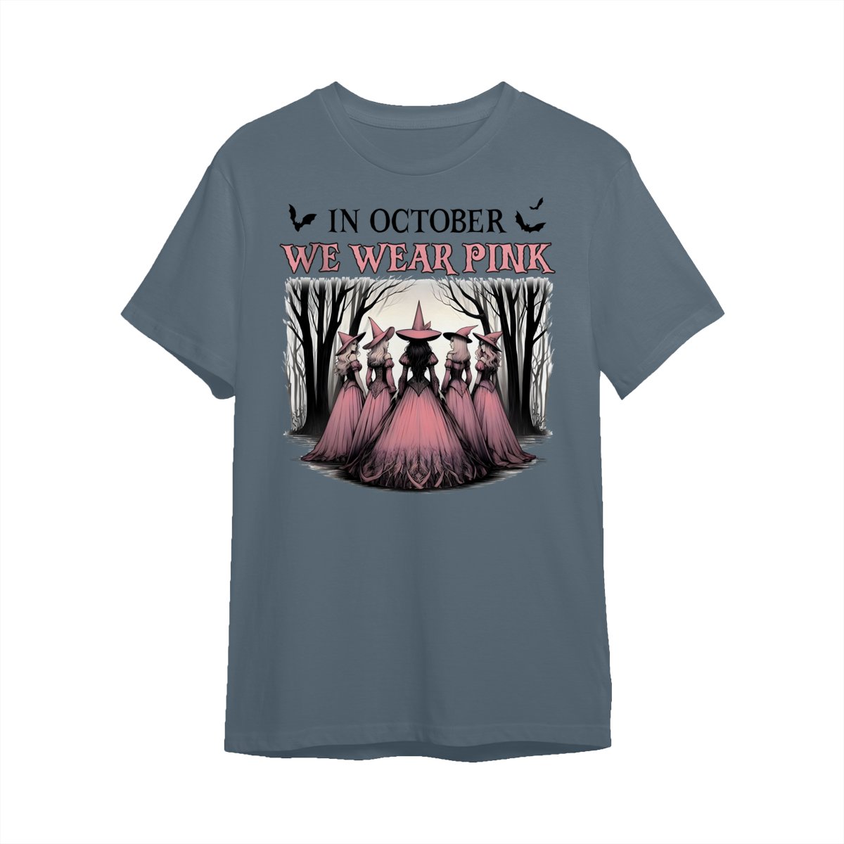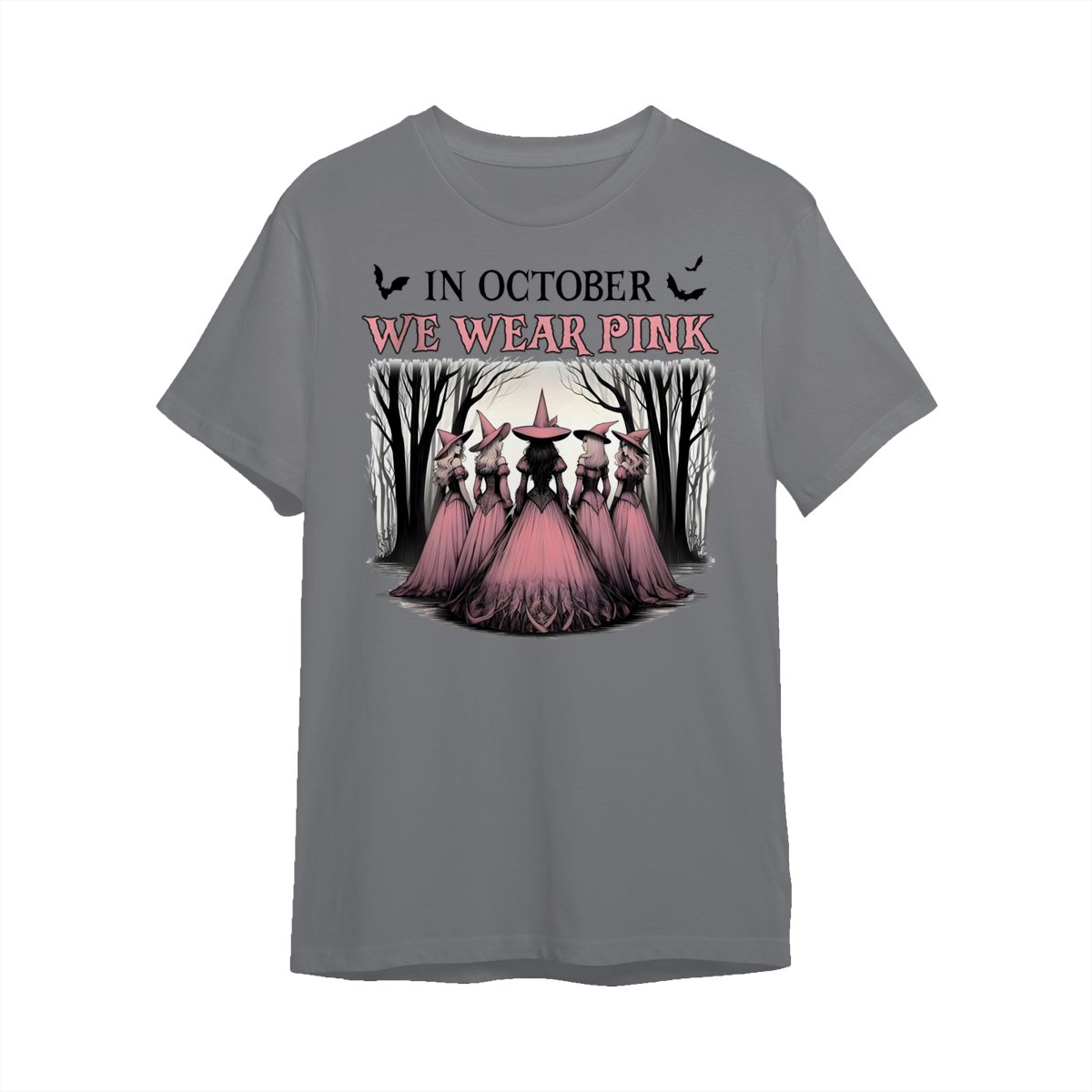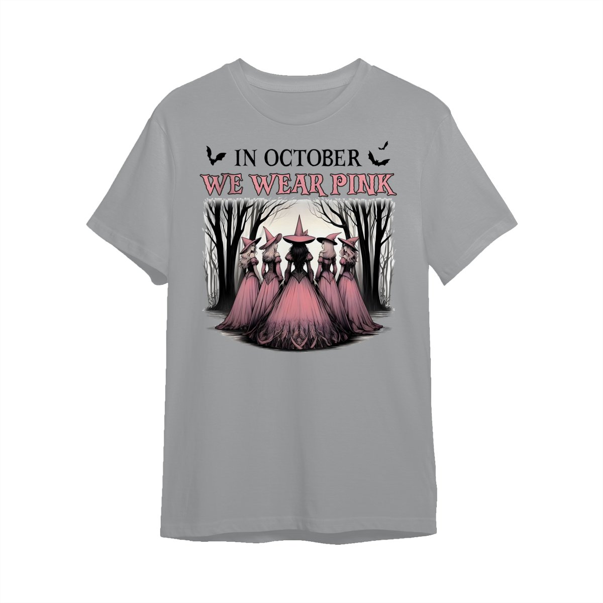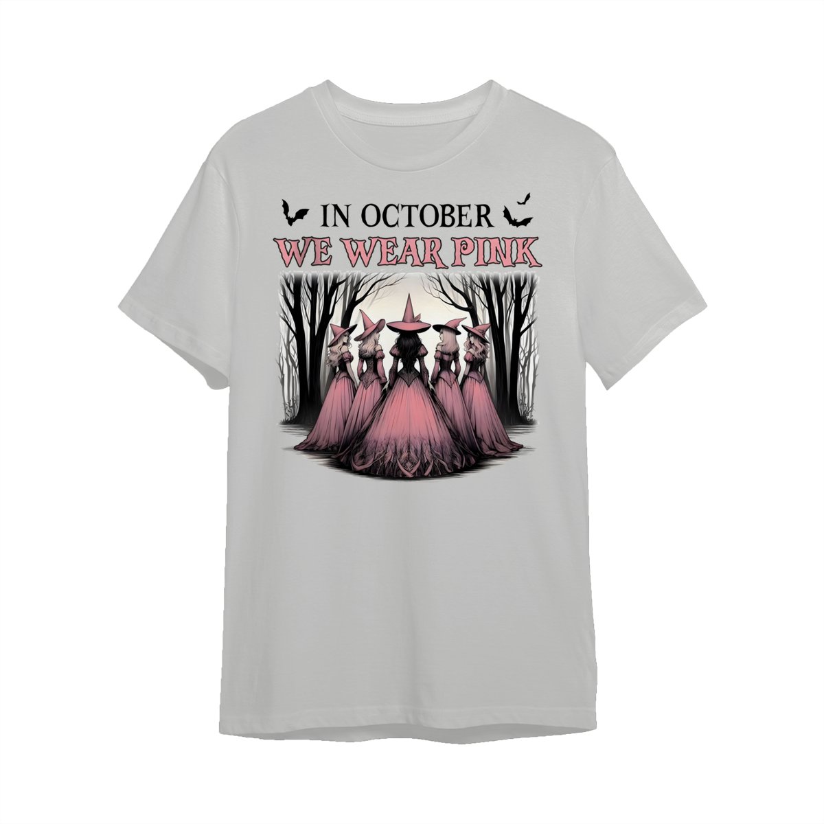 In October We Wear Pink Shirt, Breast Cancer Awareness Tee, Retro Halloween Ghost T-Shirt, Cute Witch Top, Pink Ribbon Support Gift Idea Design 0