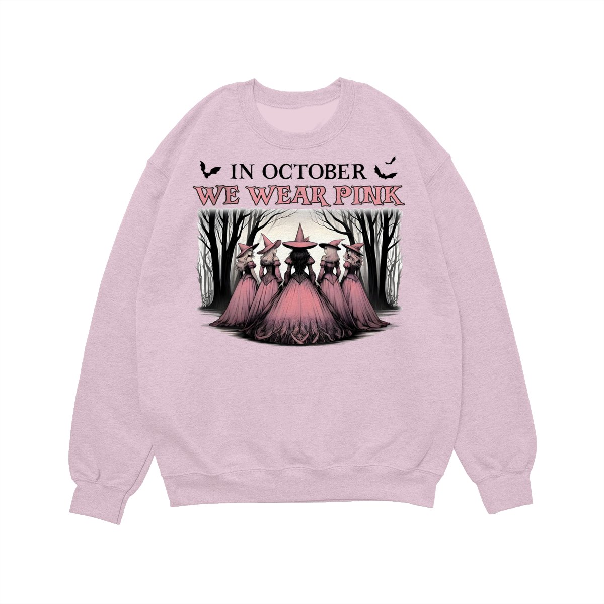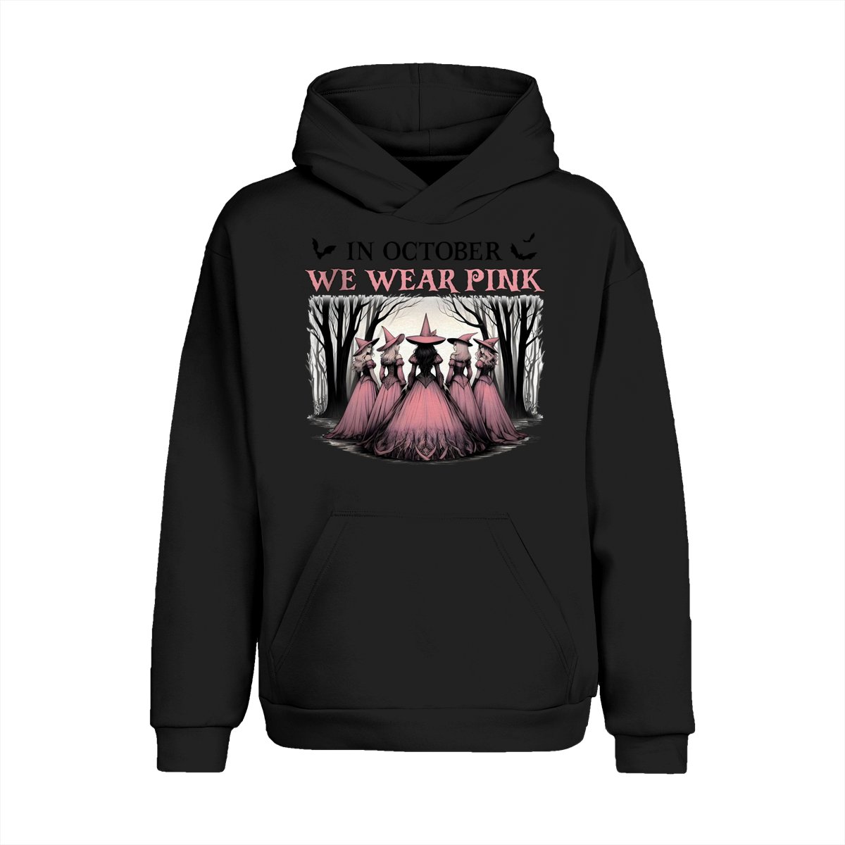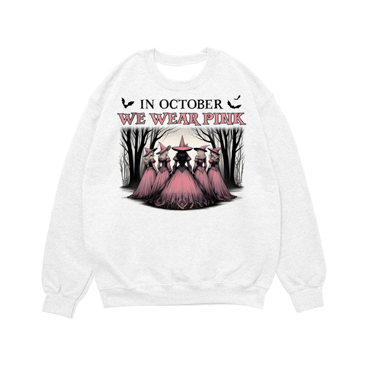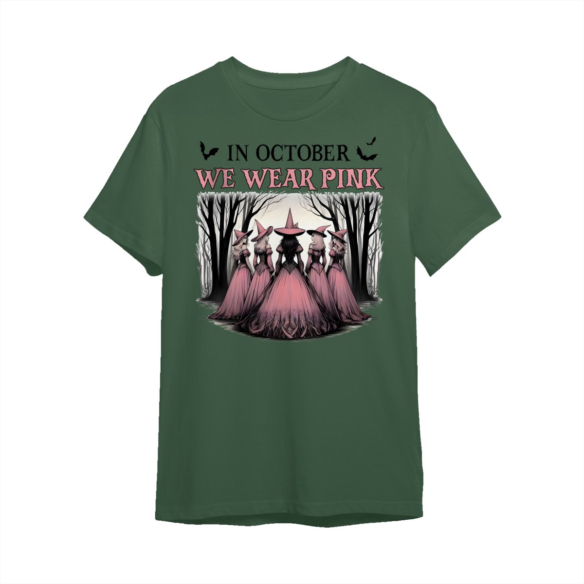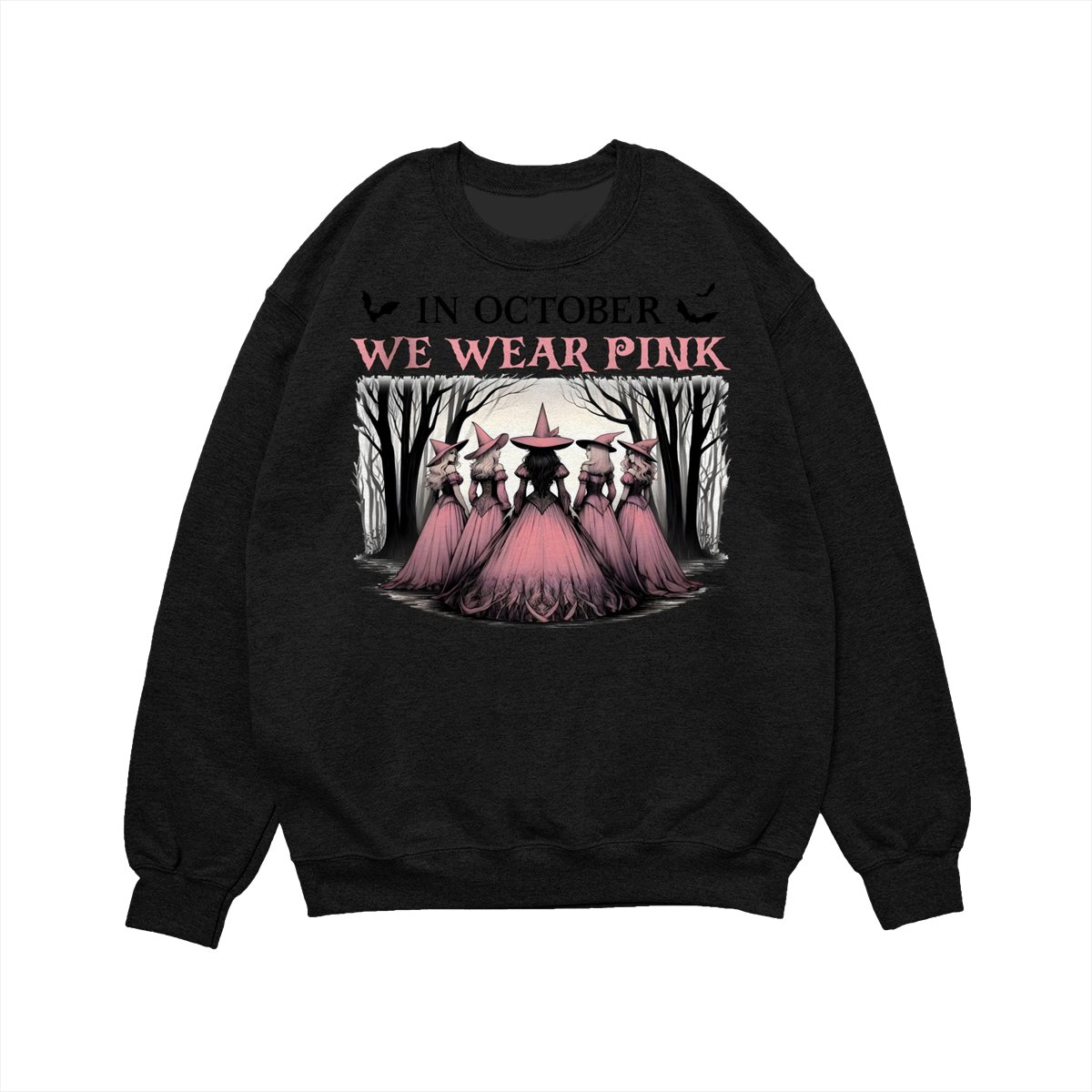In October We Wear Pink Shirt, Breast Cancer Awareness Tee, Retro Halloween Ghost T-Shirt, Cute Witch Top, Pink Ribbon Support Gift Idea Design 0