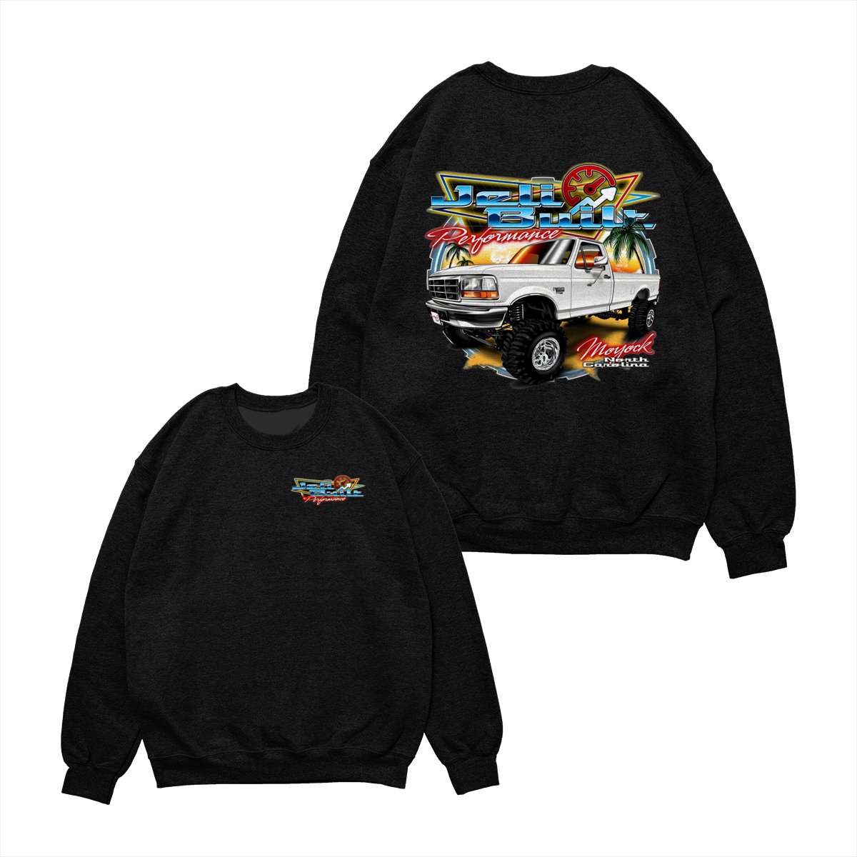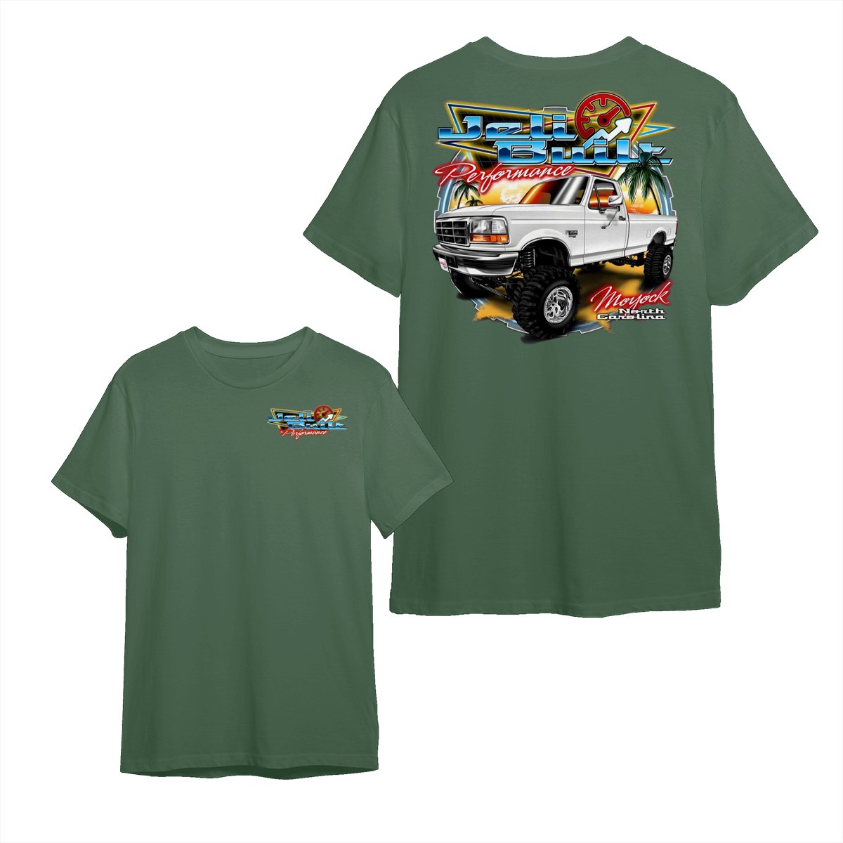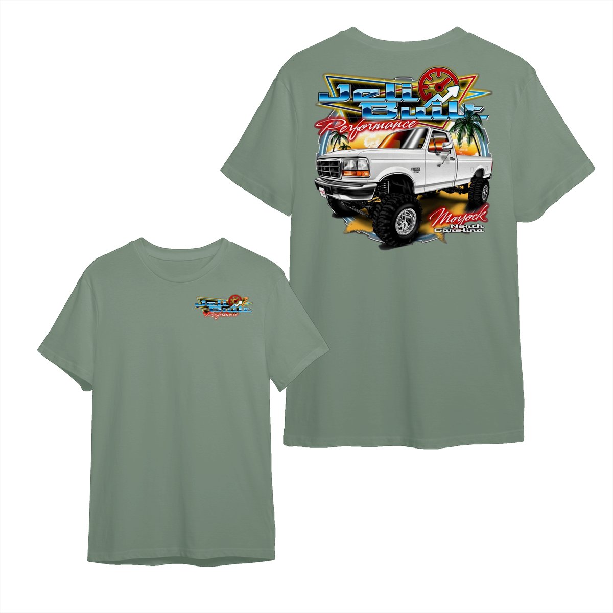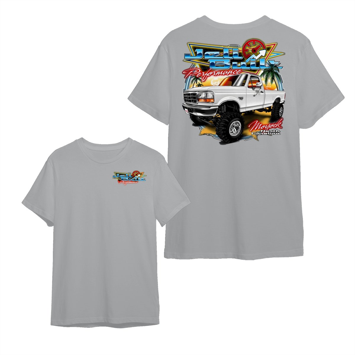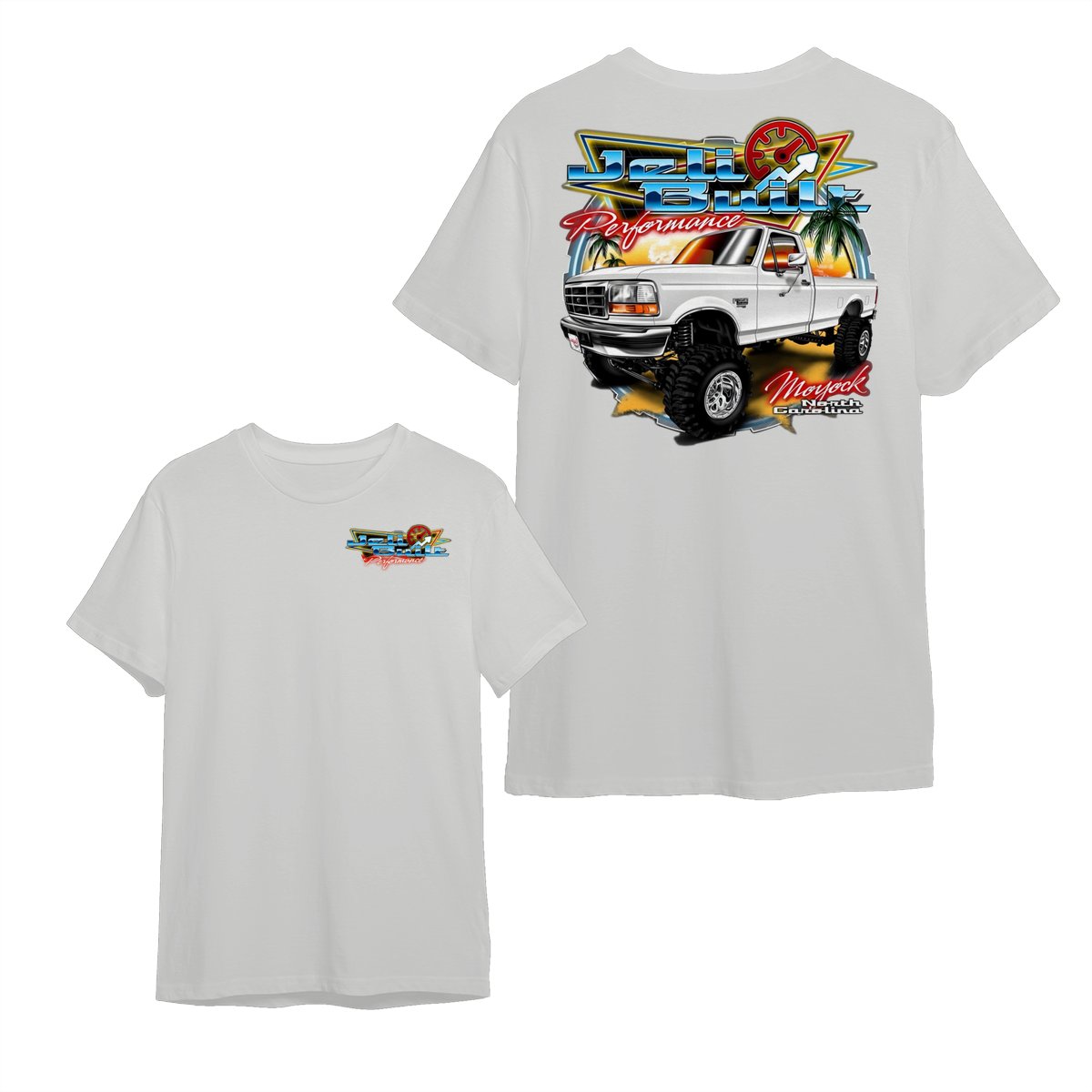 Jam Built Performance T-Shirt – White Lifted Truck Graphic Tee, Sunset and Palm Trees Design, Black Car Enthusiast Shirt for Mechanics and Off-Road Fans, Gift for Truck Lovers