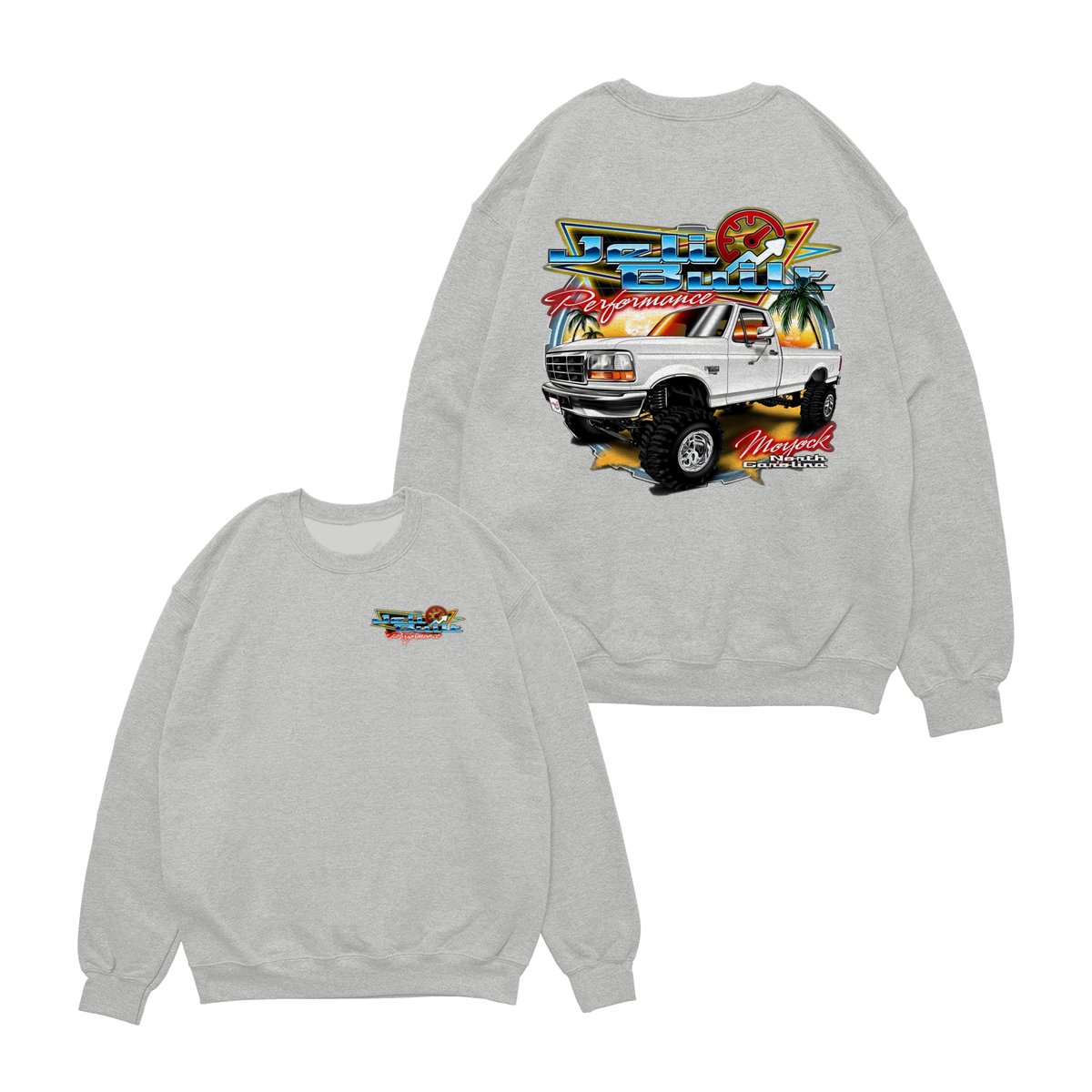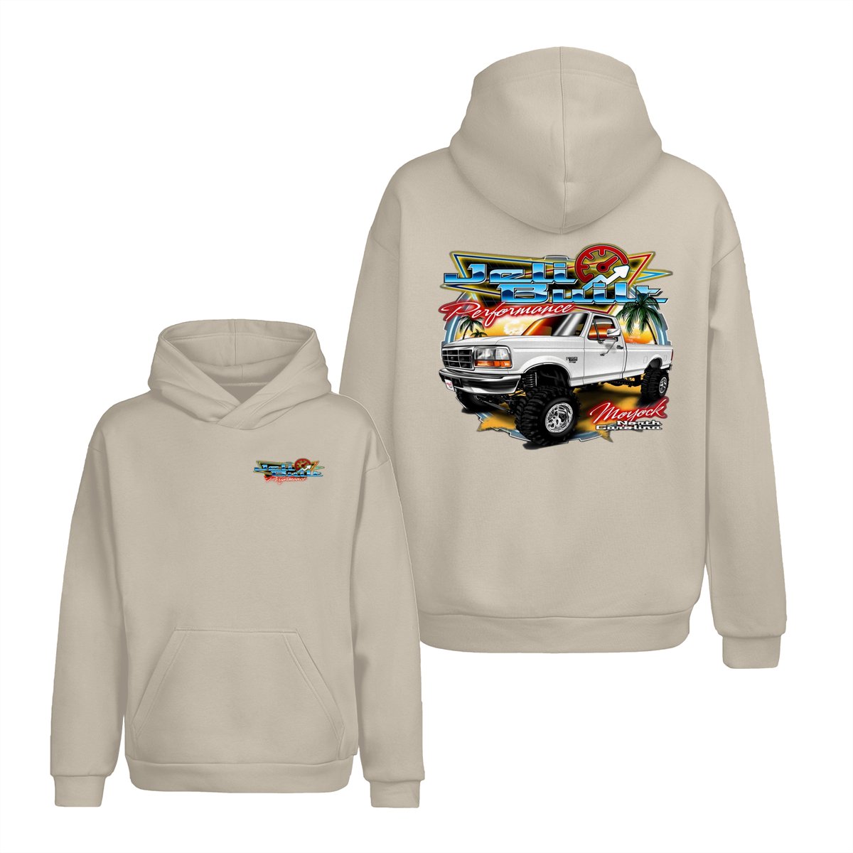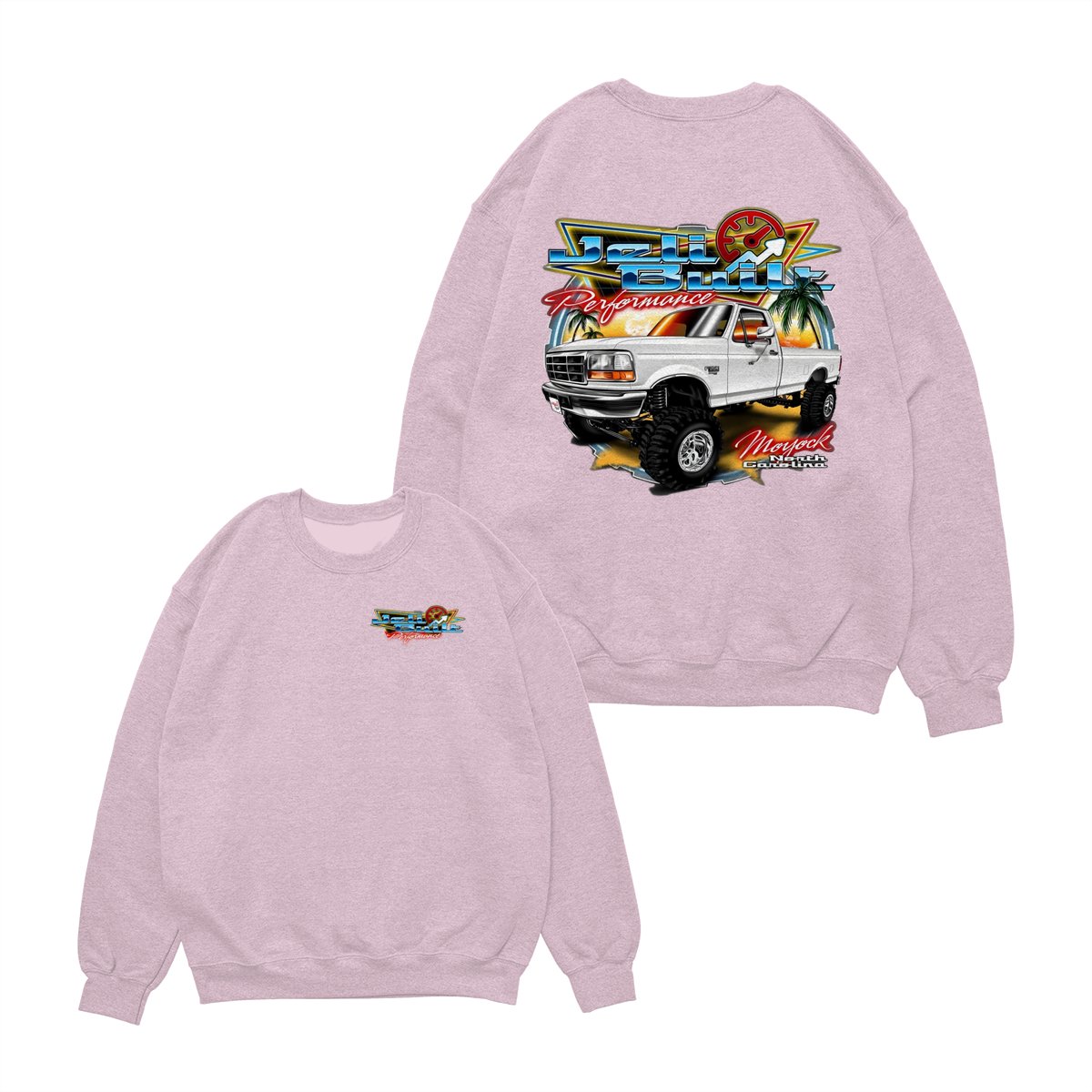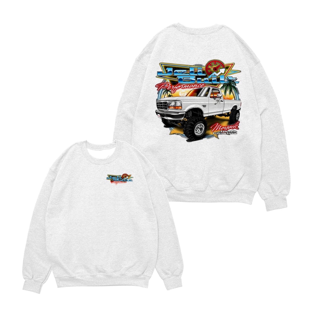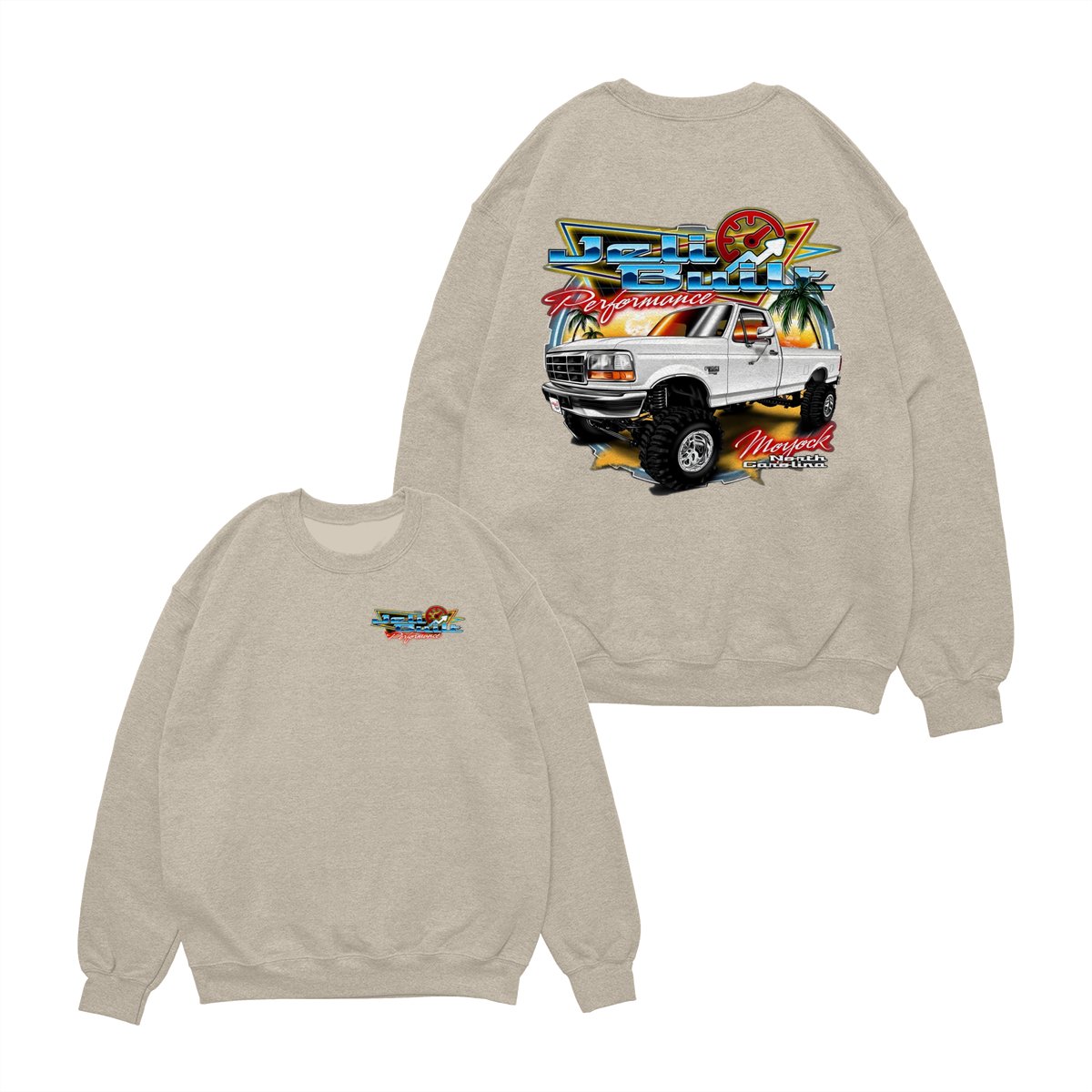 Jam Built Performance T-Shirt – White Lifted Truck Graphic Tee, Sunset and Palm Trees Design, Black Car Enthusiast Shirt for Mechanics and Off-Road Fans, Gift for Truck Lovers