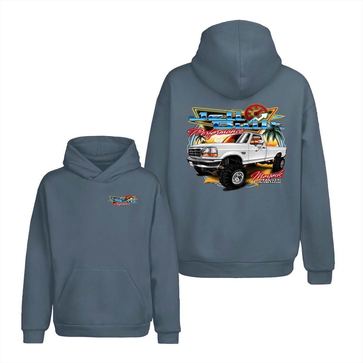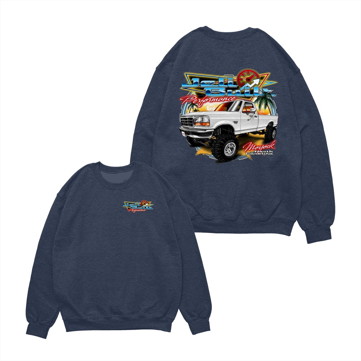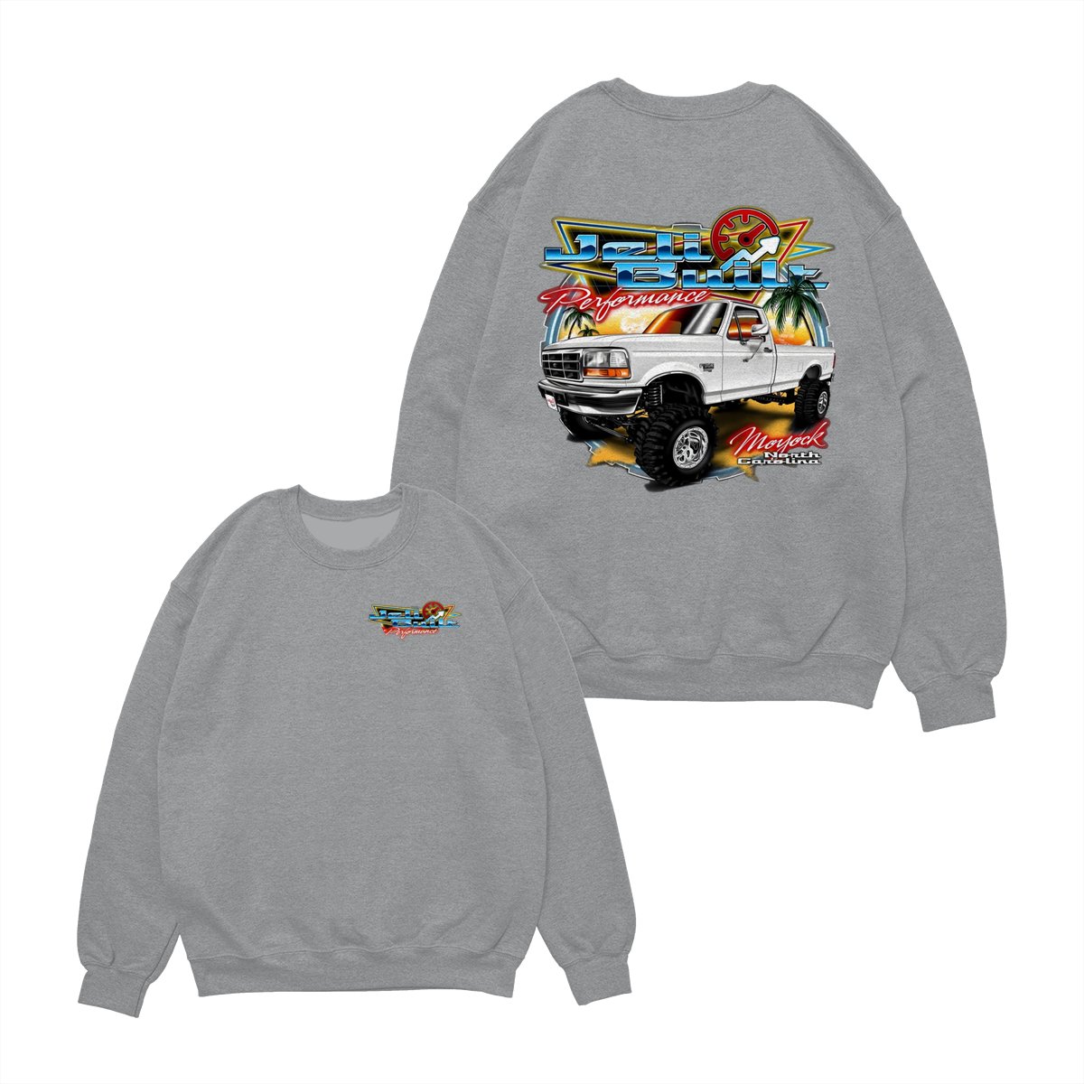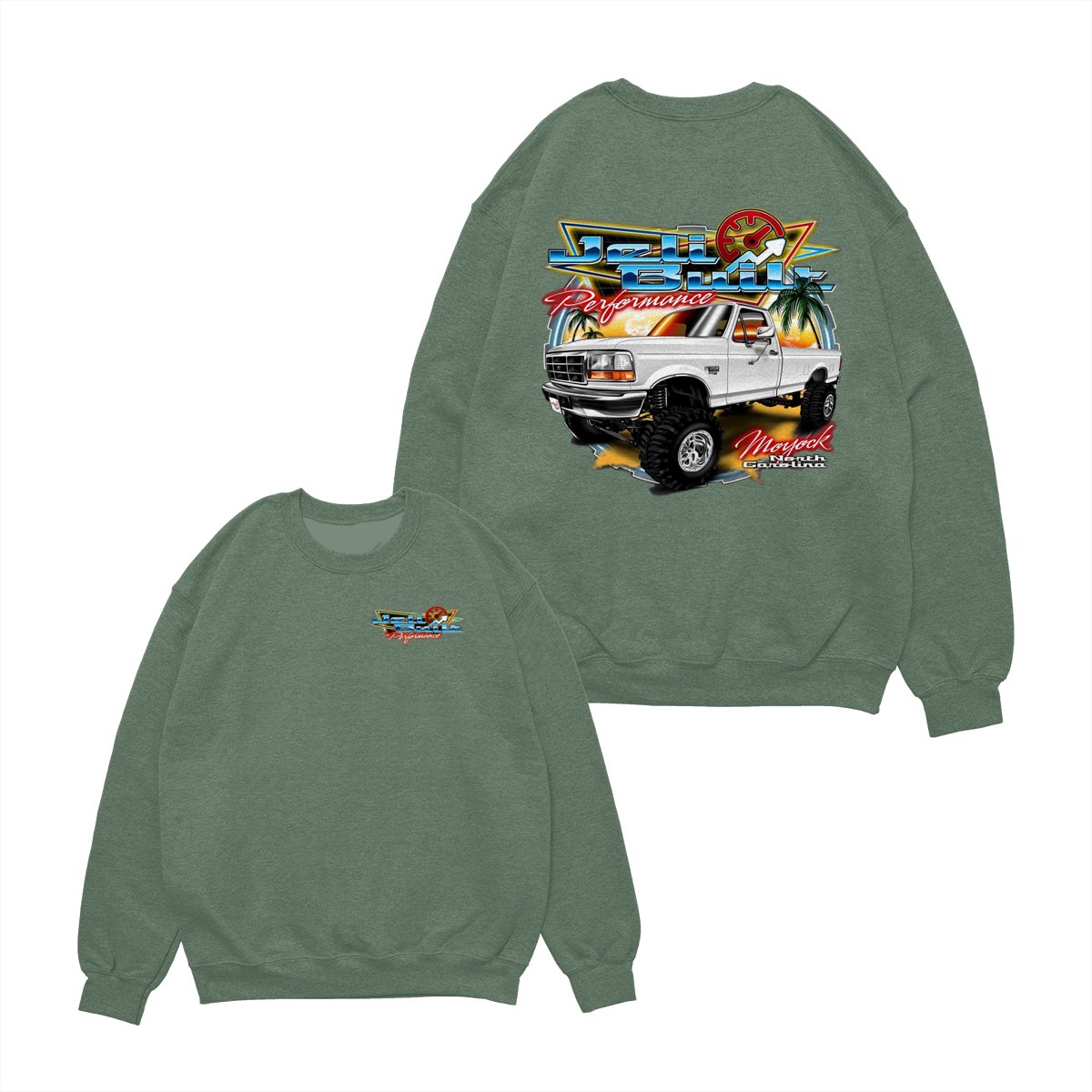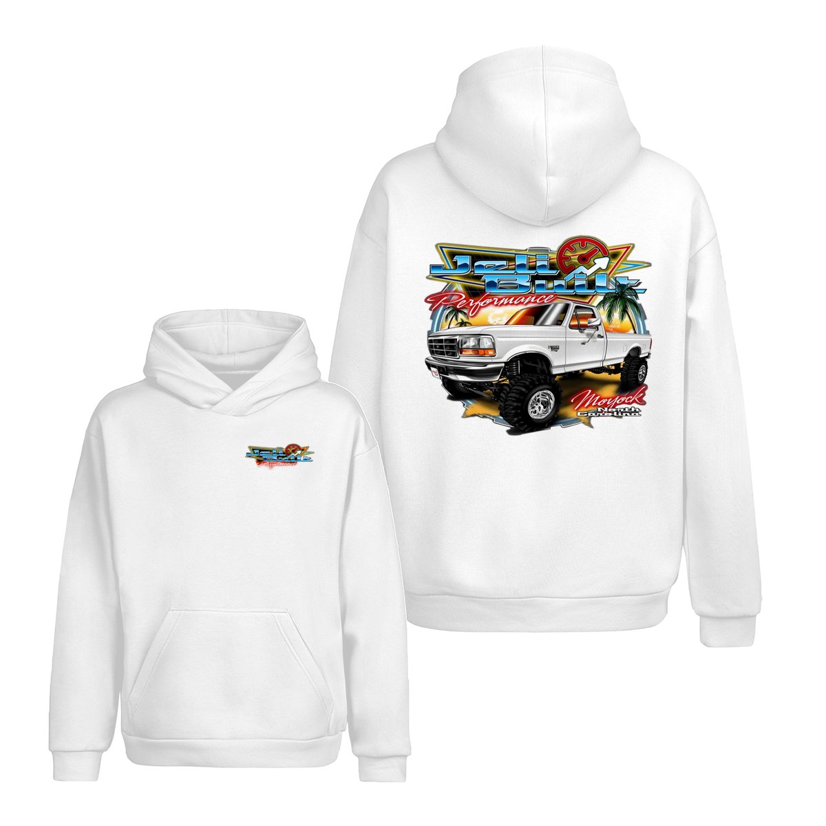 Jam Built Performance T-Shirt – White Lifted Truck Graphic Tee, Sunset and Palm Trees Design, Black Car Enthusiast Shirt for Mechanics and Off-Road Fans, Gift for Truck Lovers