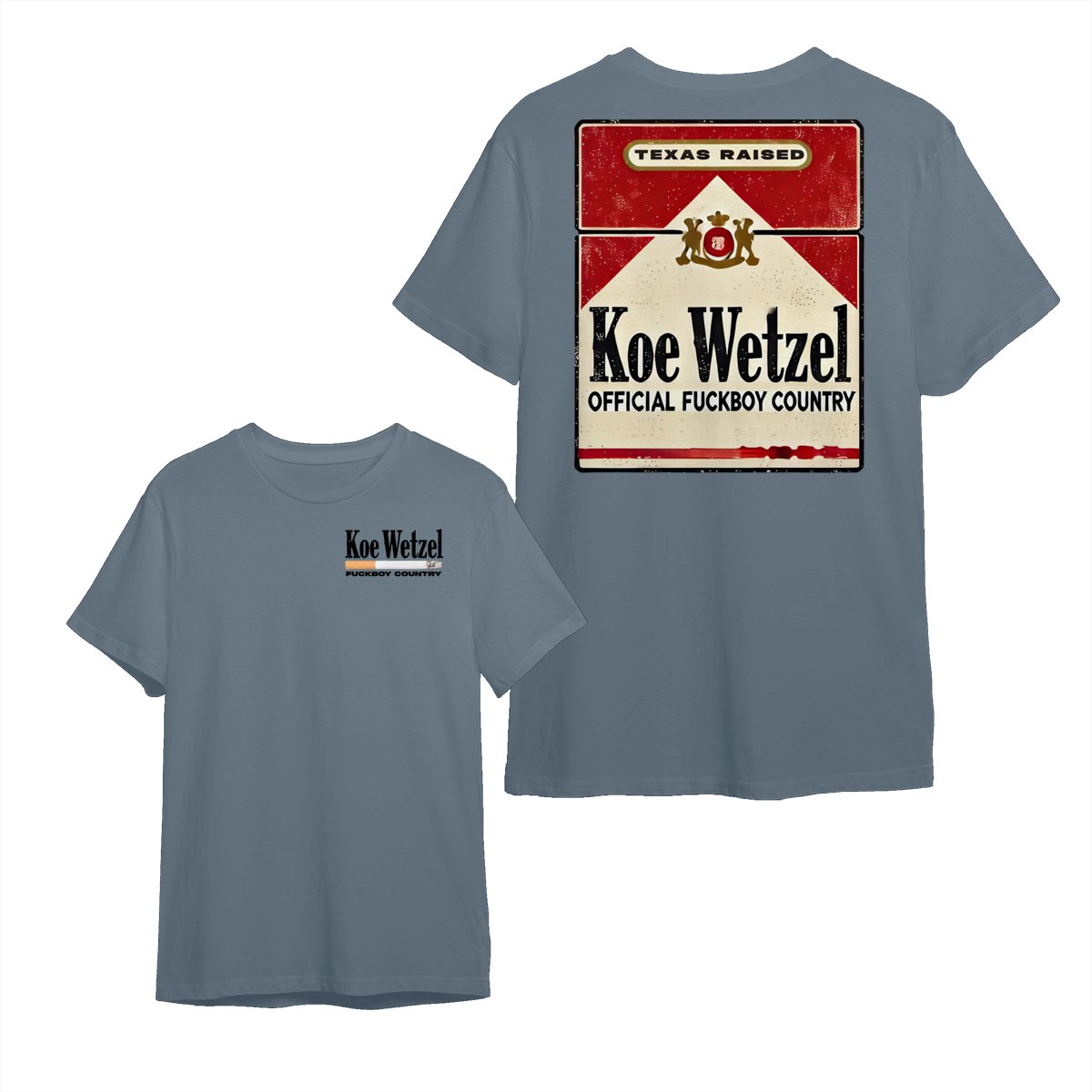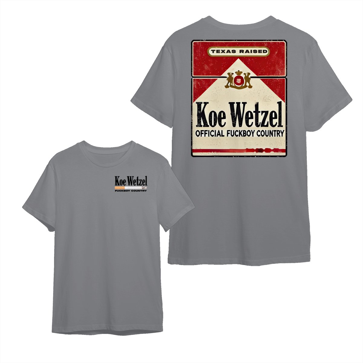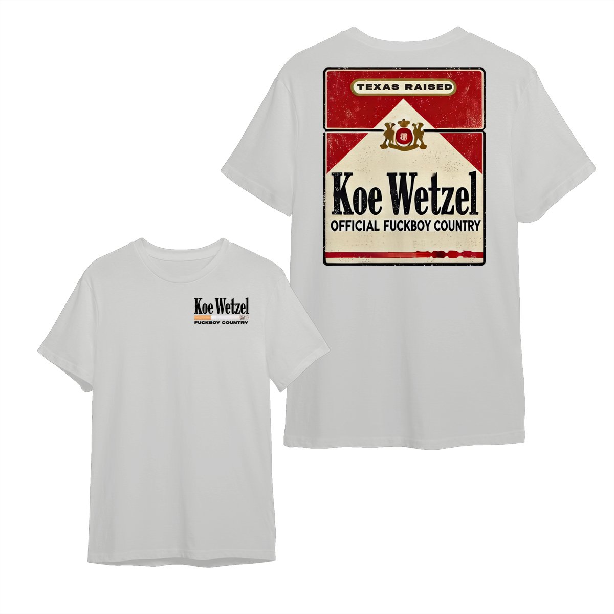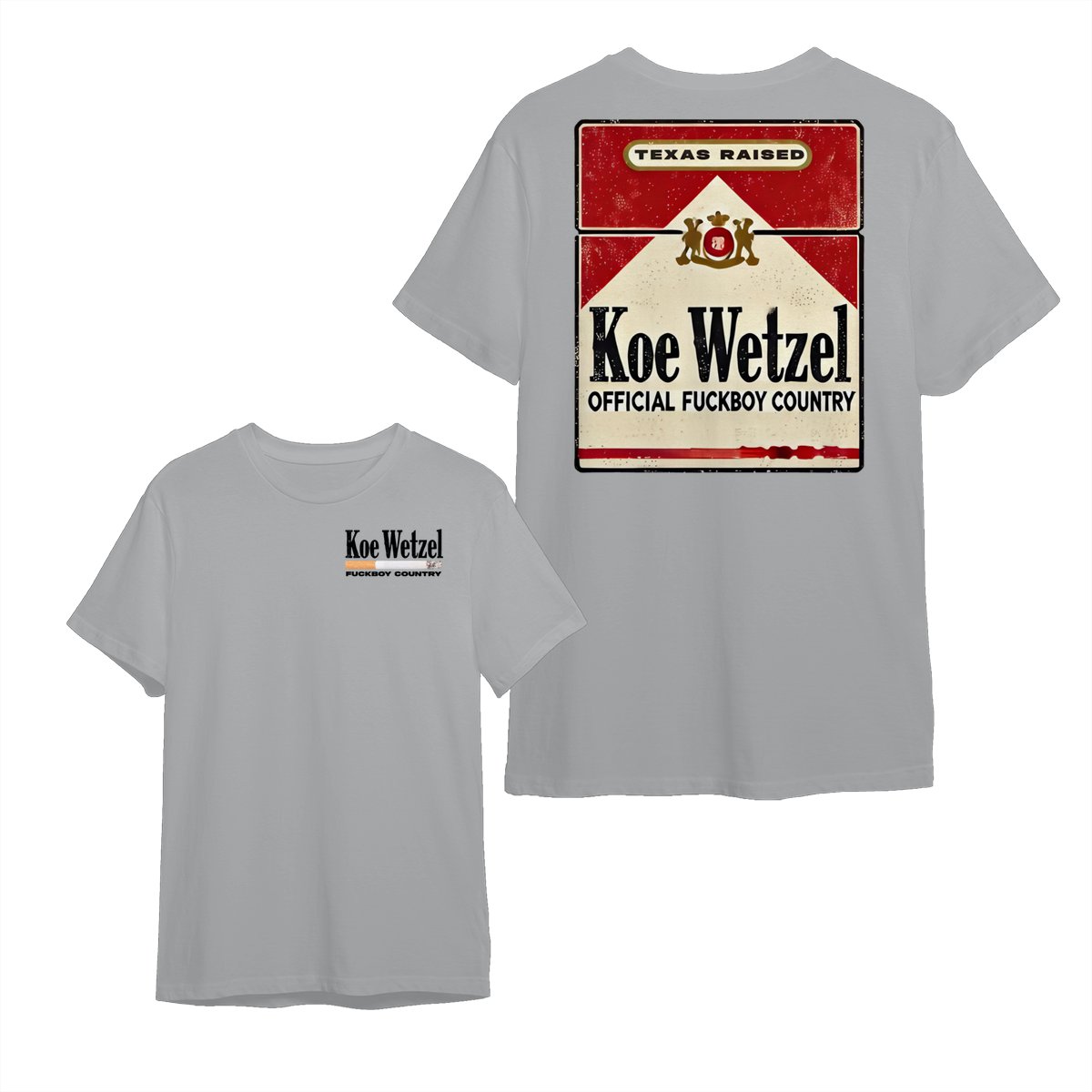 Koe Wetzel T-Shirt – Official Texas Raised Graphic with Vintage Cigarette Pack Look – Bold Rebel Tee for Country Rock Fans and Party Kings