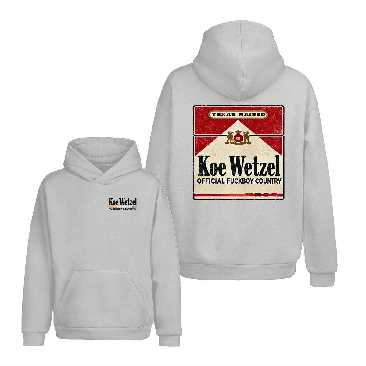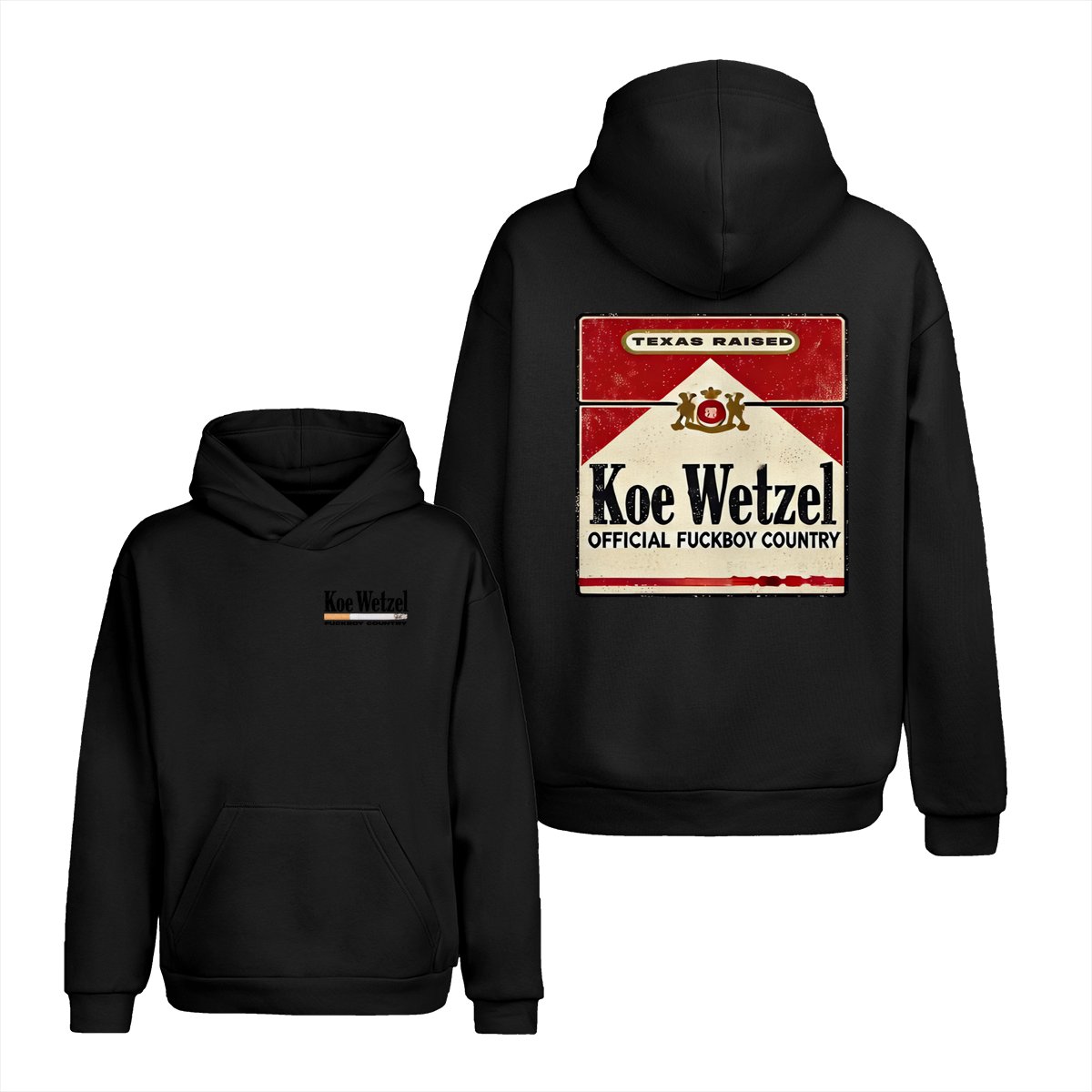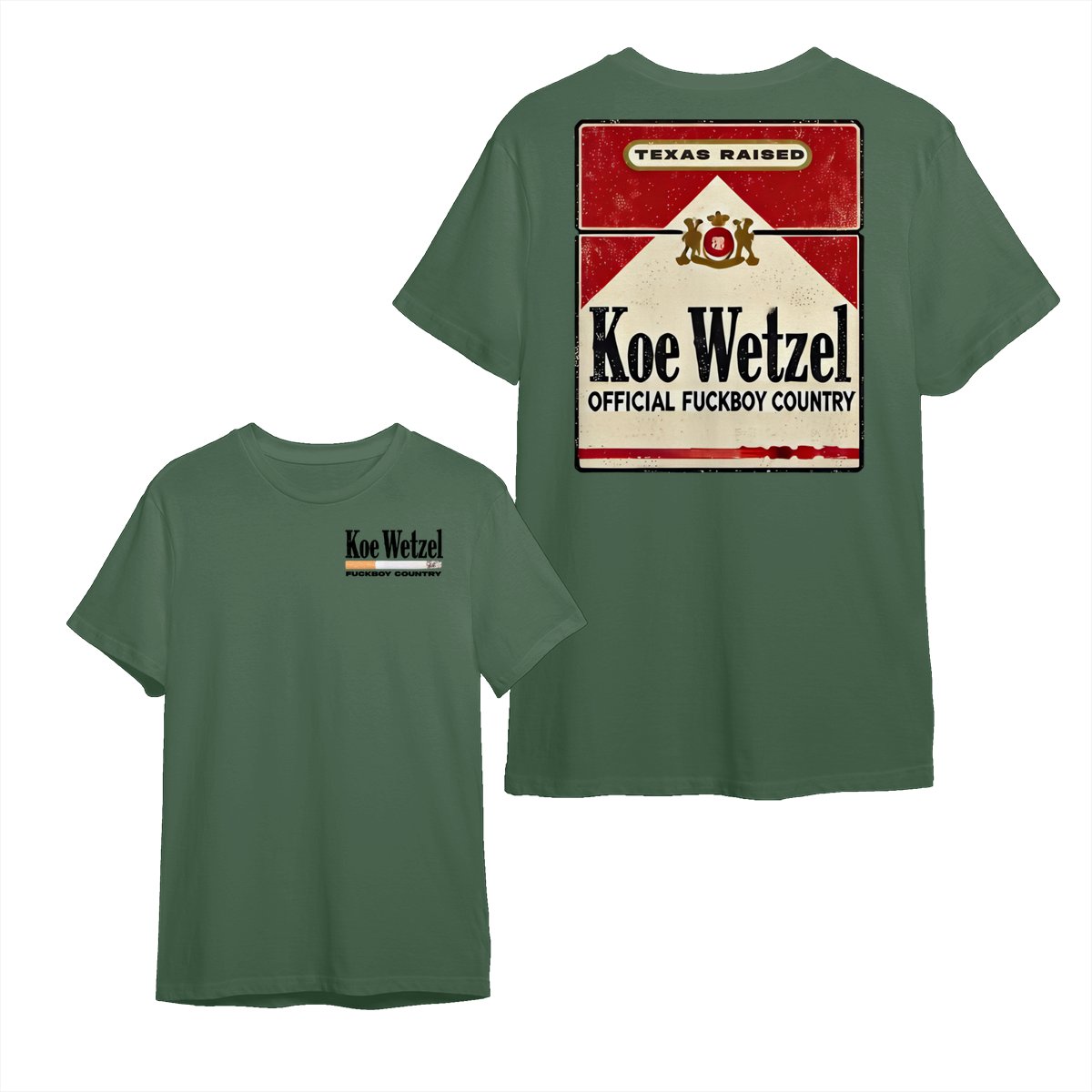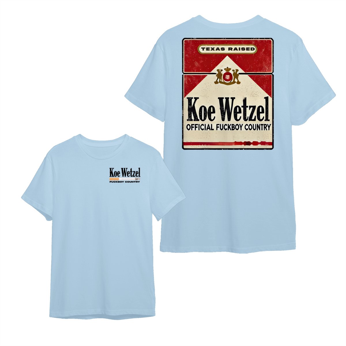 Koe Wetzel T-Shirt – Official Texas Raised Graphic with Vintage Cigarette Pack Look – Bold Rebel Tee for Country Rock Fans and Party Kings