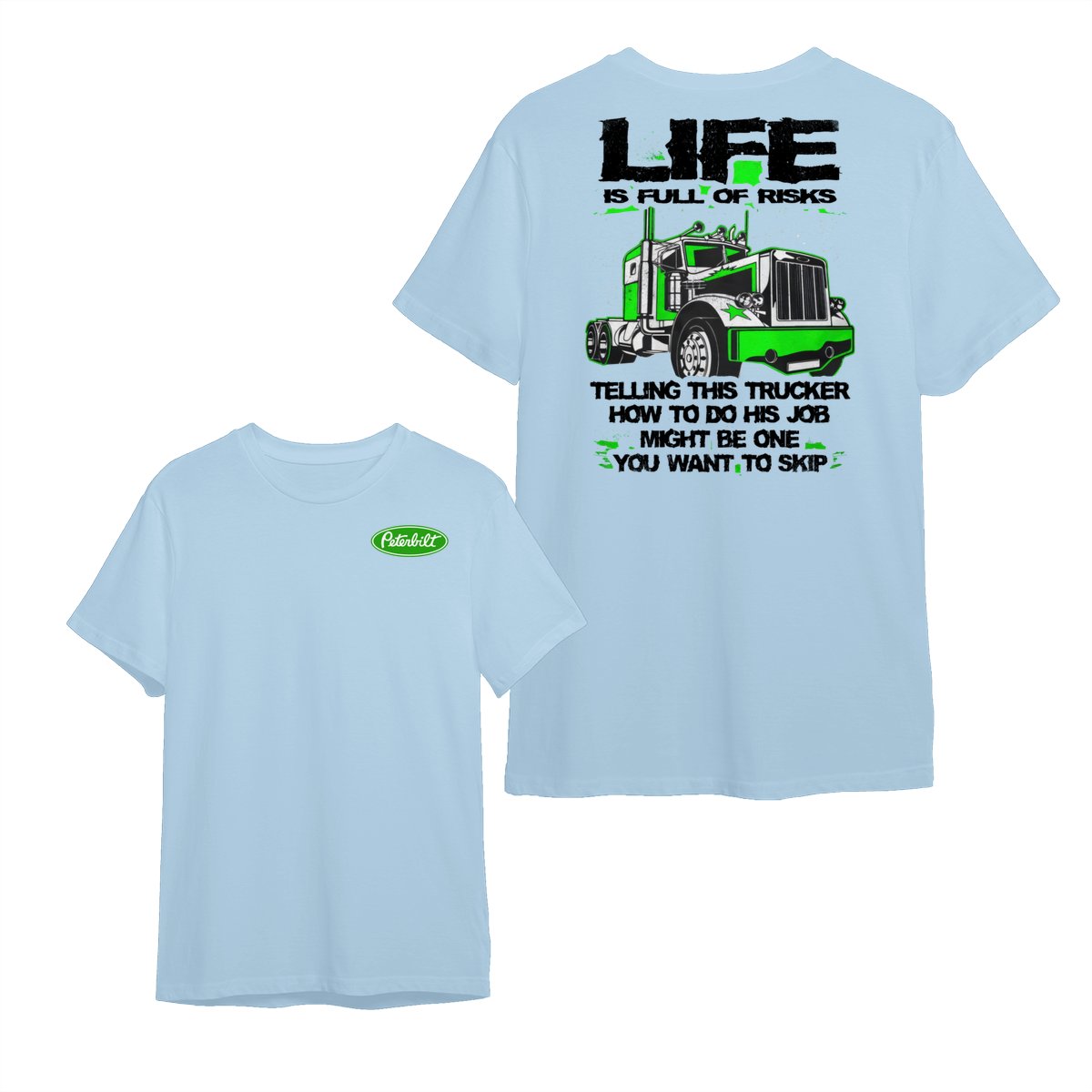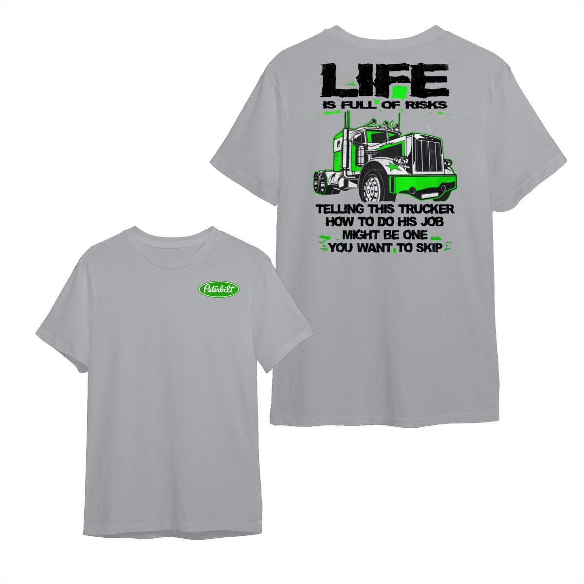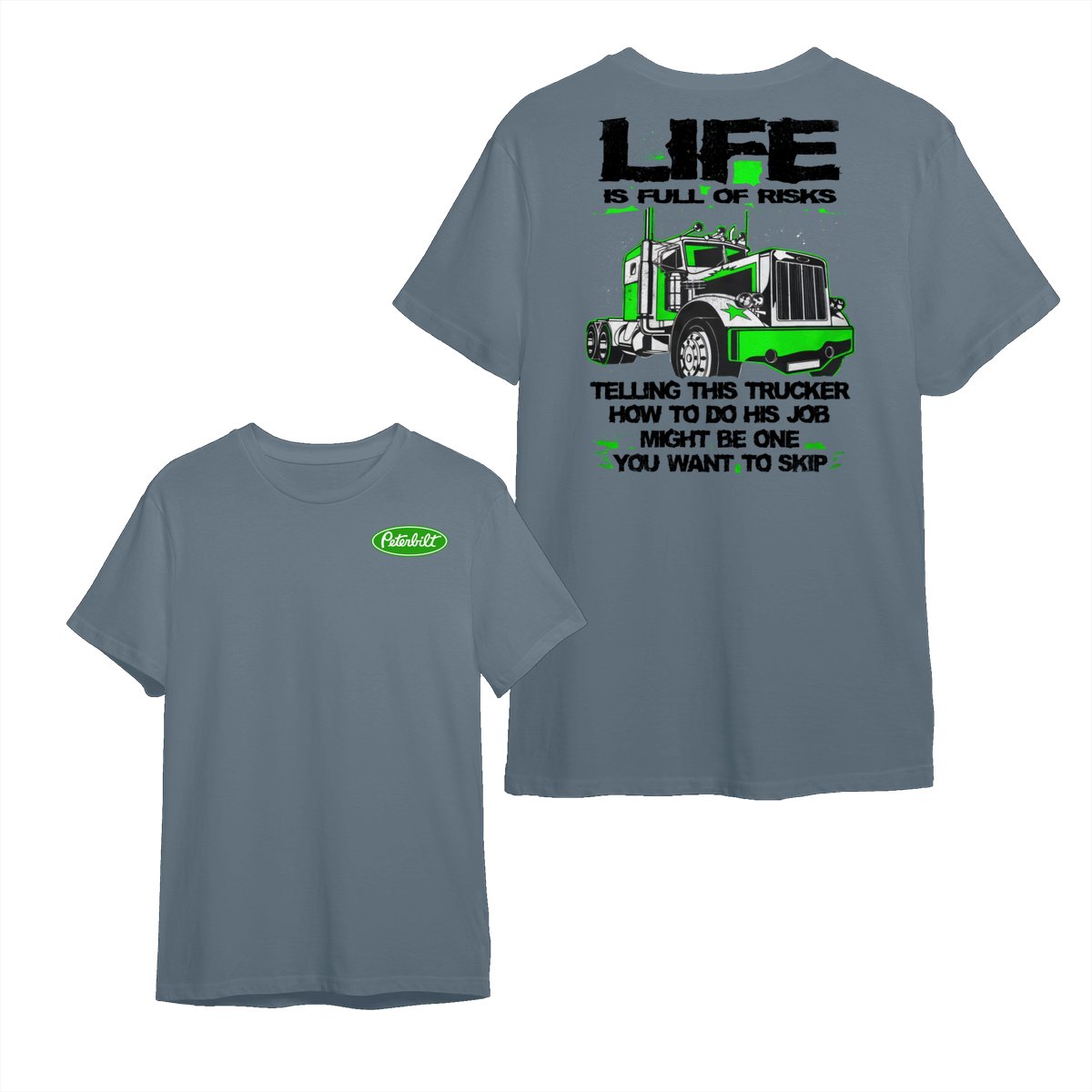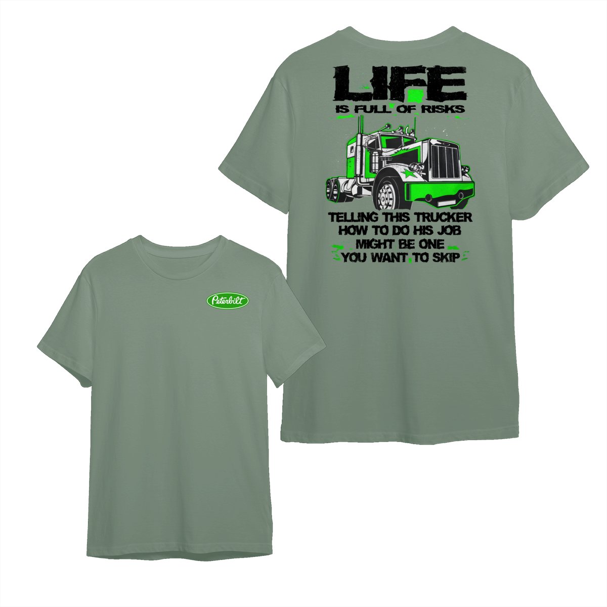 Life Is Full Of Risks Funny Trucker T-Shirt For Peterbilt Semi Truck Fans, Bold Green Semi Truck Graphic Tee For American Truck Driver, 18 Wheeler Big Rig Trucking Shirt USA