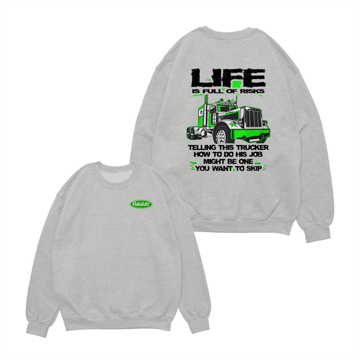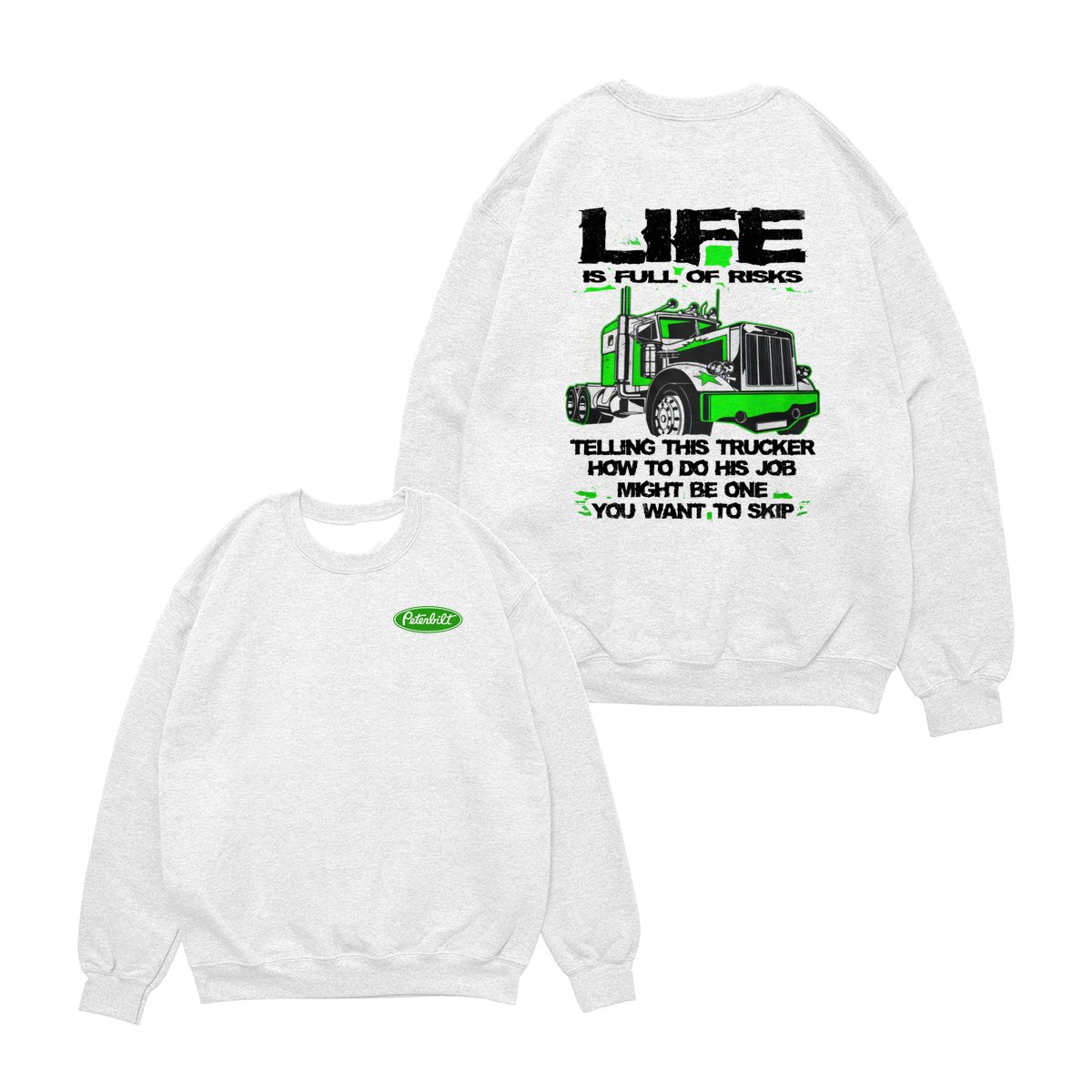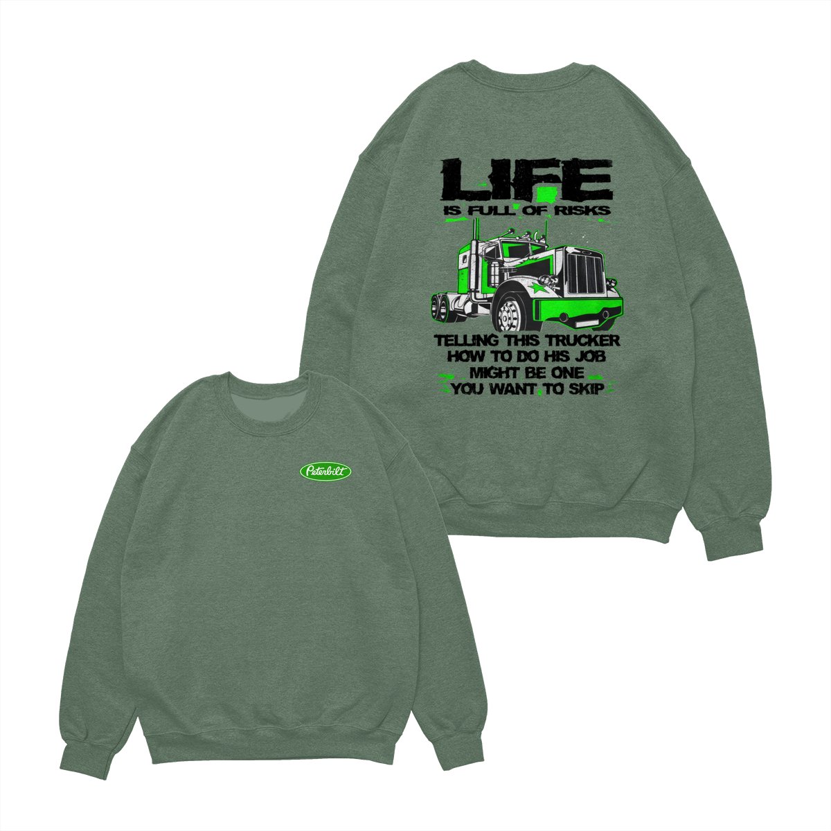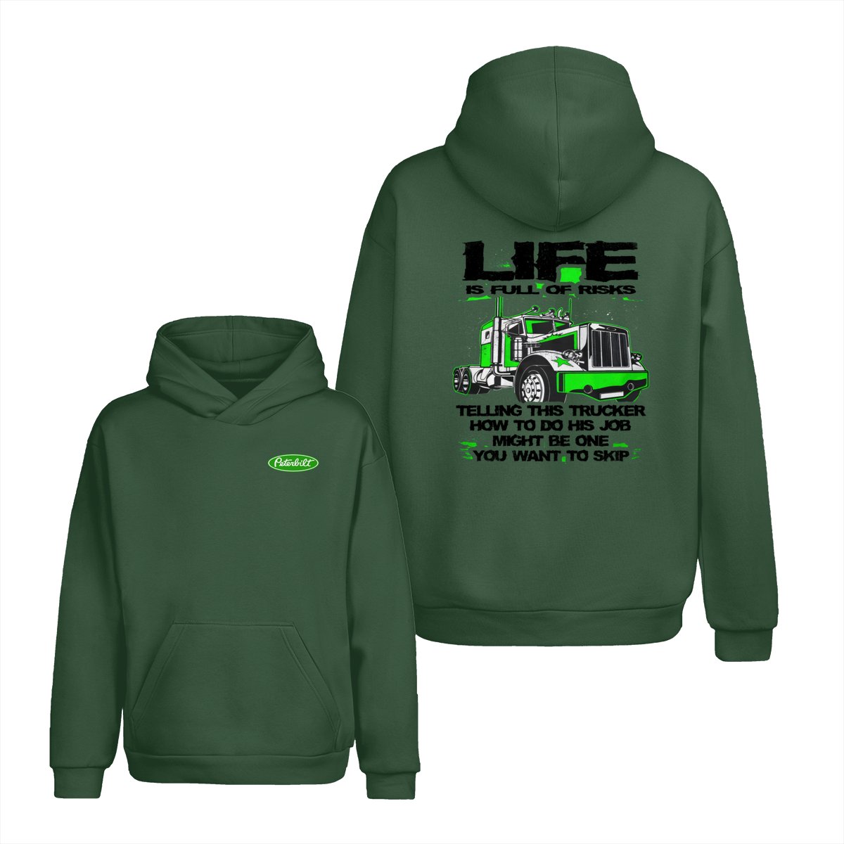 Life Is Full Of Risks Funny Trucker T-Shirt For Peterbilt Semi Truck Fans, Bold Green Semi Truck Graphic Tee For American Truck Driver, 18 Wheeler Big Rig Trucking Shirt USA