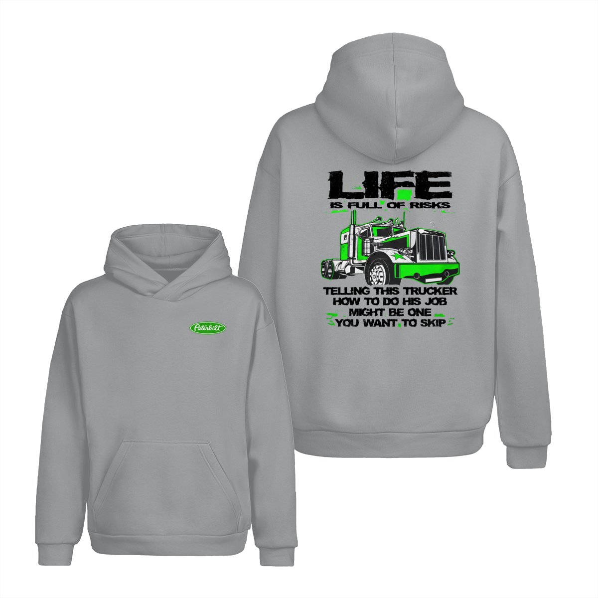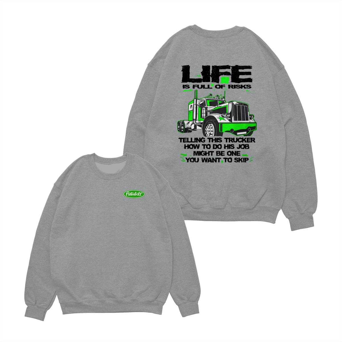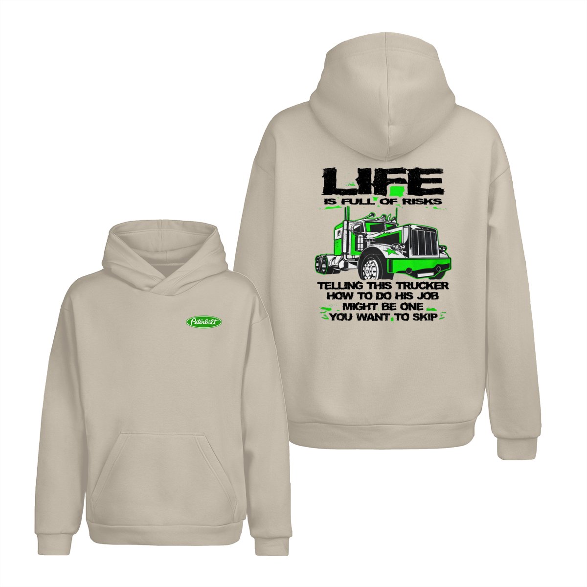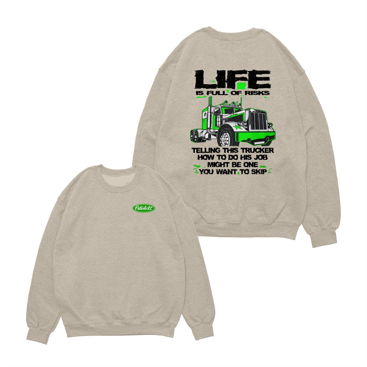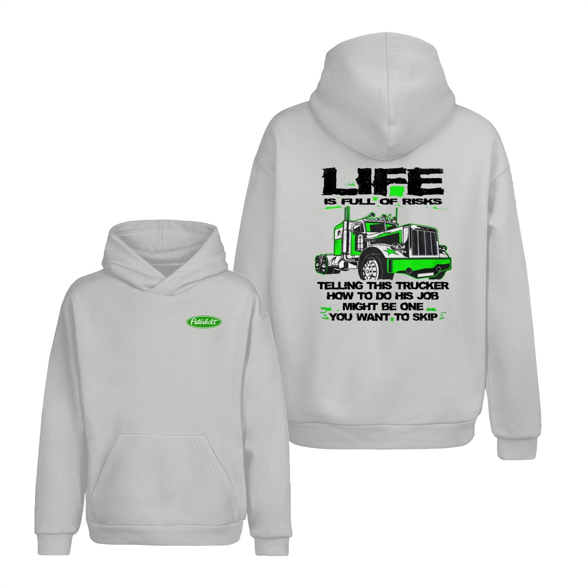 Life Is Full Of Risks Funny Trucker T-Shirt For Peterbilt Semi Truck Fans, Bold Green Semi Truck Graphic Tee For American Truck Driver, 18 Wheeler Big Rig Trucking Shirt USA