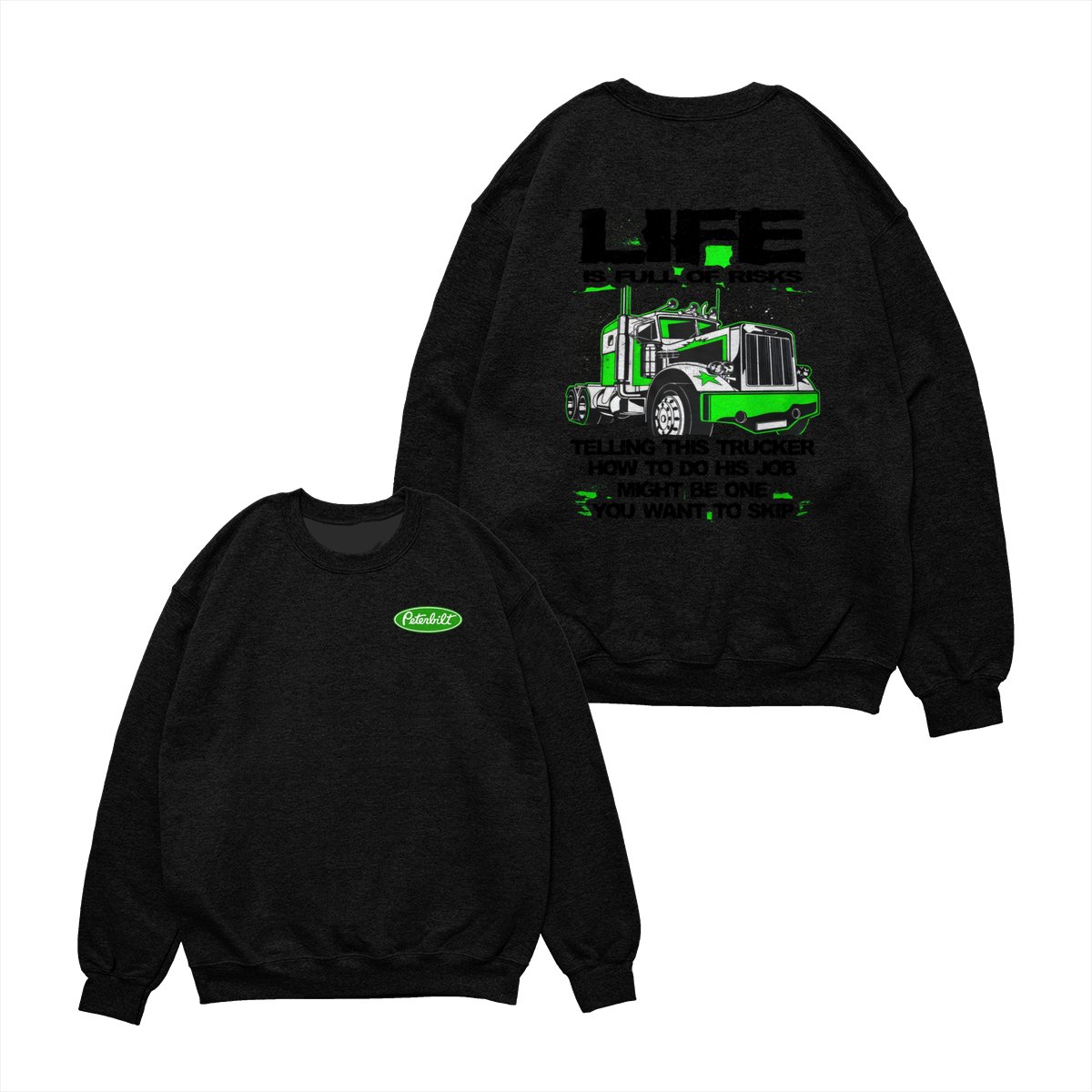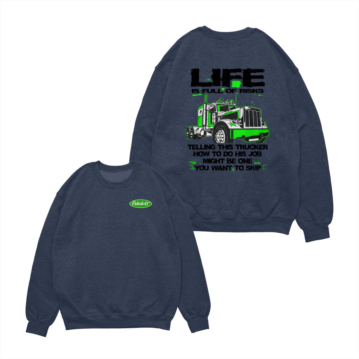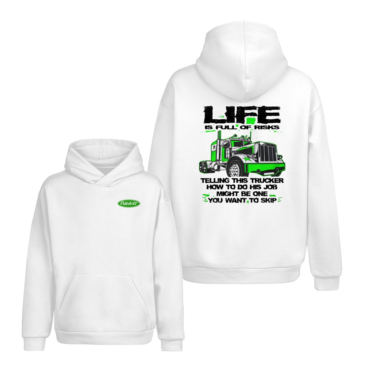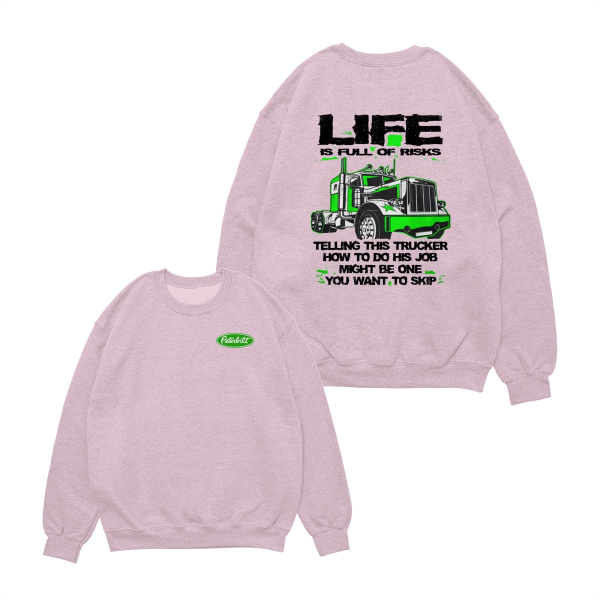 Life Is Full Of Risks Funny Trucker T-Shirt For Peterbilt Semi Truck Fans, Bold Green Semi Truck Graphic Tee For American Truck Driver, 18 Wheeler Big Rig Trucking Shirt USA