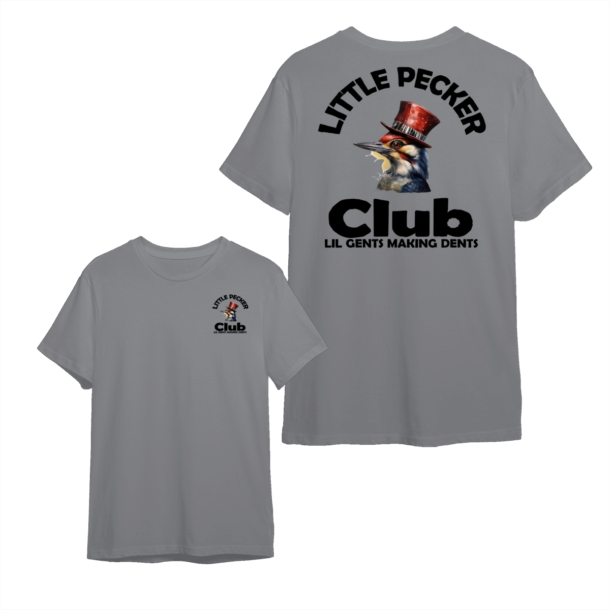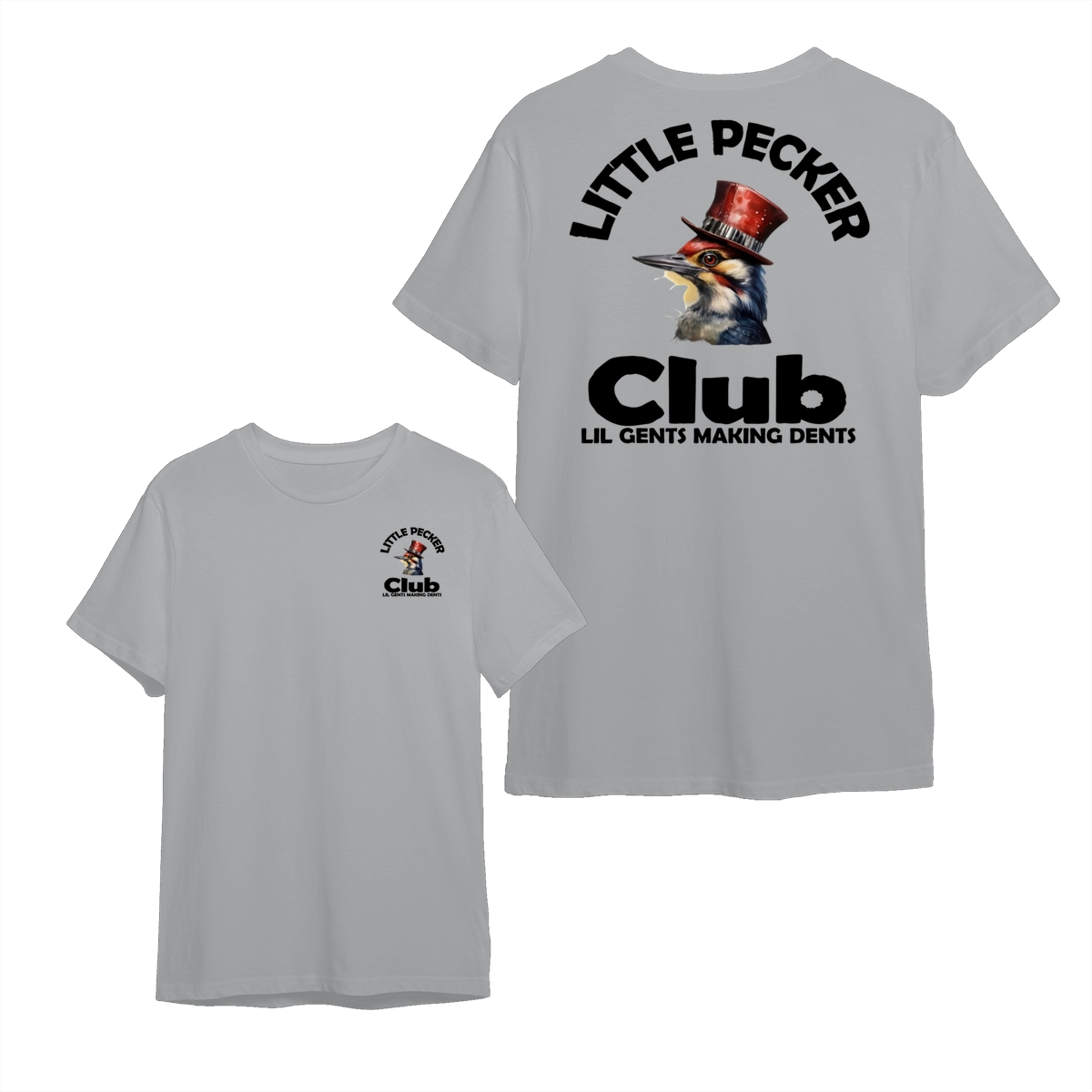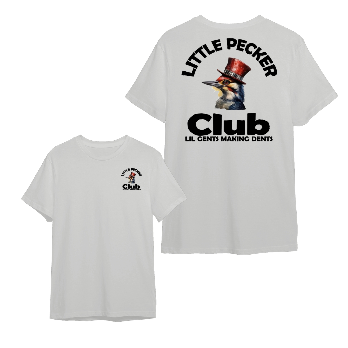 Little Pecker Club T-Shirt 2 Sided – Dapper Top-Hat Woodpecker Graphic, Street-Ready Casual & Outdoor Adventure Tee, Unisex Soft Cotton