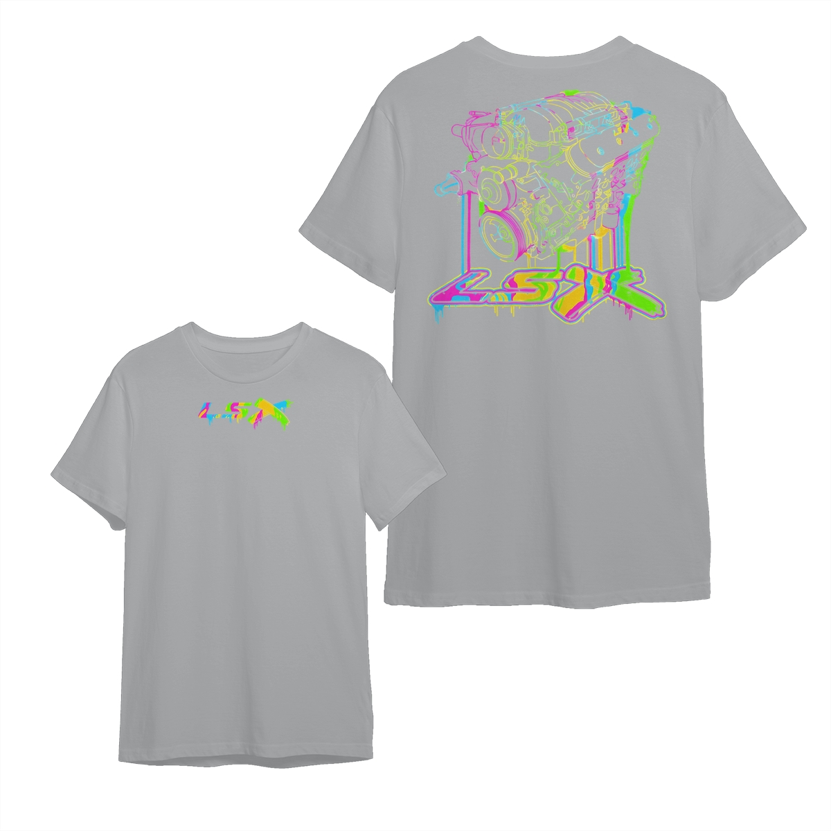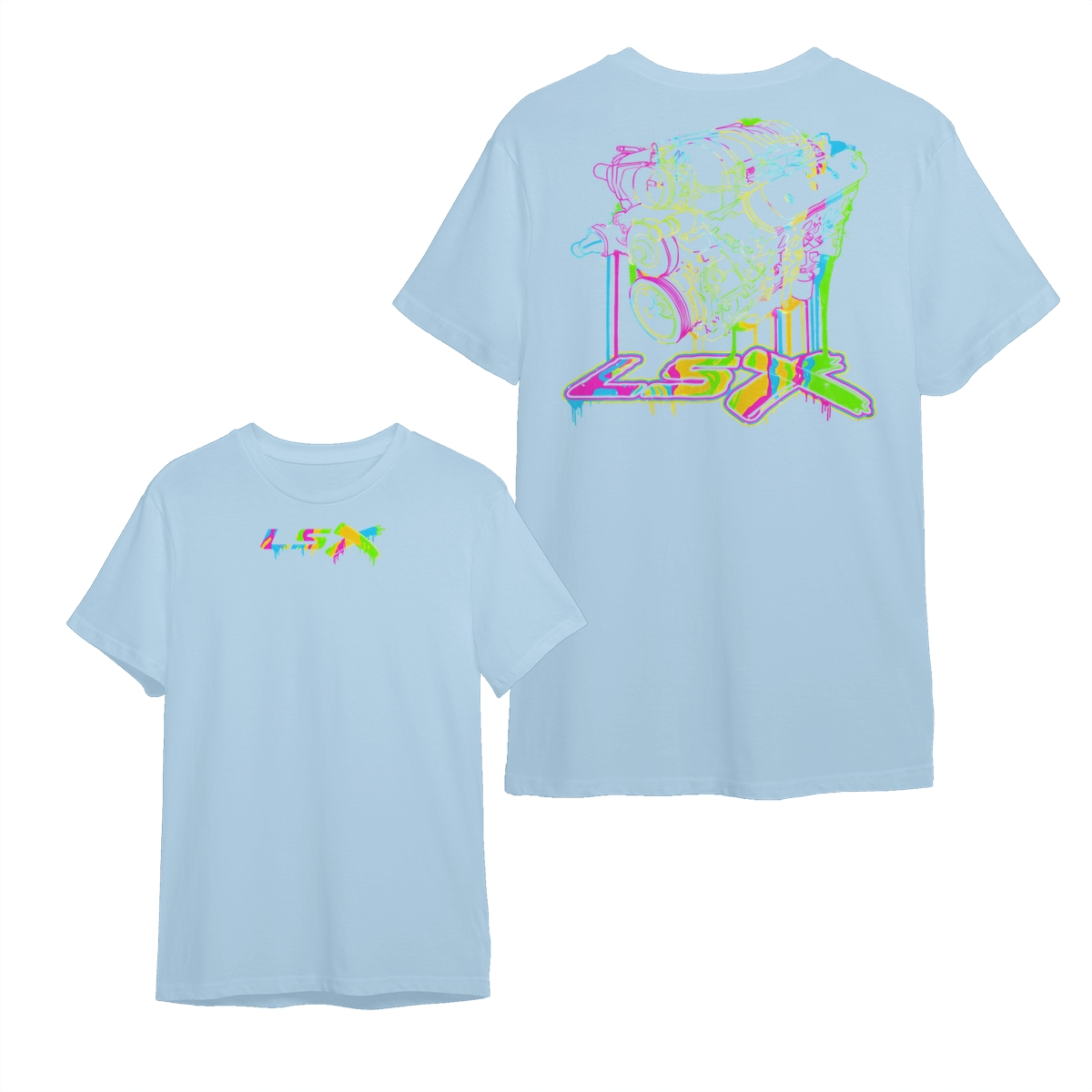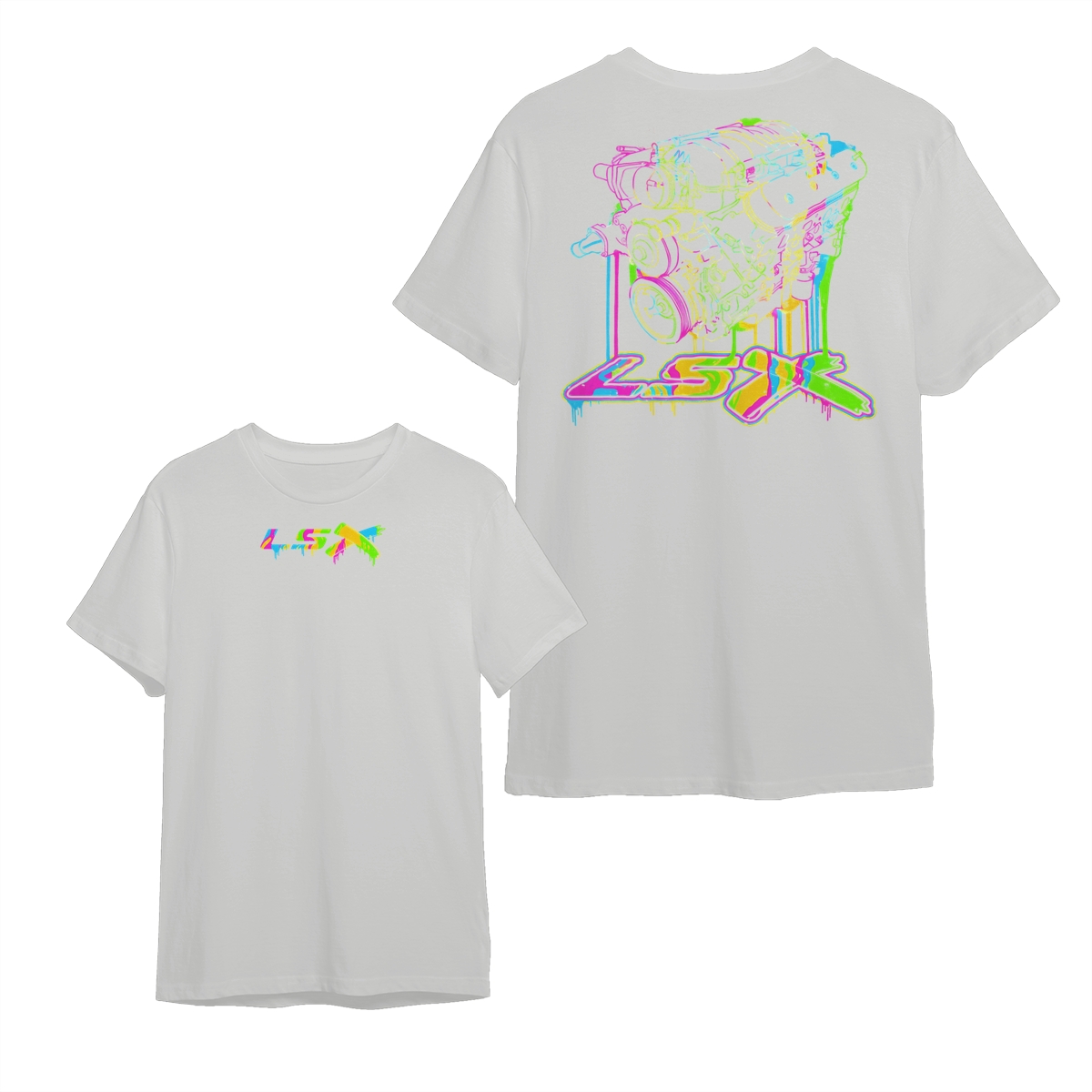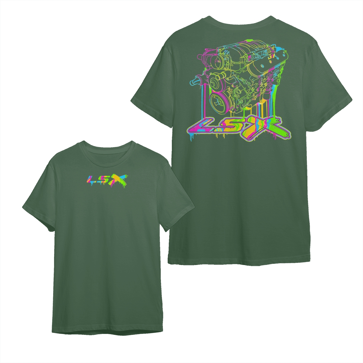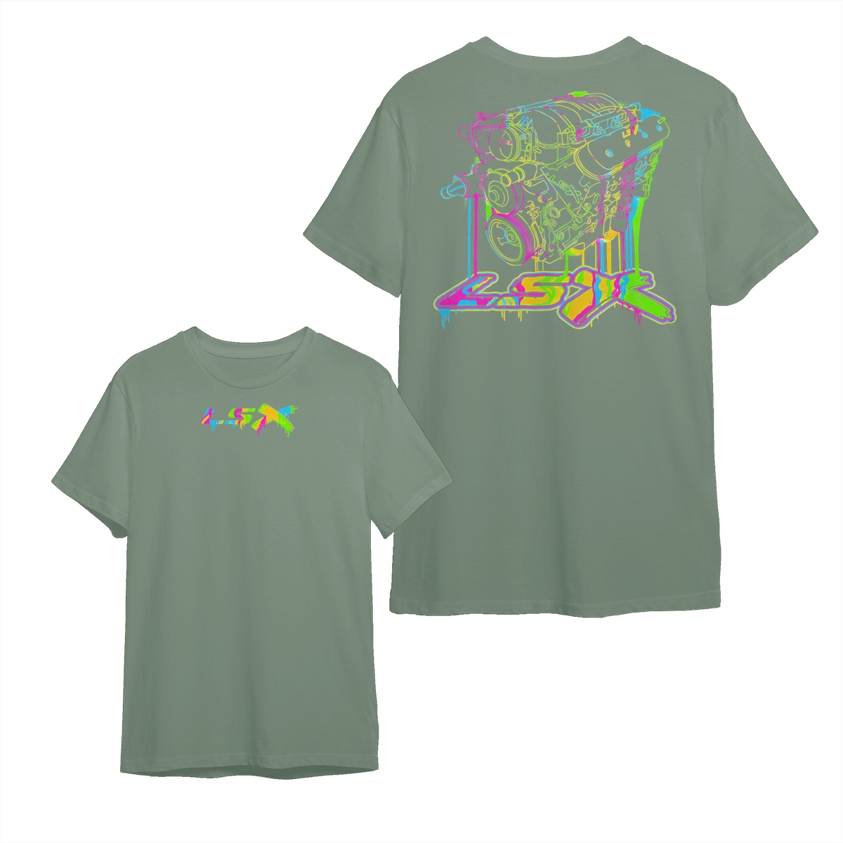 LSX Neon Engine T-Shirt – Colorful Drip Outline Graphic Tee with V8 Build Design, Bold Street Style Apparel for Car Modders & Performance Engine Fans.