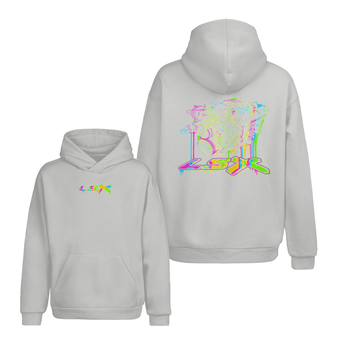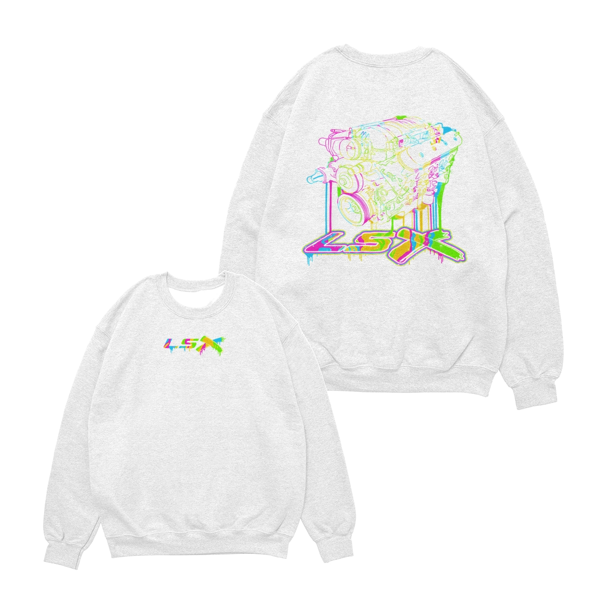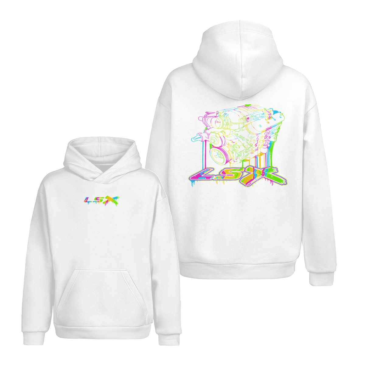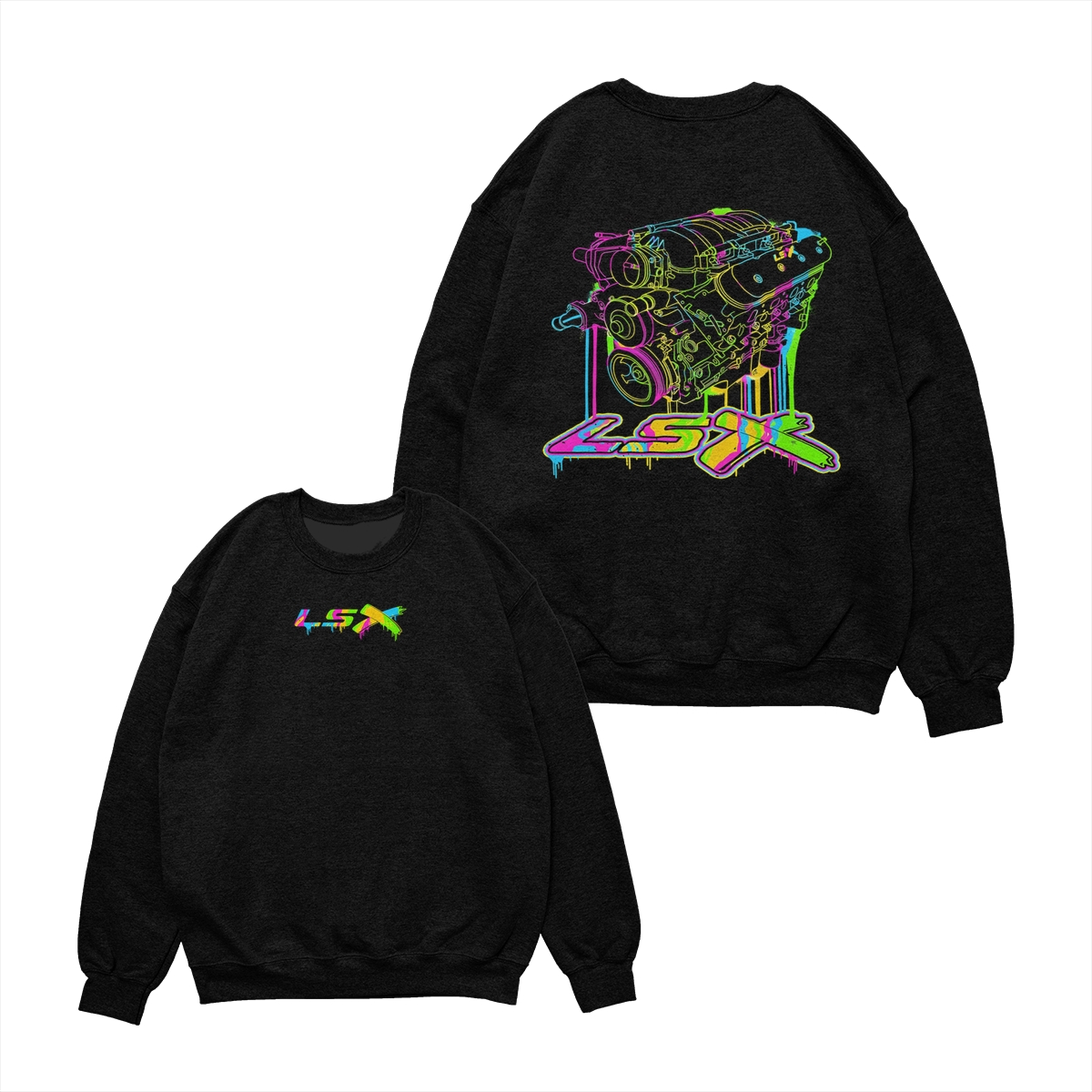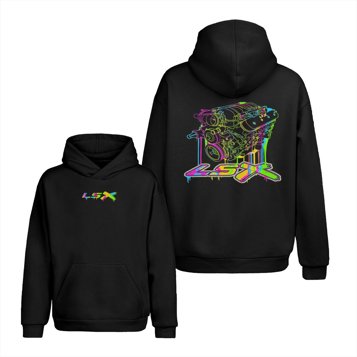 LSX Neon Engine T-Shirt – Colorful Drip Outline Graphic Tee with V8 Build Design, Bold Street Style Apparel for Car Modders & Performance Engine Fans.