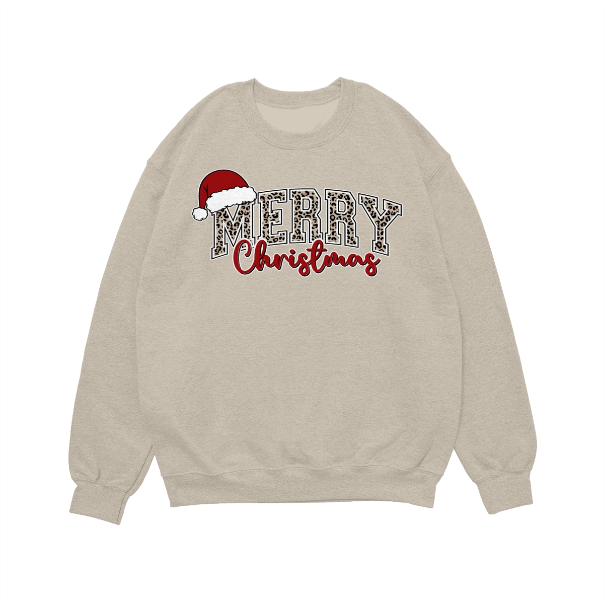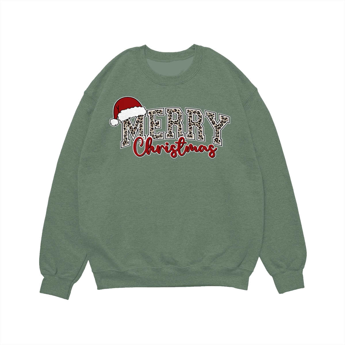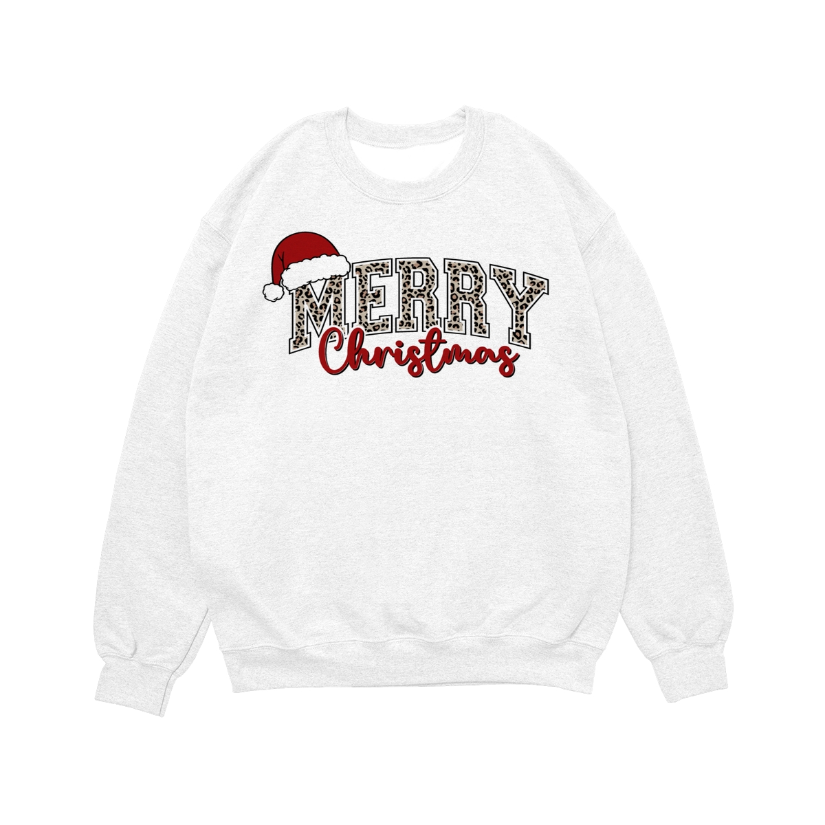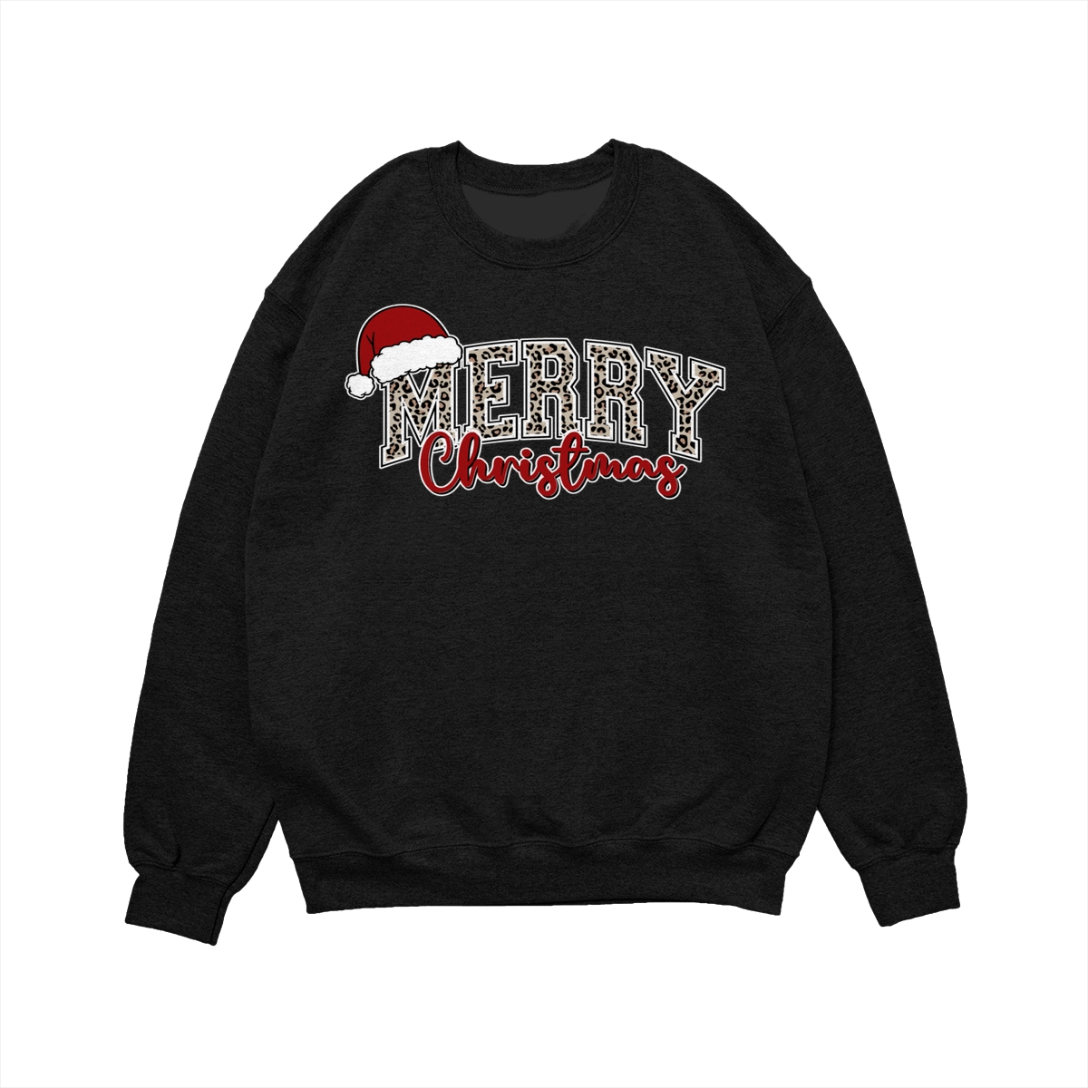 Merry Christmas Sweatshirt – Leopard Print Holiday Graphic Shirt with Santa Hat, Cozy Winter Pullover, Cute Xmas Outfit, Trending TikTok Unisex Streetwear Cotton Womenswear