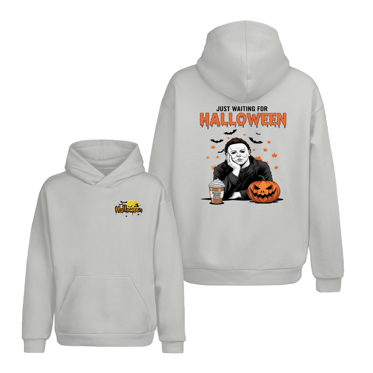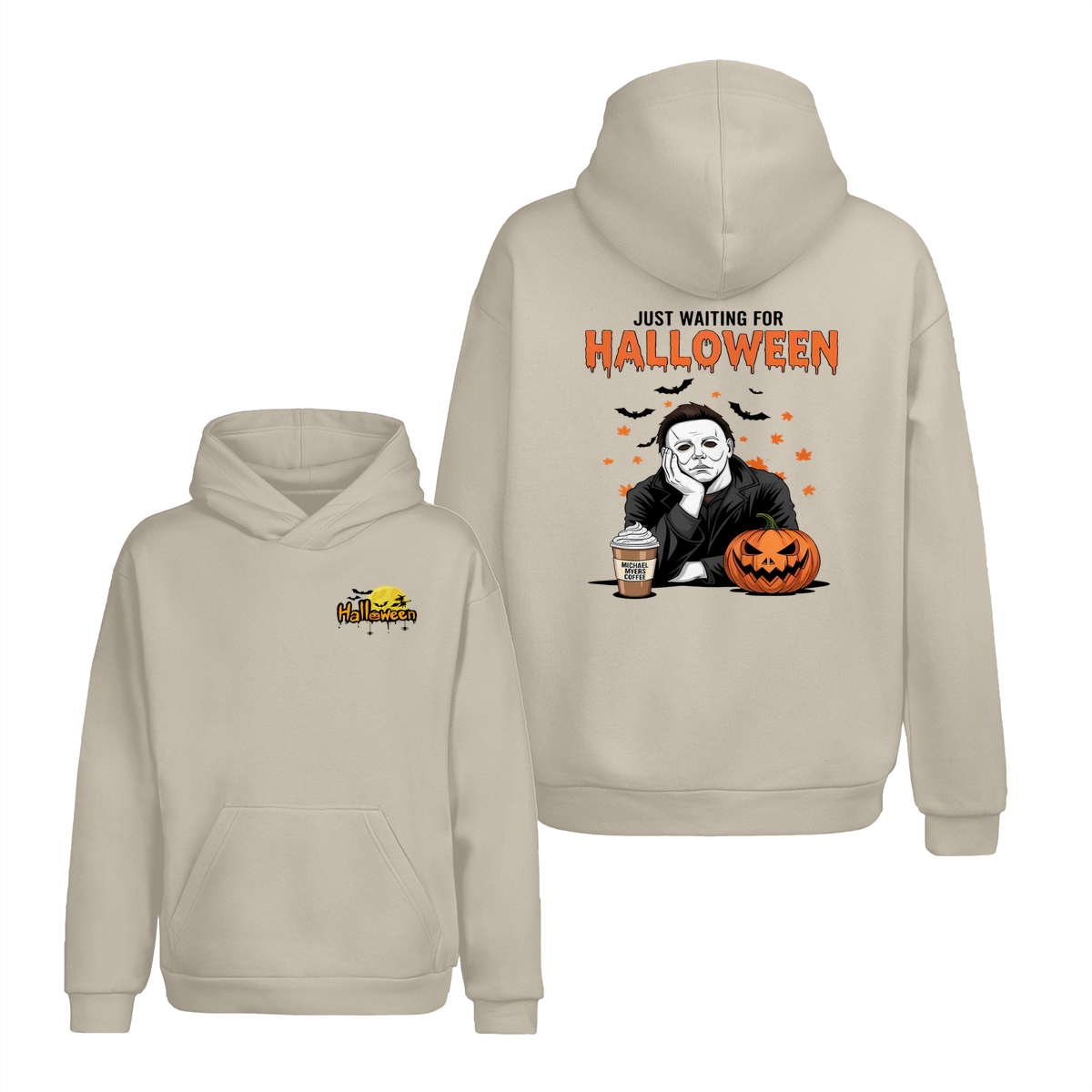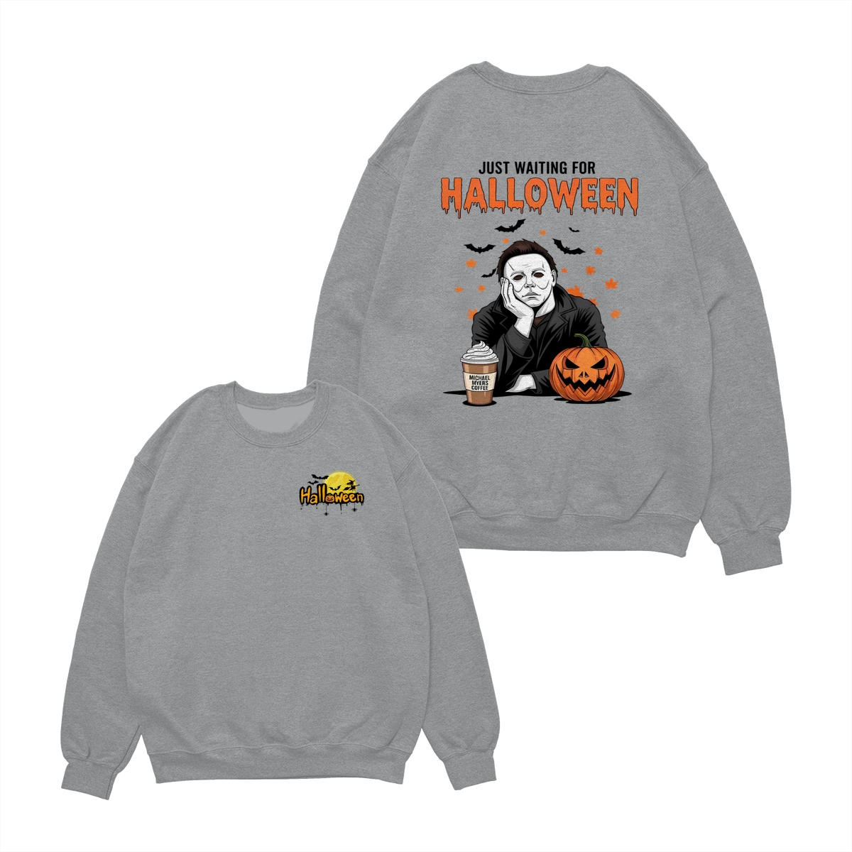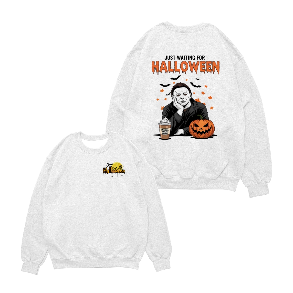 Michael Myers Halloween Shirt – Just Waiting for Halloween Graphic Sweatshirt, Horror Coffee & Pumpkin Design, Funny Creepy Fall Hoodie for Spooky Season Fans