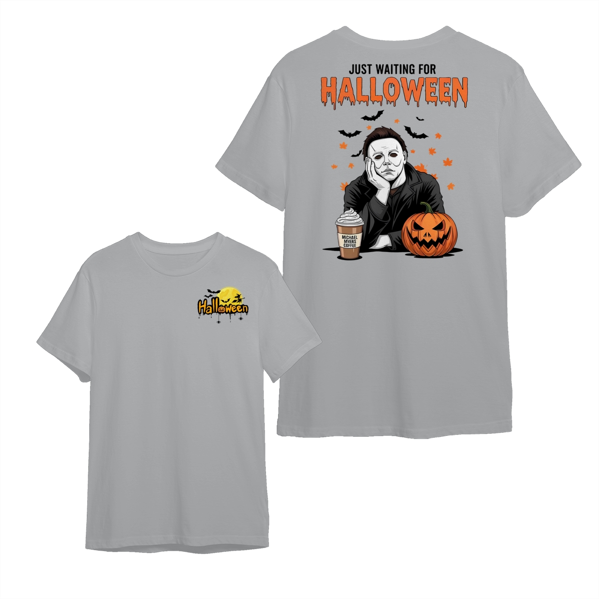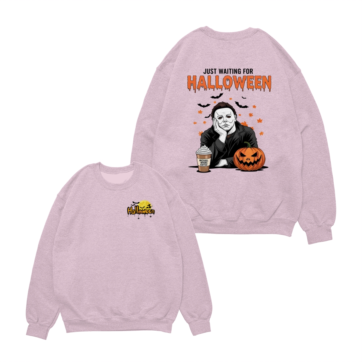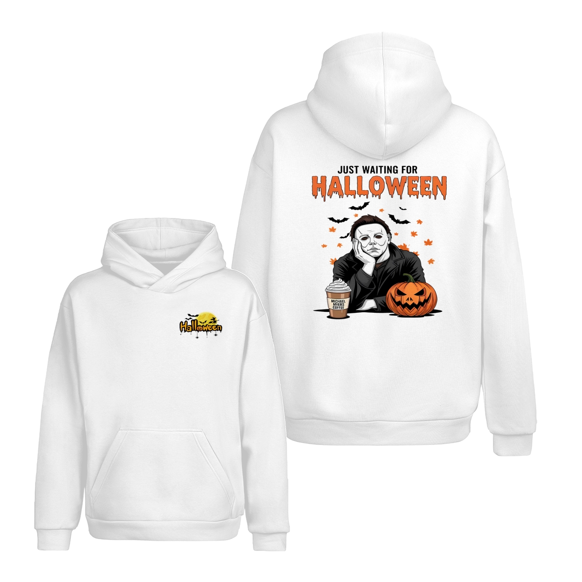 Michael Myers Halloween Shirt – Just Waiting for Halloween Graphic Sweatshirt, Horror Coffee & Pumpkin Design, Funny Creepy Fall Hoodie for Spooky Season Fans