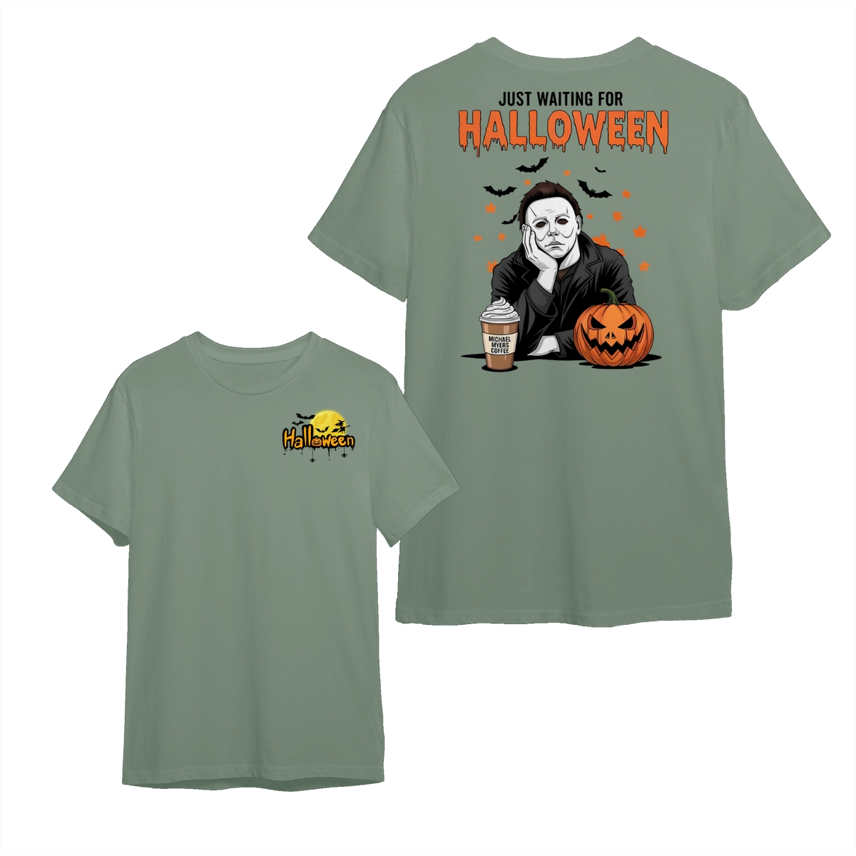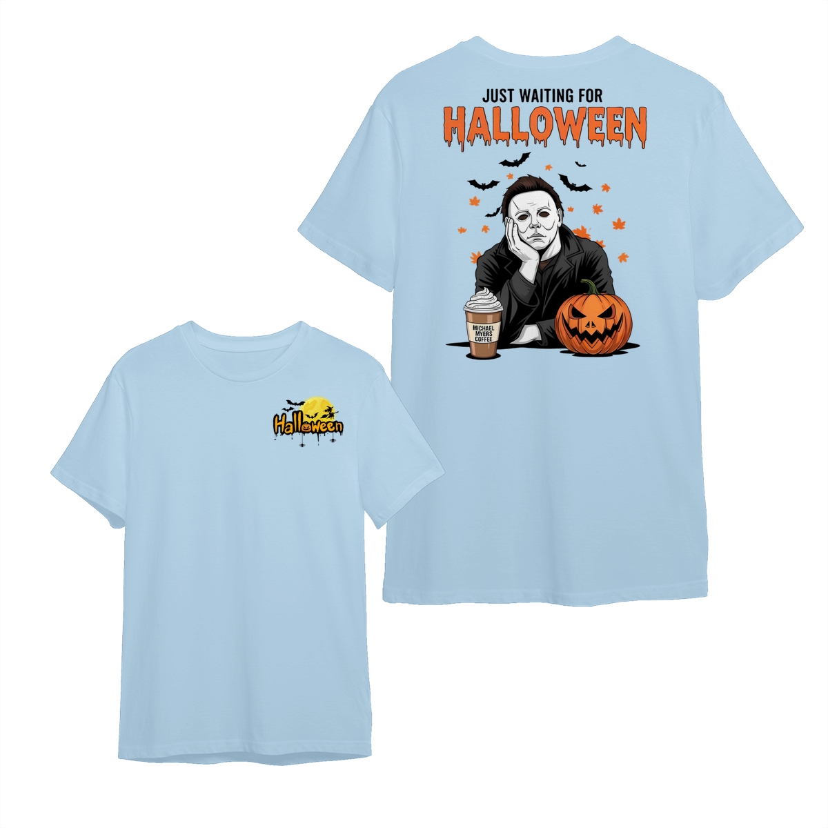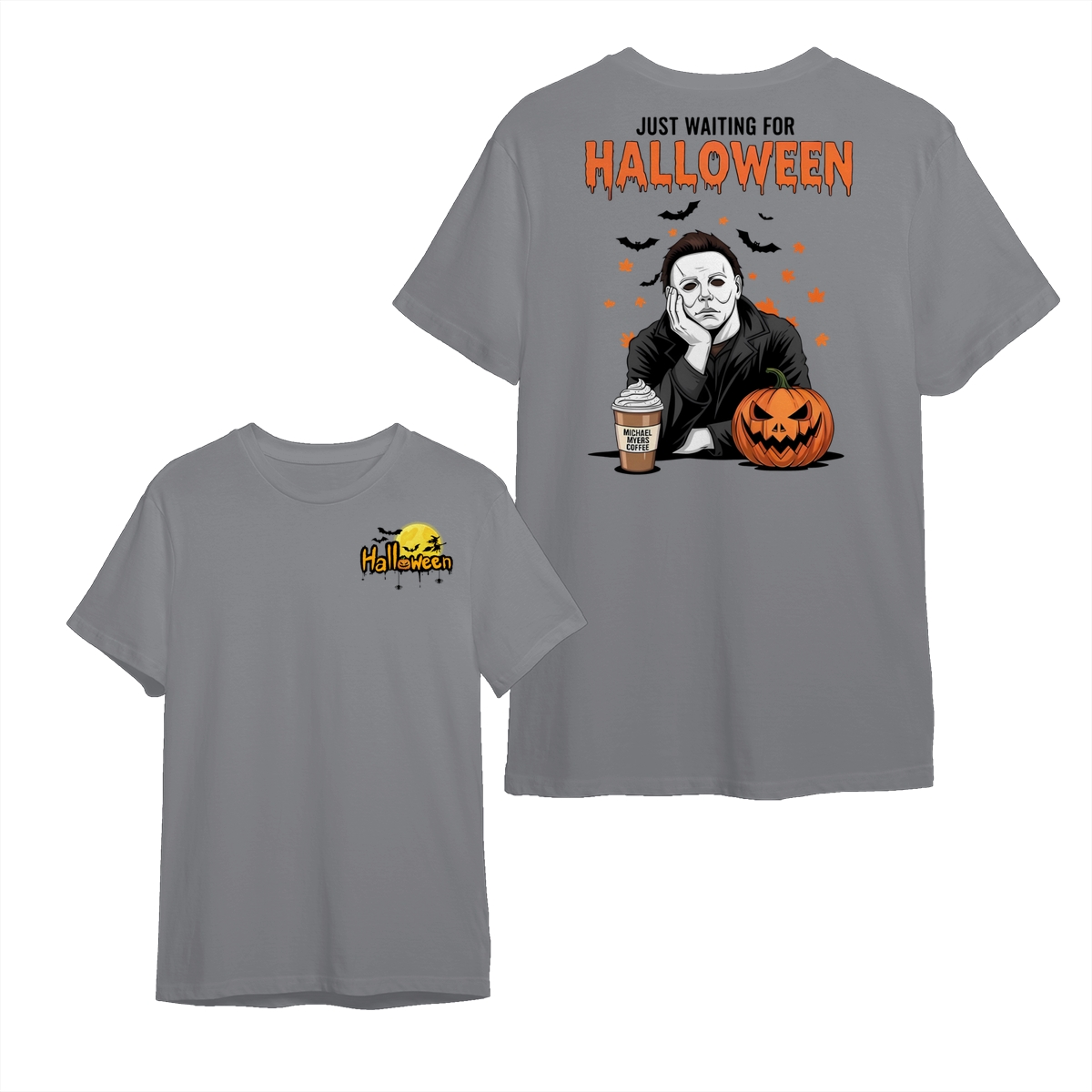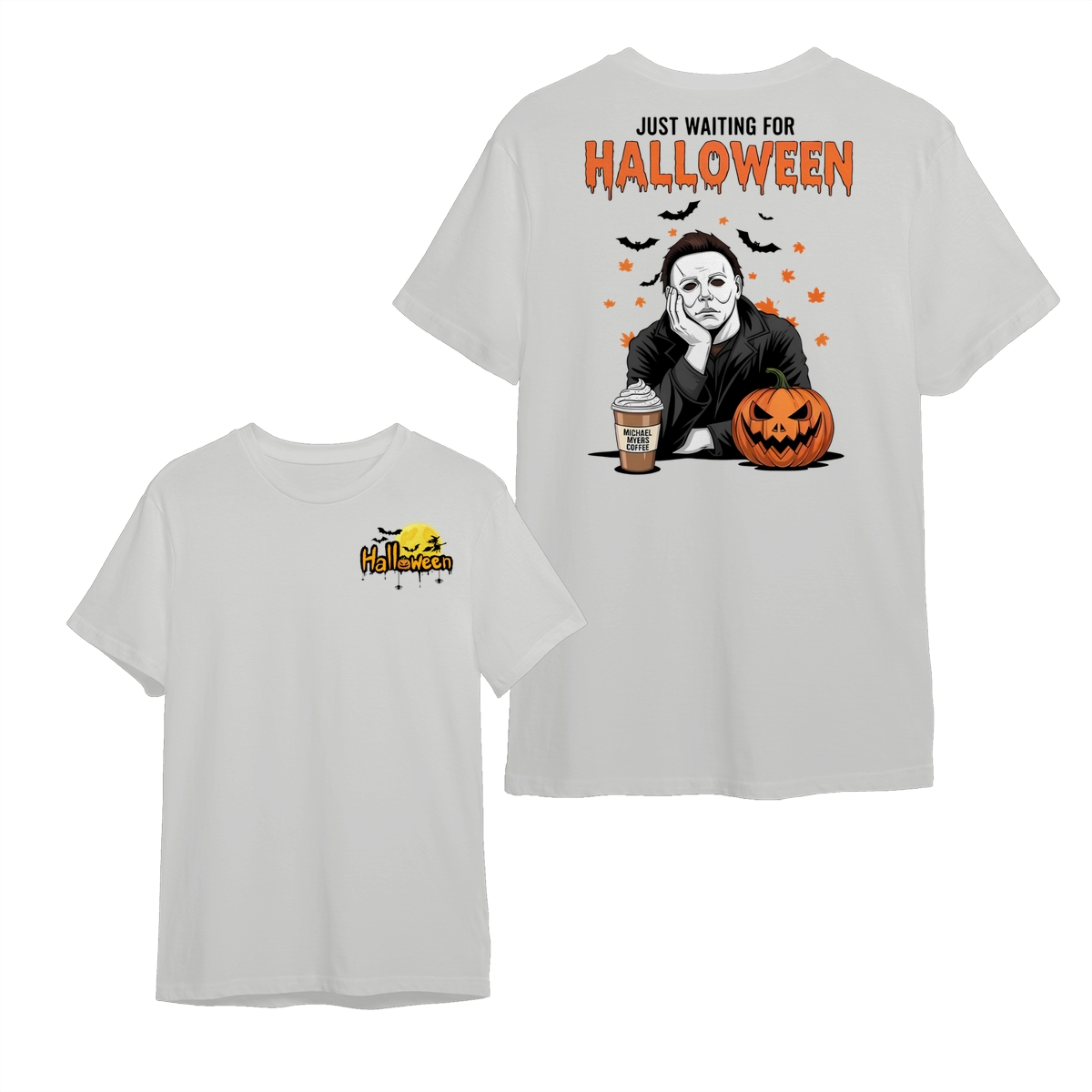 Michael Myers Halloween Shirt – Just Waiting for Halloween Graphic Sweatshirt, Horror Coffee & Pumpkin Design, Funny Creepy Fall Hoodie for Spooky Season Fans