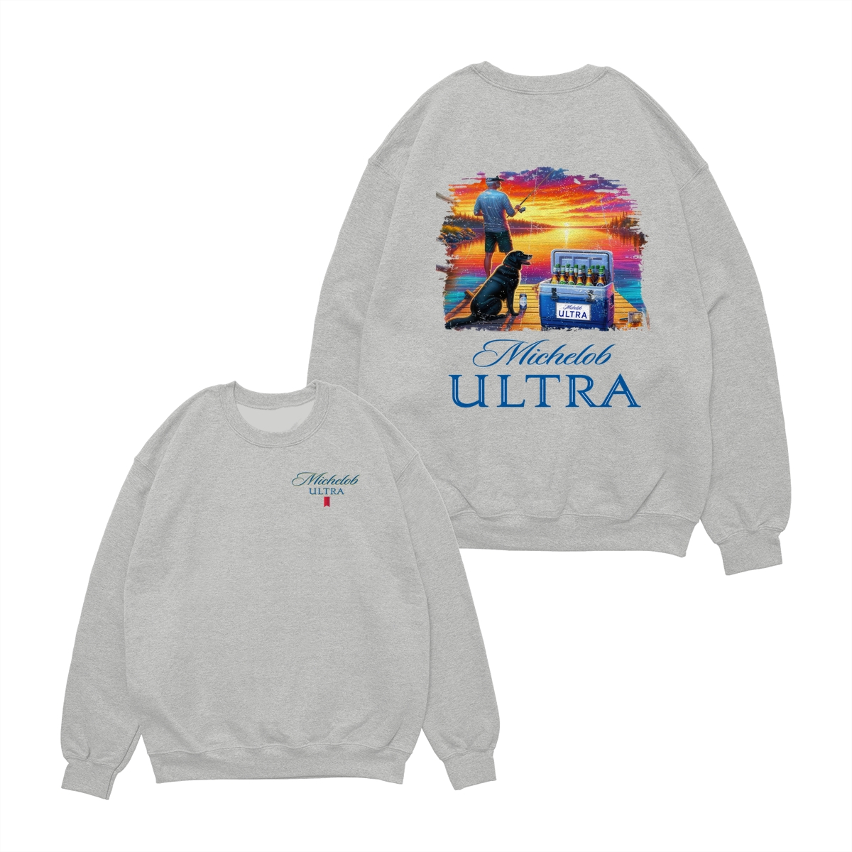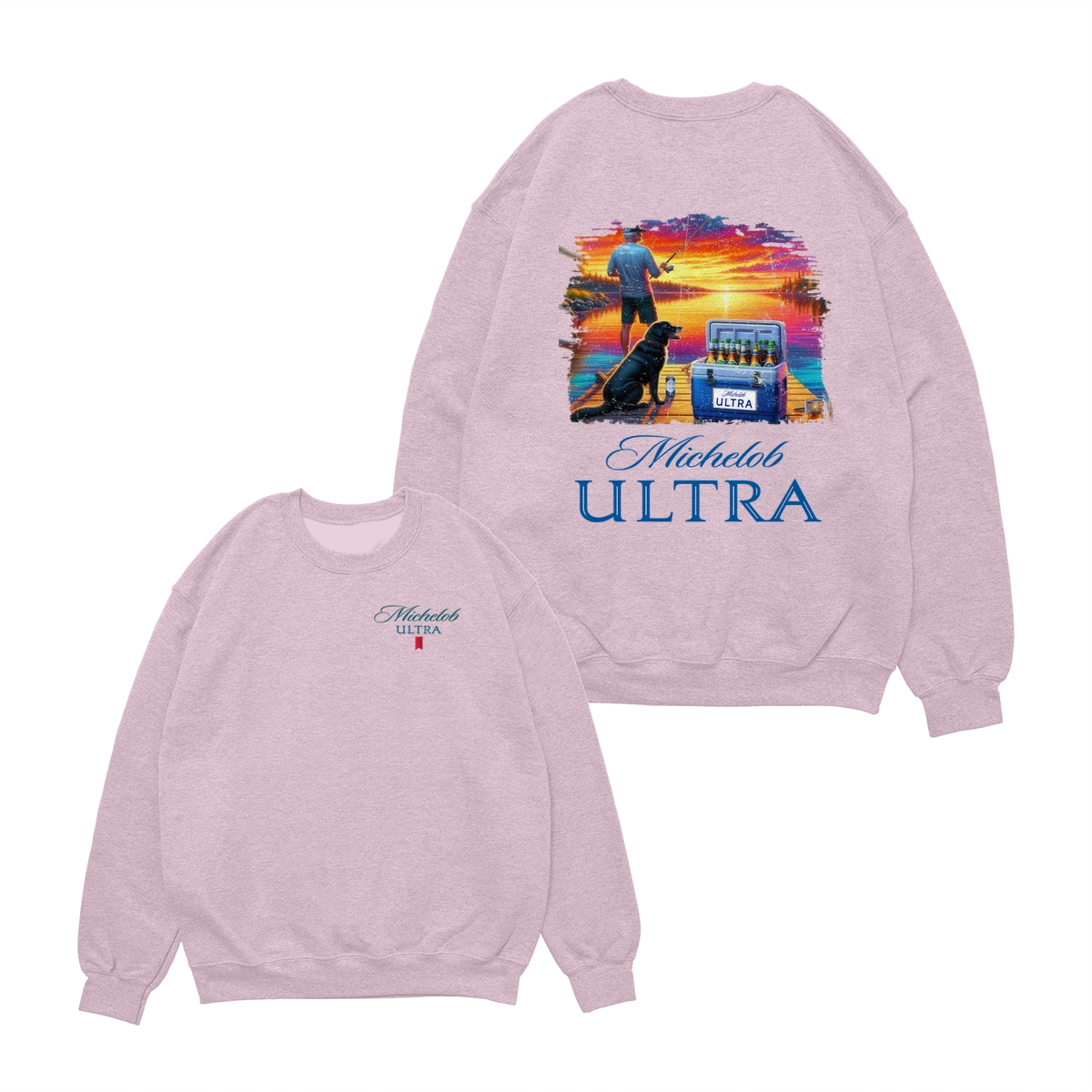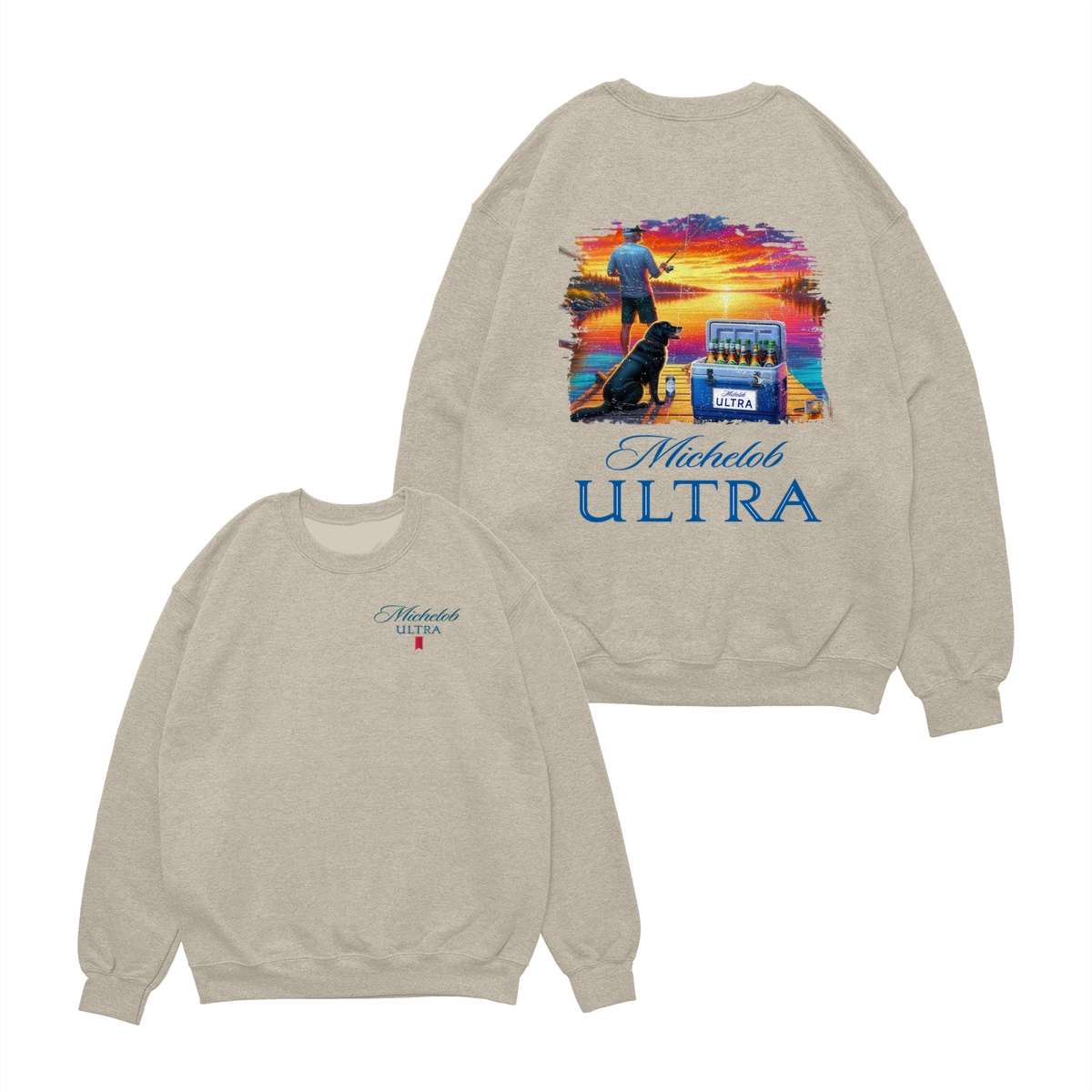 Michelob Ultra Fishing T-Shirt , Scenic Sunset Graphic With Dog And Beer Cooler , Relaxed Fit For Men , Ideal For Outdoor Adventures , Lake Days , Fishing Trips , Summer Casual Wear Tops Menswear