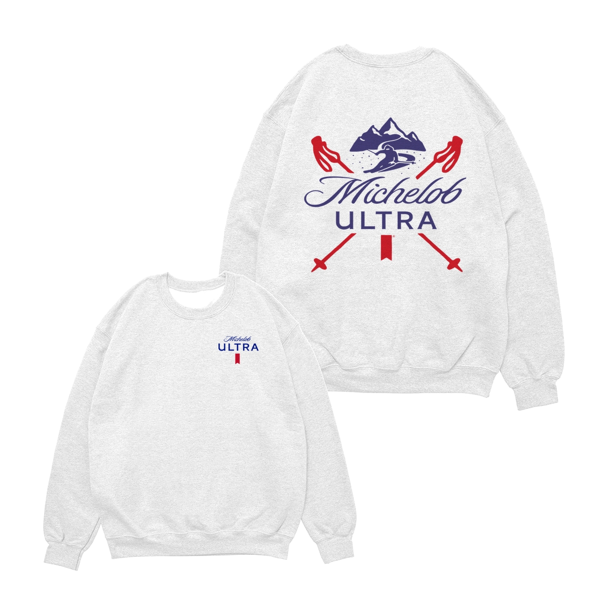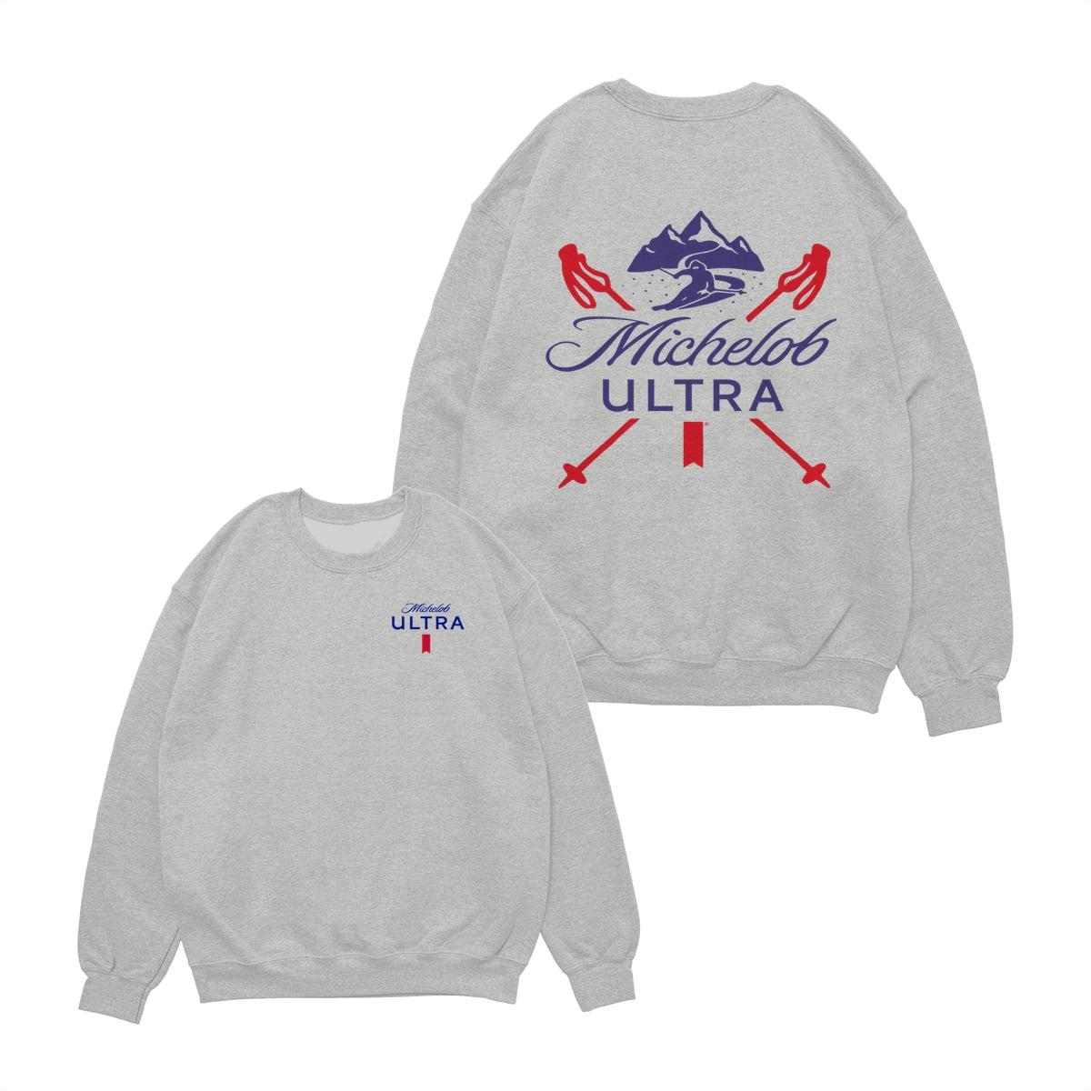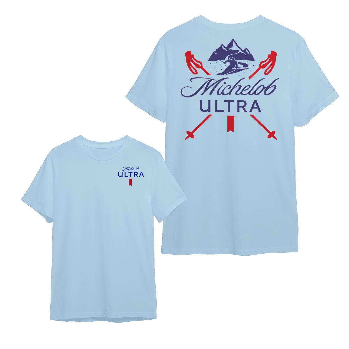 Michelob Ultra Ski T-Shirt – Bold Mountain Scene with Crossed Poles & Skier Graphic, Perfect Beer Tee for Snow Trips, Winter Vibes & Après-Ski Style