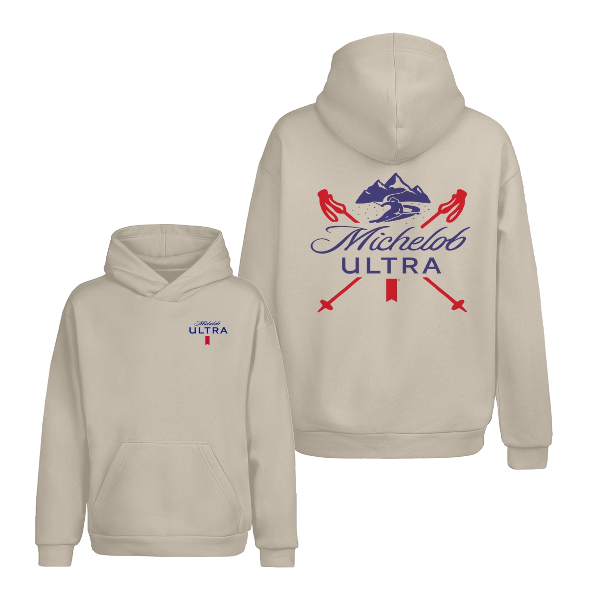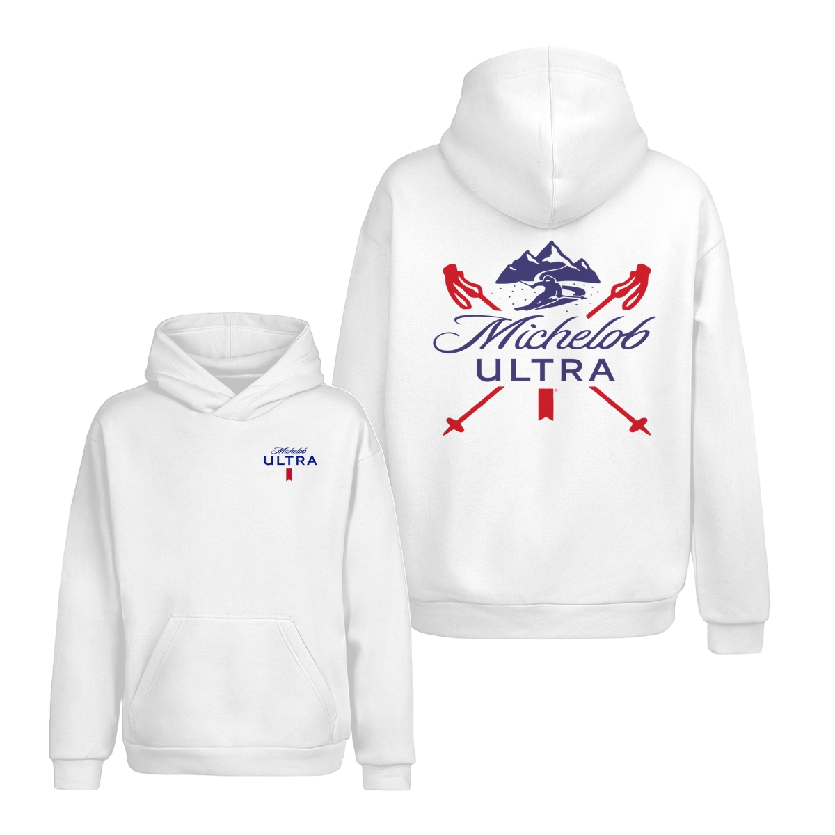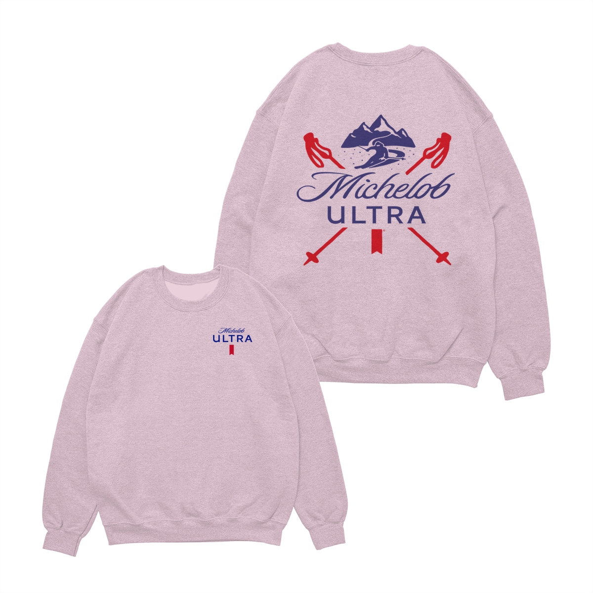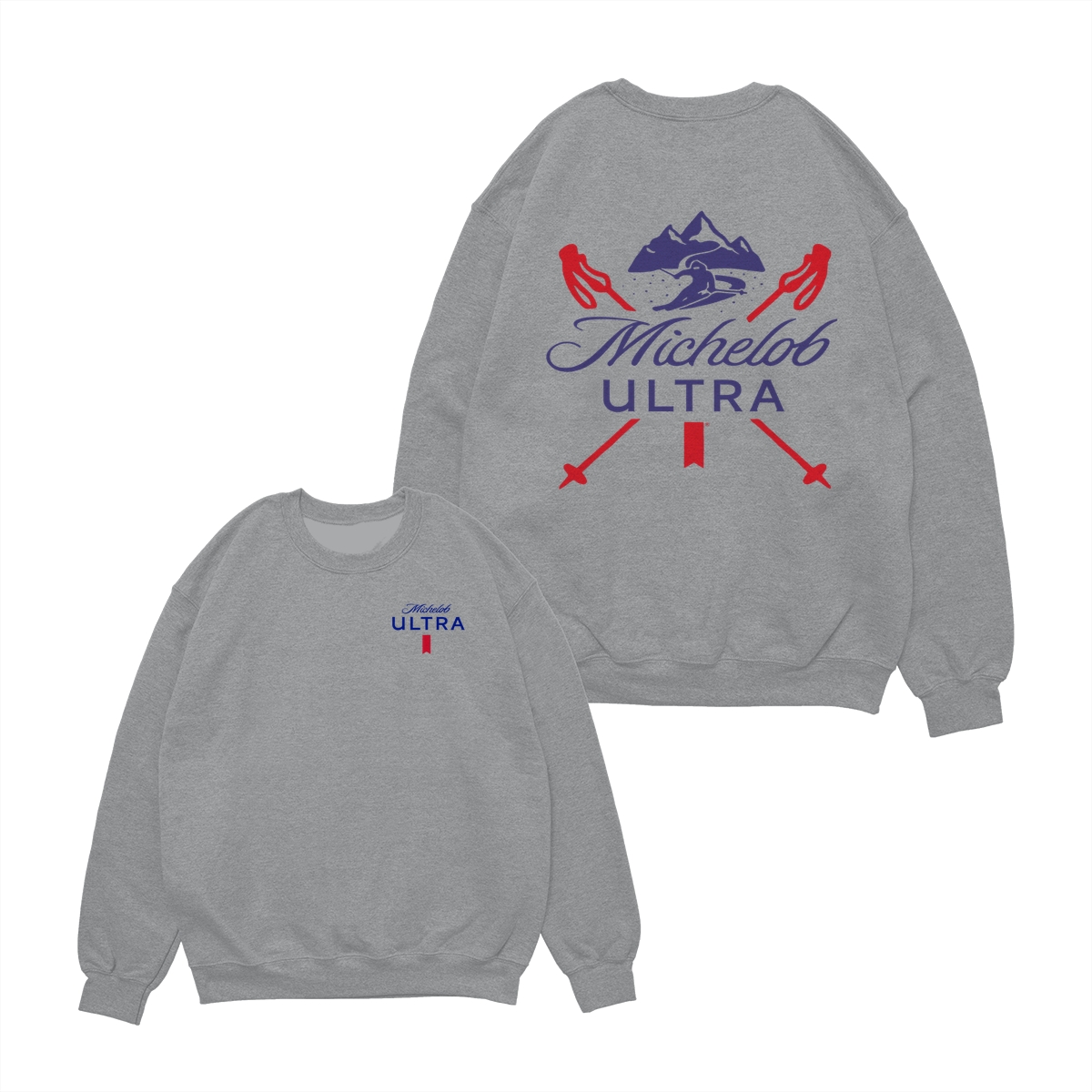 Michelob Ultra Ski T-Shirt – Bold Mountain Scene with Crossed Poles & Skier Graphic, Perfect Beer Tee for Snow Trips, Winter Vibes & Après-Ski Style