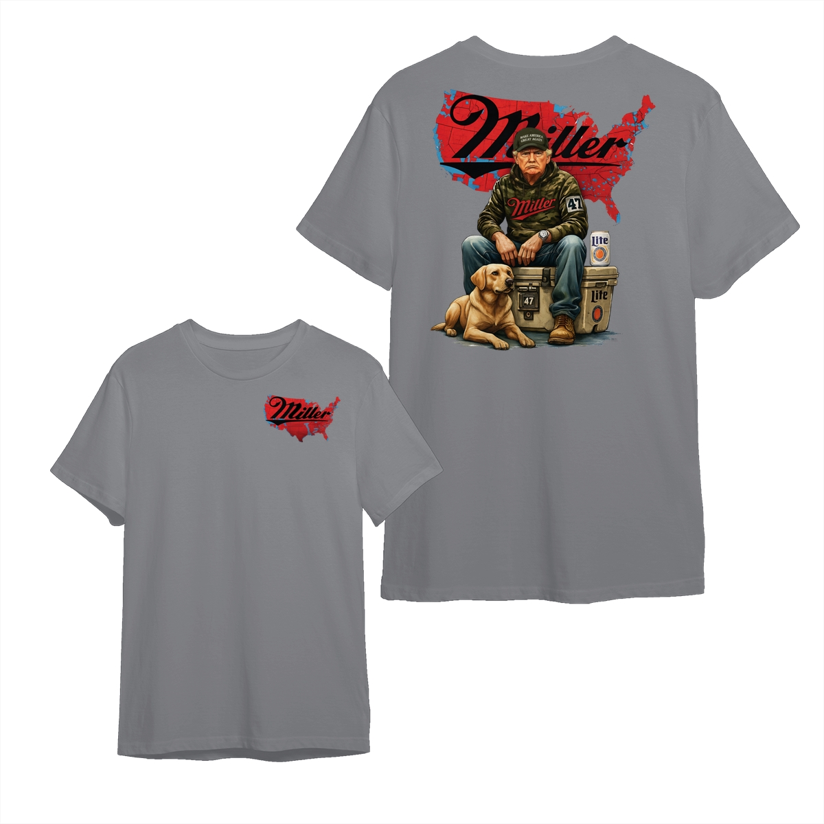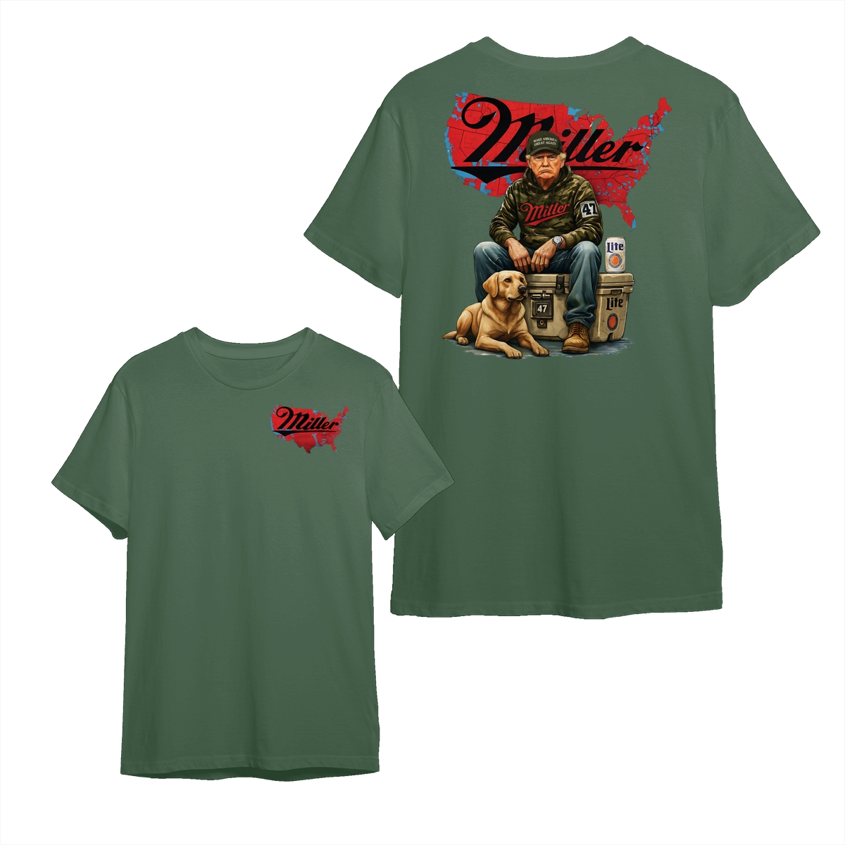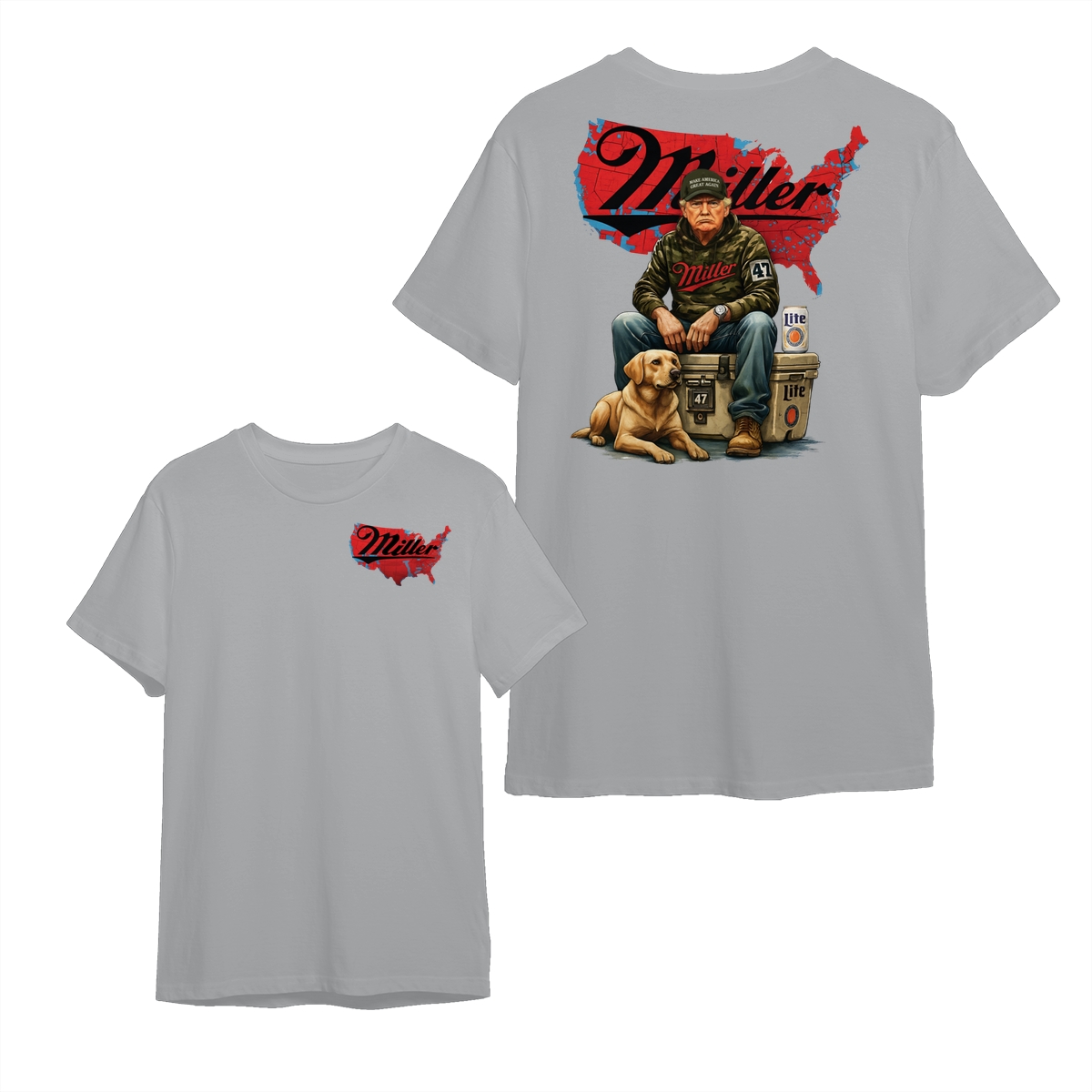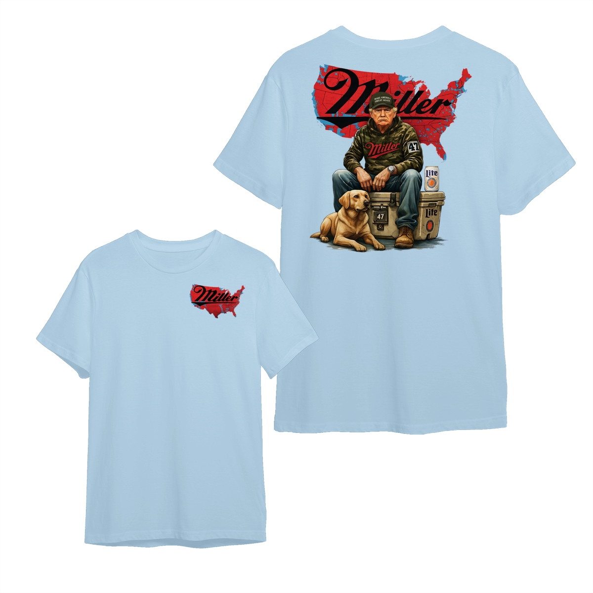 Miller Lite Man and Dog T-Shirt – Patriotic Beer Map Graphic, 2‑Sided Soft Cotton Blend Shirt, Country Lifestyle Apparel for Men & Women, Perfect American Beer Gift
