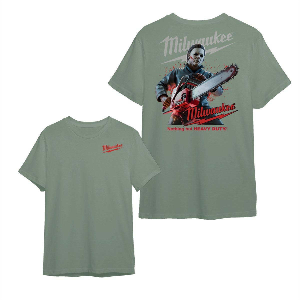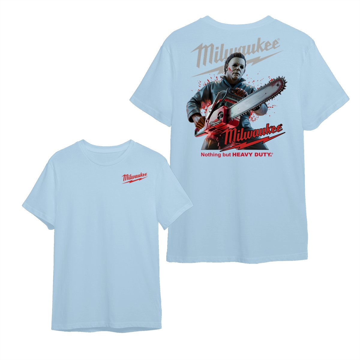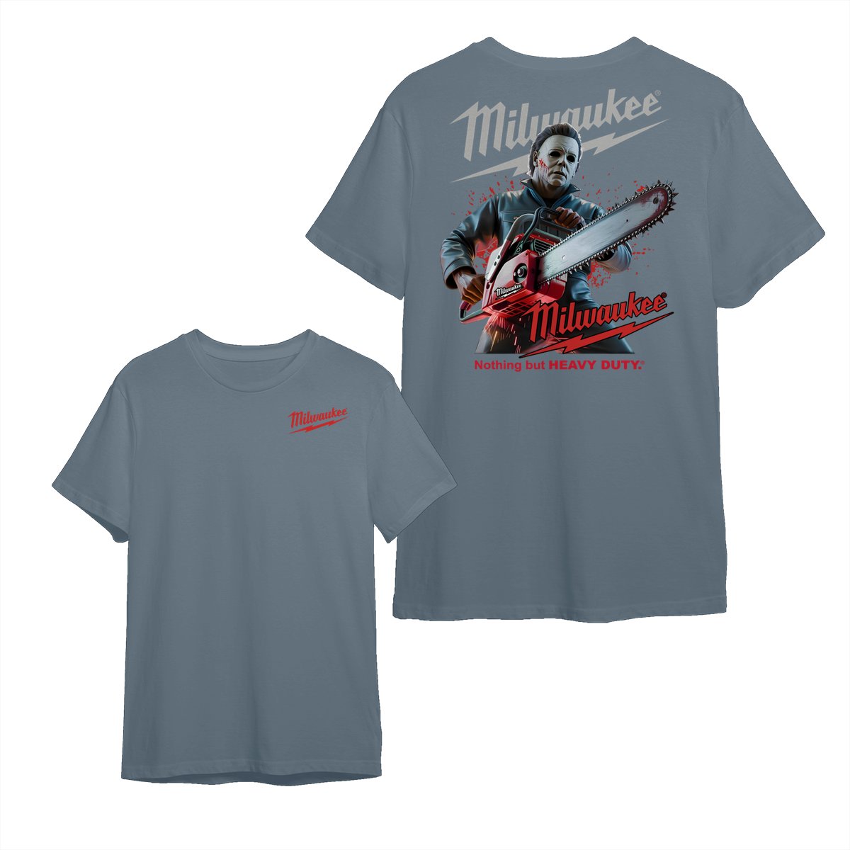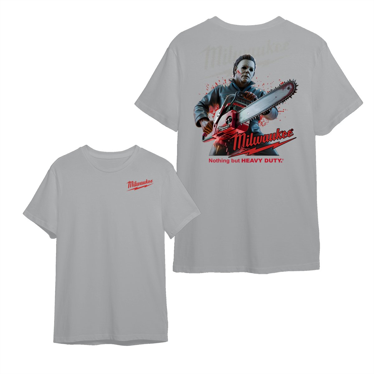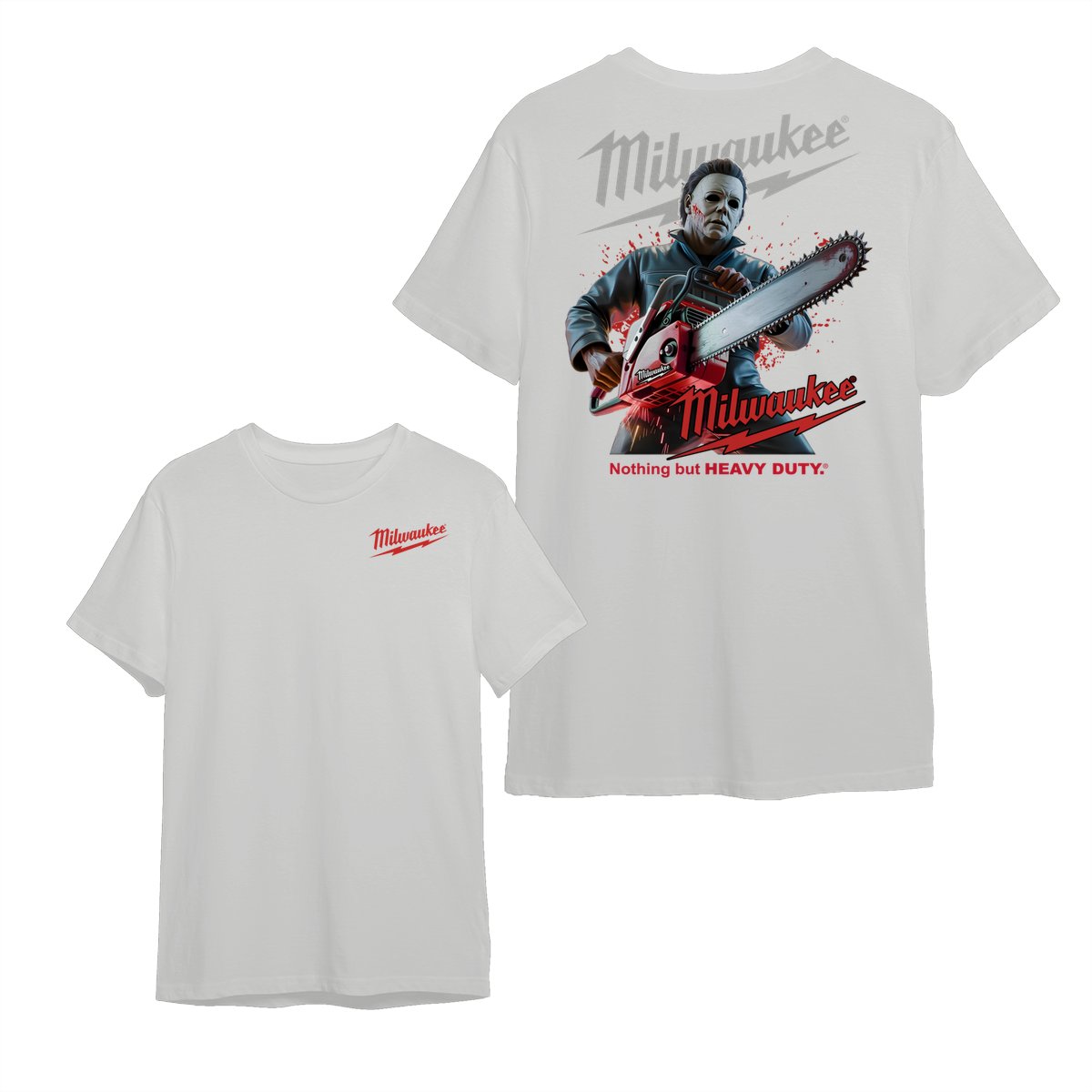 Milwaukee Chainsaw Horror T-Shirt – Michael Myers with Blood Splatter & “Nothing But Heavy Duty” Slogan – Unisex Cotton Streetwear Tee for Halloween, Horror Fans & Menswear Lovers