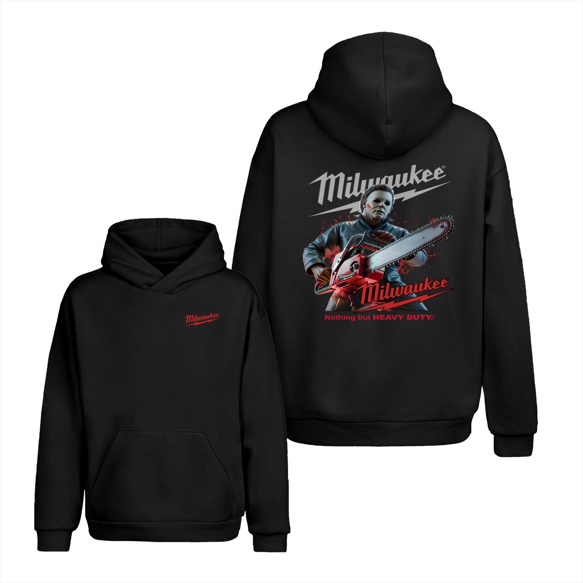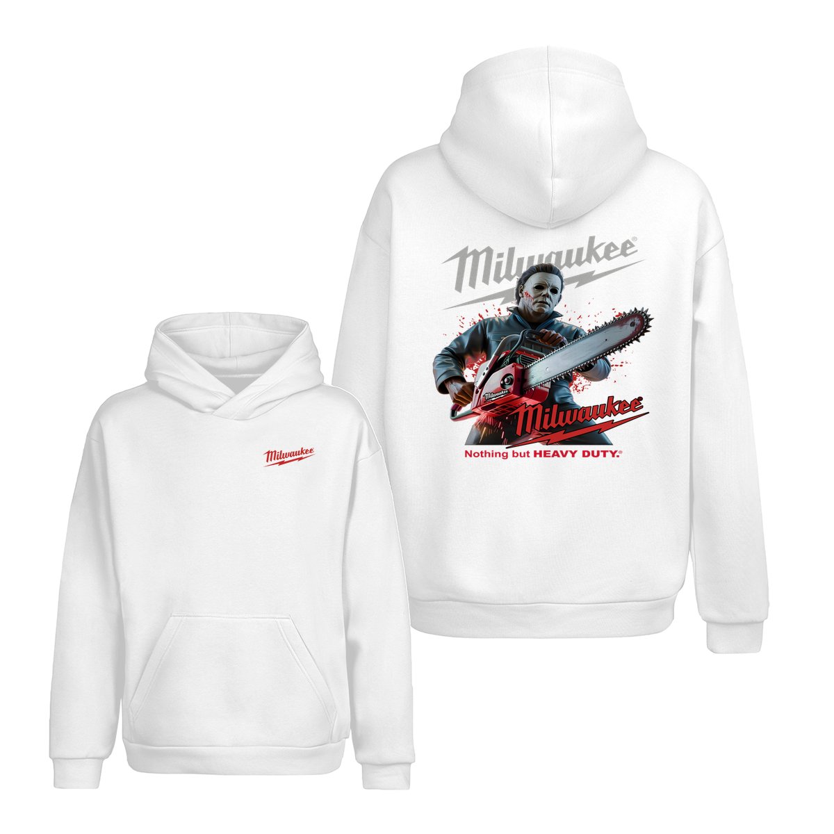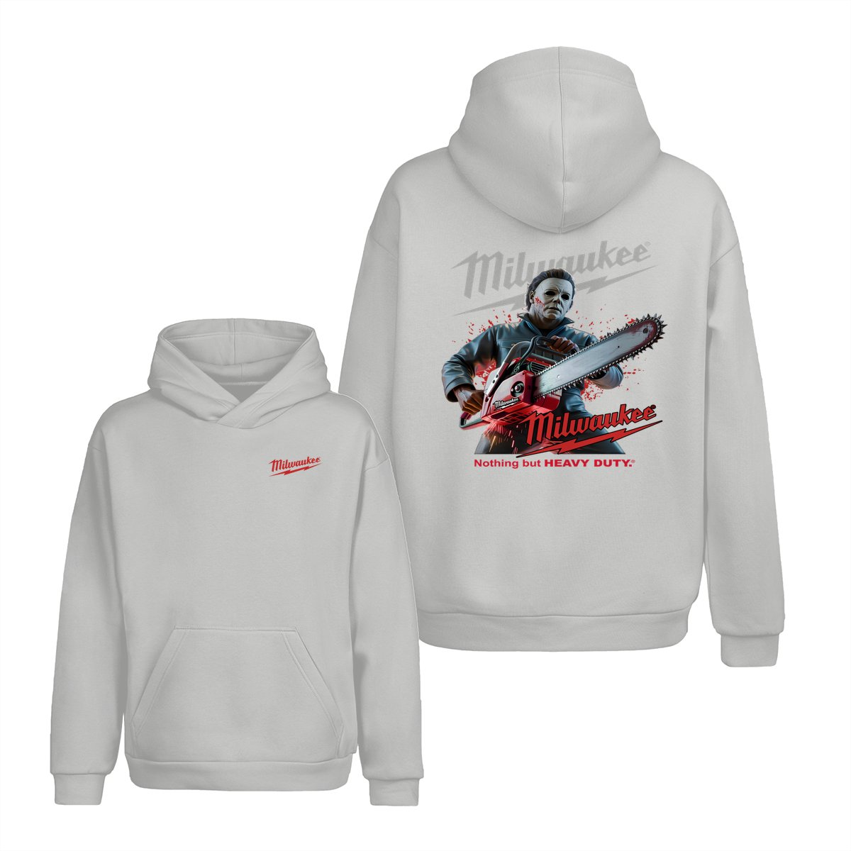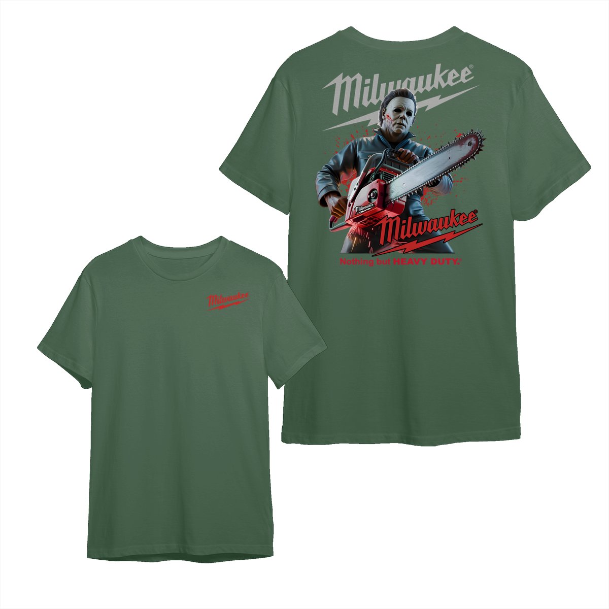 Milwaukee Chainsaw Horror T-Shirt – Michael Myers with Blood Splatter & “Nothing But Heavy Duty” Slogan – Unisex Cotton Streetwear Tee for Halloween, Horror Fans & Menswear Lovers