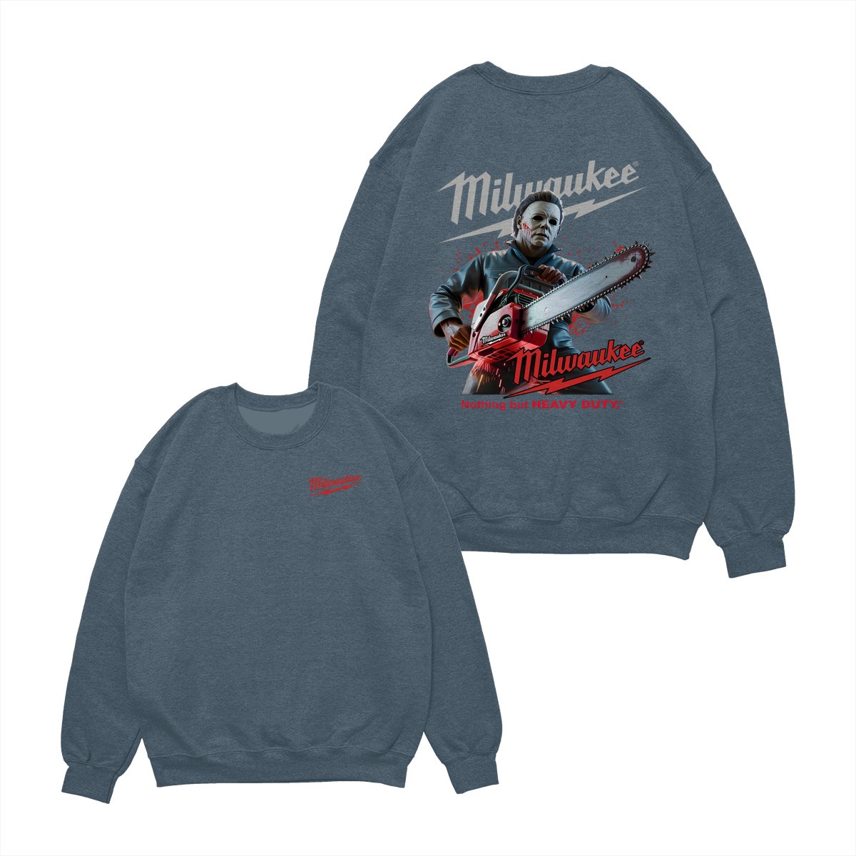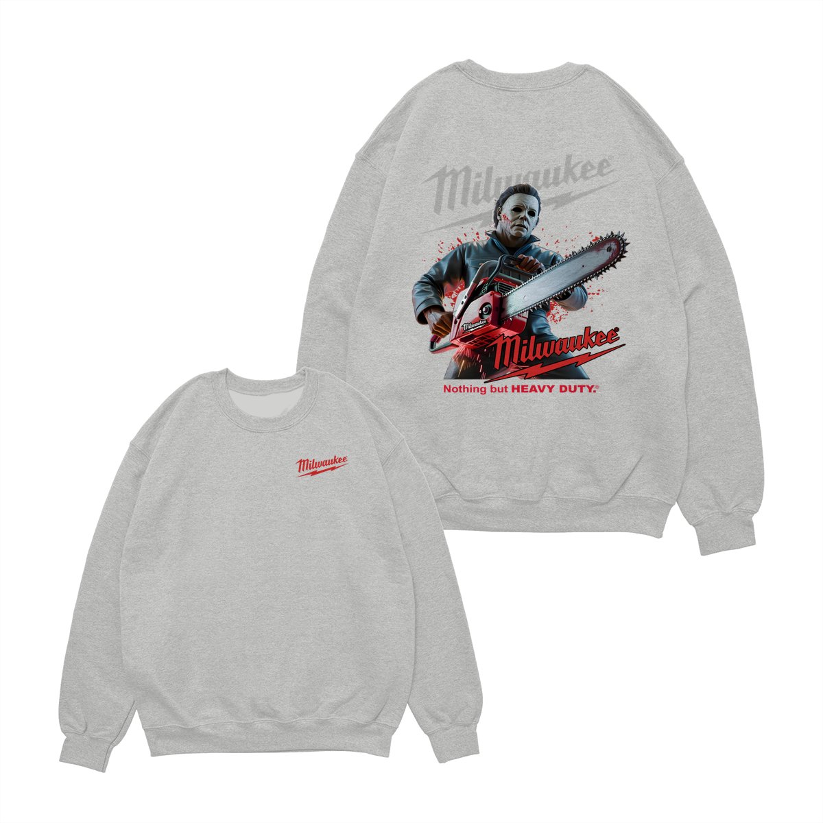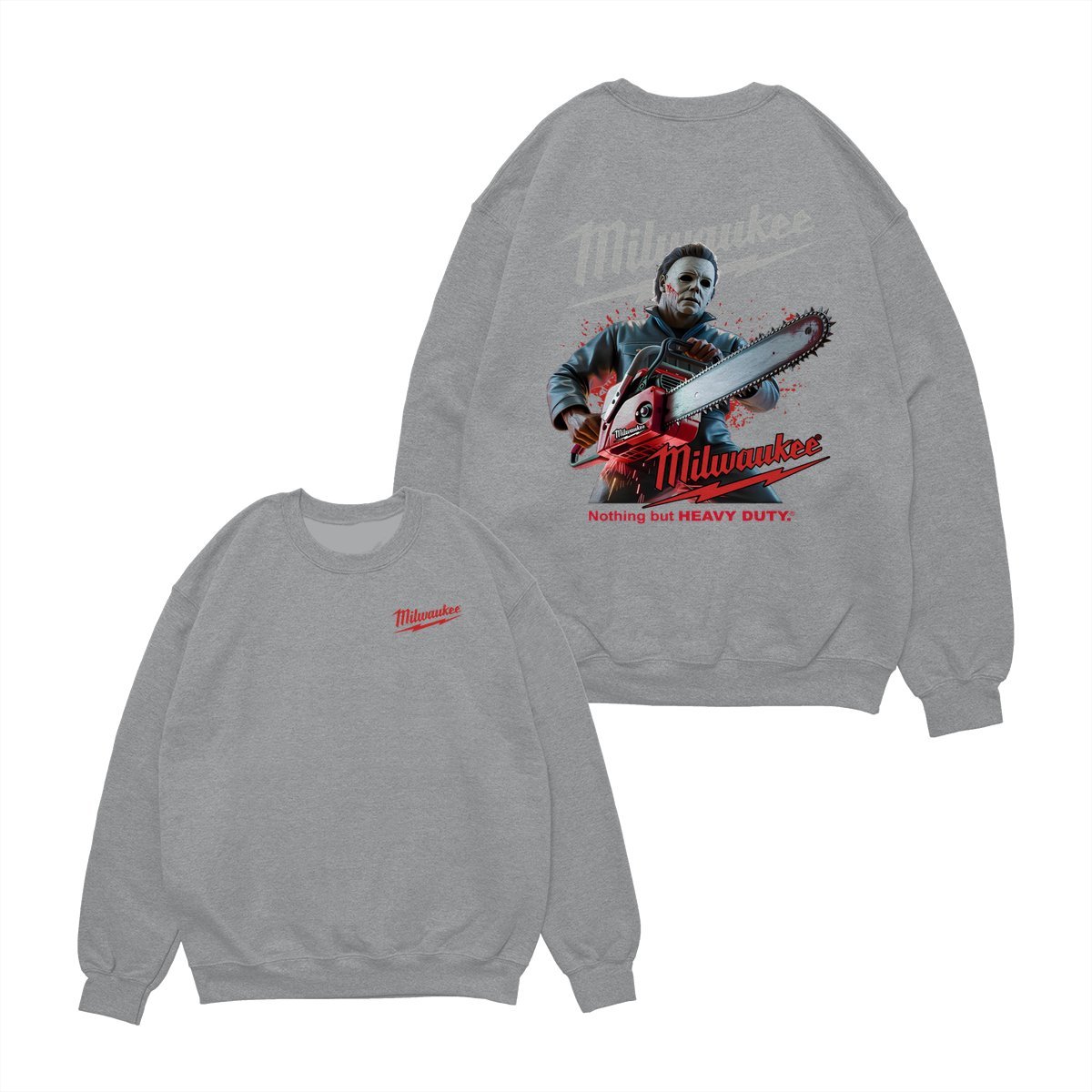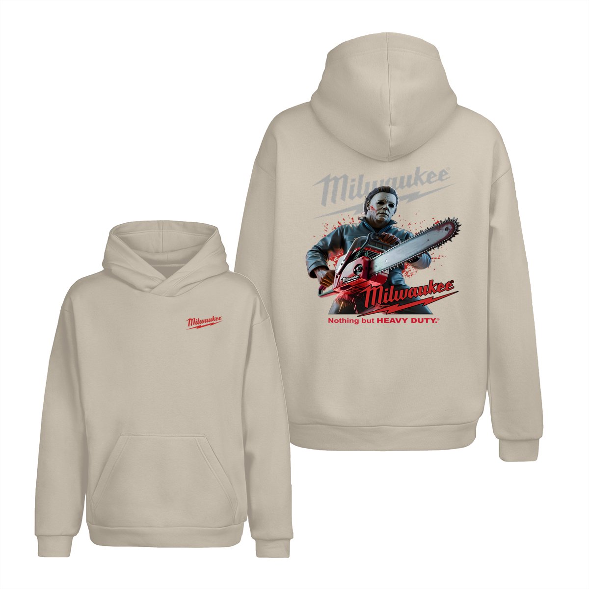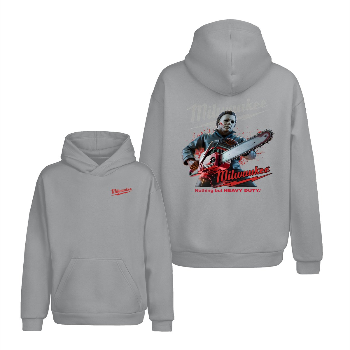 Milwaukee Chainsaw Horror T-Shirt – Michael Myers with Blood Splatter & “Nothing But Heavy Duty” Slogan – Unisex Cotton Streetwear Tee for Halloween, Horror Fans & Menswear Lovers