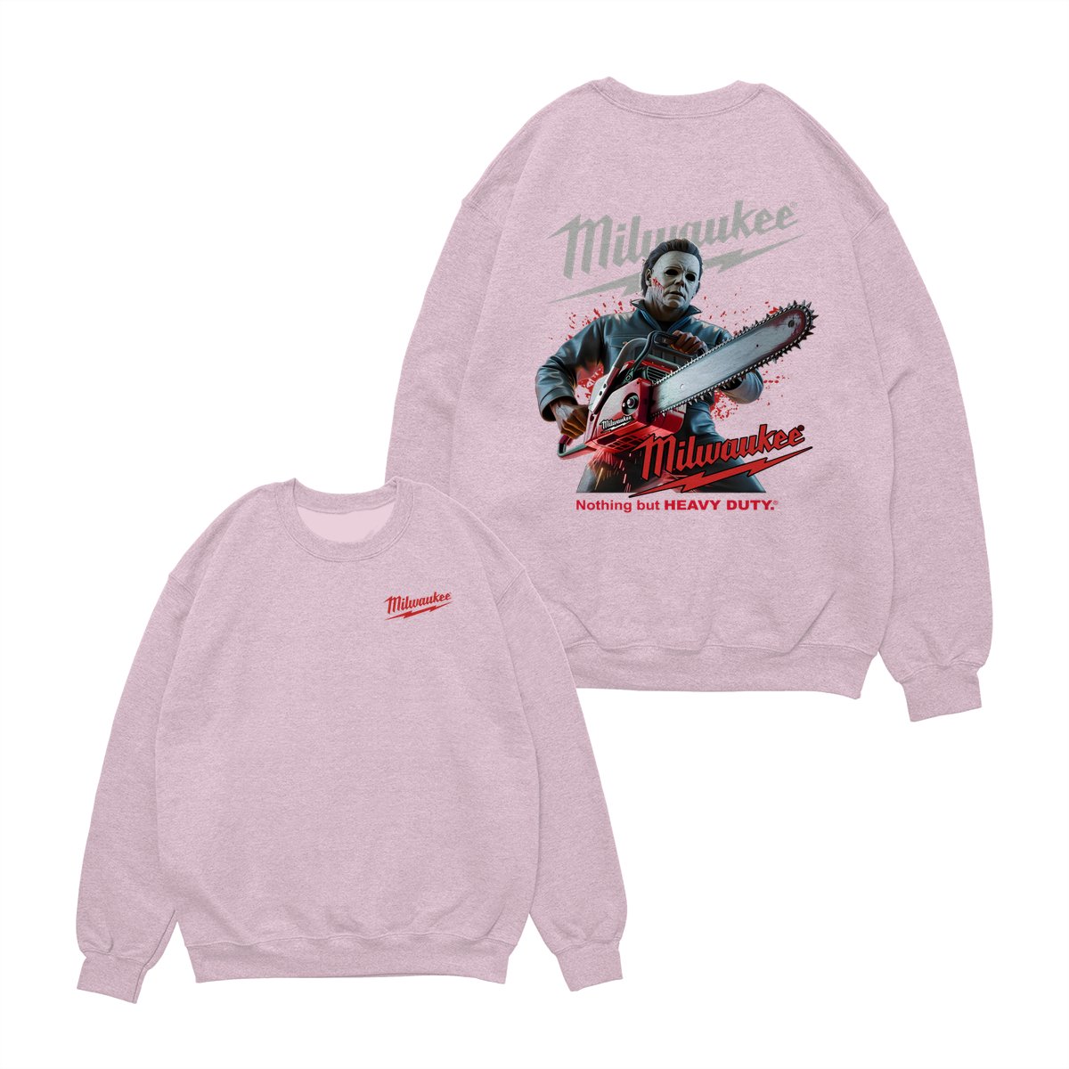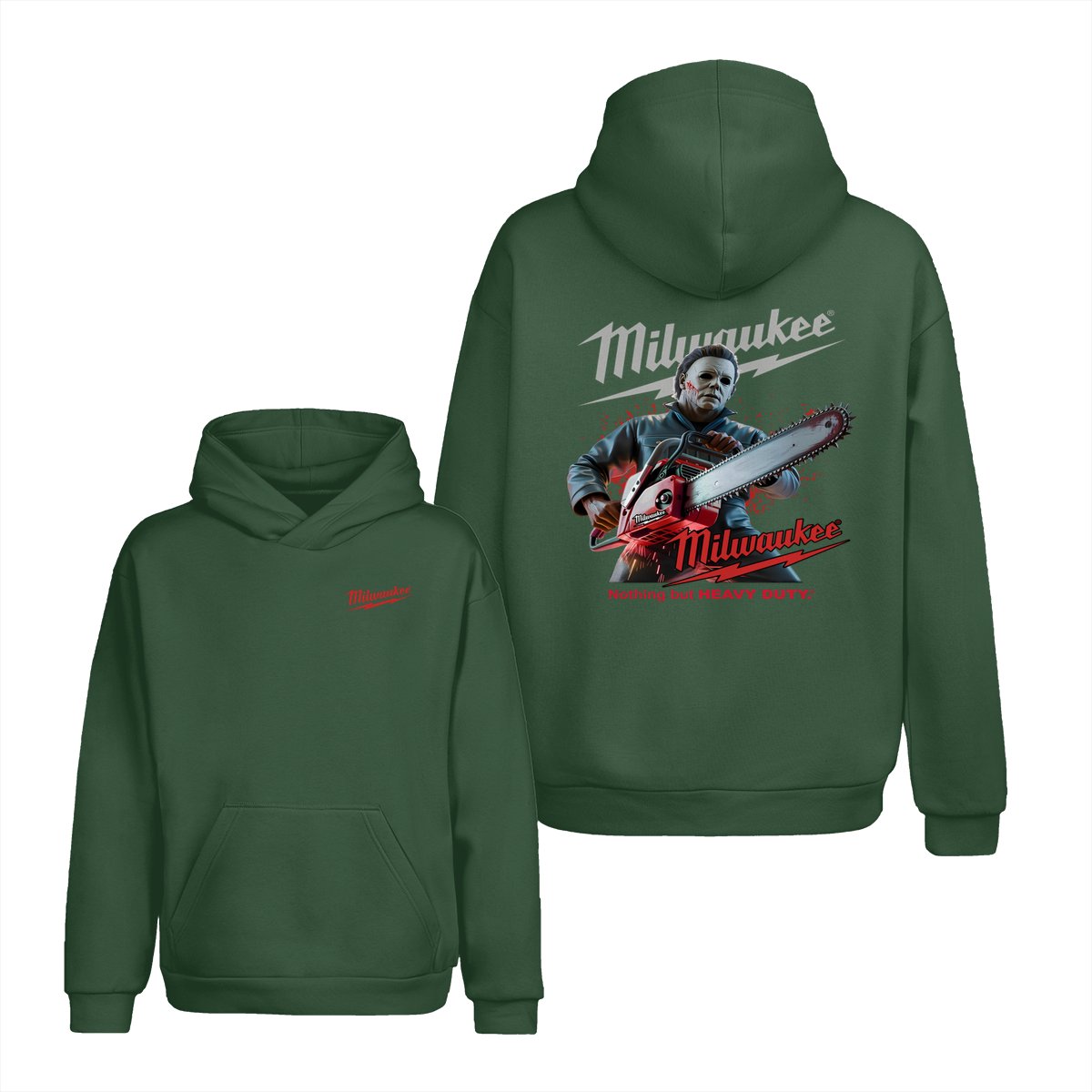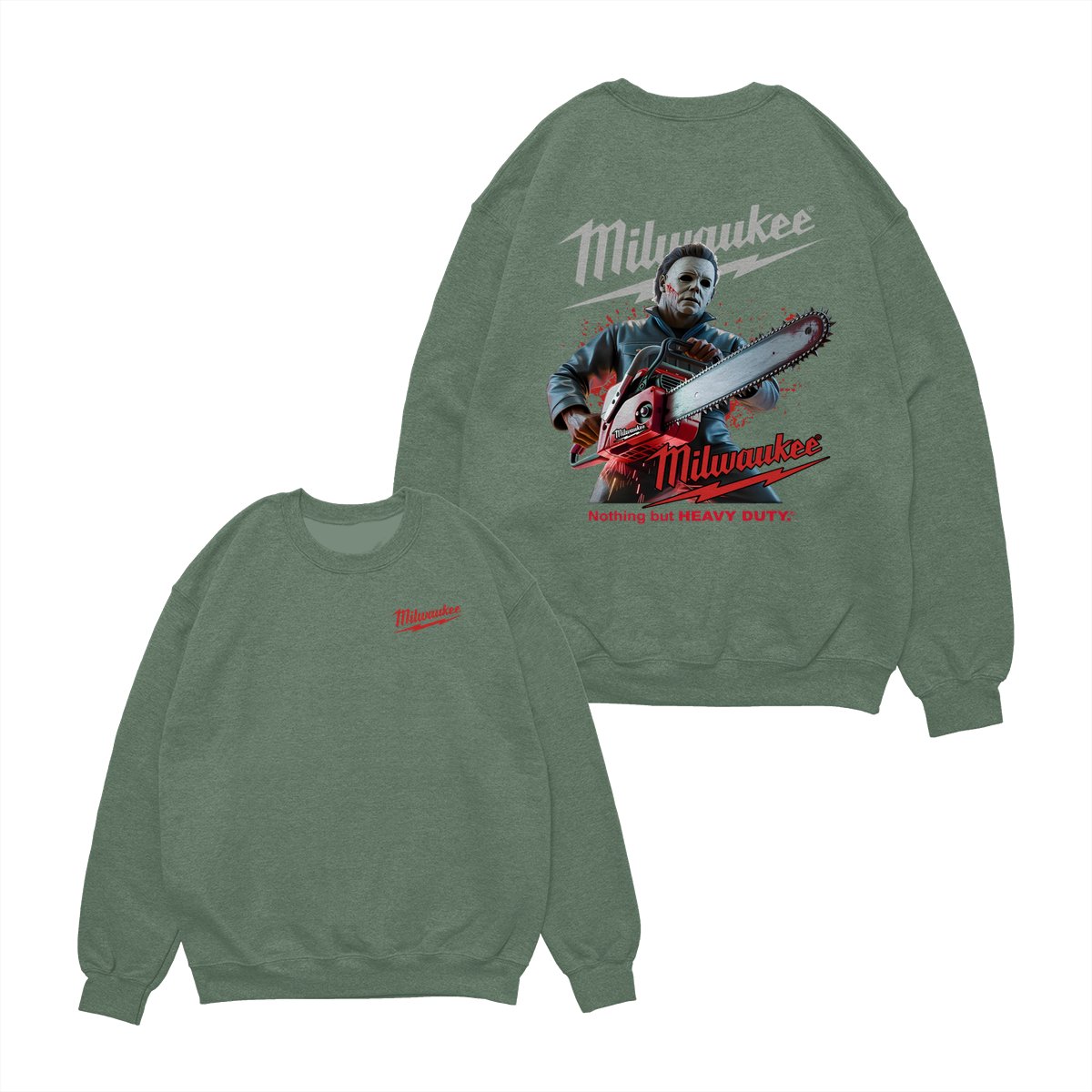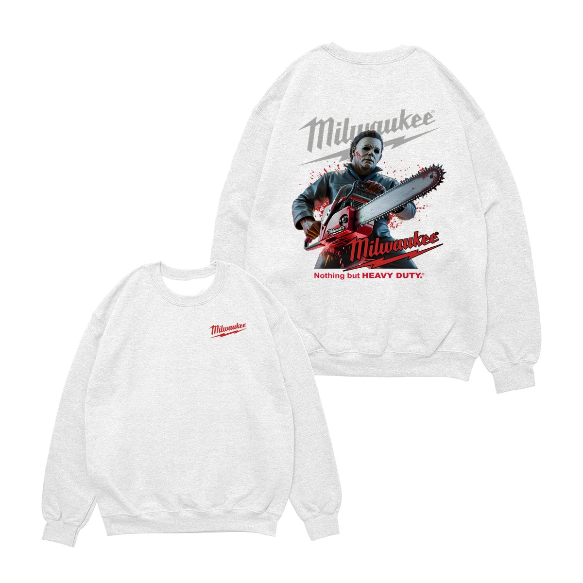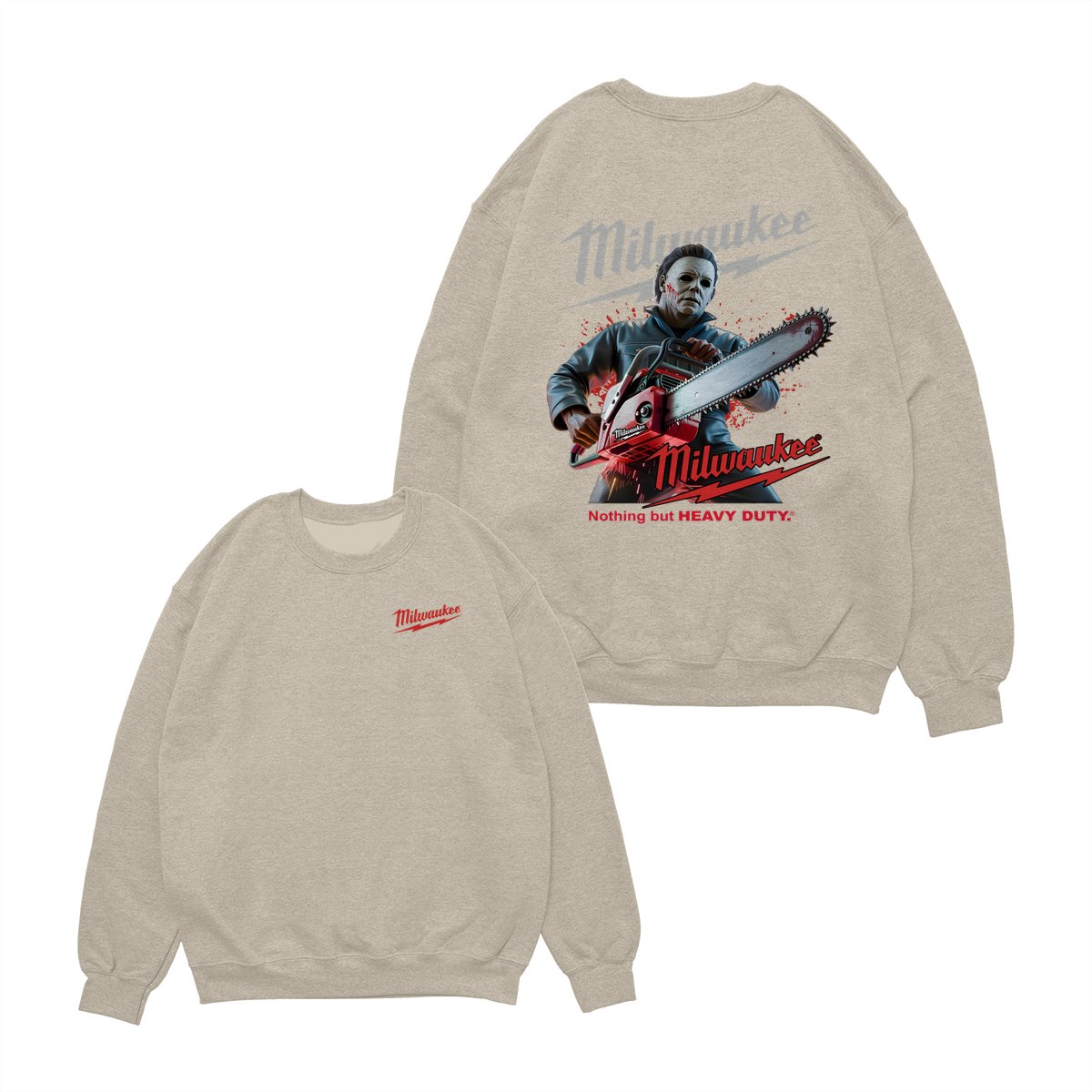 Milwaukee Chainsaw Horror T-Shirt – Michael Myers with Blood Splatter & “Nothing But Heavy Duty” Slogan – Unisex Cotton Streetwear Tee for Halloween, Horror Fans & Menswear Lovers