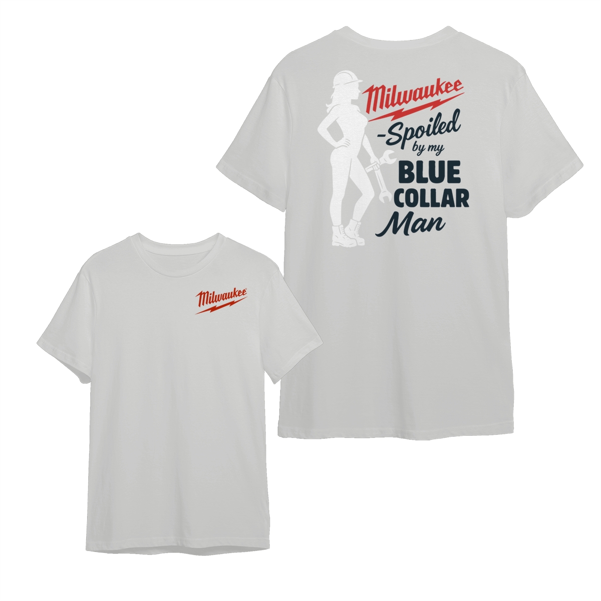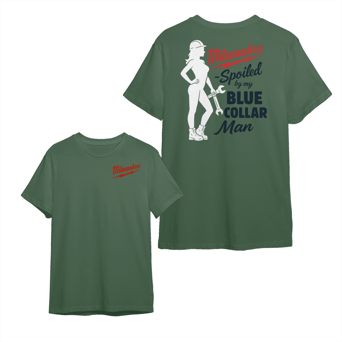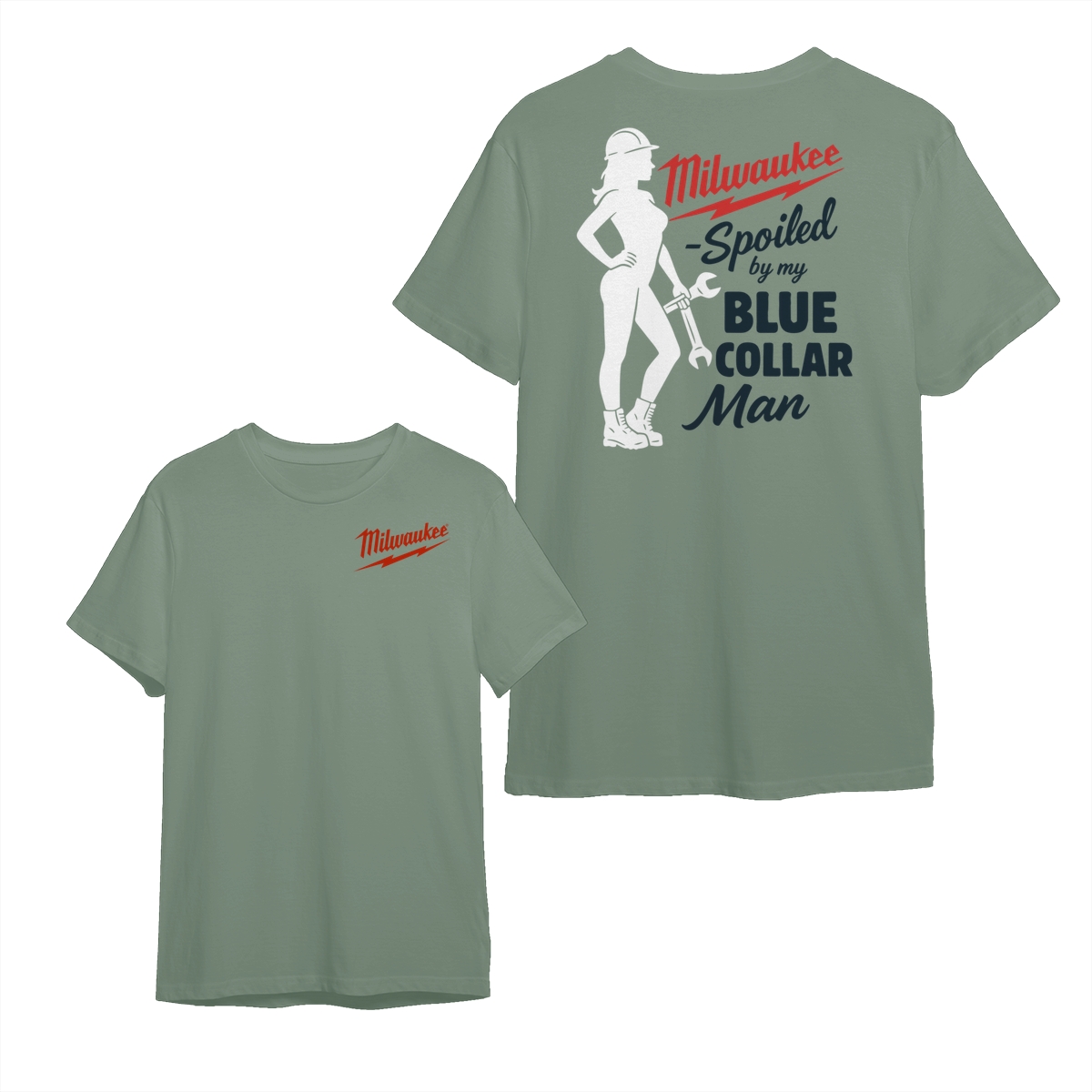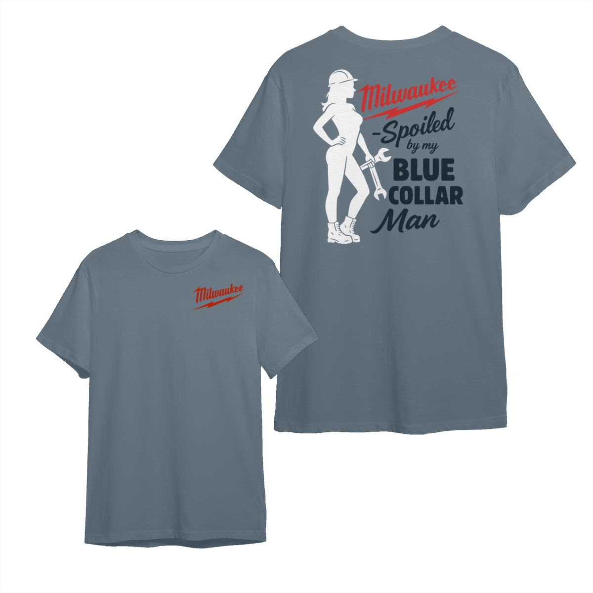 Milwaukee Spoiled 2sides T-Shirt – Sexy Female Worker Graphic with Wrench & Hard Hat, Fun “Spoiled by My Blue Collar Man” Tee for Women Loving Labor & Power Style