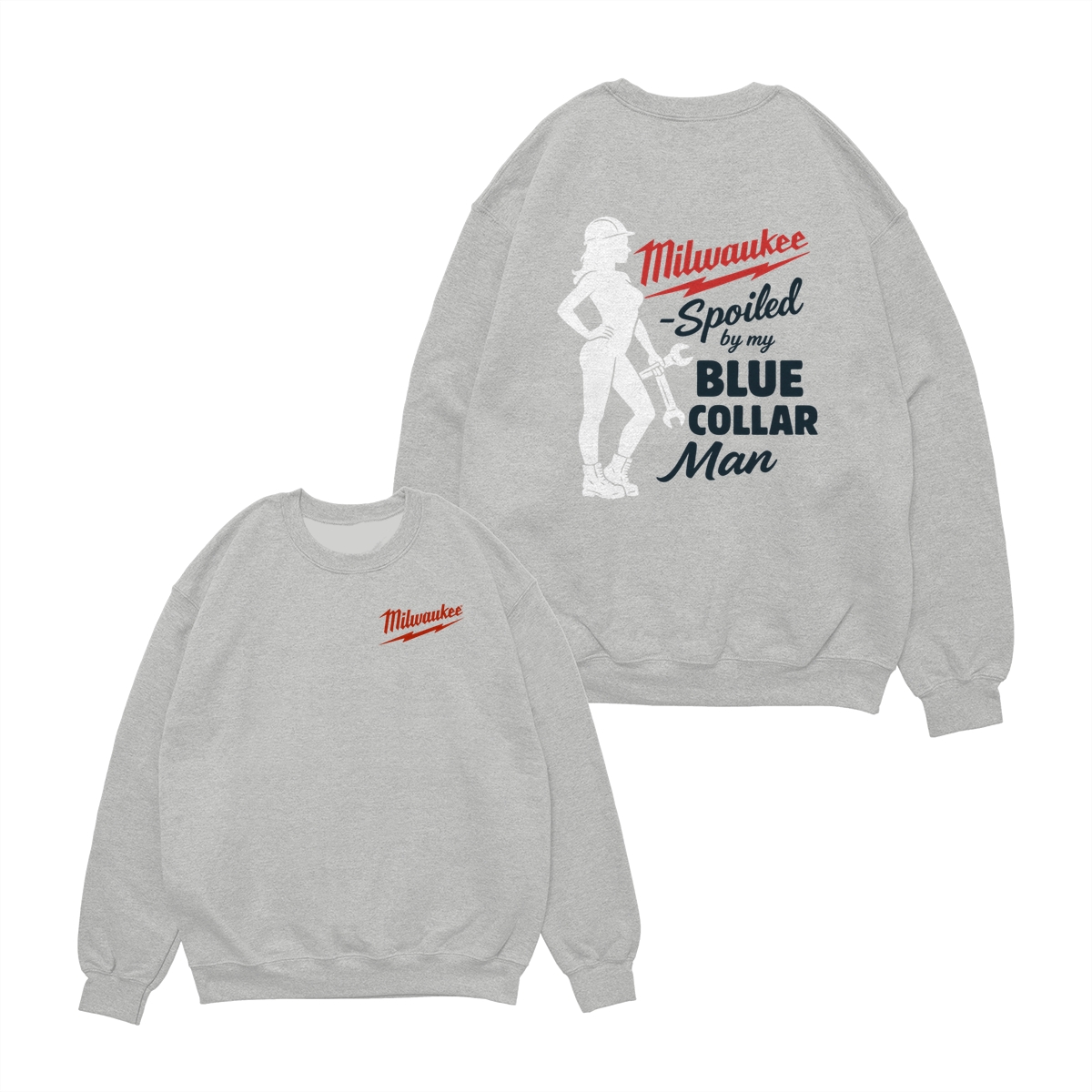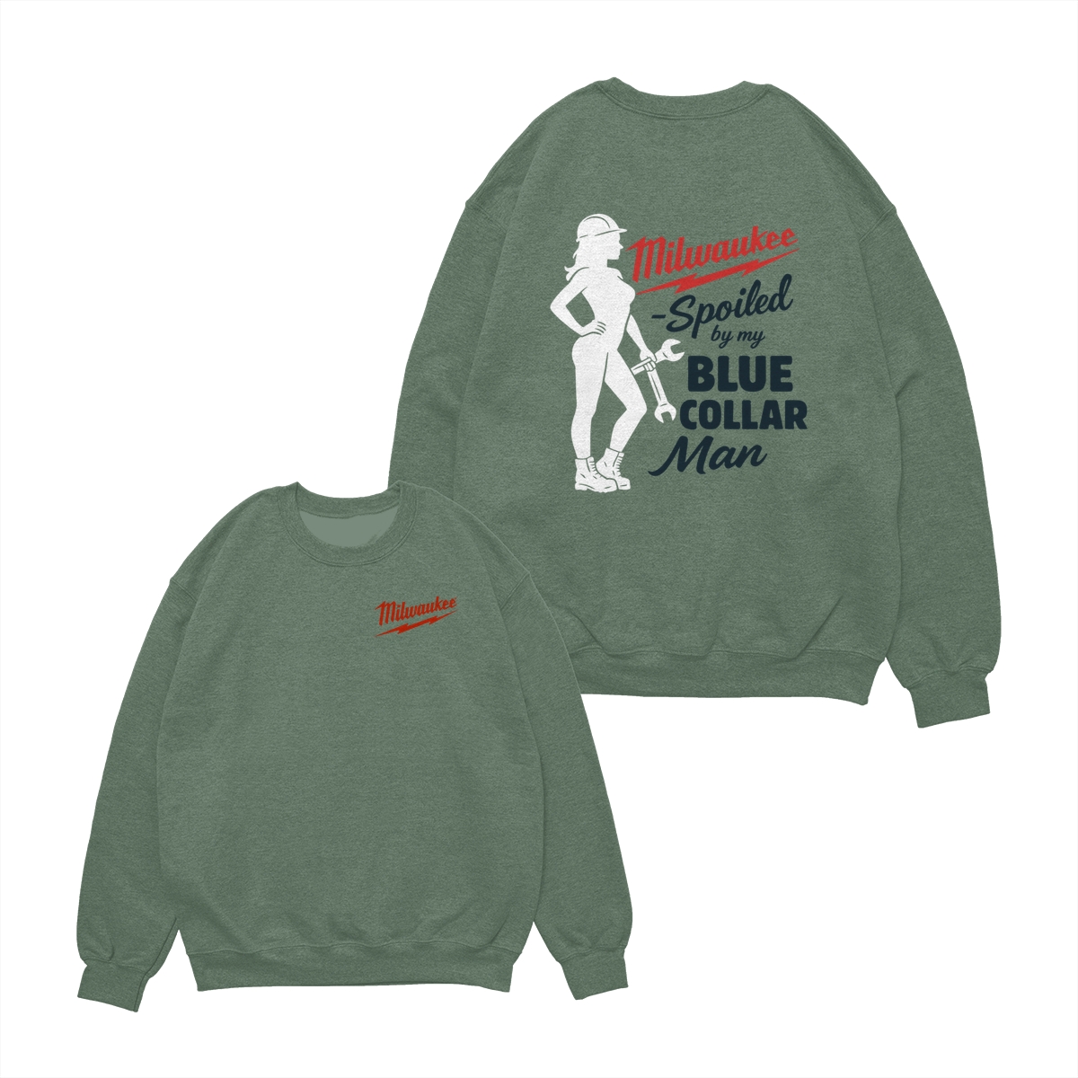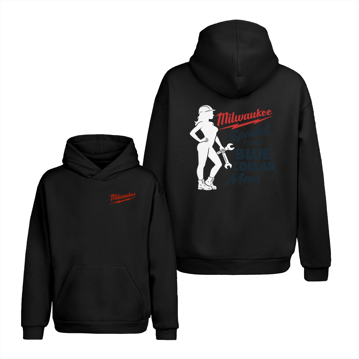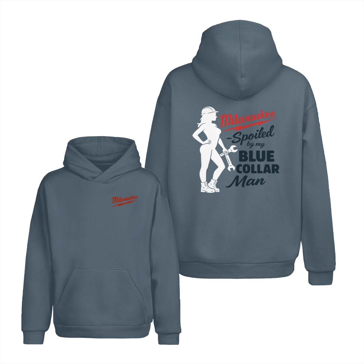 Milwaukee Spoiled 2sides T-Shirt – Sexy Female Worker Graphic with Wrench & Hard Hat, Fun “Spoiled by My Blue Collar Man” Tee for Women Loving Labor & Power Style