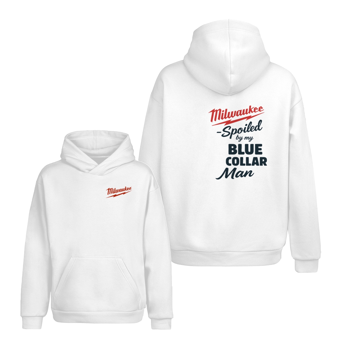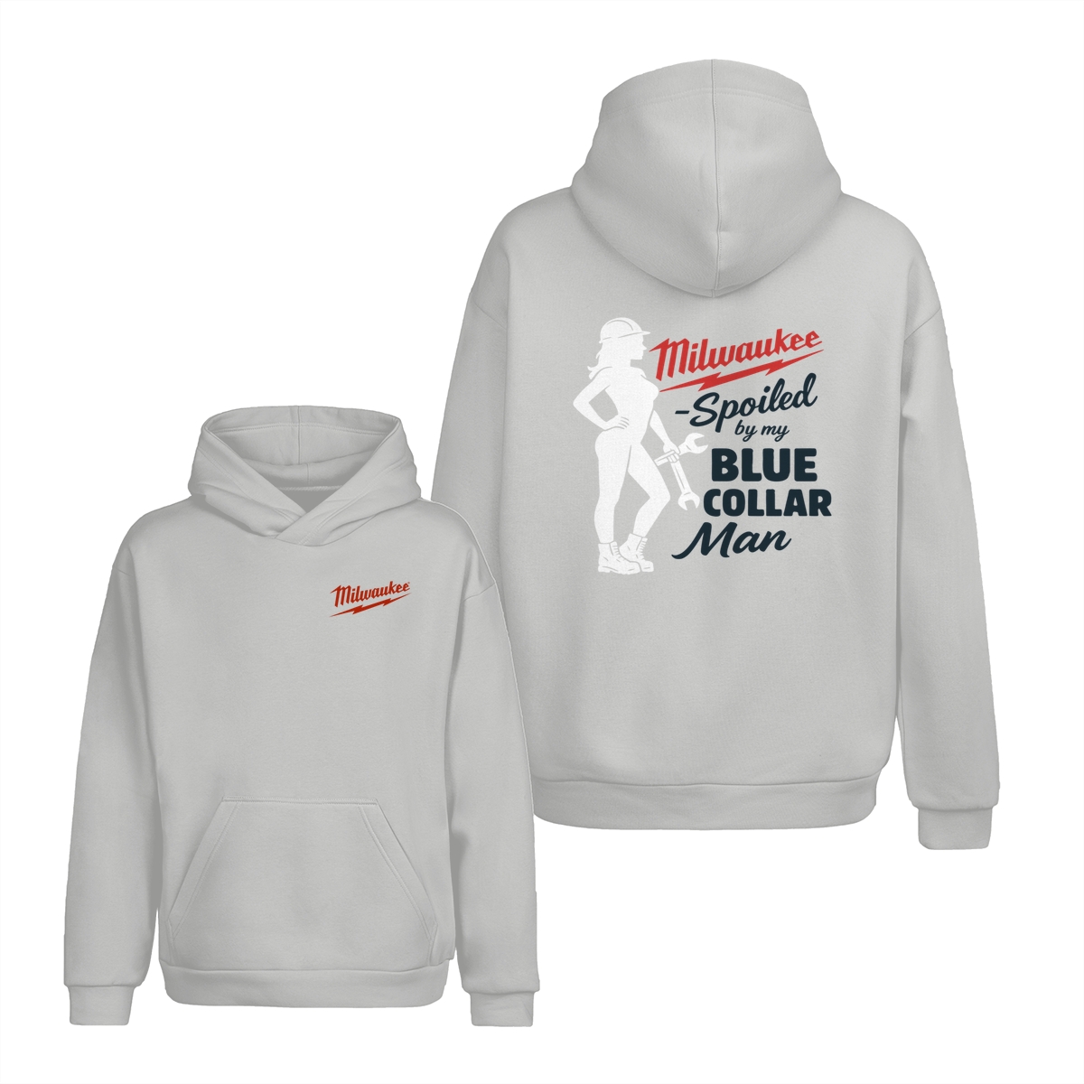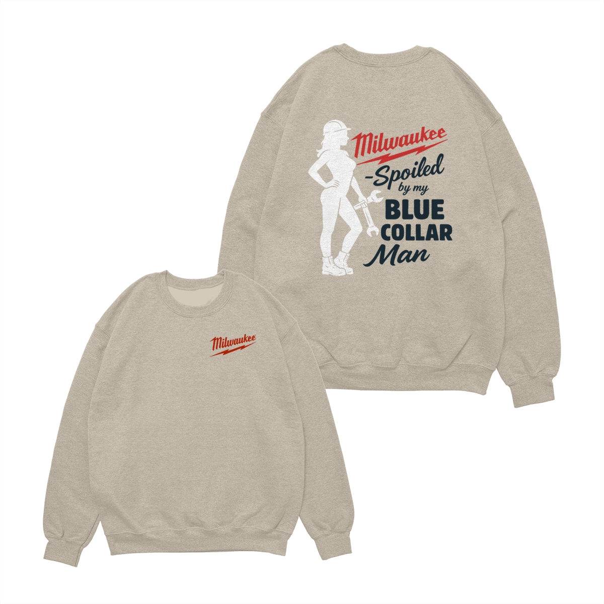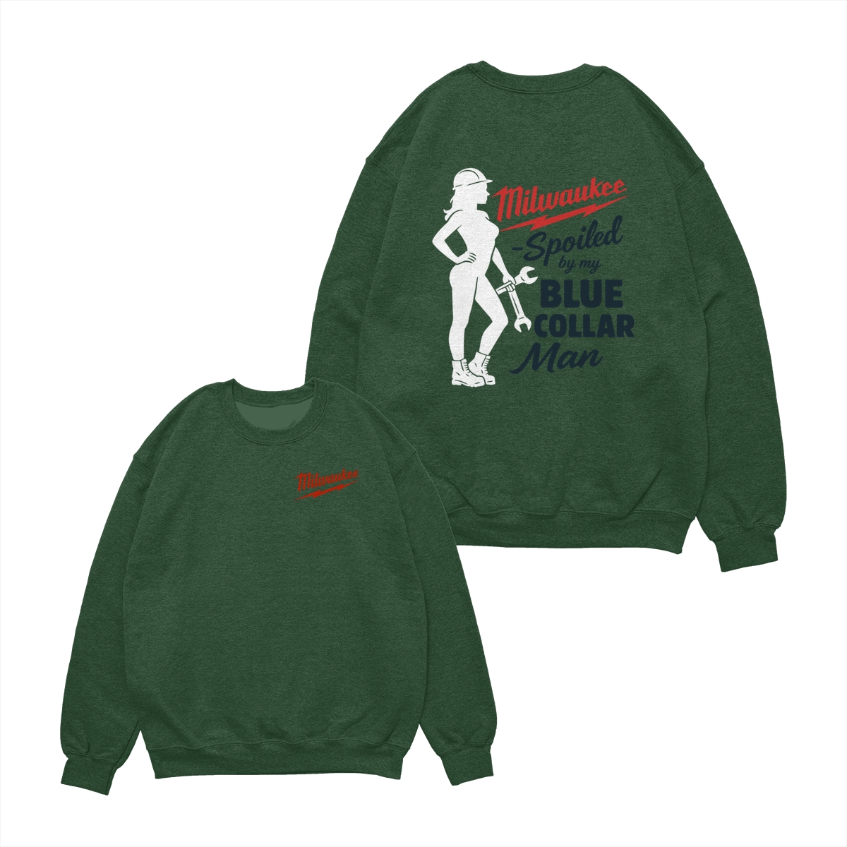 Milwaukee Spoiled 2sides T-Shirt – Sexy Female Worker Graphic with Wrench & Hard Hat, Fun “Spoiled by My Blue Collar Man” Tee for Women Loving Labor & Power Style