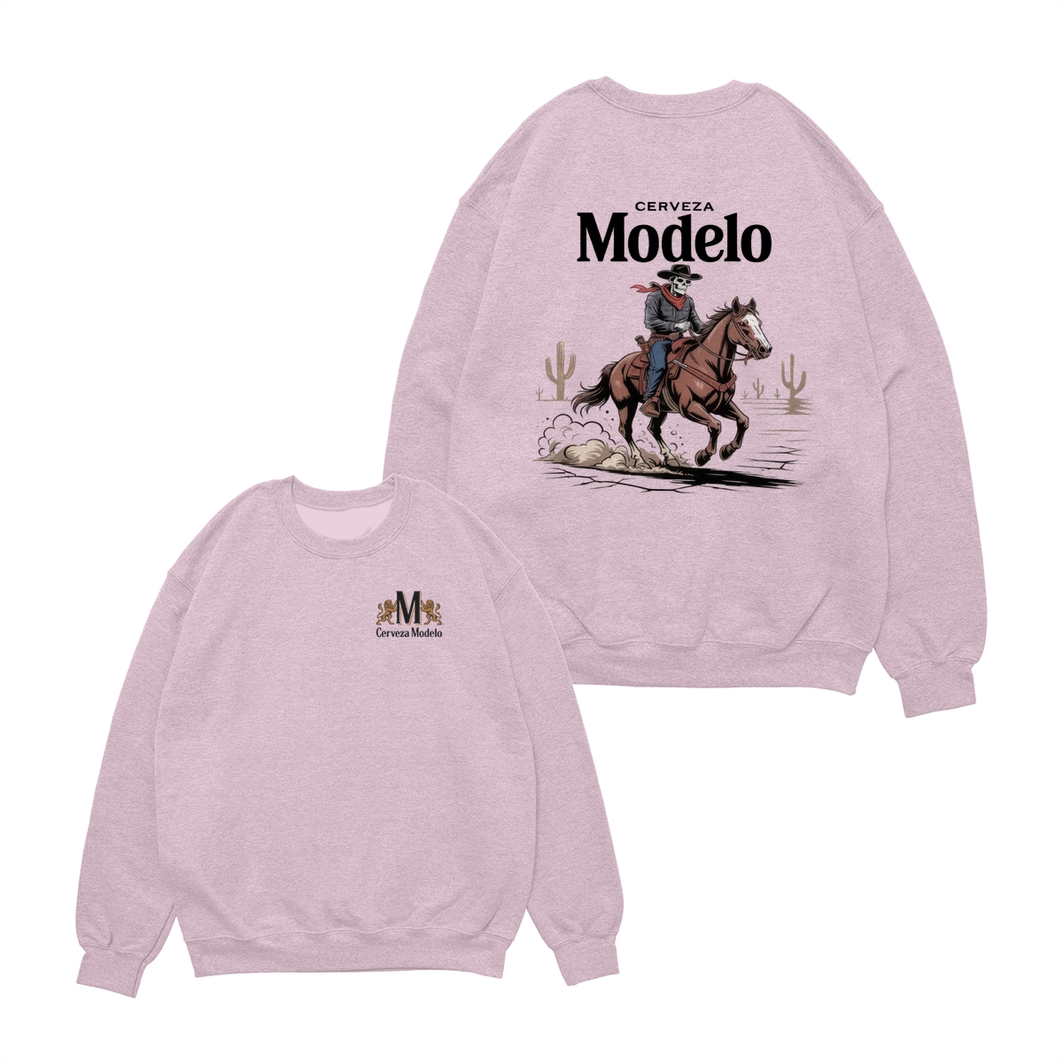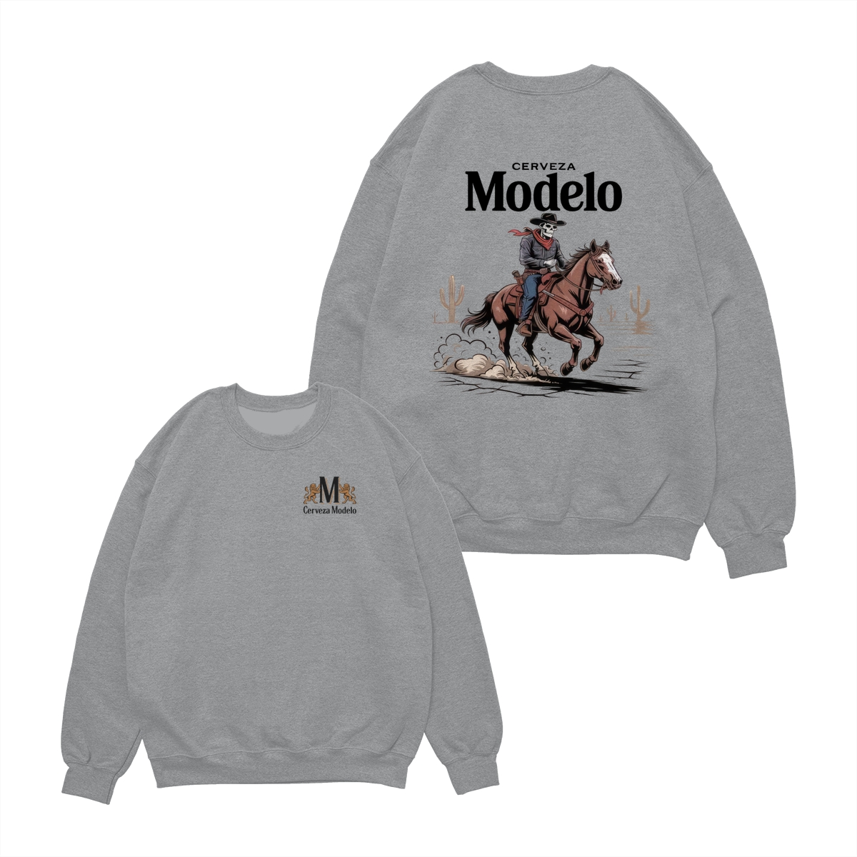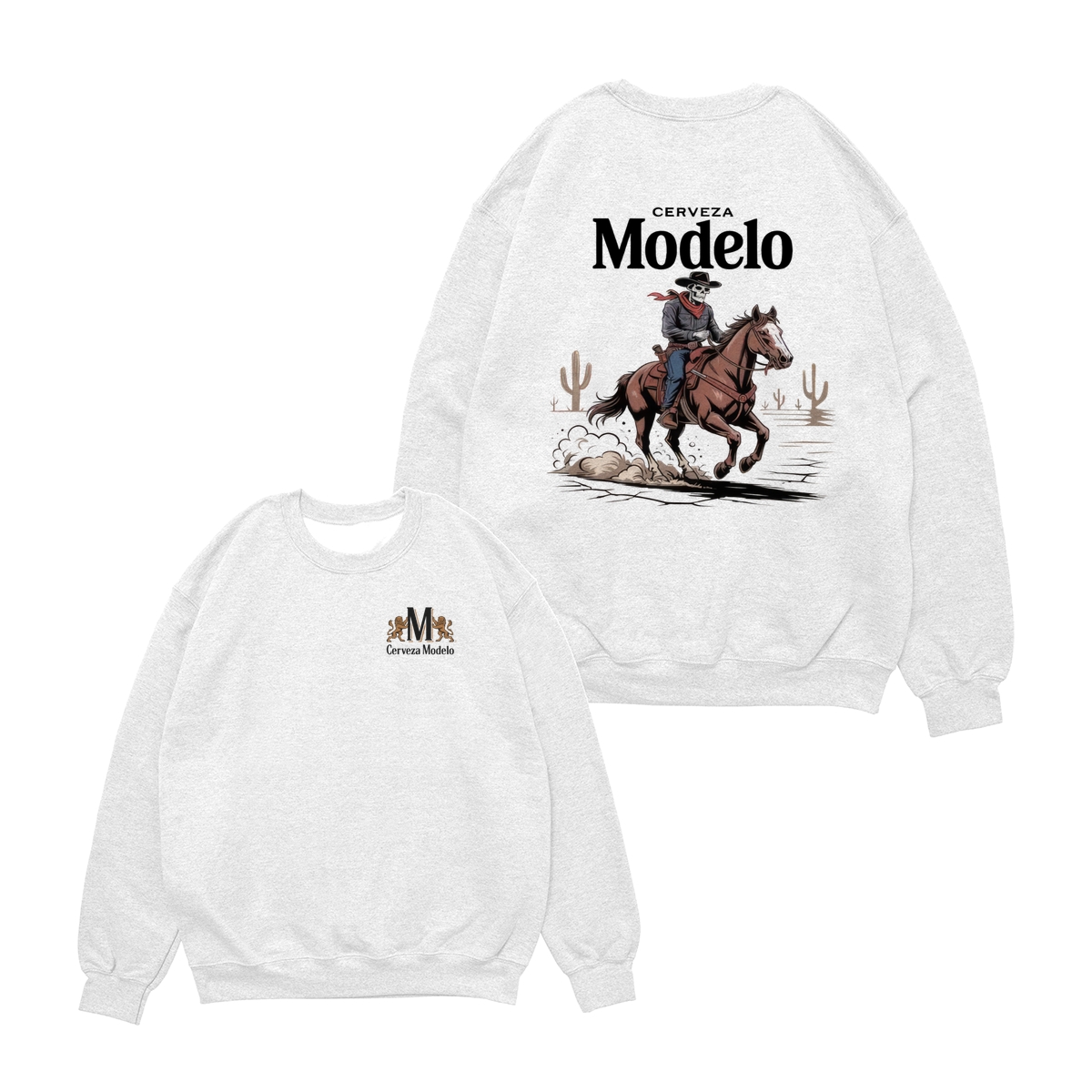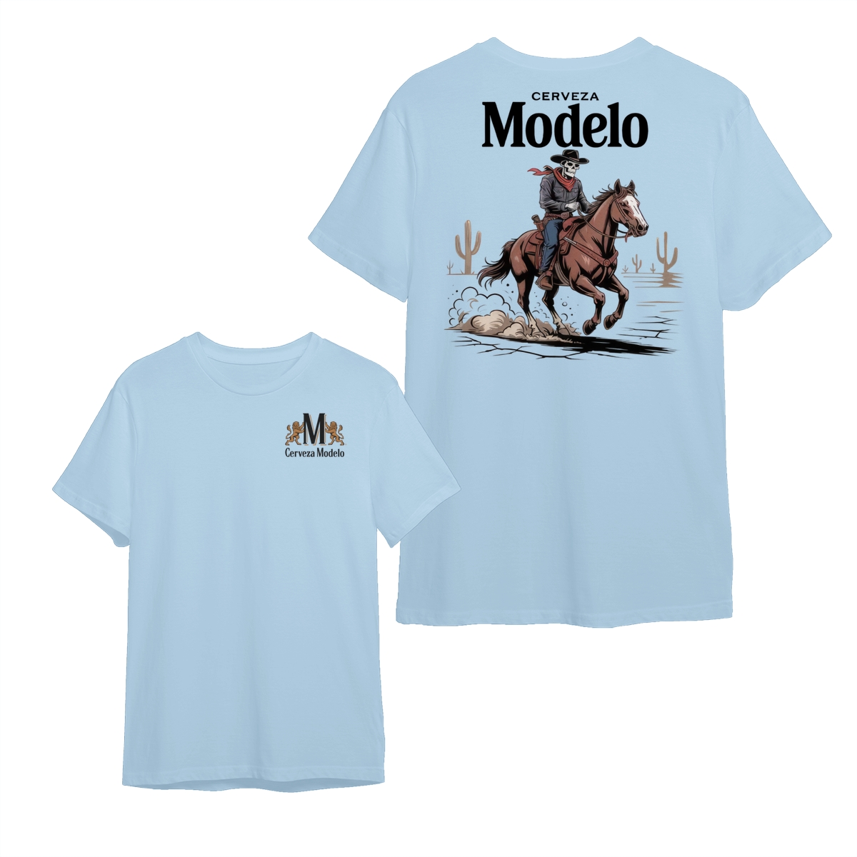 Modelo Cowboy T-Shirt – Skeleton Rider with Red Scarf in Desert Scene, Mexican Beer Graphic Tee for Men, Bold Western Style Shirt, Fiesta Gift Idea