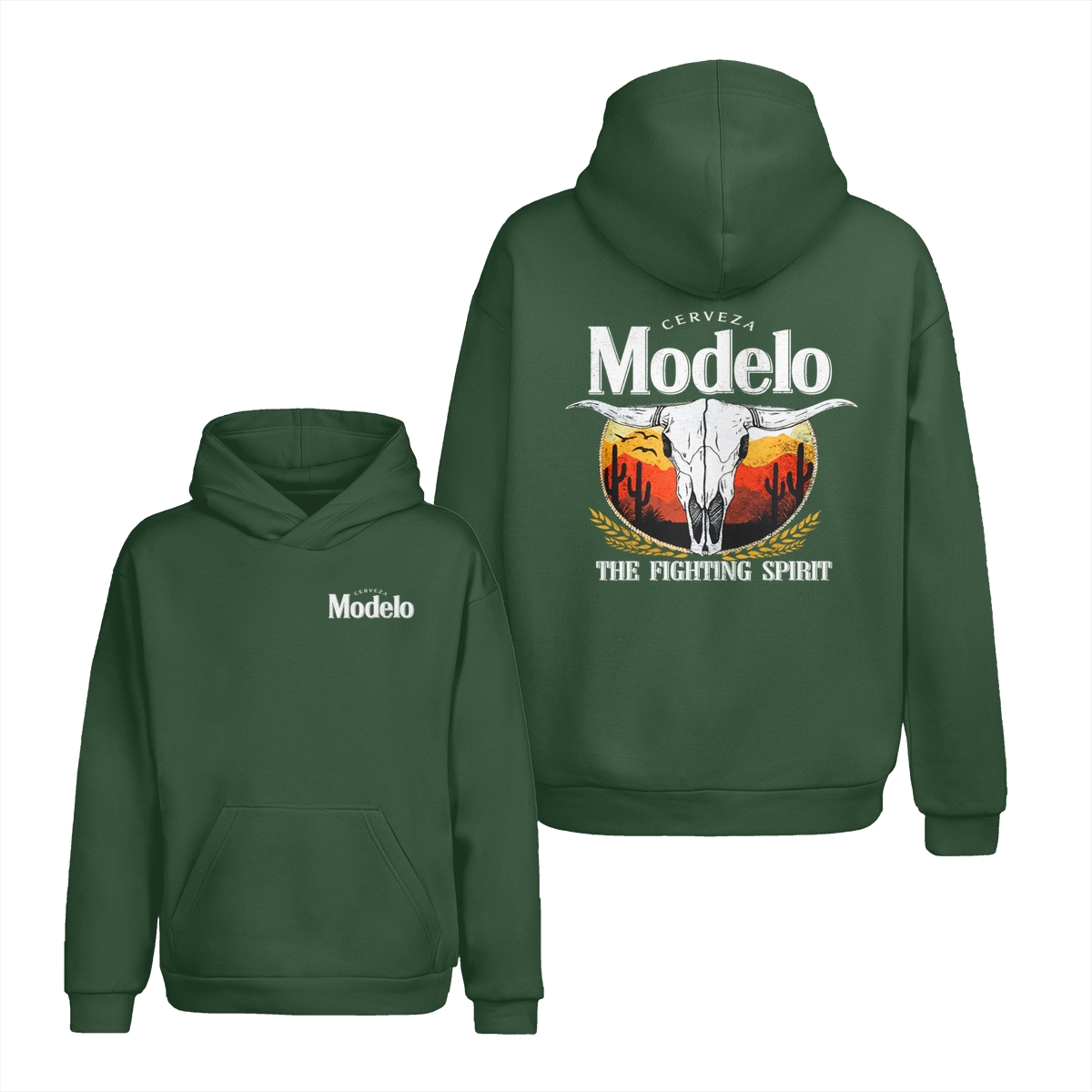 Modelo Desert Skull Hoodie – Western Style Design Featuring Bold Sunset and Cactus, “The Fighting Spirit” Slogan, Unisex Fit for Everyday Wear