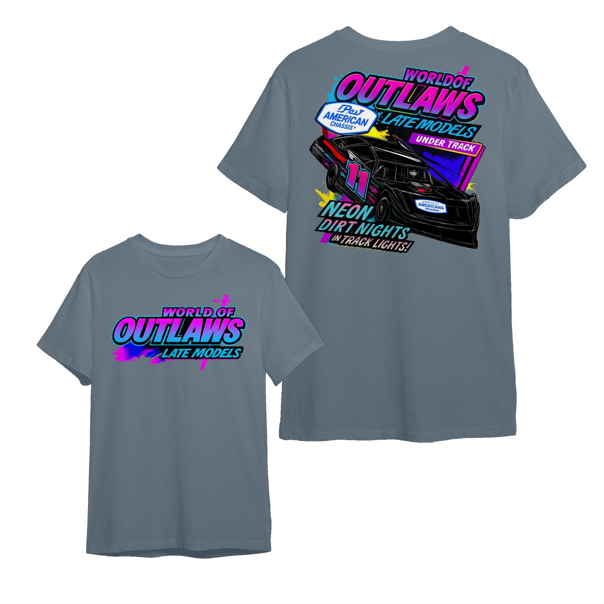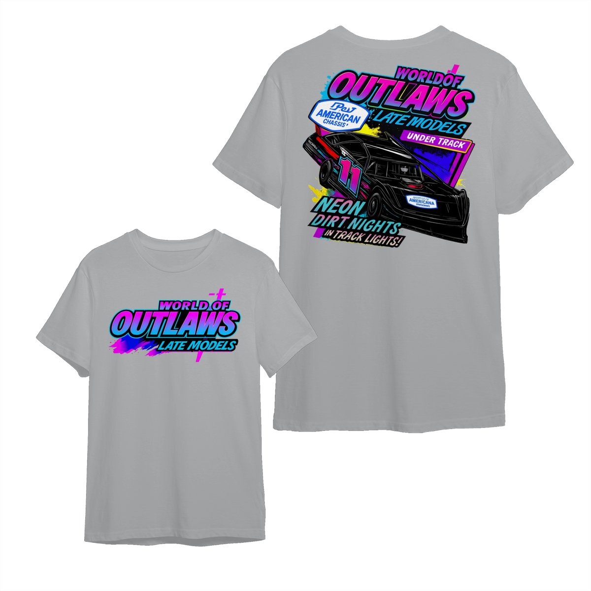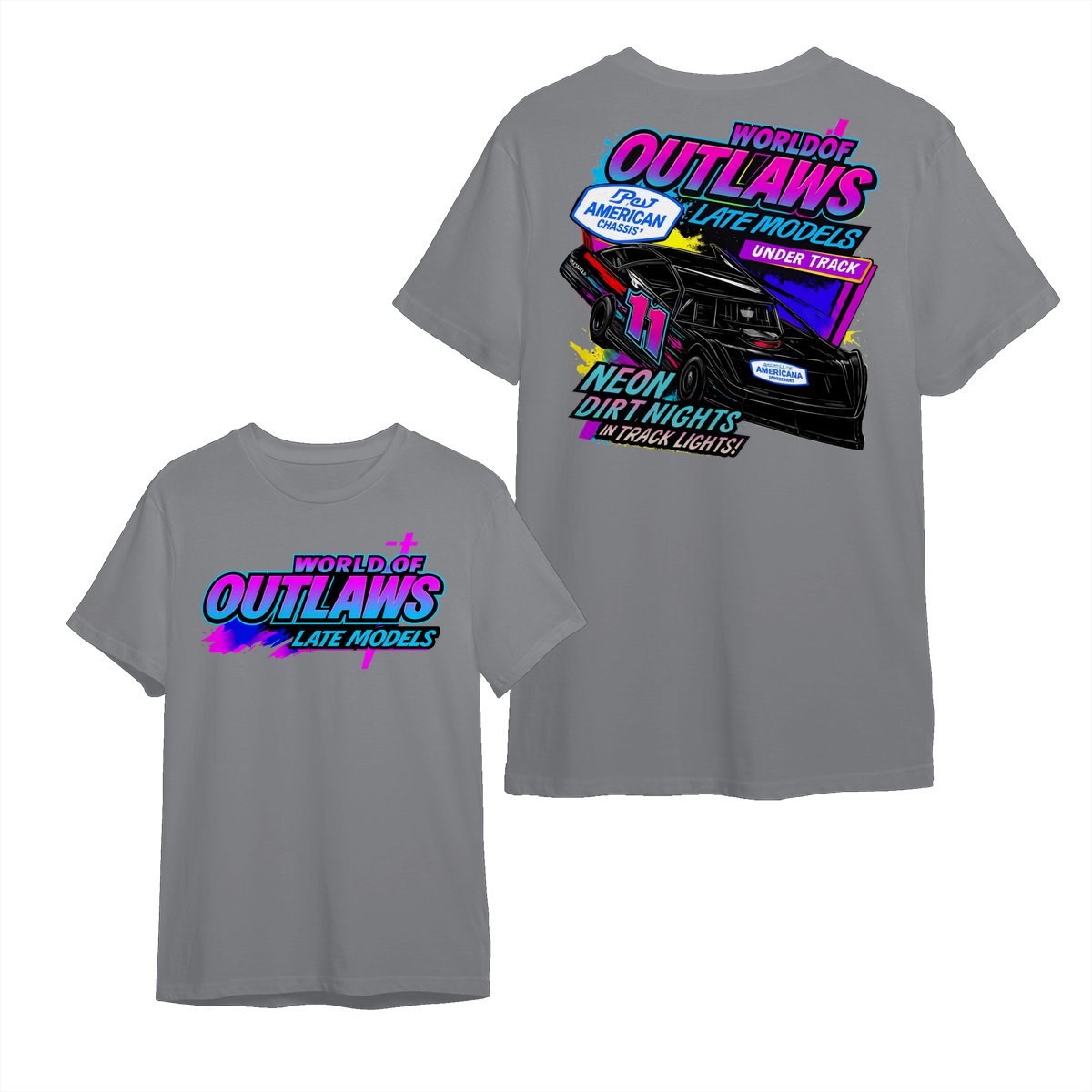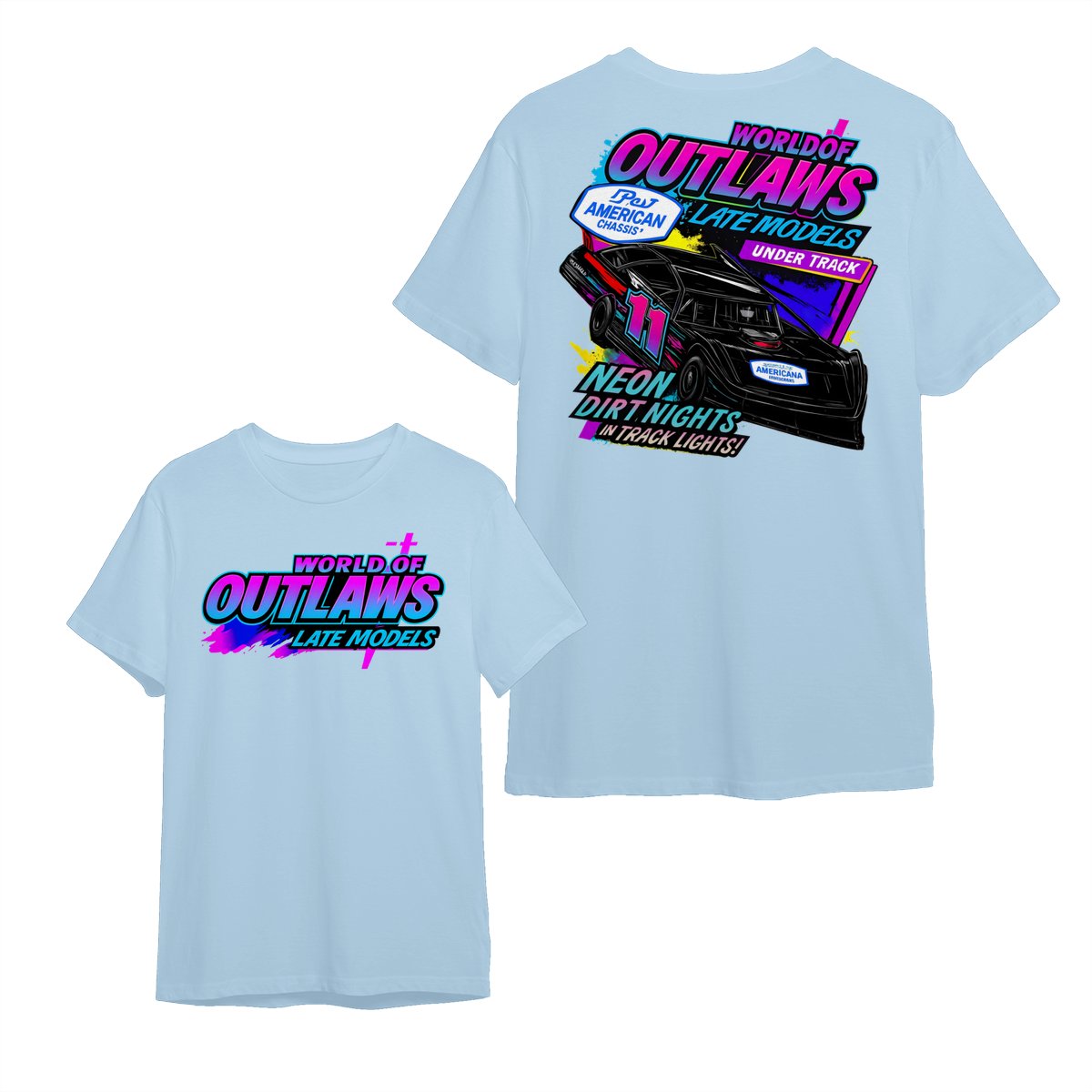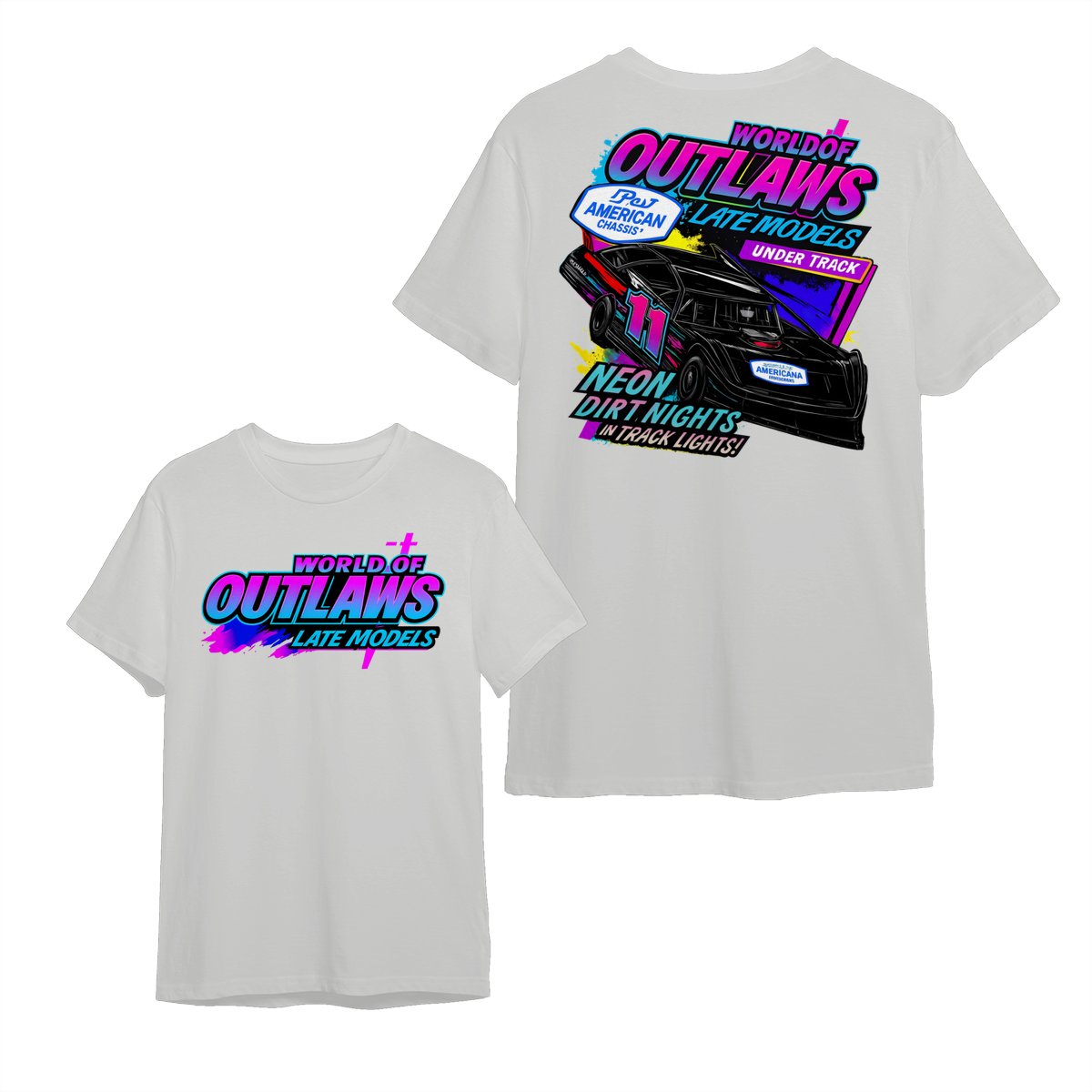Neon Dirt Nights Racing T-Shirt – Outlaws Late Models Graphic Tee, Retro Street Stock Car Design, Bold Front & Back Print Racing Shirt for Men