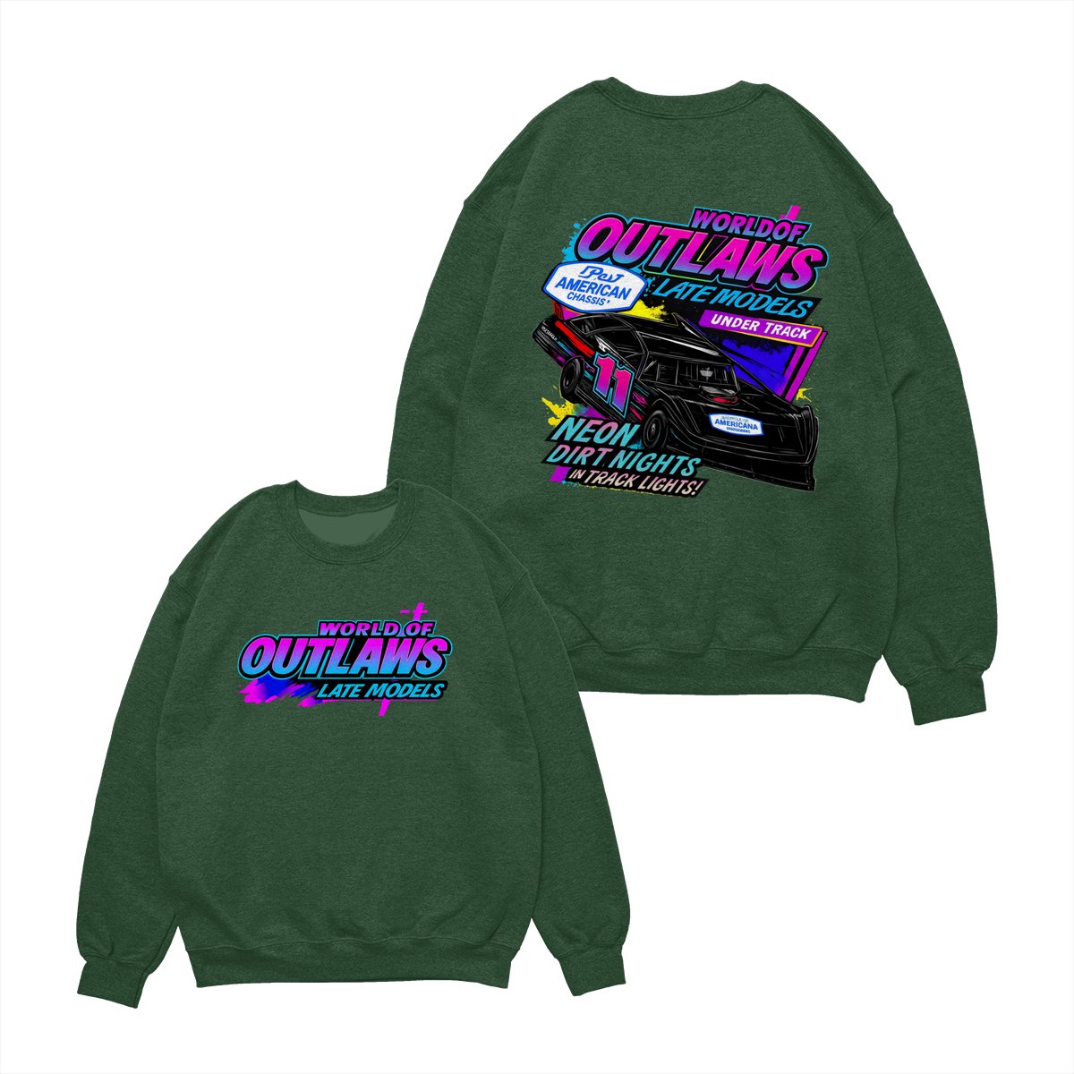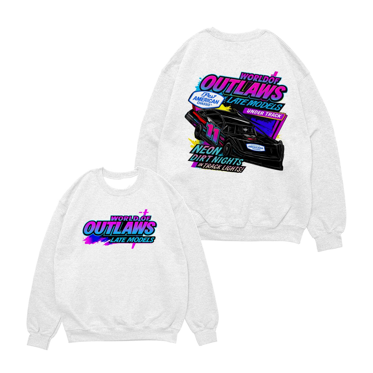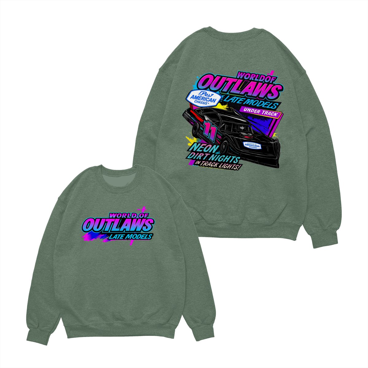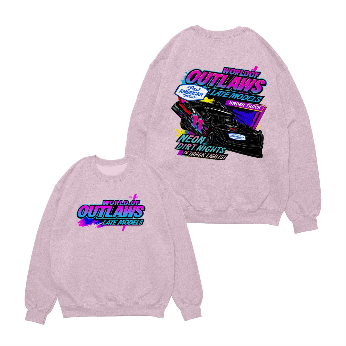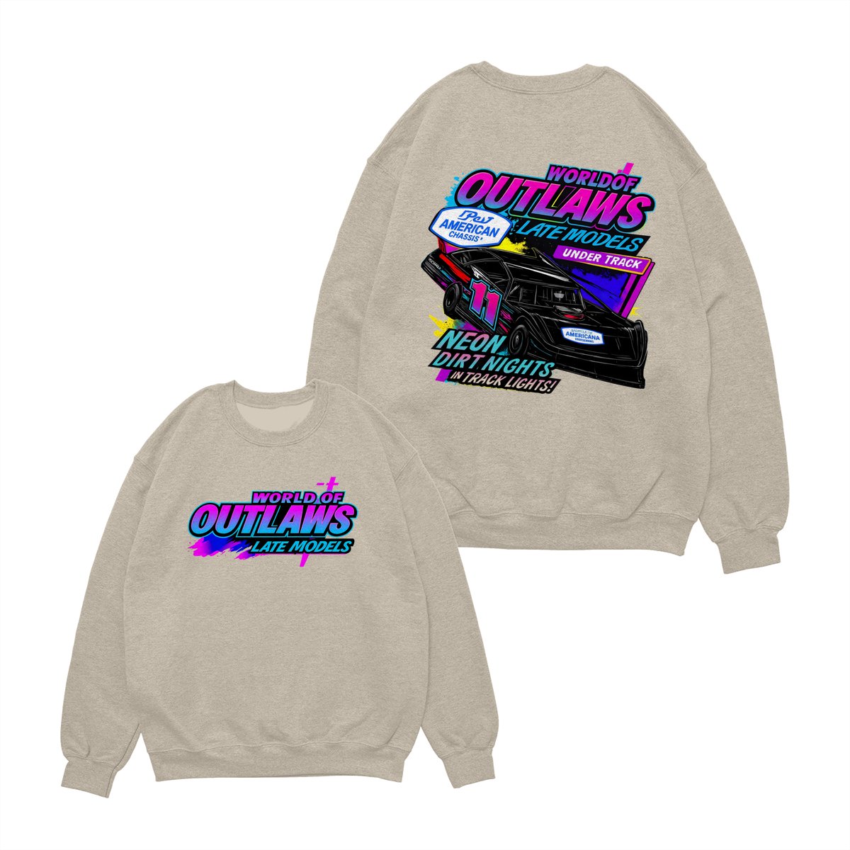 Neon Dirt Nights Racing T-Shirt – Outlaws Late Models Graphic Tee, Retro Street Stock Car Design, Bold Front & Back Print Racing Shirt for Men