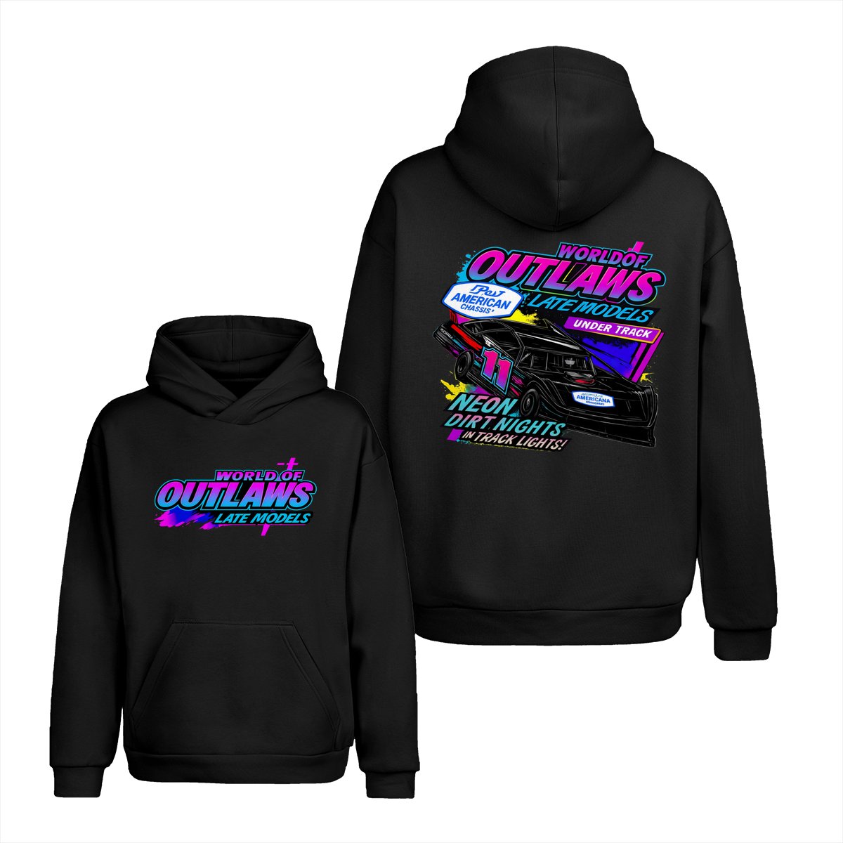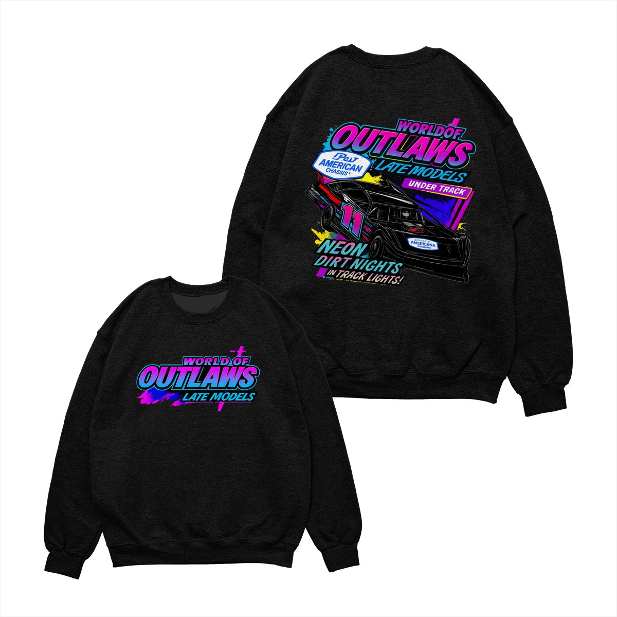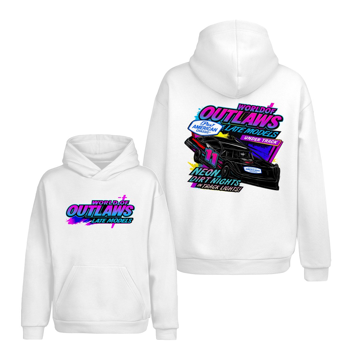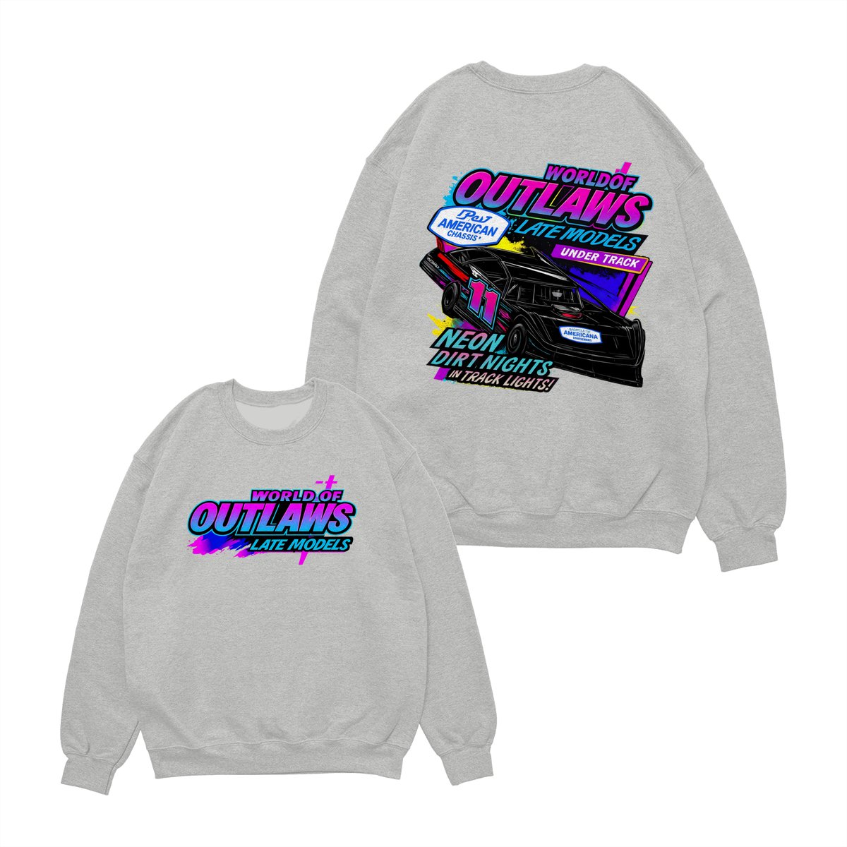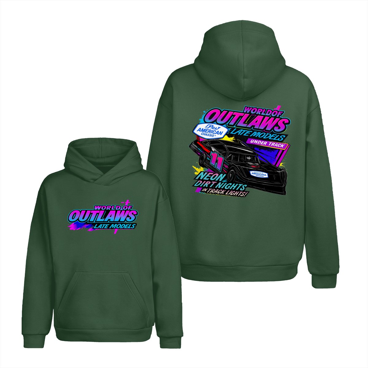 Neon Dirt Nights Racing T-Shirt – Outlaws Late Models Graphic Tee, Retro Street Stock Car Design, Bold Front & Back Print Racing Shirt for Men