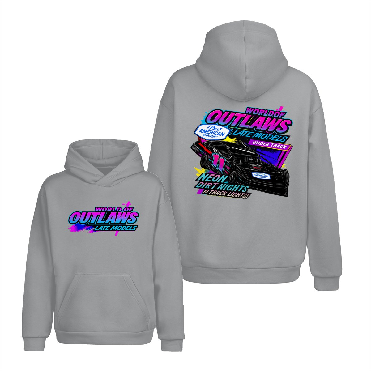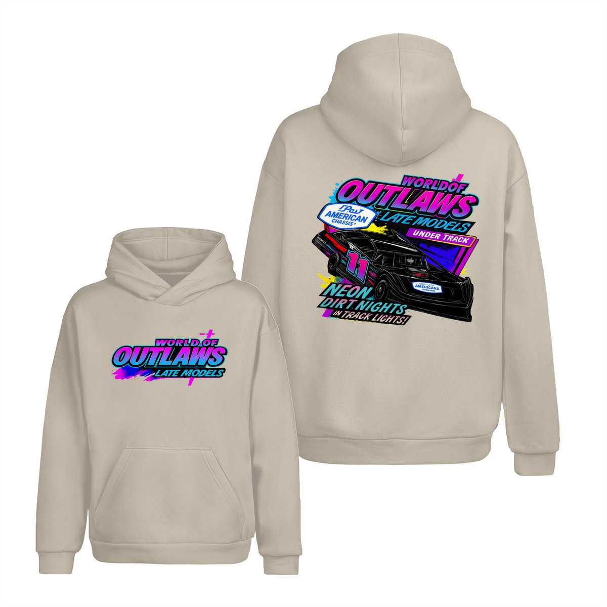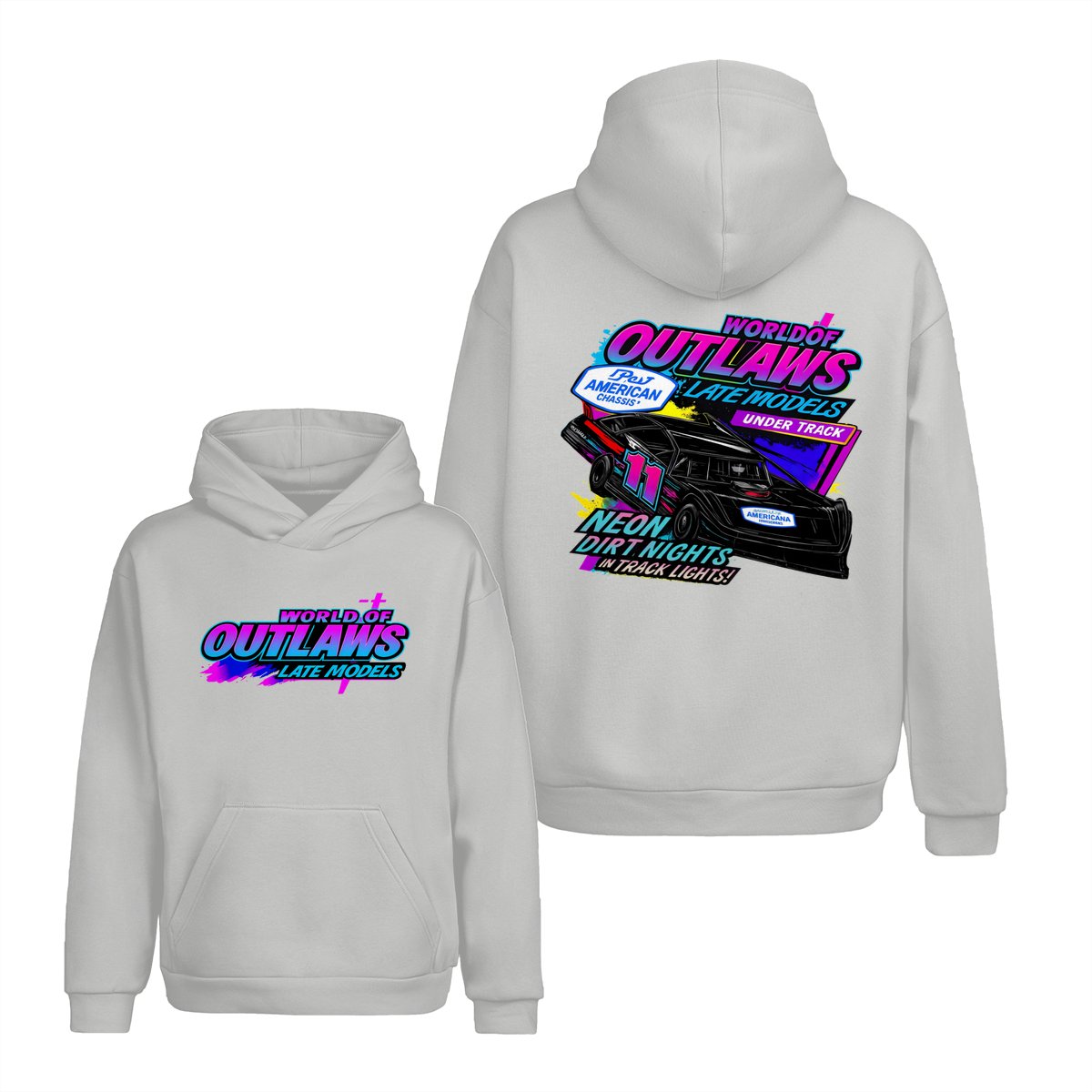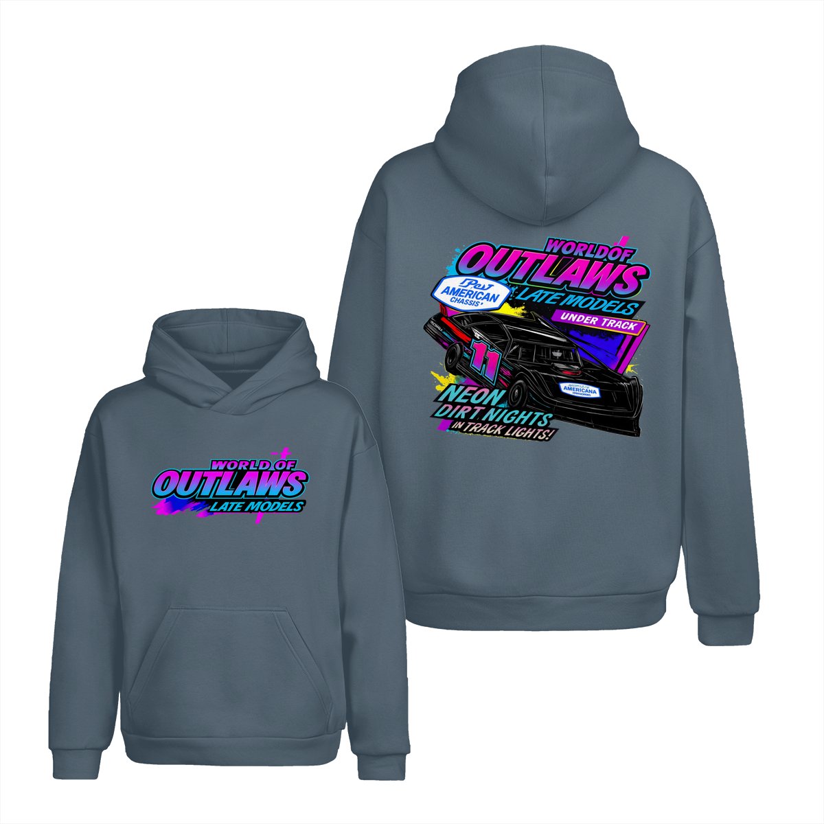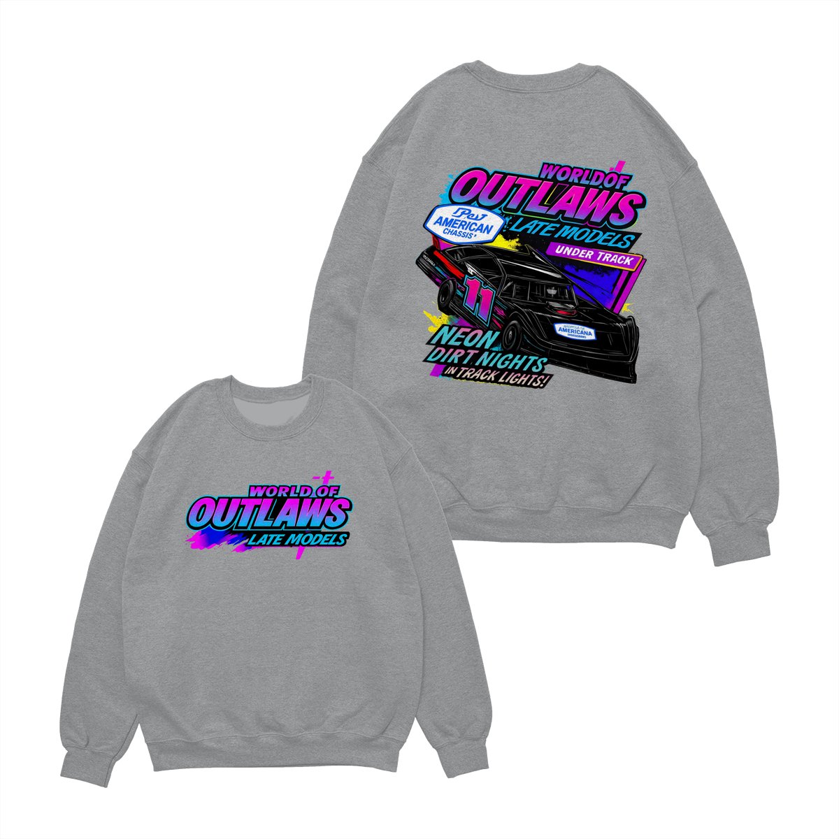 Neon Dirt Nights Racing T-Shirt – Outlaws Late Models Graphic Tee, Retro Street Stock Car Design, Bold Front & Back Print Racing Shirt for Men
