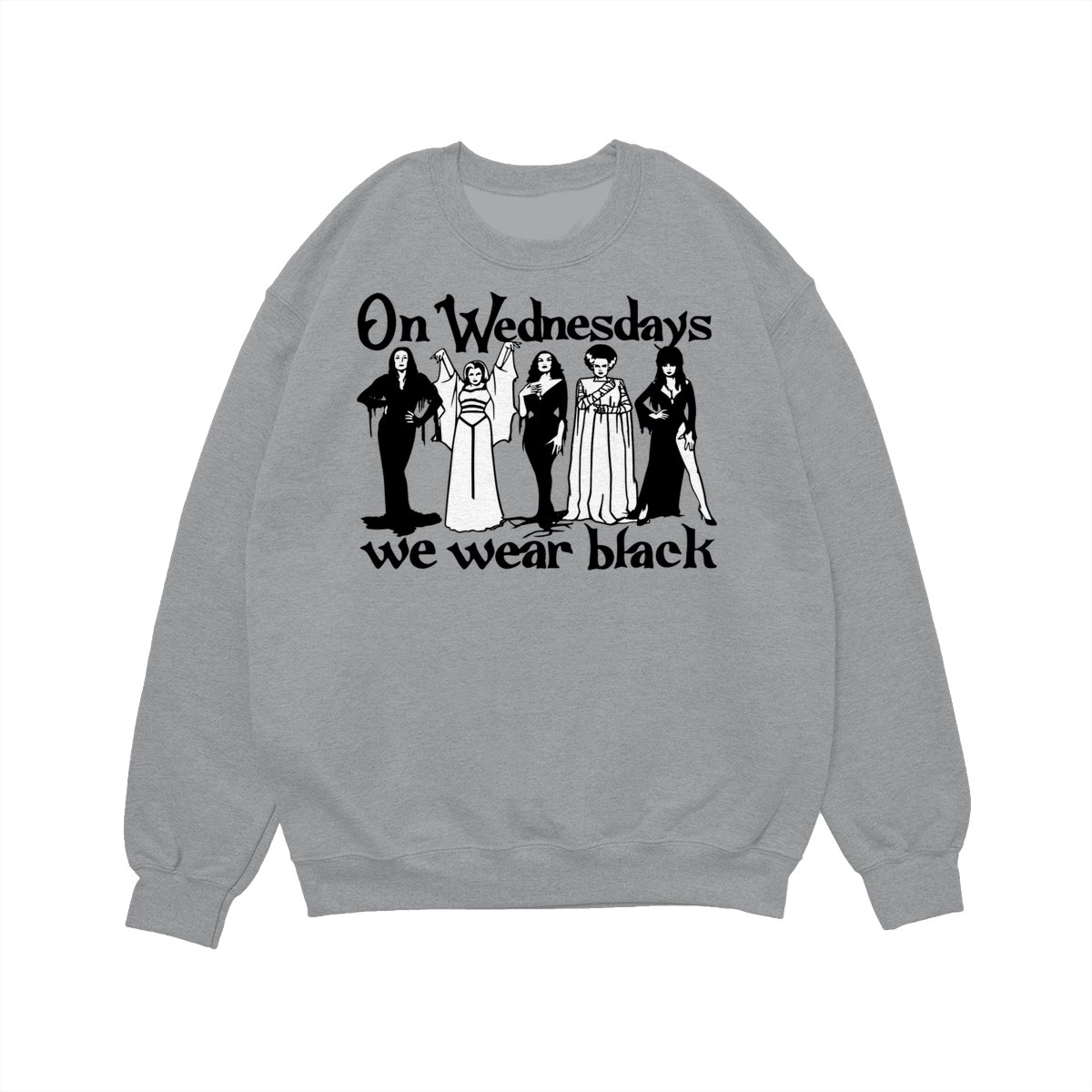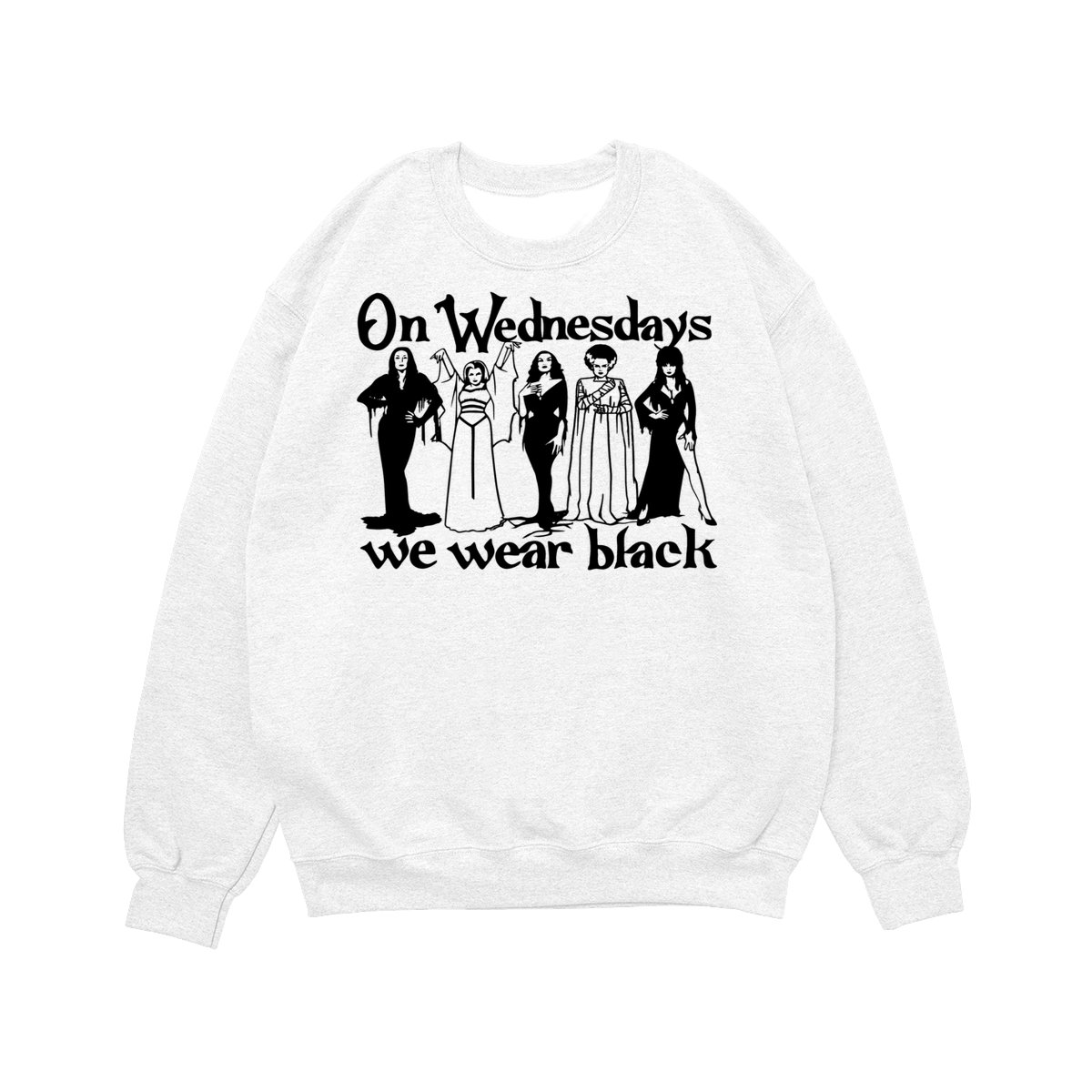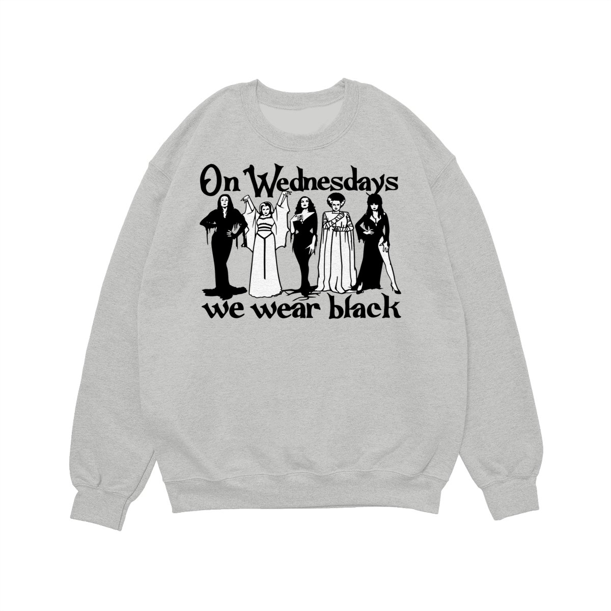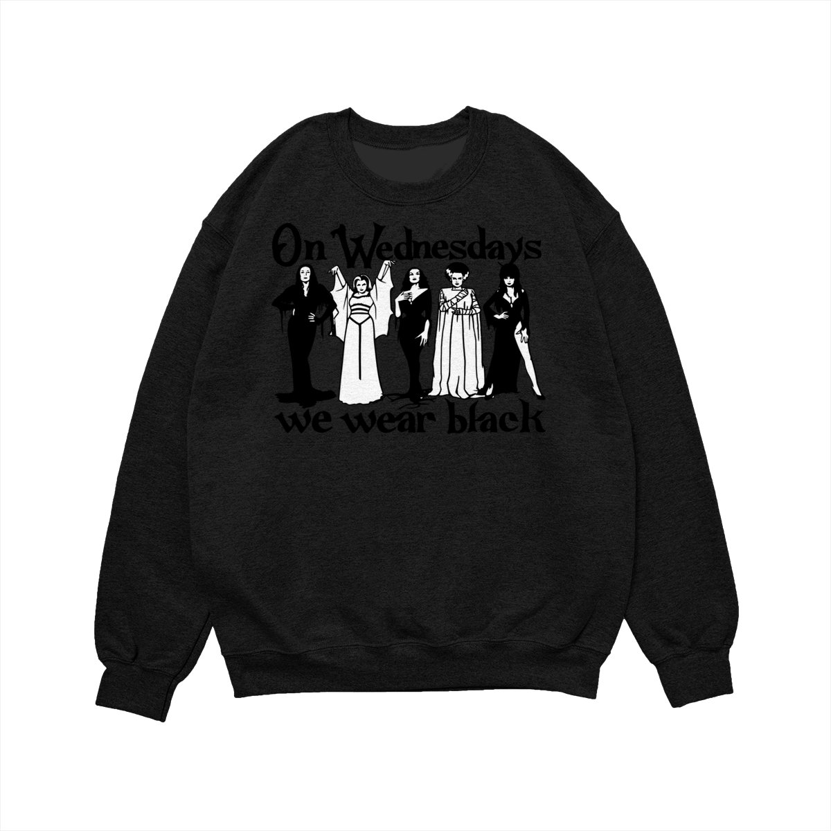 On Wednesdays We Wear Black Sweatshirt, Horror Goth Queens Morticia Addams, Lily Munster, Elvira, Vampira, The Bride Shirt, Halloween Gifts For Women and For Her Womenswear Long Sleeve Pullover Crewneck Tops