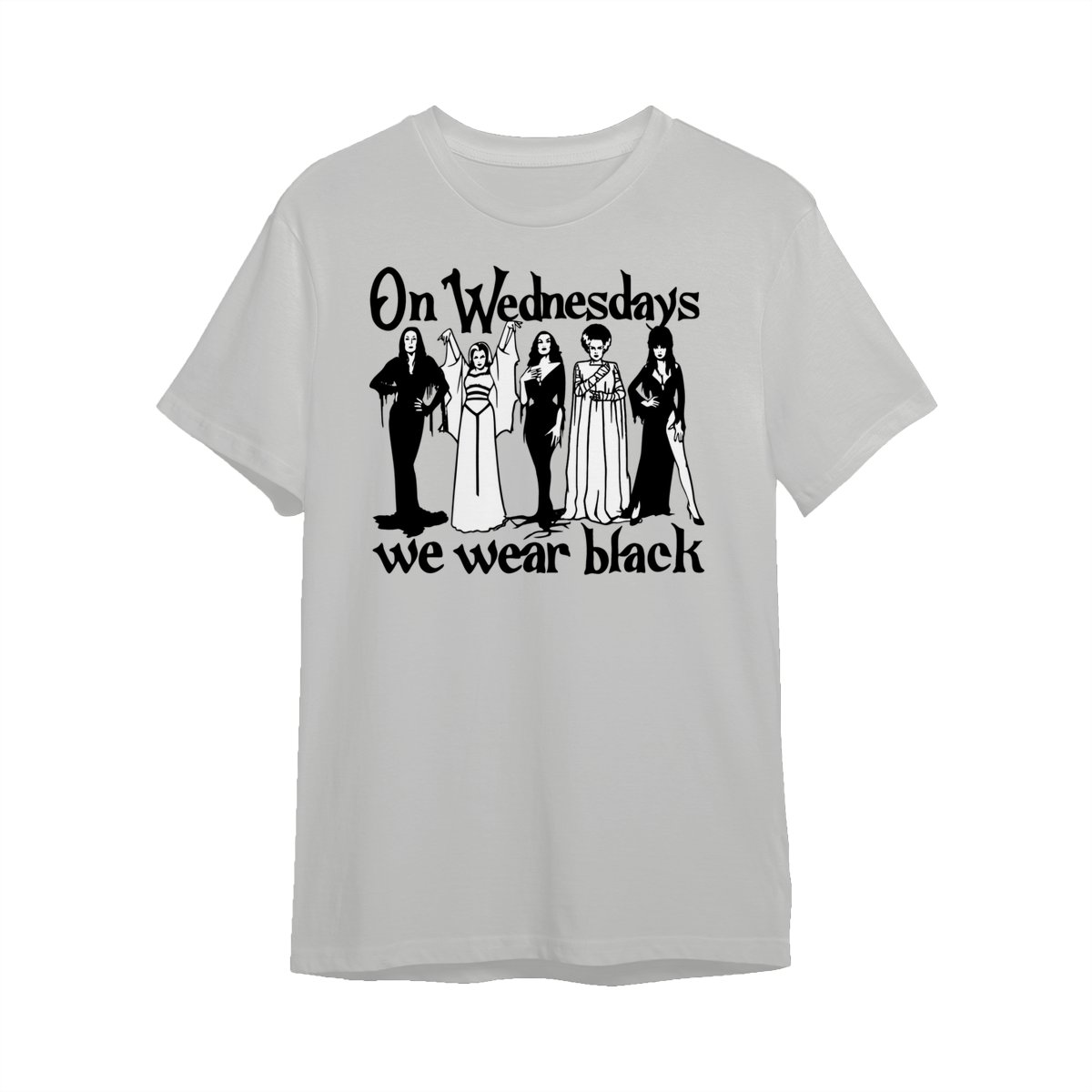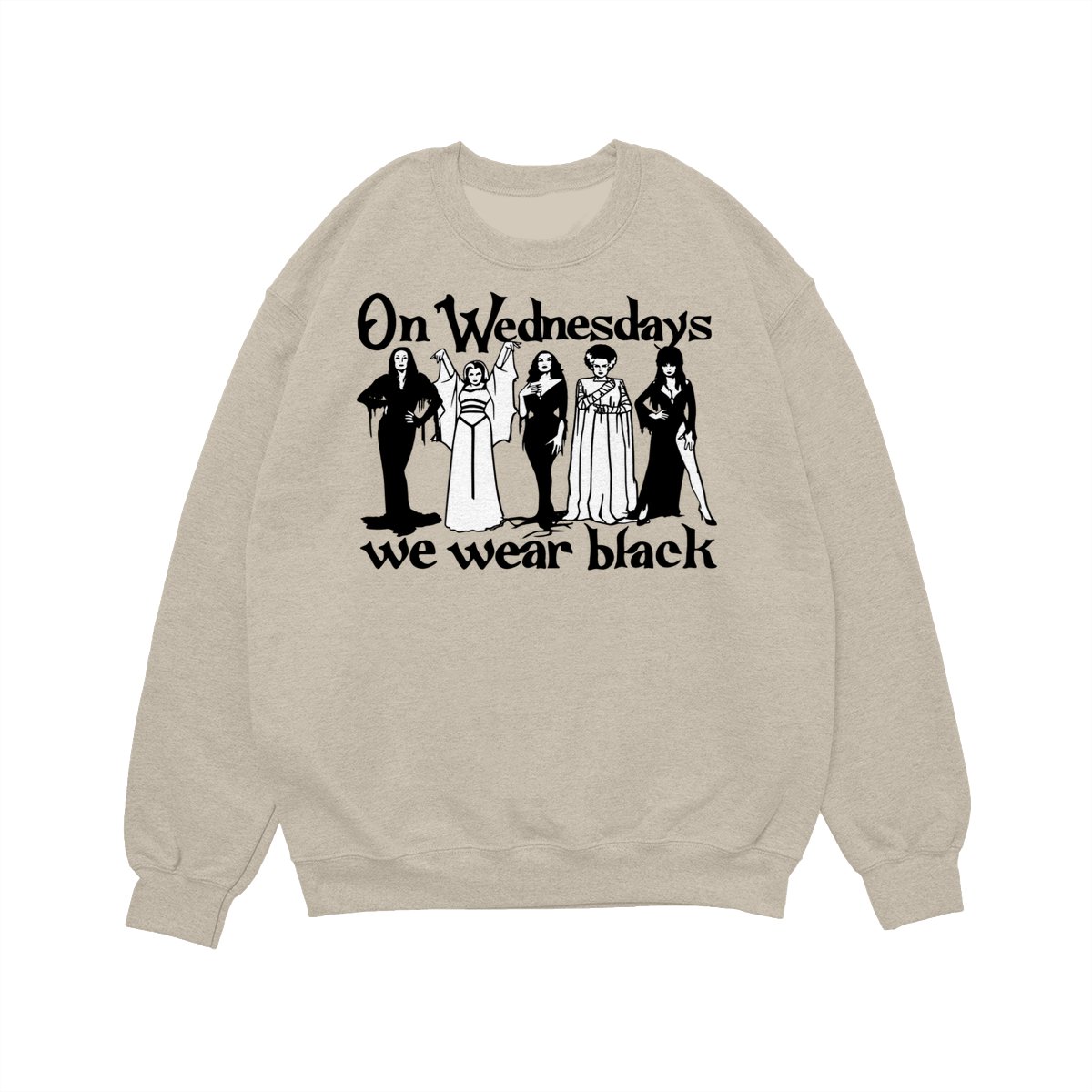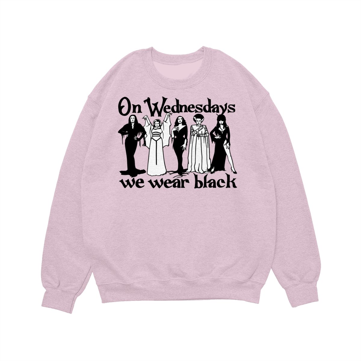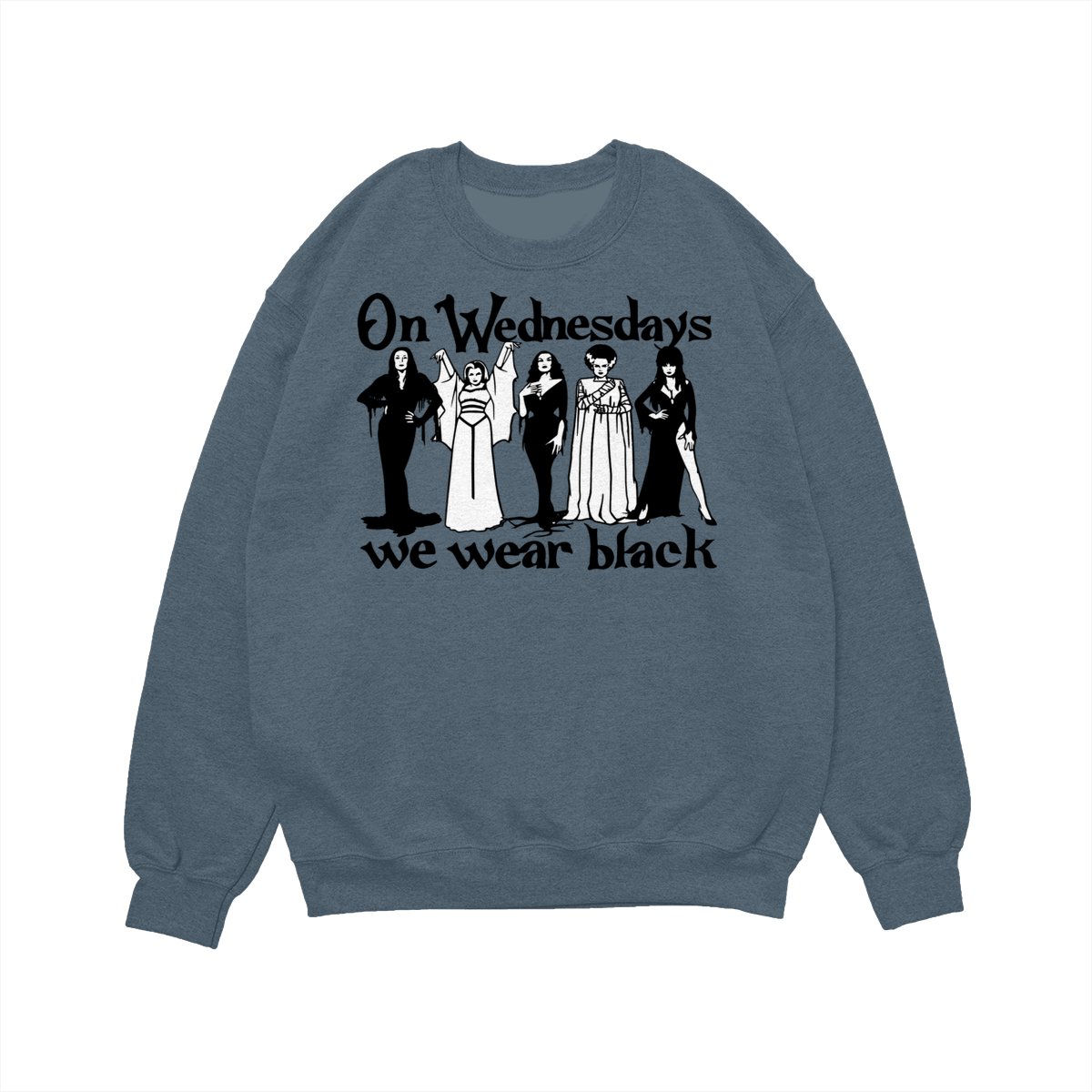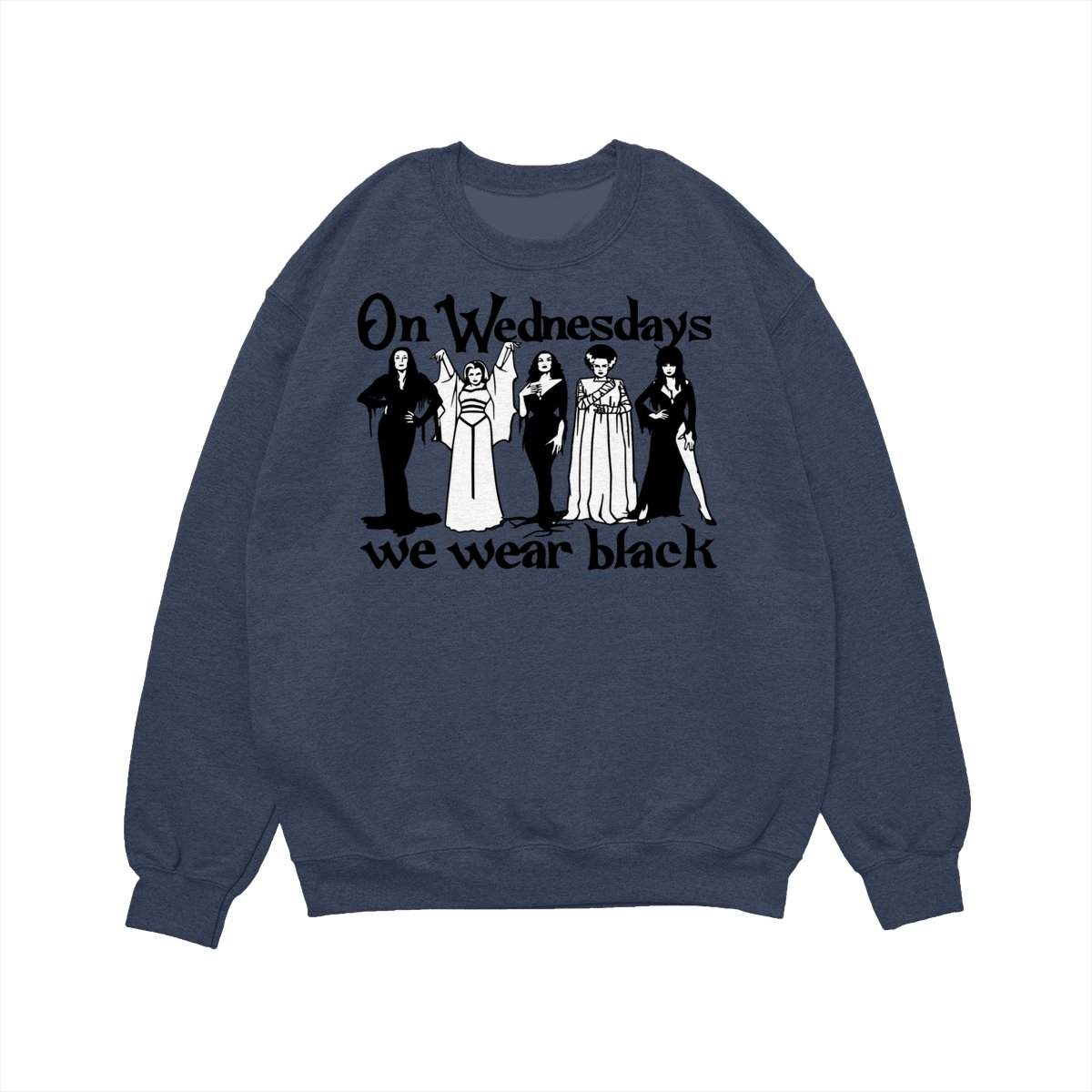 On Wednesdays We Wear Black Sweatshirt, Horror Goth Queens Morticia Addams, Lily Munster, Elvira, Vampira, The Bride Shirt, Halloween Gifts For Women and For Her Womenswear Long Sleeve Pullover Crewneck Tops
