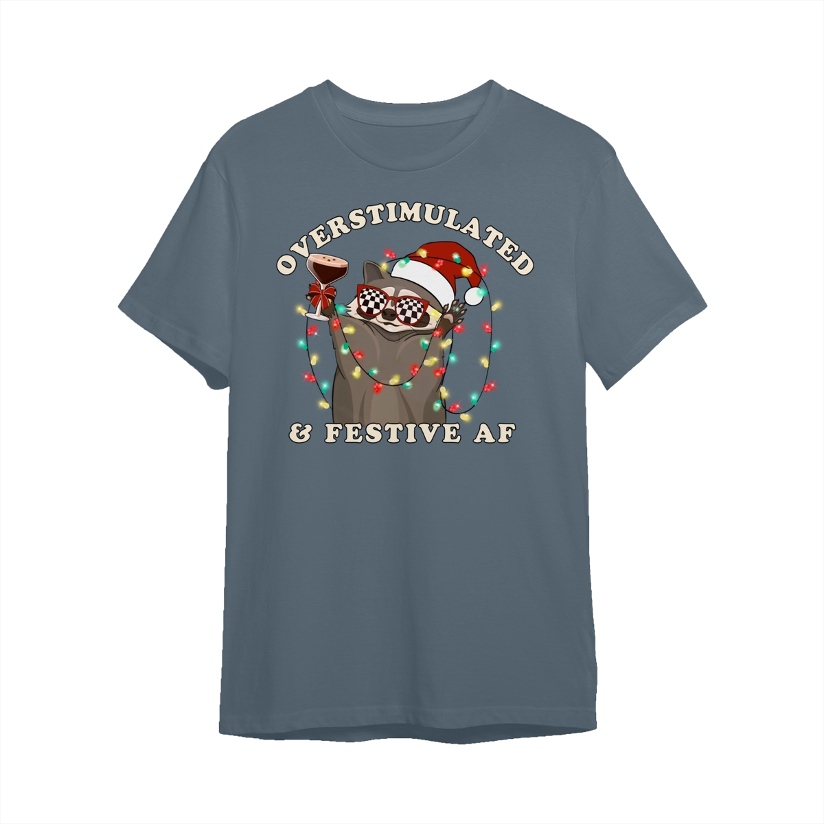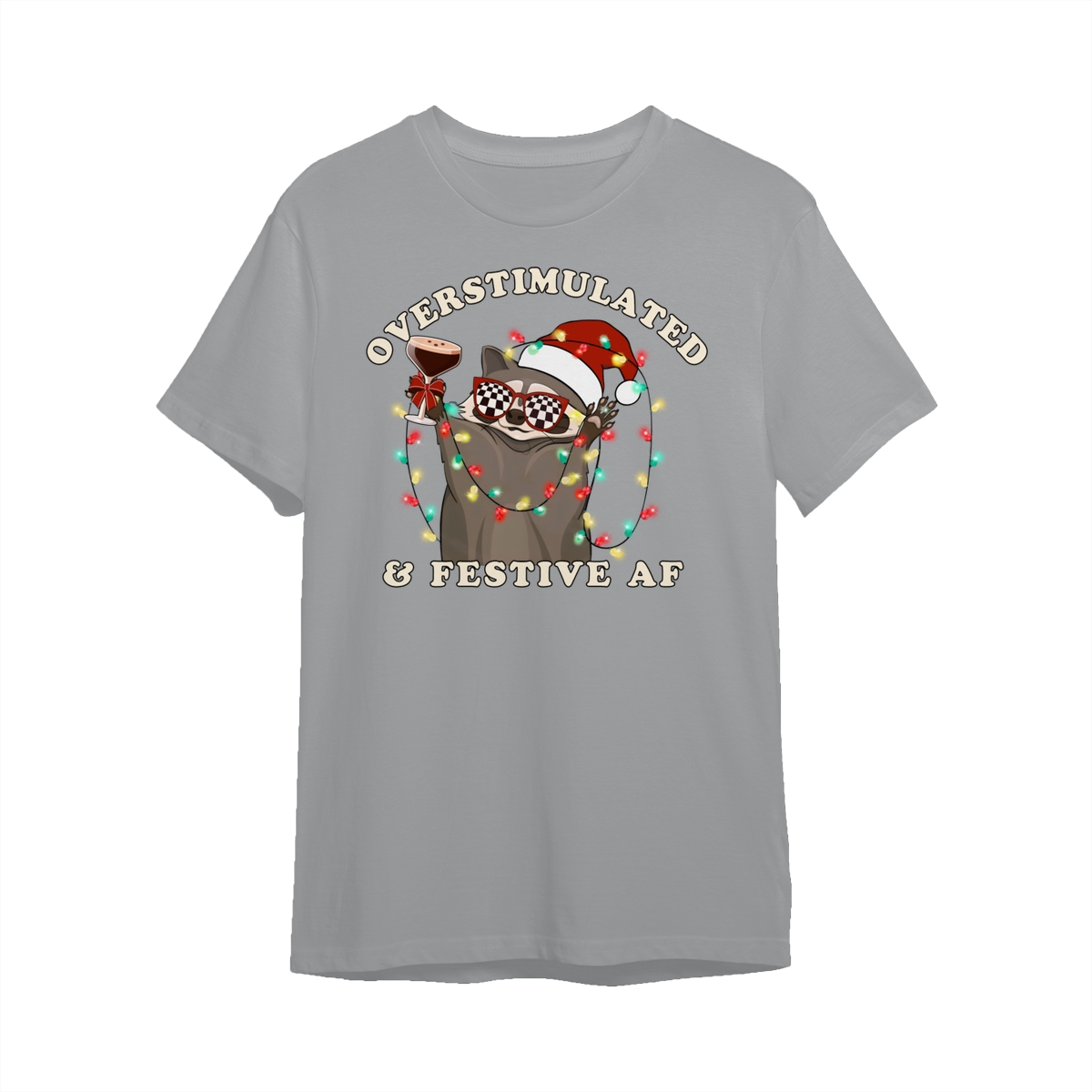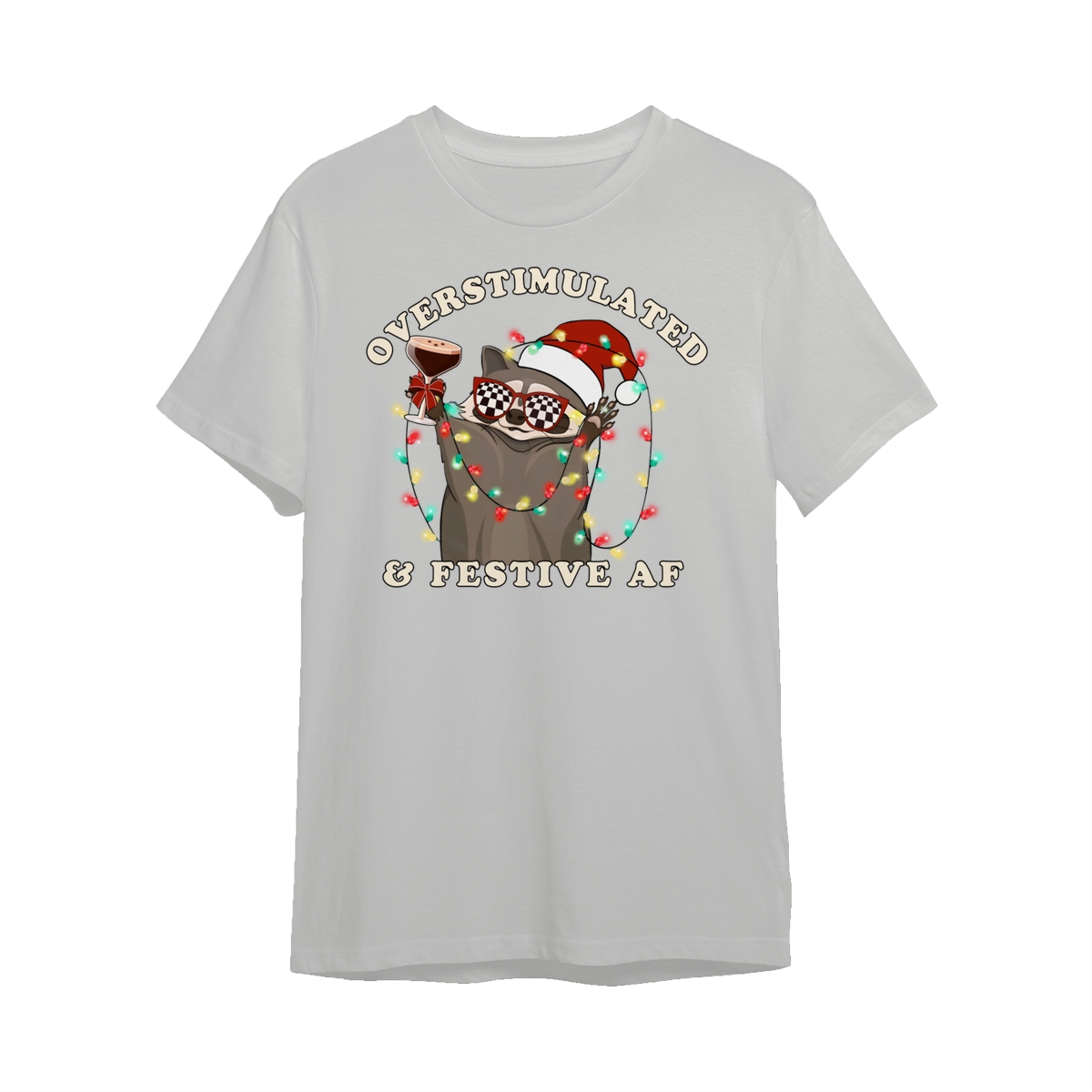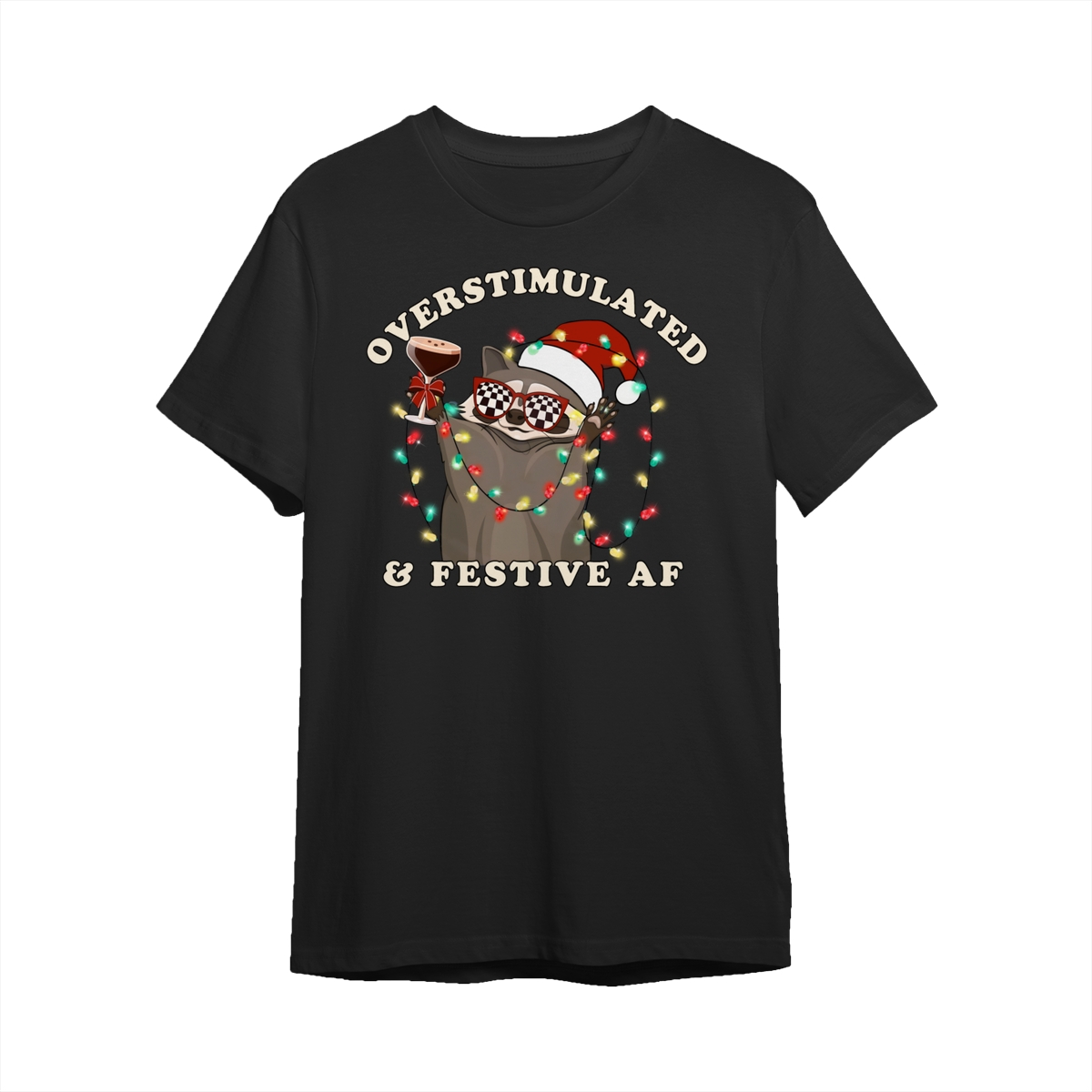 Overstimulated & Festive AF Raccoon Christmas T-Shirt, Espresso Martini Tangled Lights, Funny Weirdcore Meme Gift Shirt, Xmas Gifts