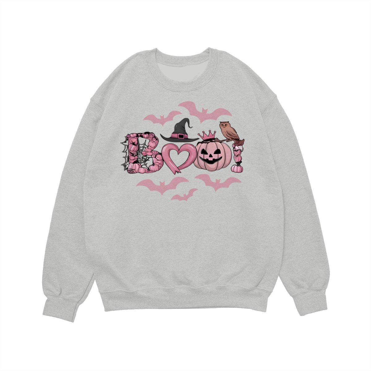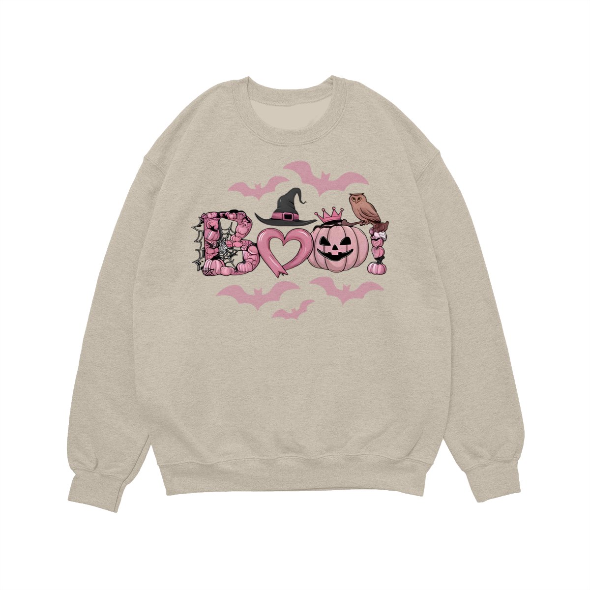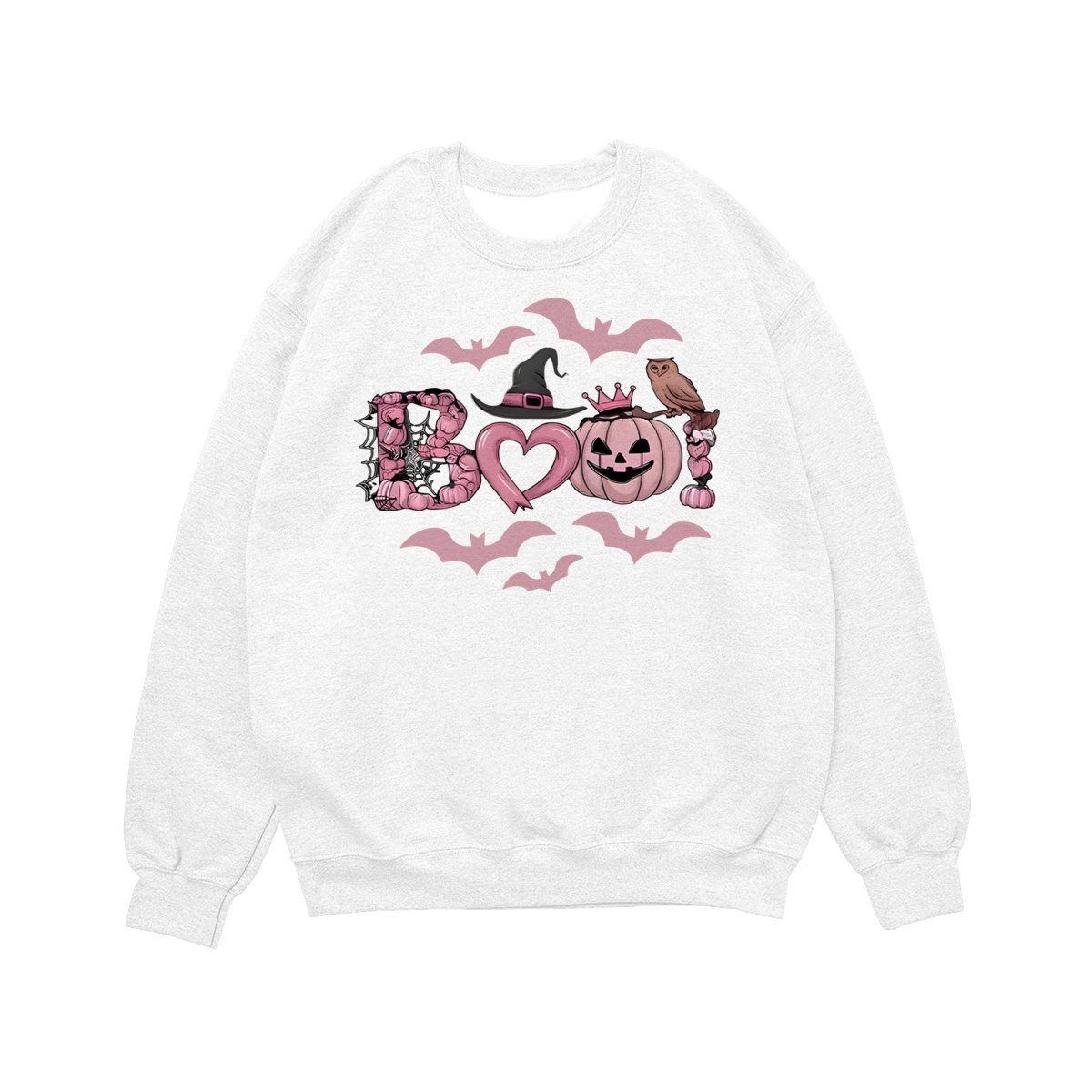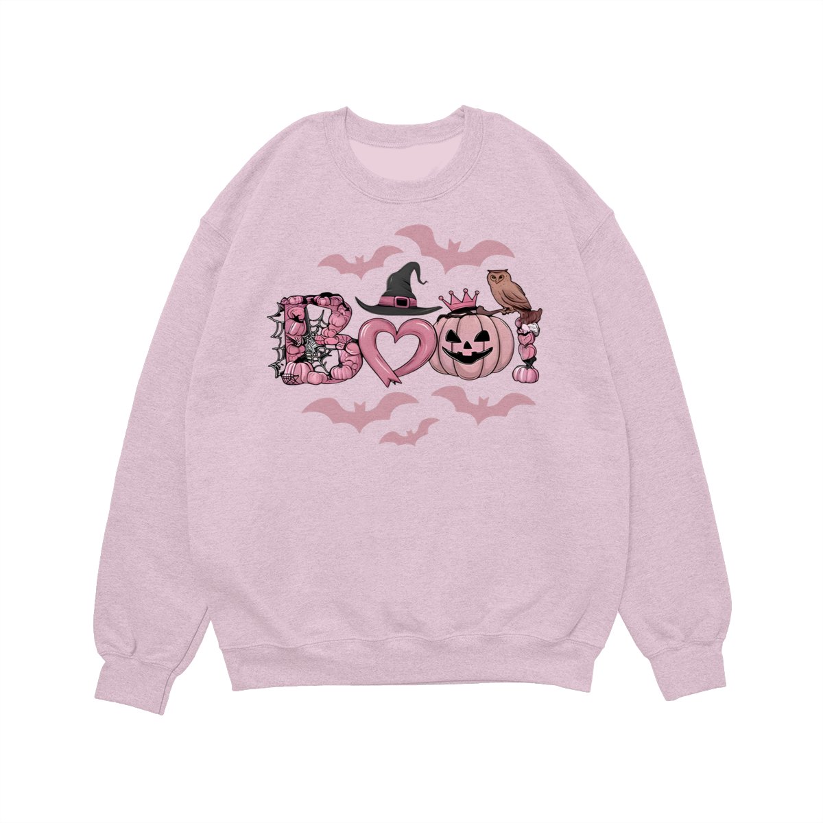 Pink Halloween Boo Sweatshirt – Cute Pastel Pumpkin and Bat Graphic with Witch Hat, Owl, and Crown