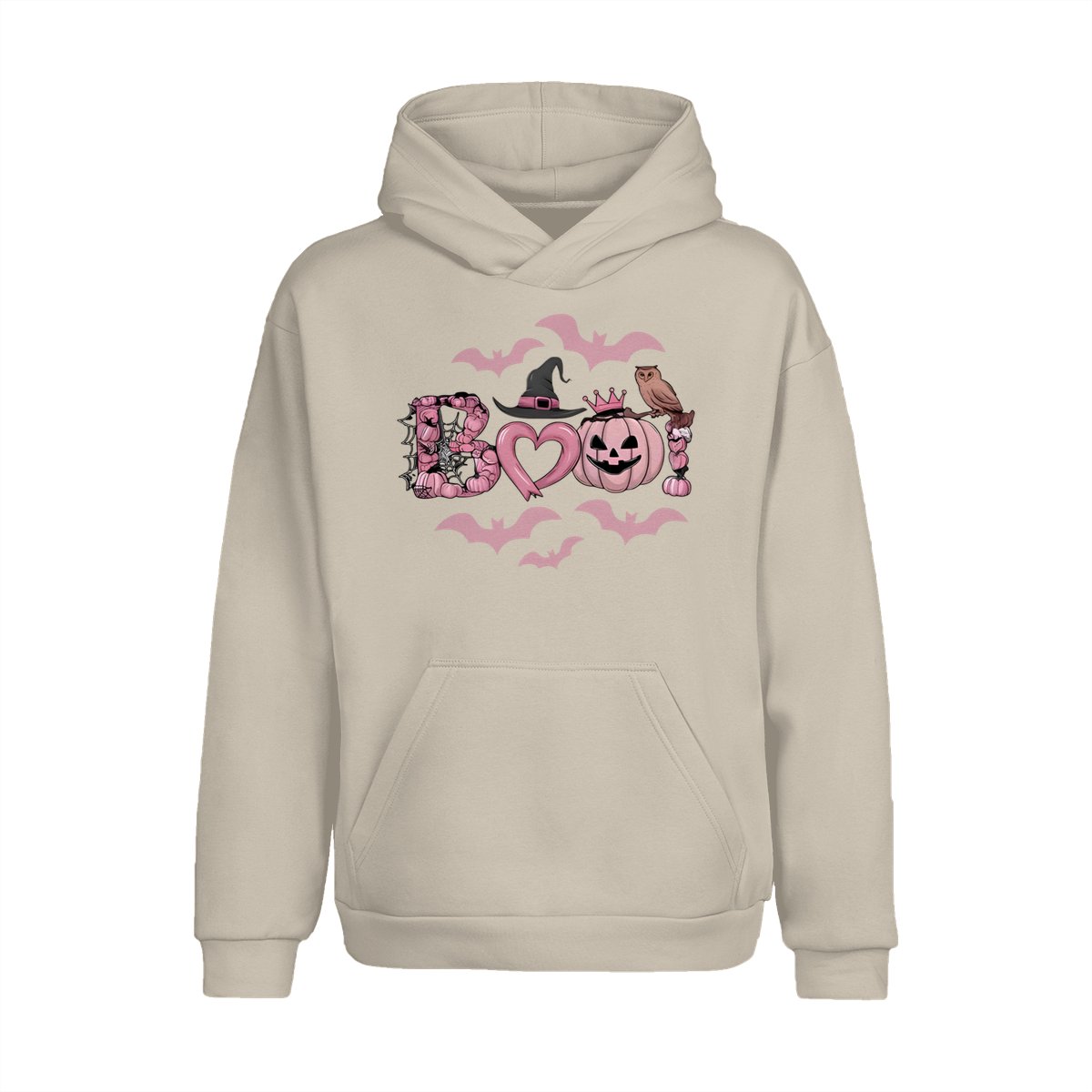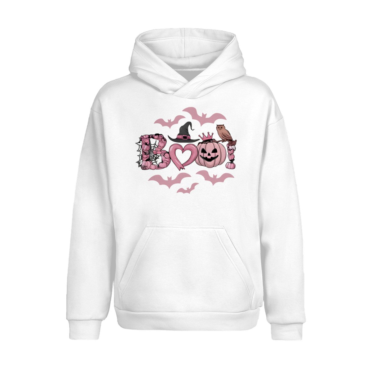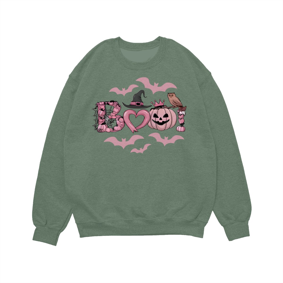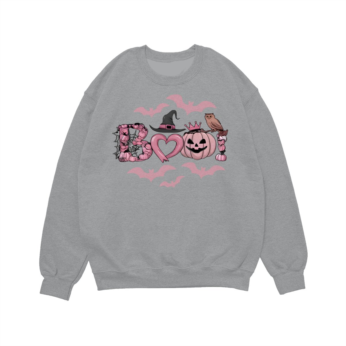 Pink Halloween Boo Sweatshirt – Cute Pastel Pumpkin and Bat Graphic with Witch Hat, Owl, and Crown