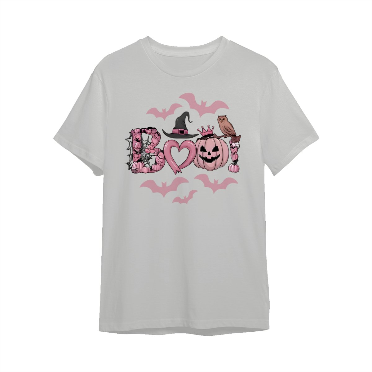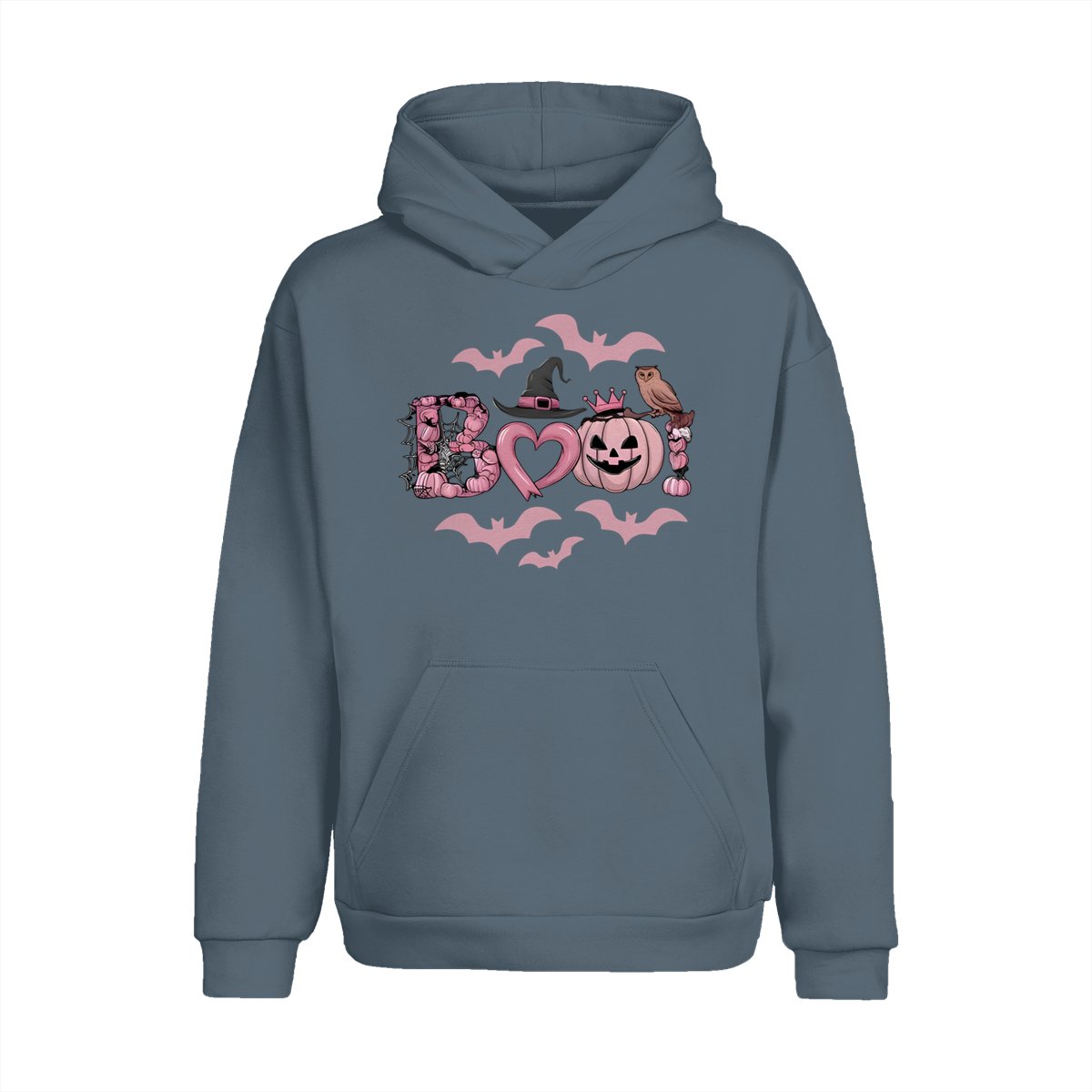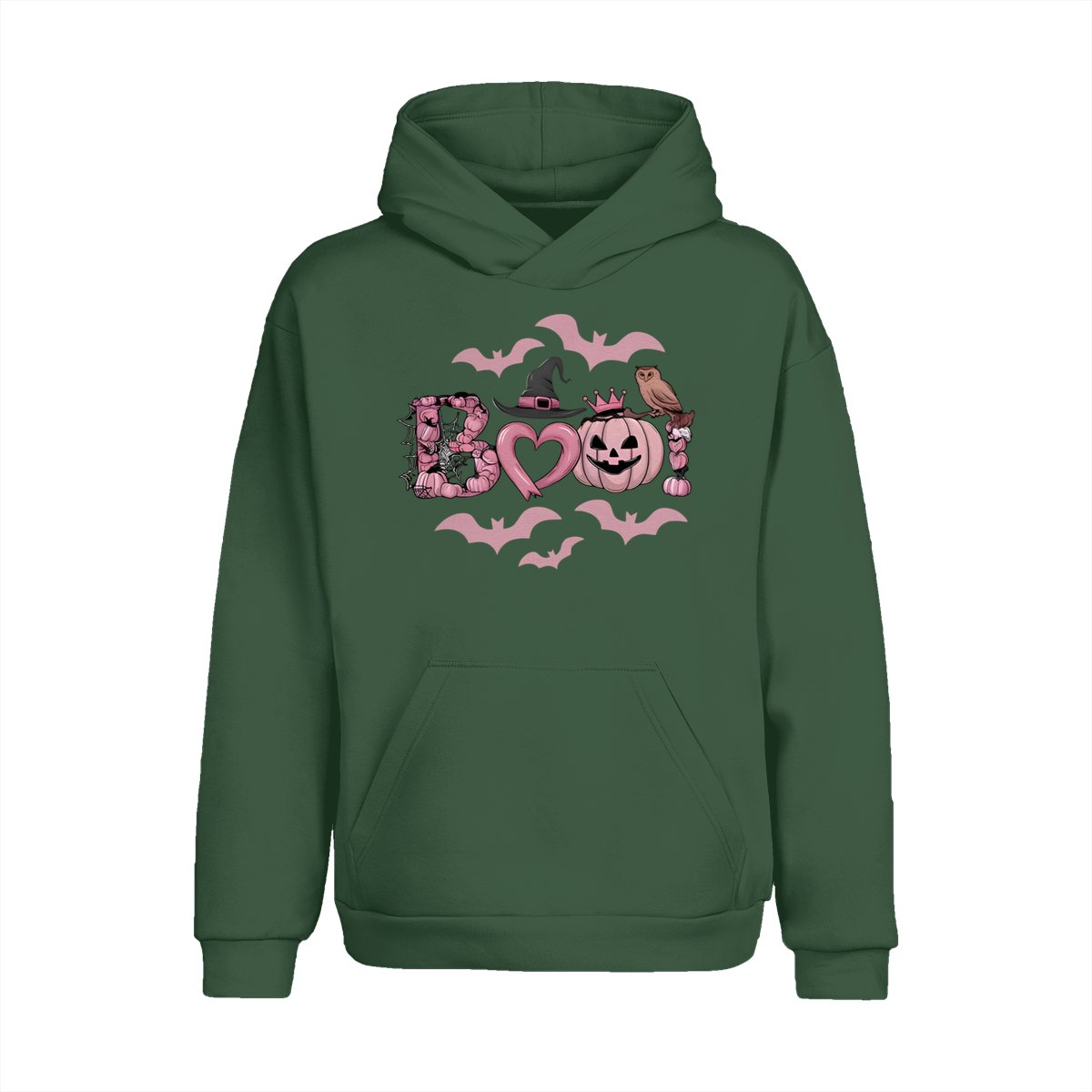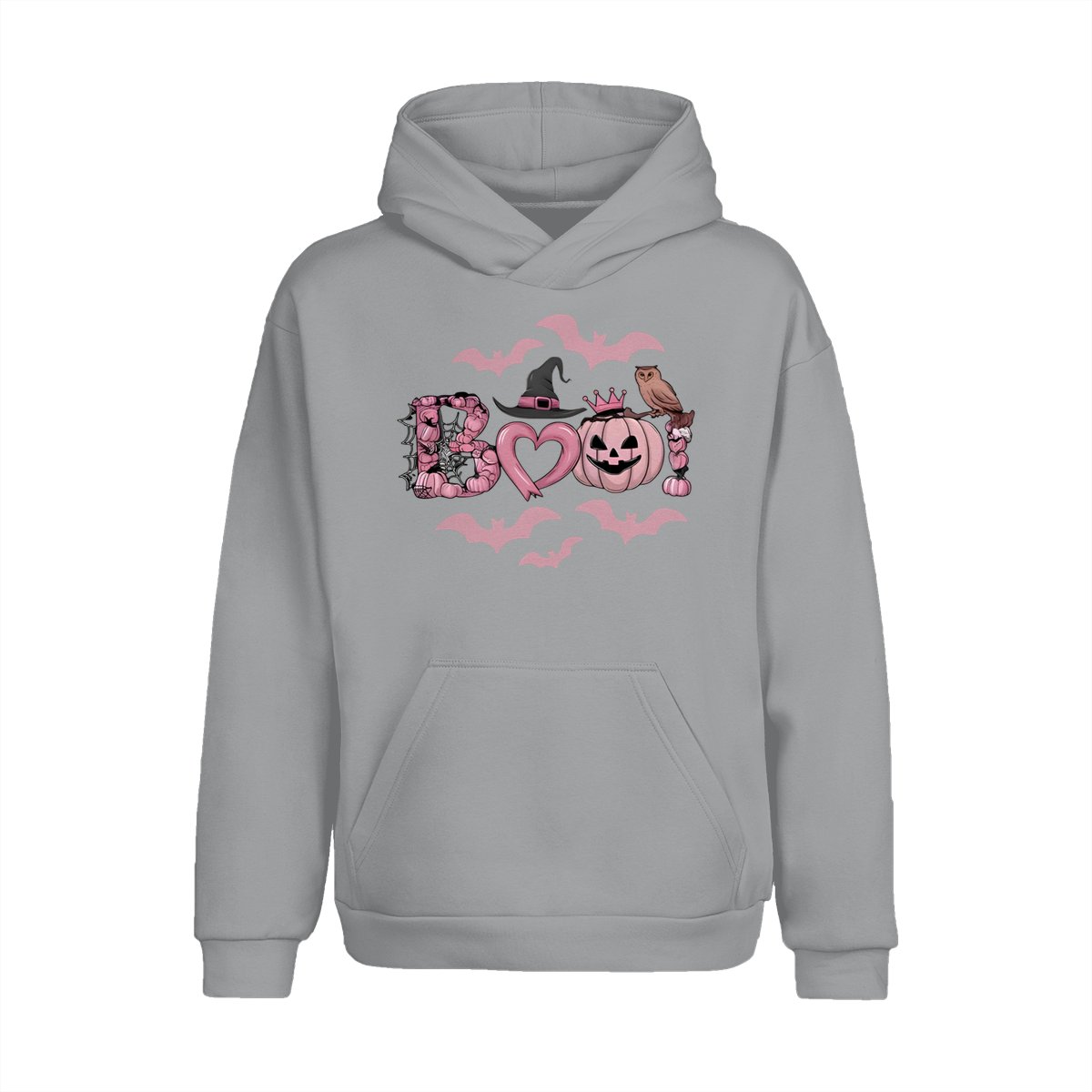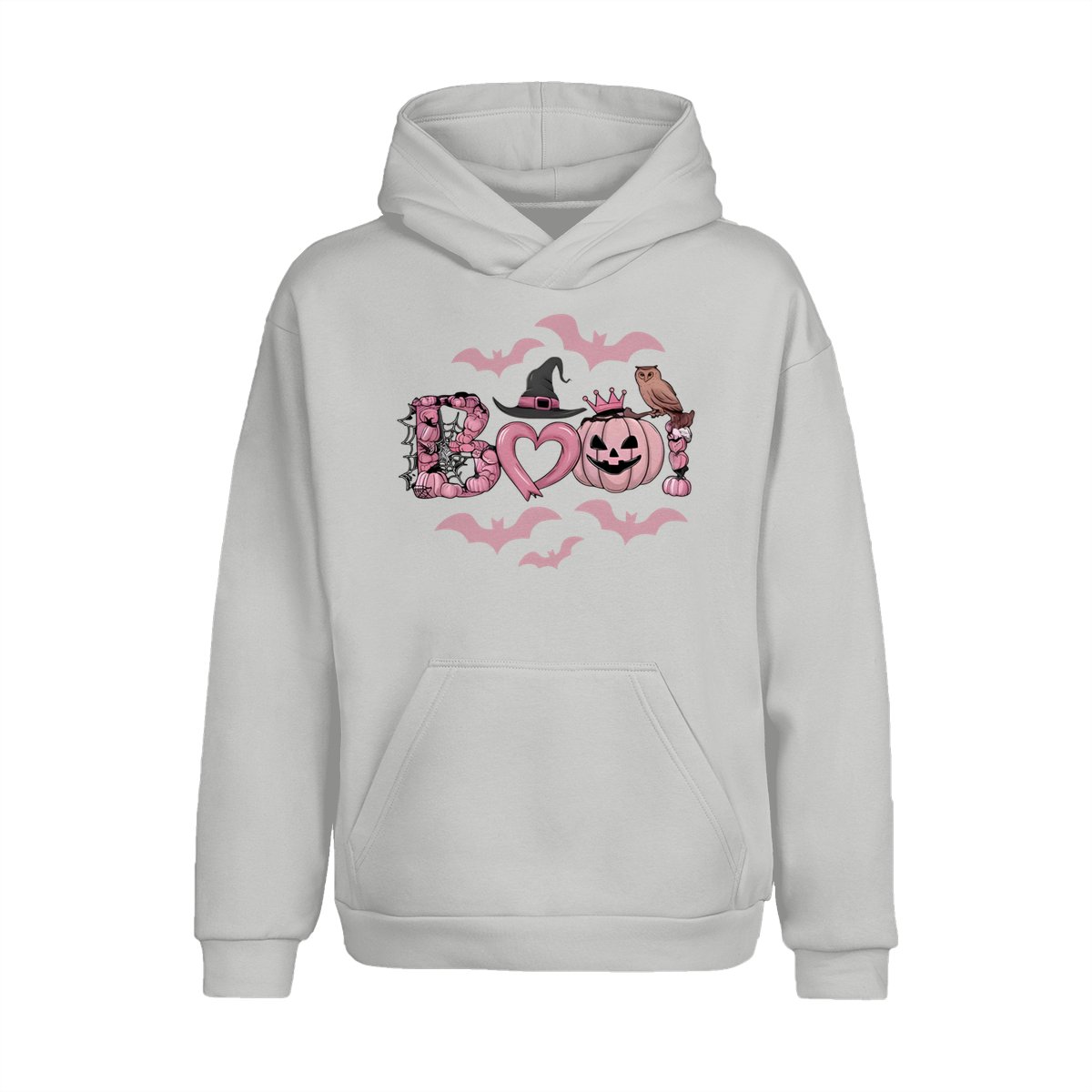Pink Halloween Boo Sweatshirt – Cute Pastel Pumpkin and Bat Graphic with Witch Hat, Owl, and Crown