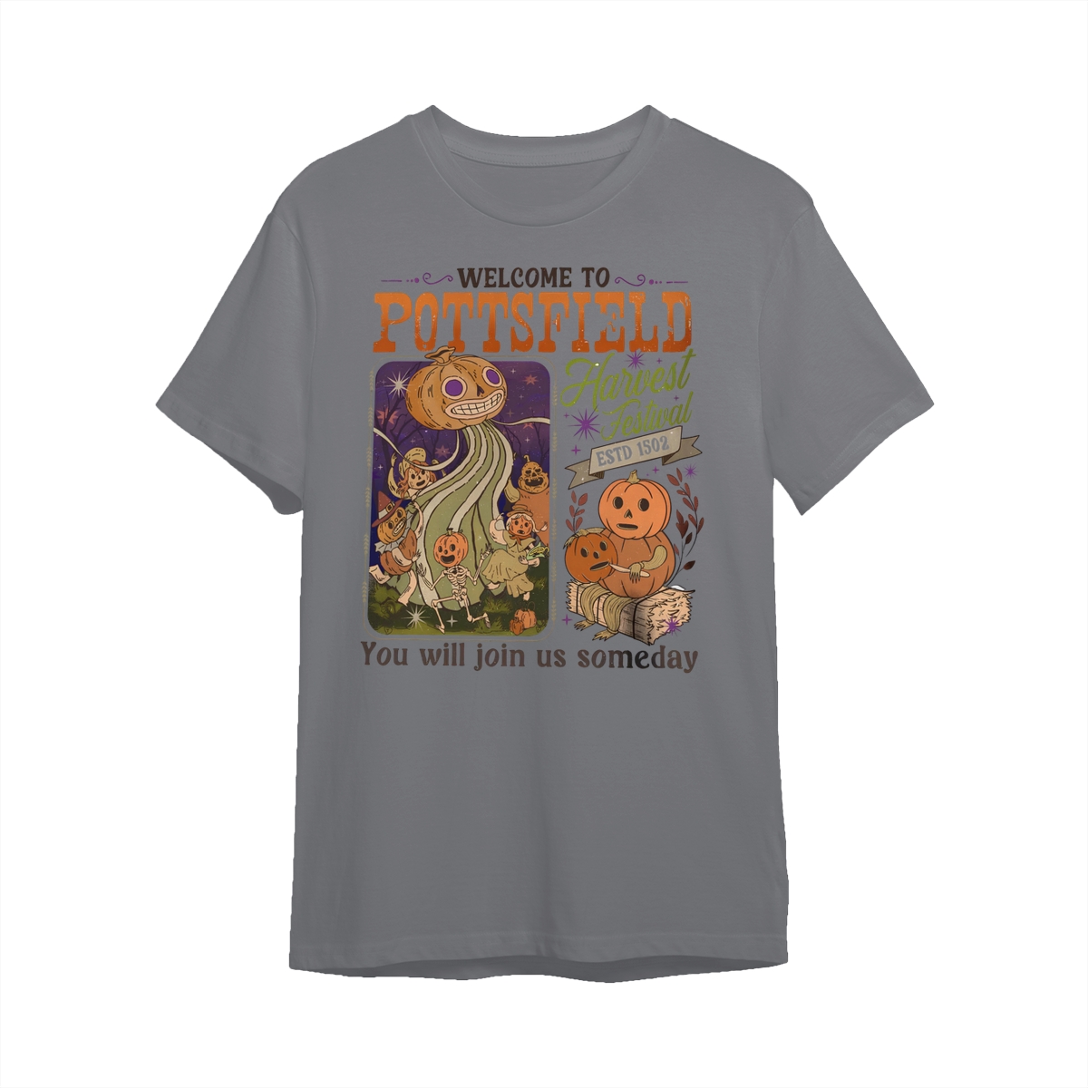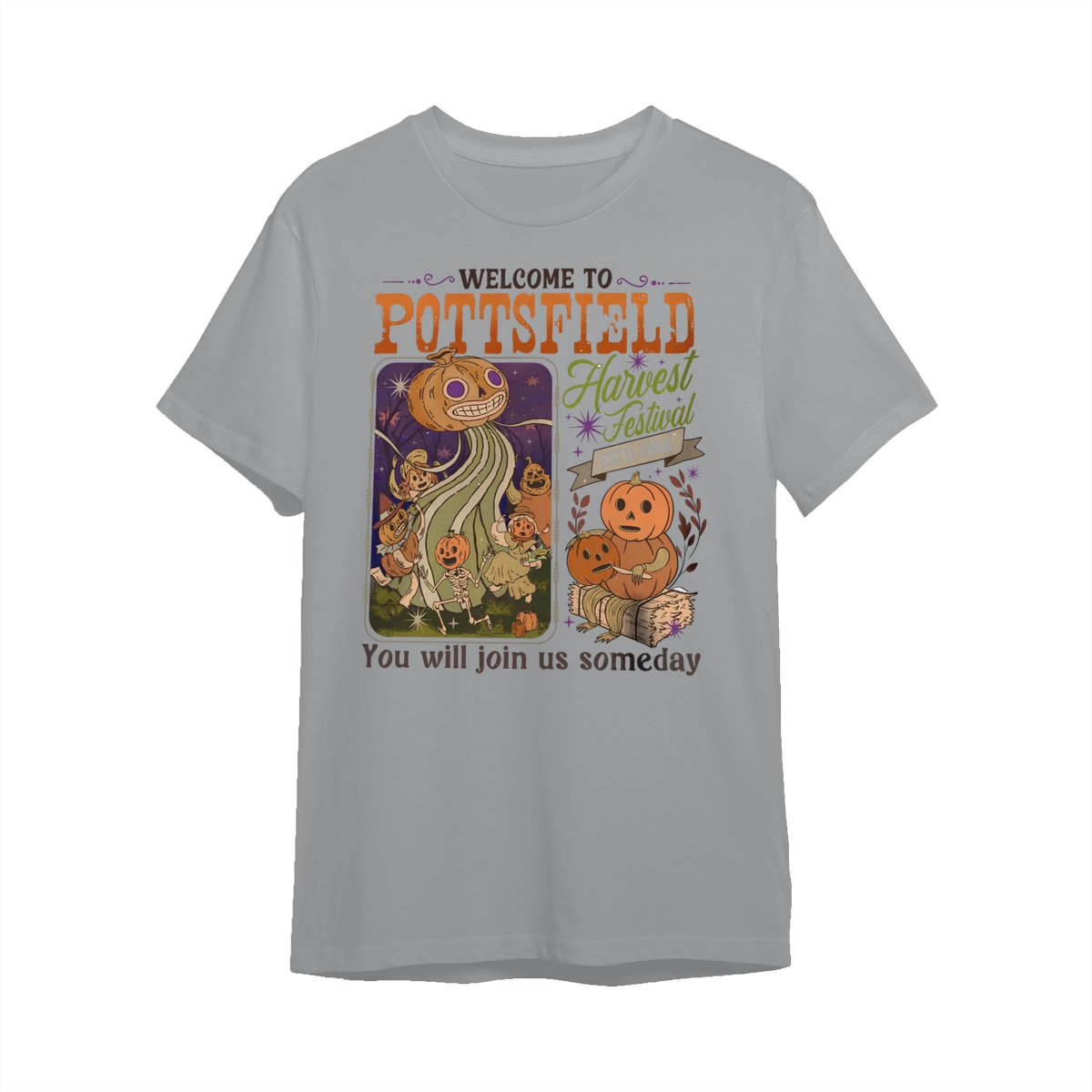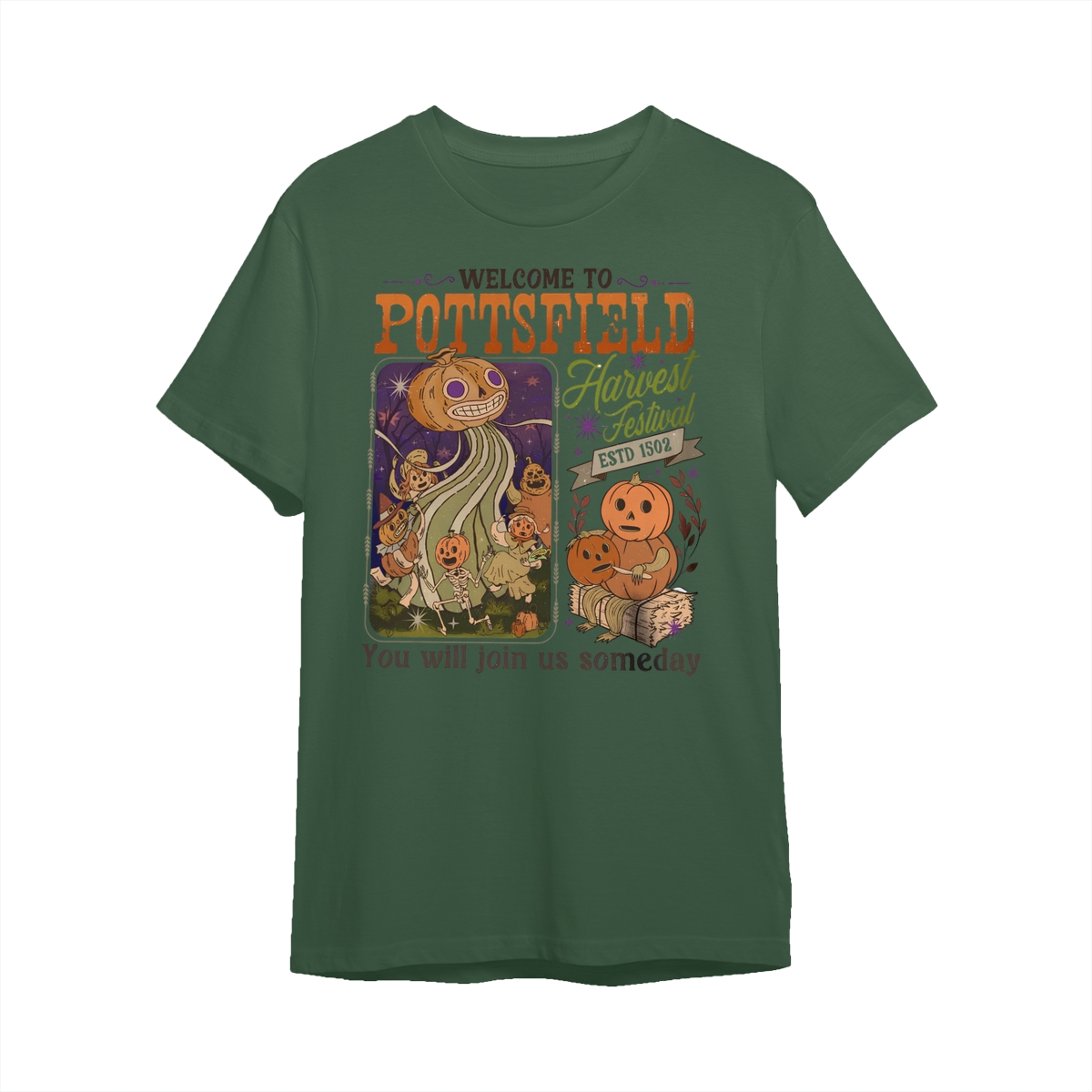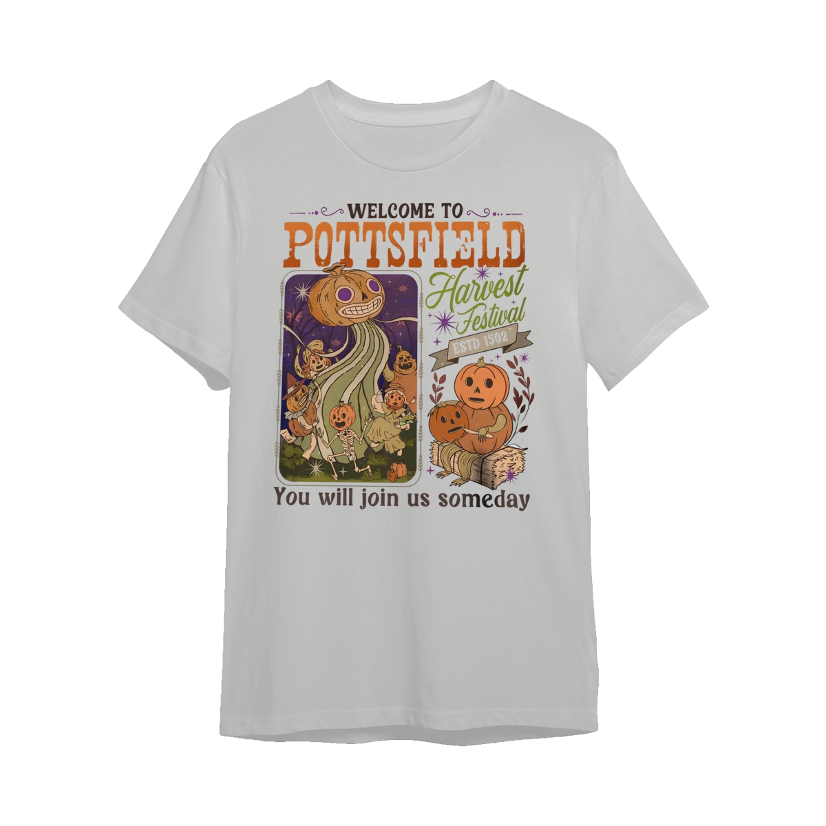 Pottsfield Harvest Festival T-Shirt, Halloween Skeleton Pumpkin Tee, Autumn Carver Shirt for Spooky Season