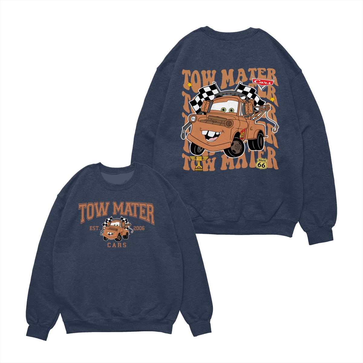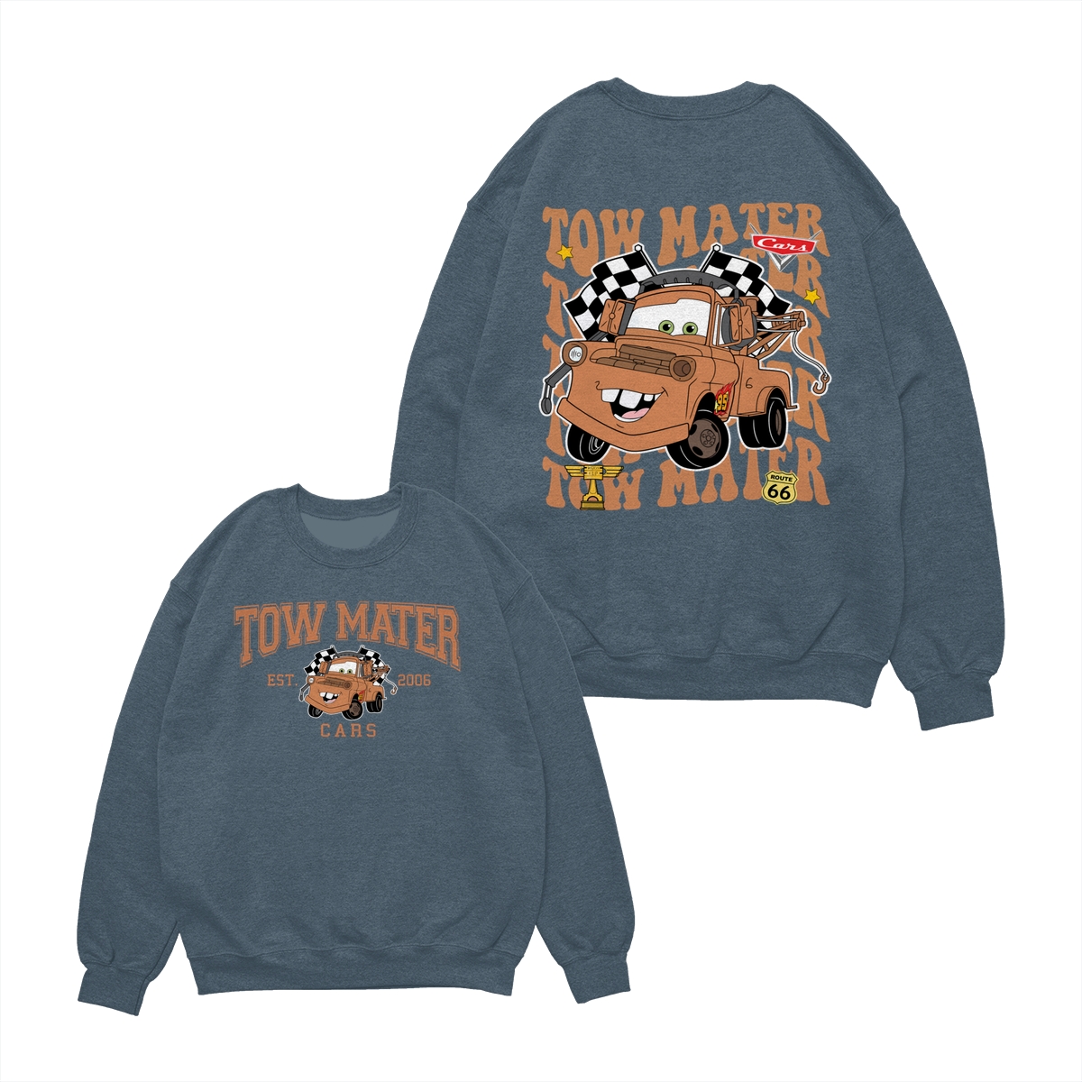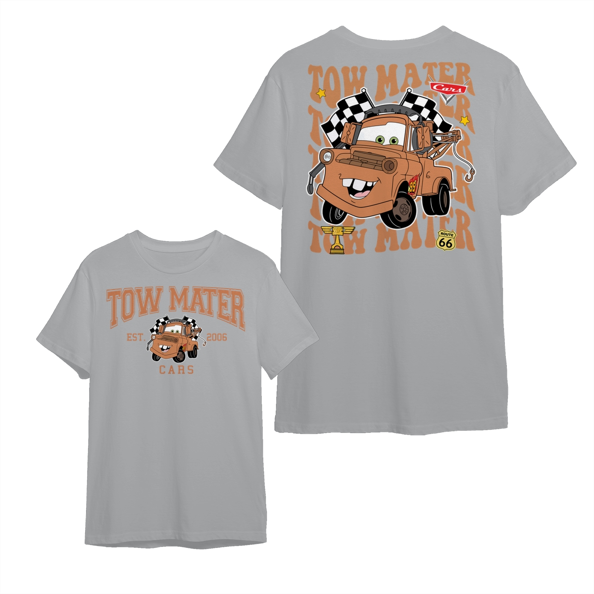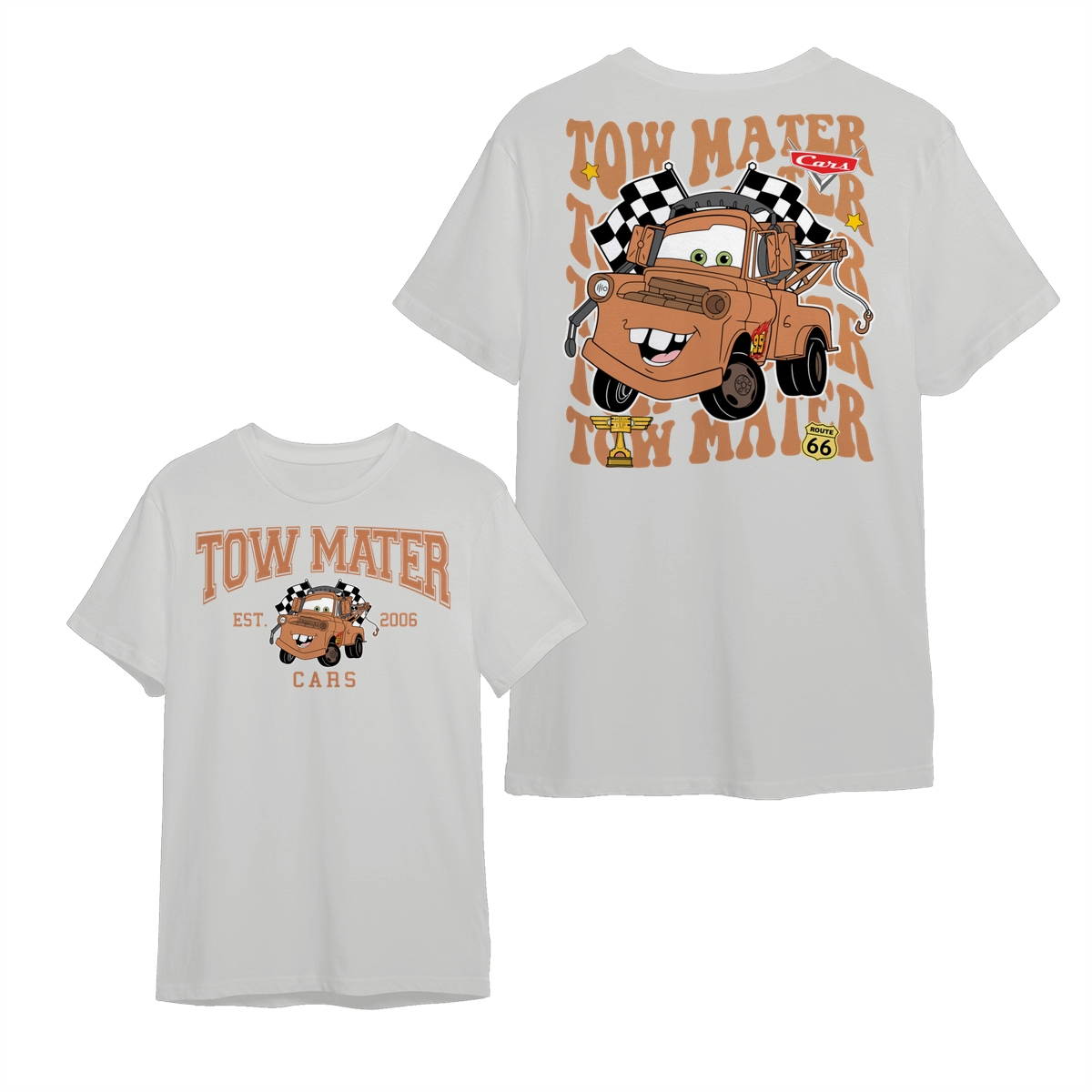 Racing Series Tow Mater Print T-Shirt, Fun Cartoon Car Graphic Tee, Streetwear Shirt for Cars Fans
