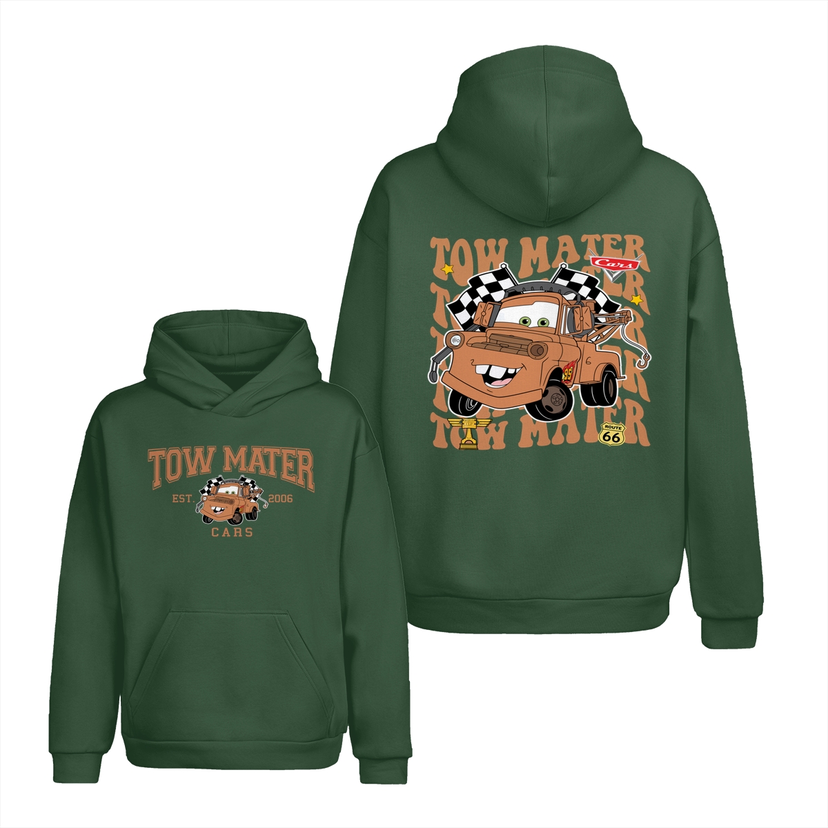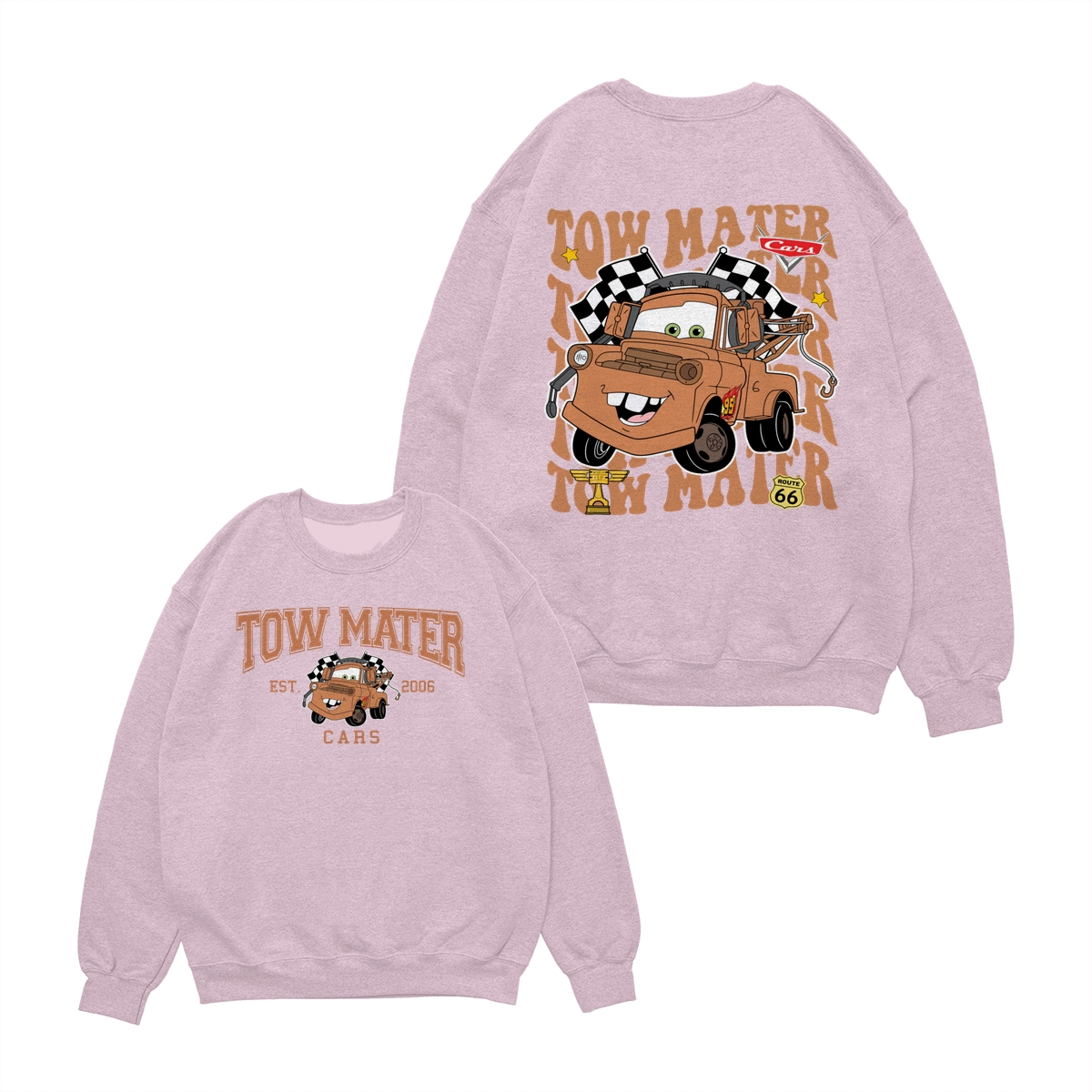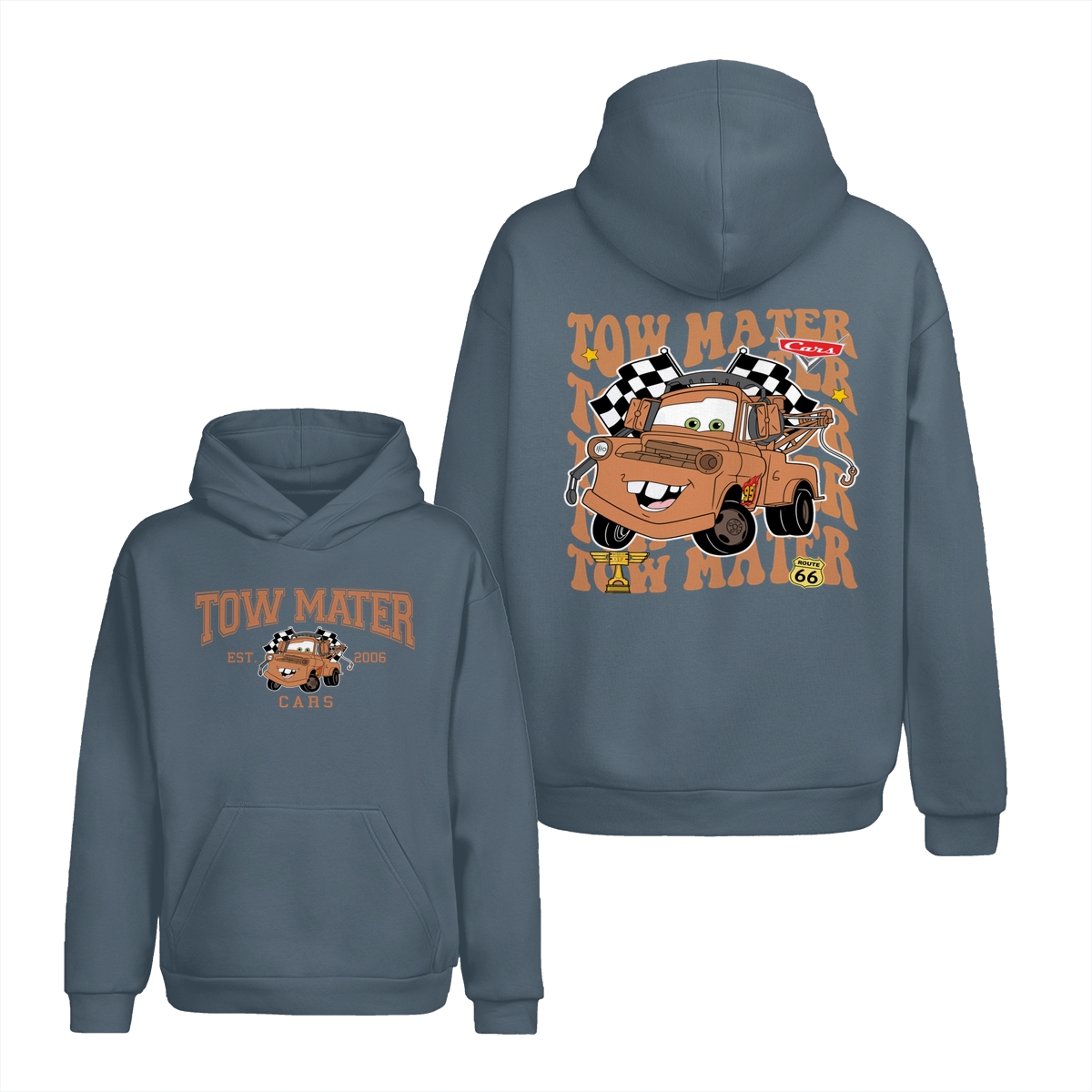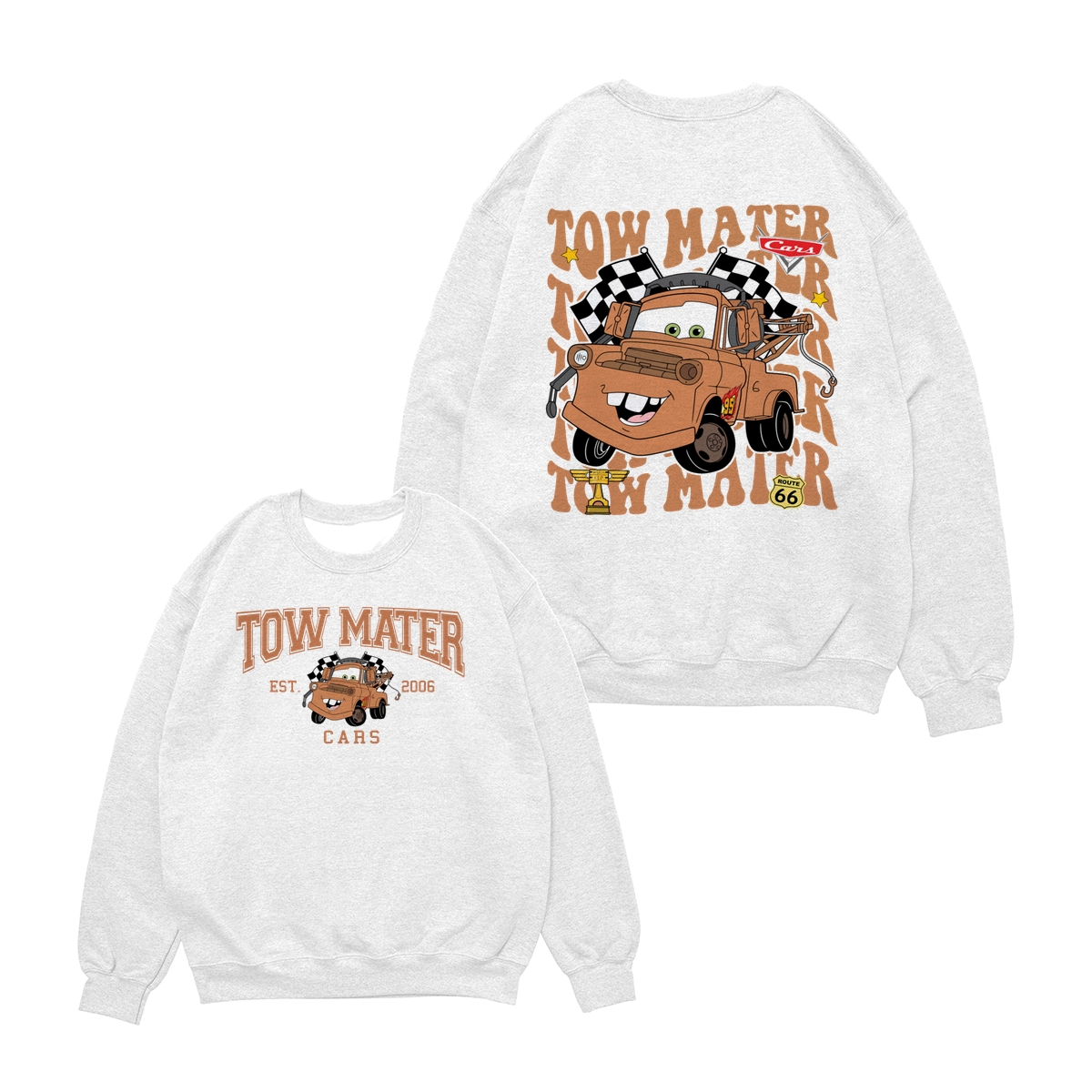 Racing Series Tow Mater Print T-Shirt, Fun Cartoon Car Graphic Tee, Streetwear Shirt for Cars Fans