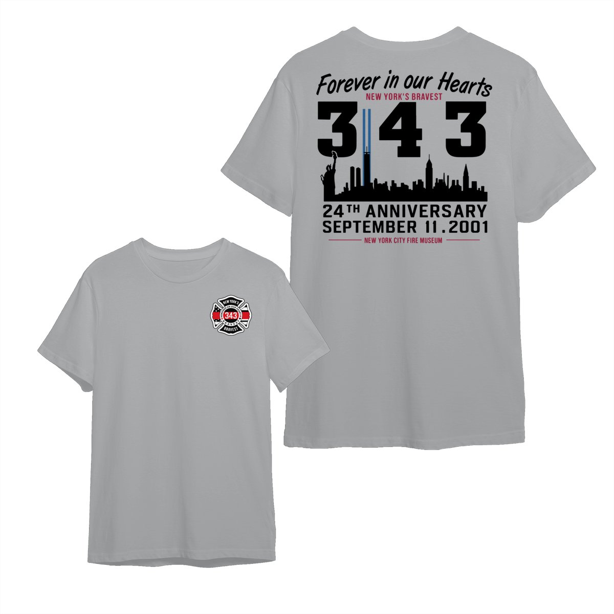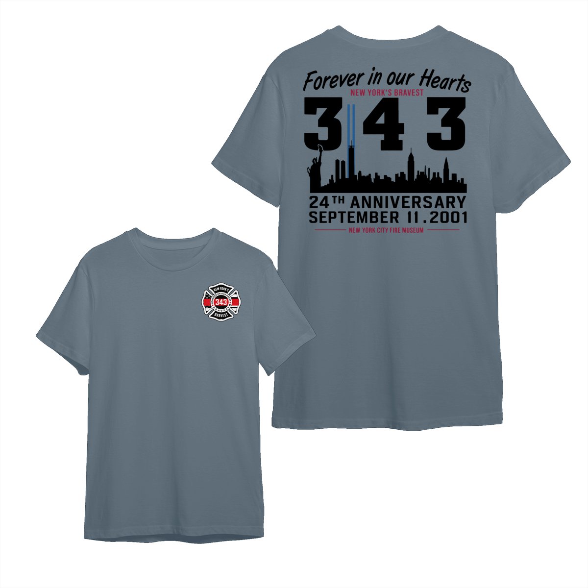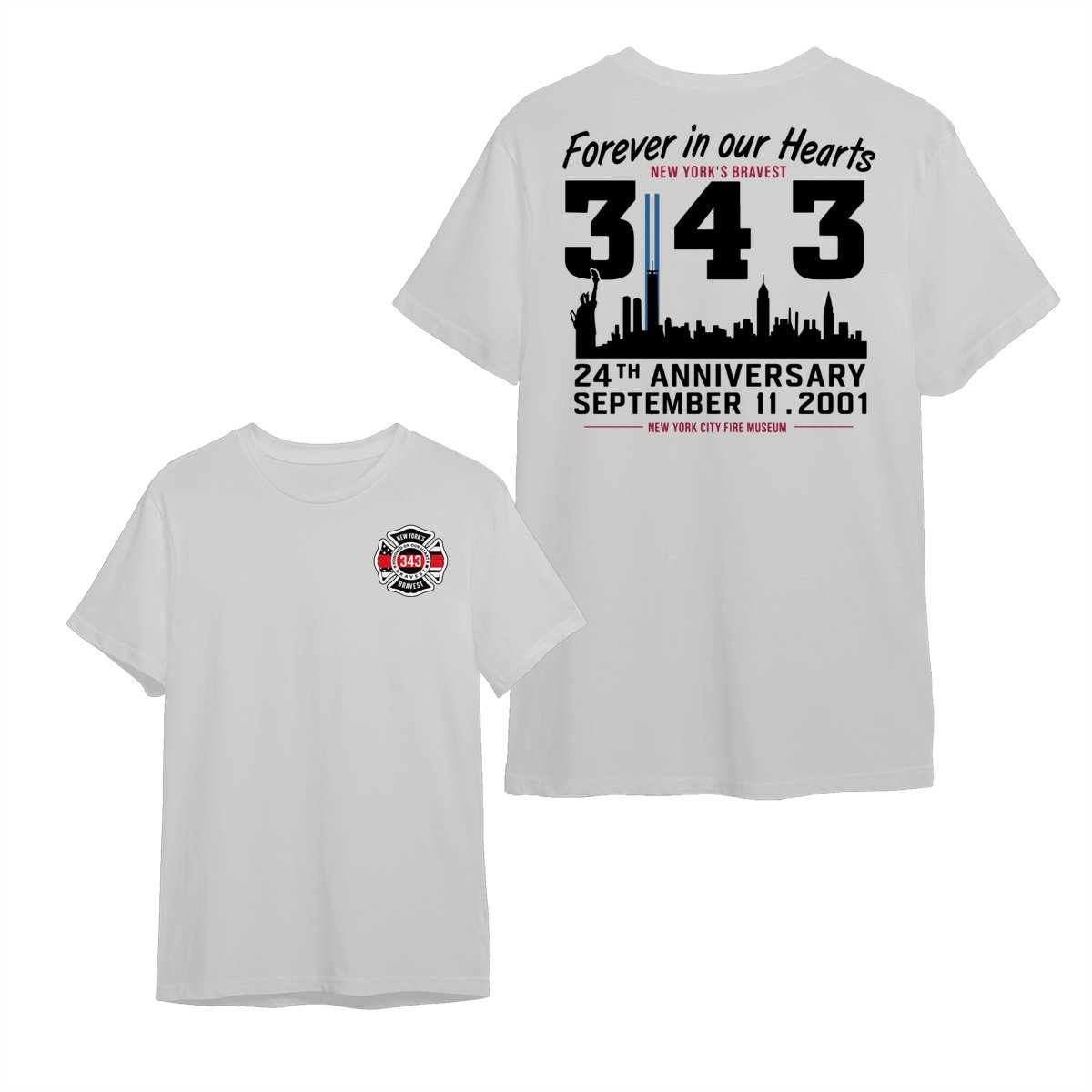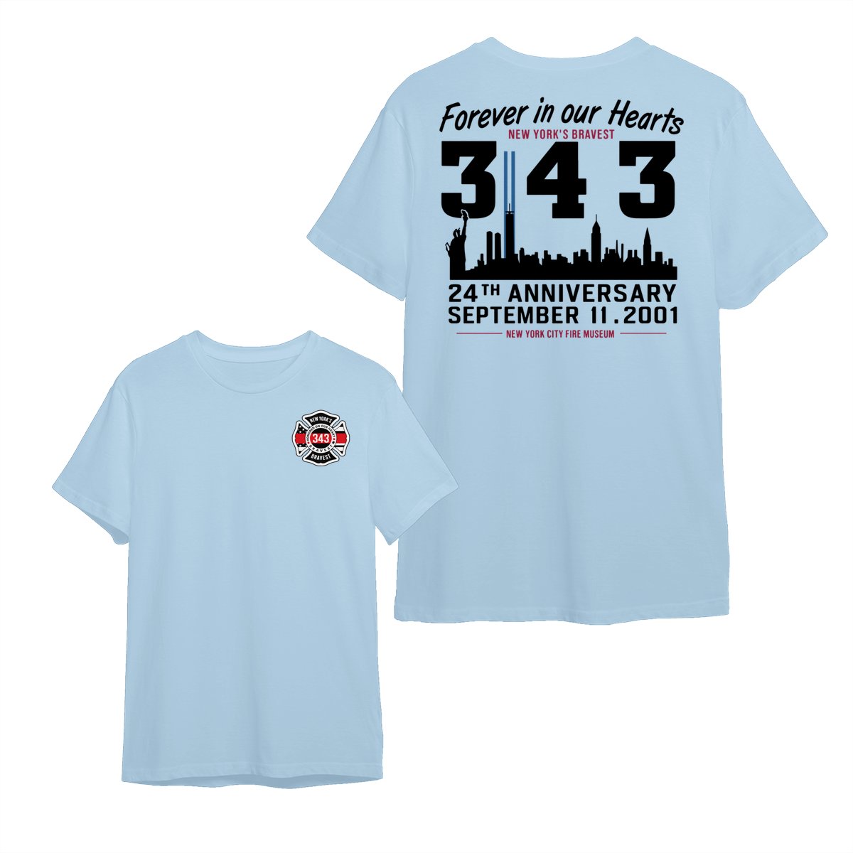 September 11 Tribute T Shirt – 343 Firefighters Honor And Remembrance Graphic , Forever In Our Hearts Quote , NYC Skyline Memorial Art , 24th Anniversary Commemorative Tee , Patriotic American Pride Shirt Cotton Fabric Menswear Top Sport Soft Classic