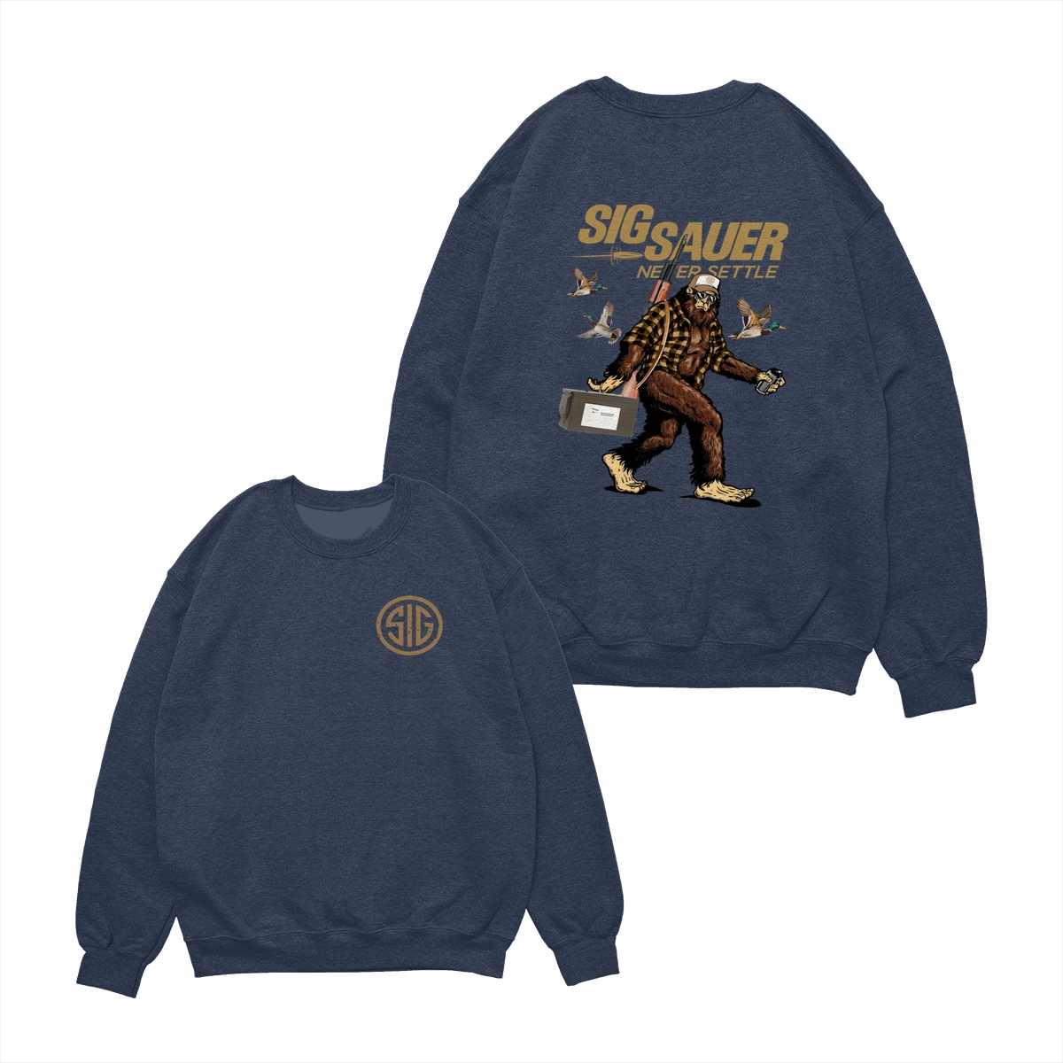 SIG SAUER Bigfoot T-Shirt – Funny Tactical Tee with Sasquatch & Ducks Graphic, “Never Settle” Outdoor Hunting Shirt for Men