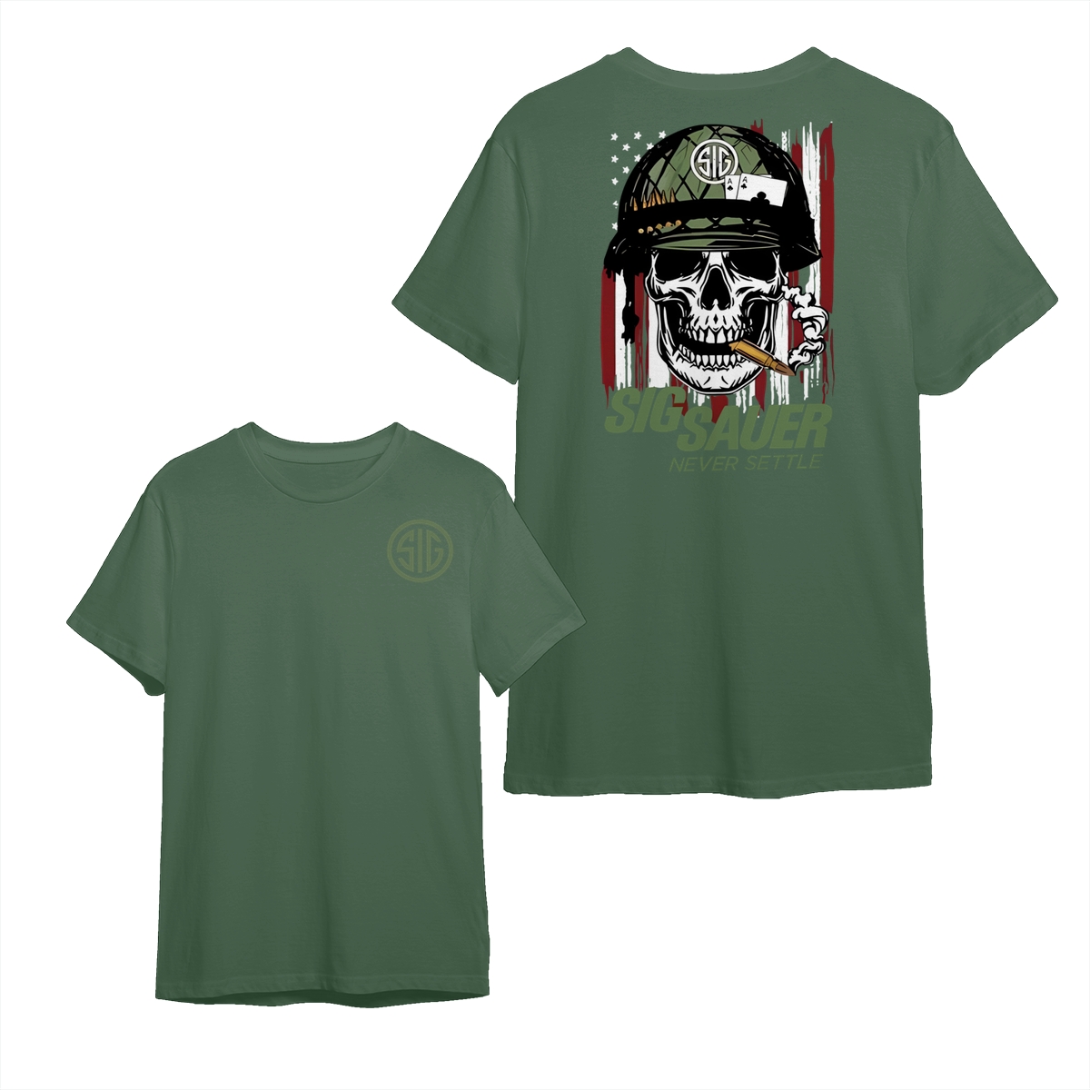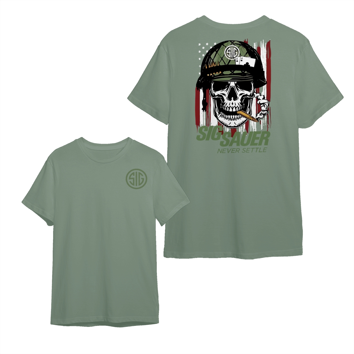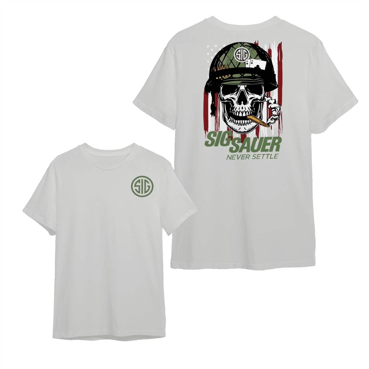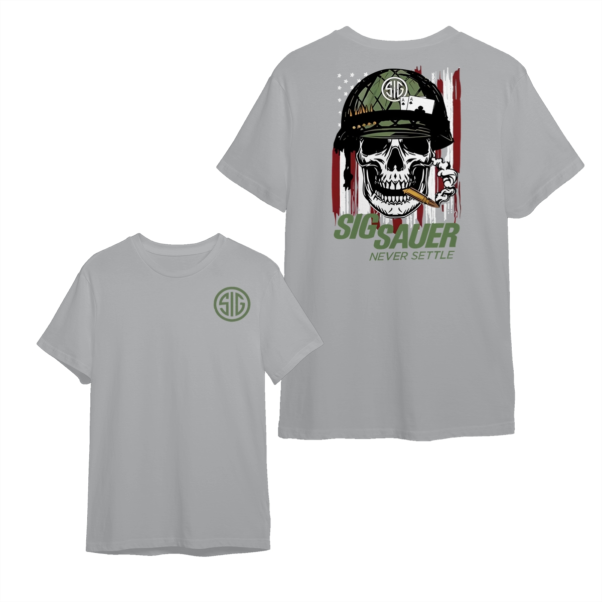 SIG Sauer T-Shirt – Bold Skull and Military Helmet Design, ‘Never Settle’ Theme – Unisex, Ideal for Gun Enthusiasts and Casual Outfits. Menswear Tops