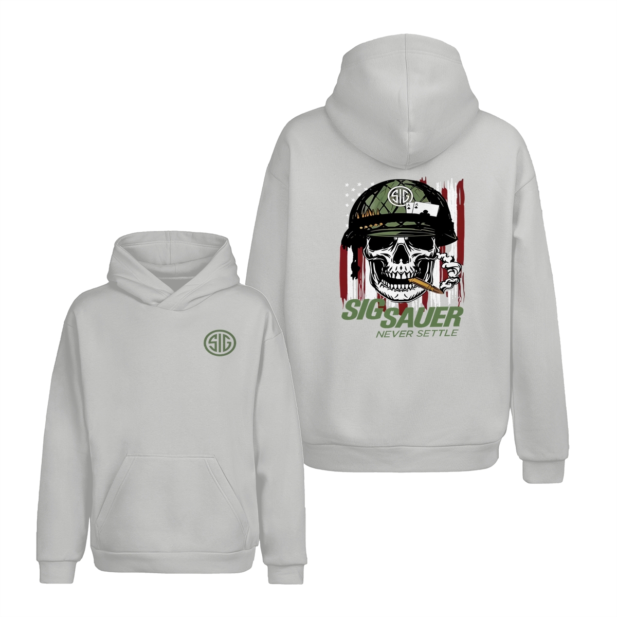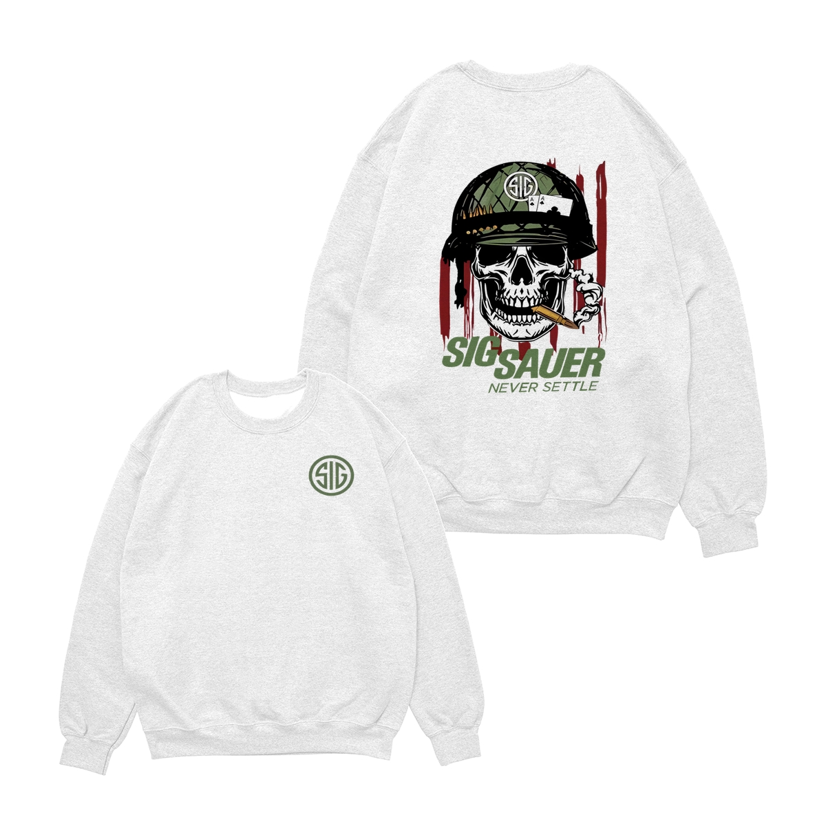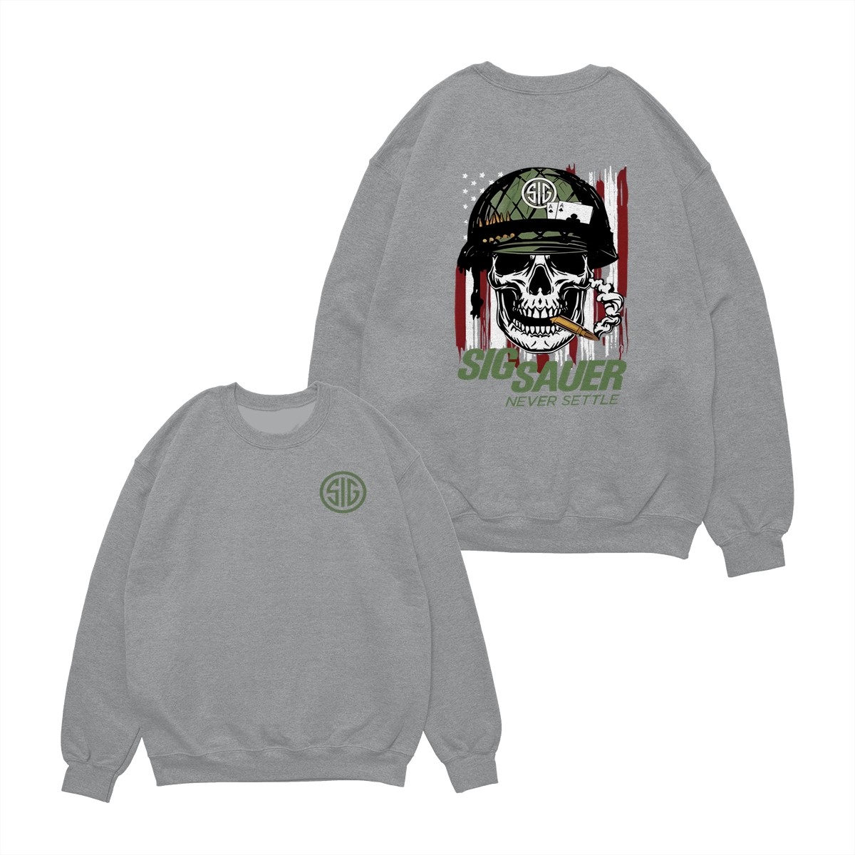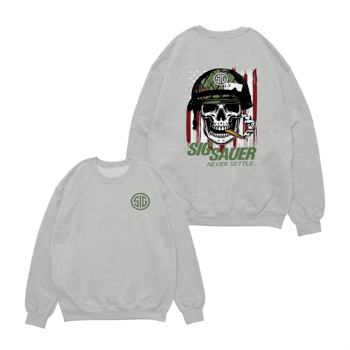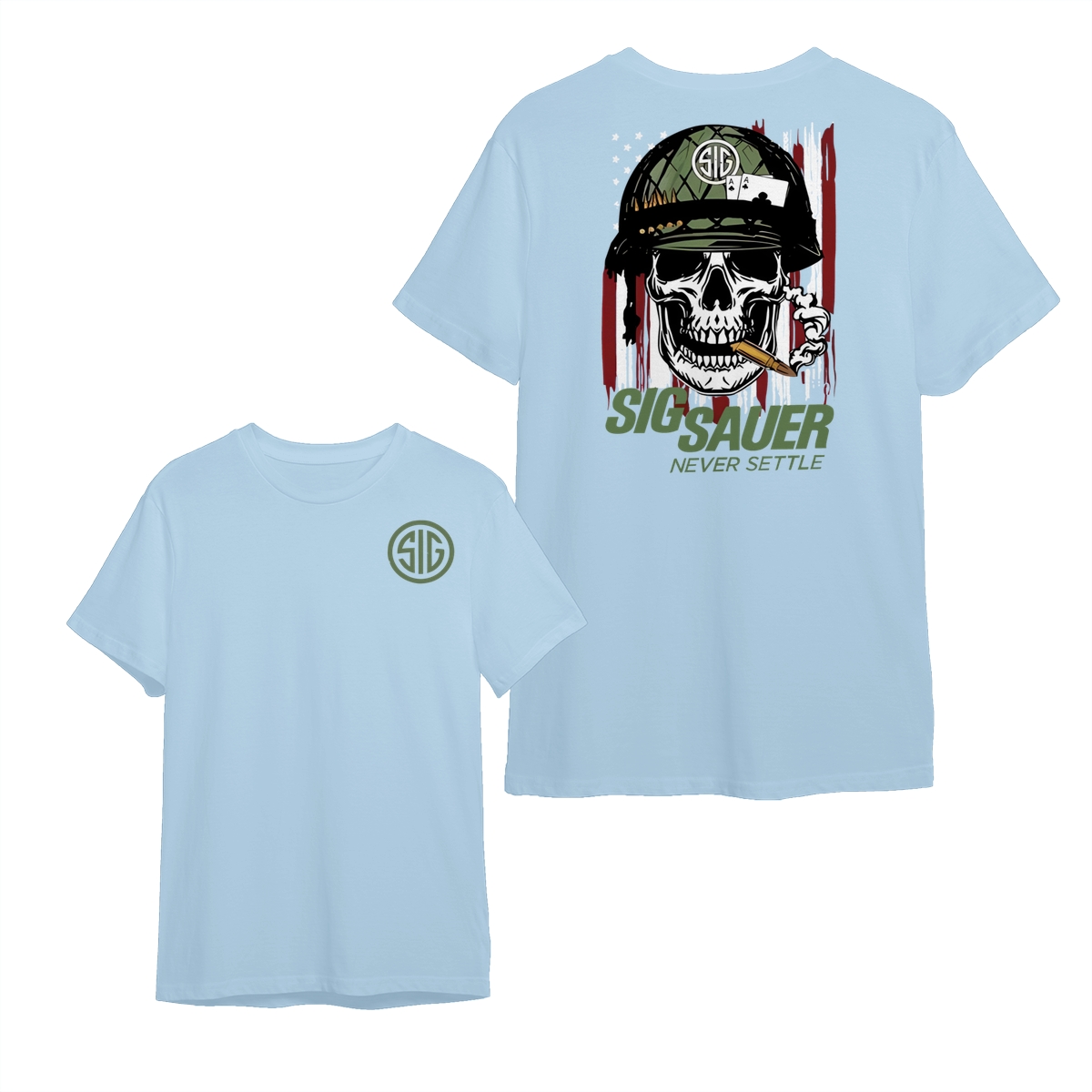 SIG Sauer T-Shirt – Bold Skull and Military Helmet Design, ‘Never Settle’ Theme – Unisex, Ideal for Gun Enthusiasts and Casual Outfits. Menswear Tops