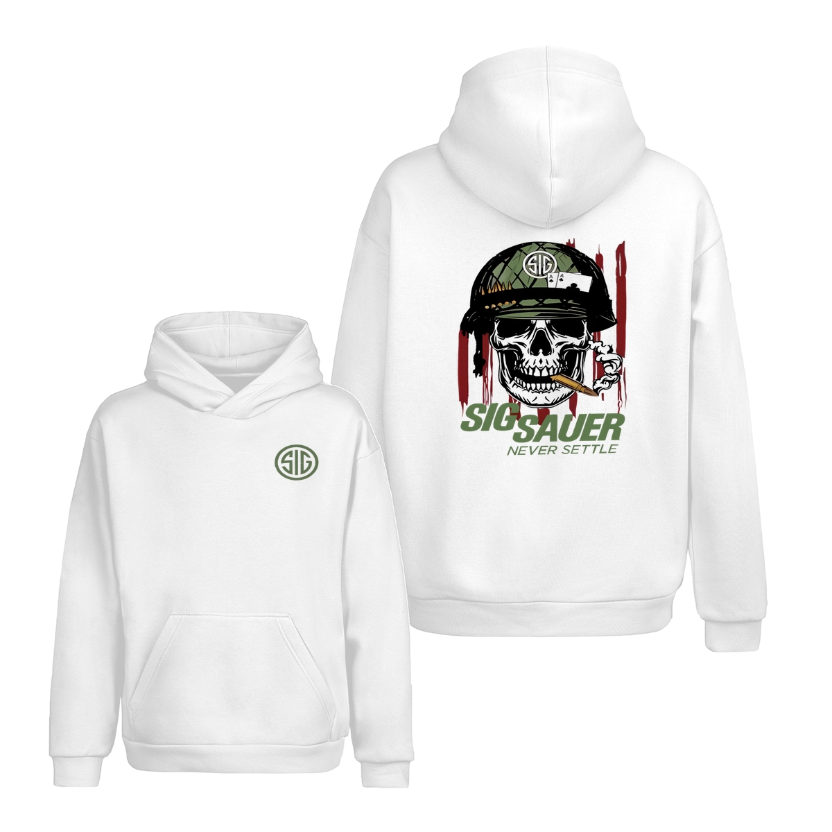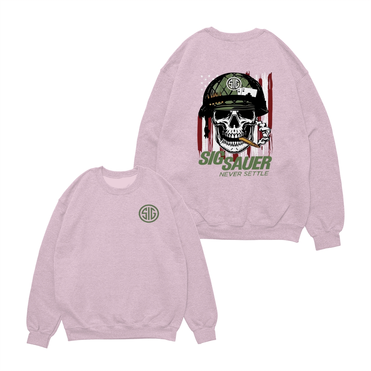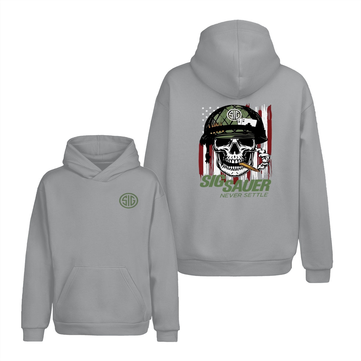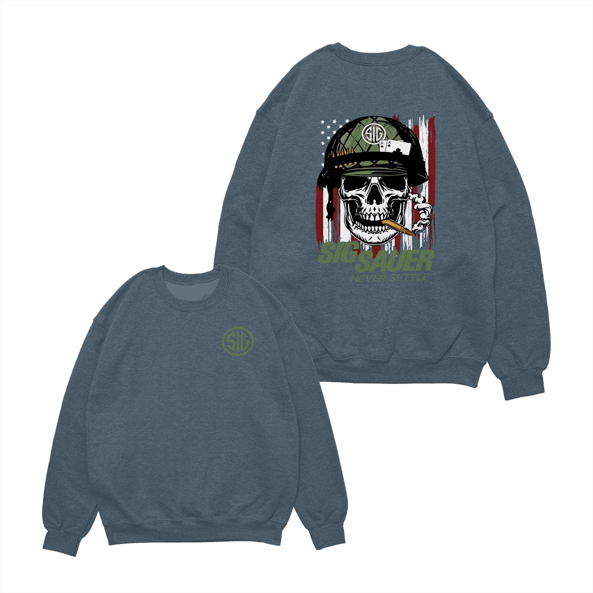 SIG Sauer T-Shirt – Bold Skull and Military Helmet Design, ‘Never Settle’ Theme – Unisex, Ideal for Gun Enthusiasts and Casual Outfits. Menswear Tops