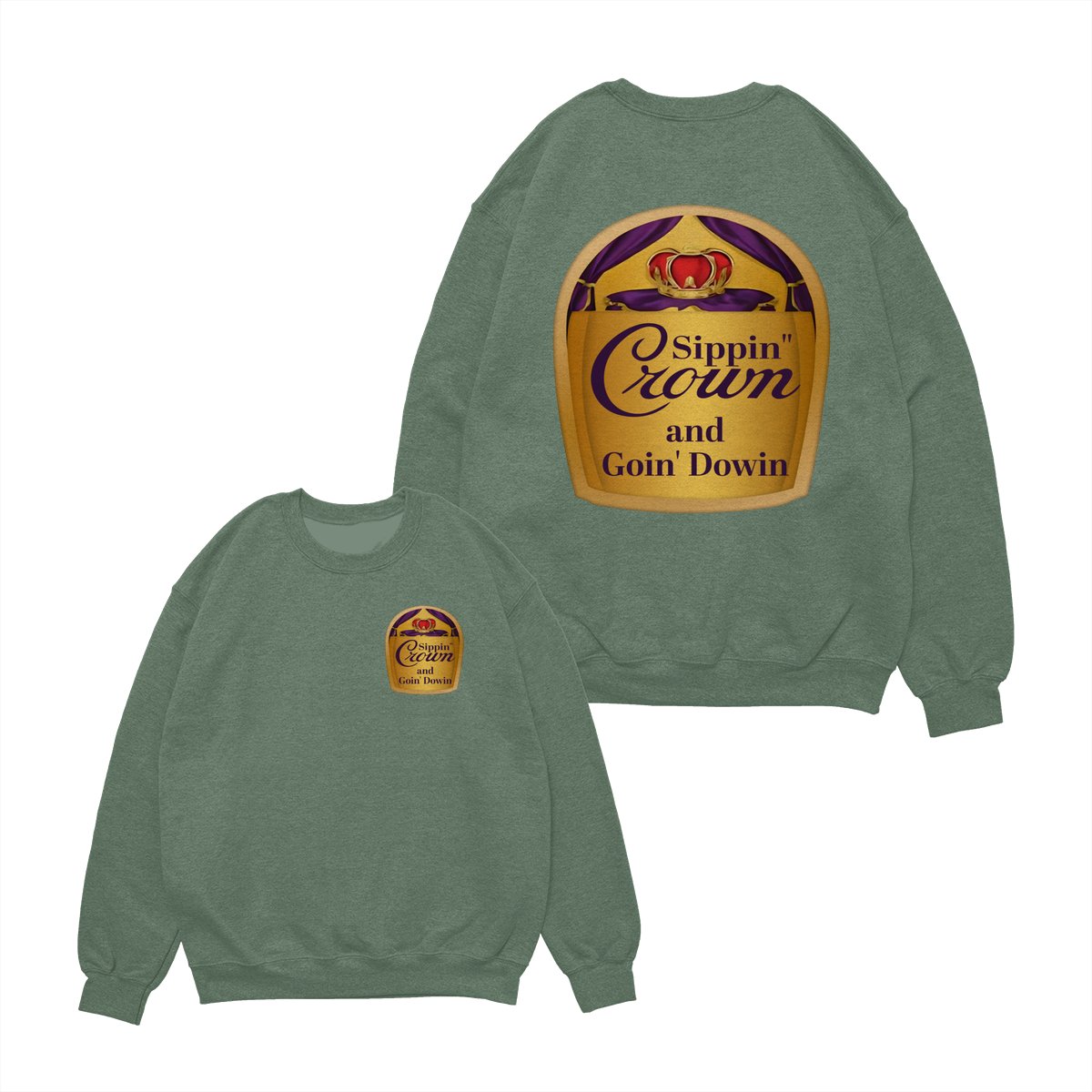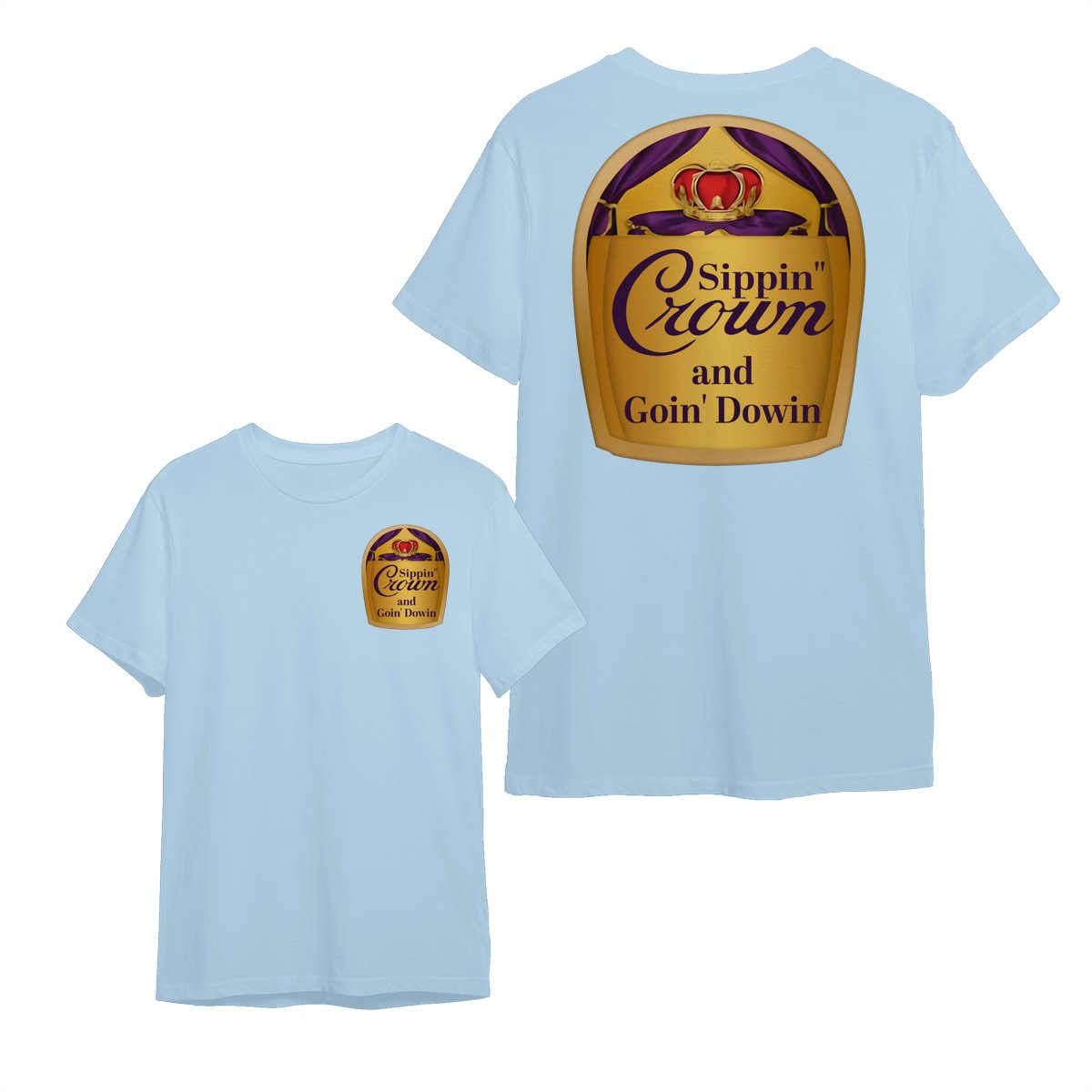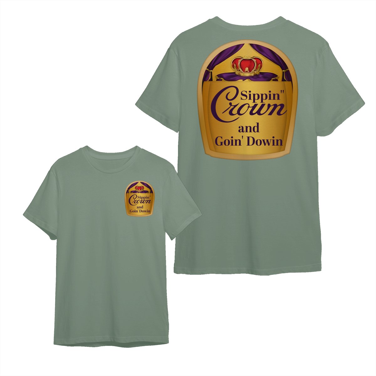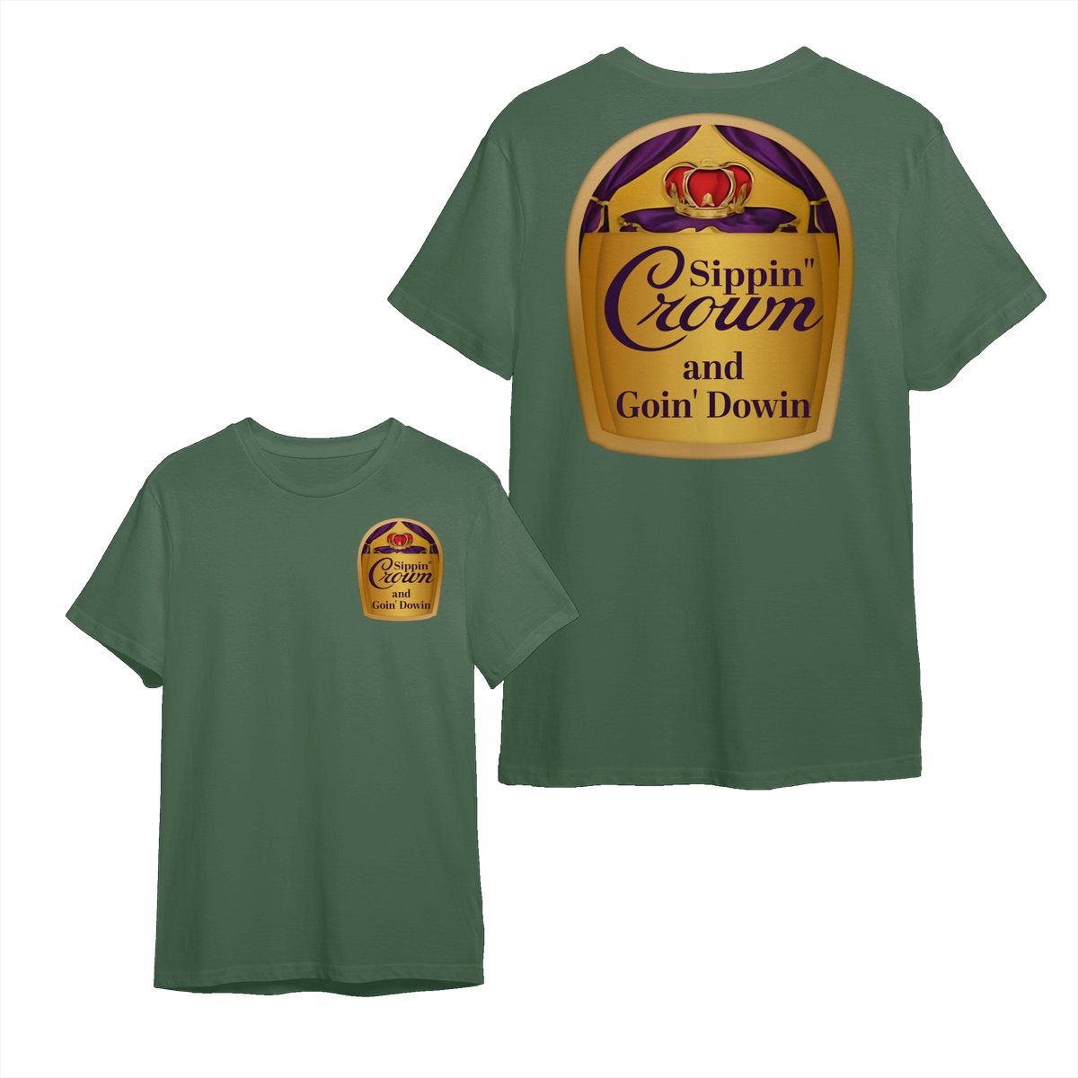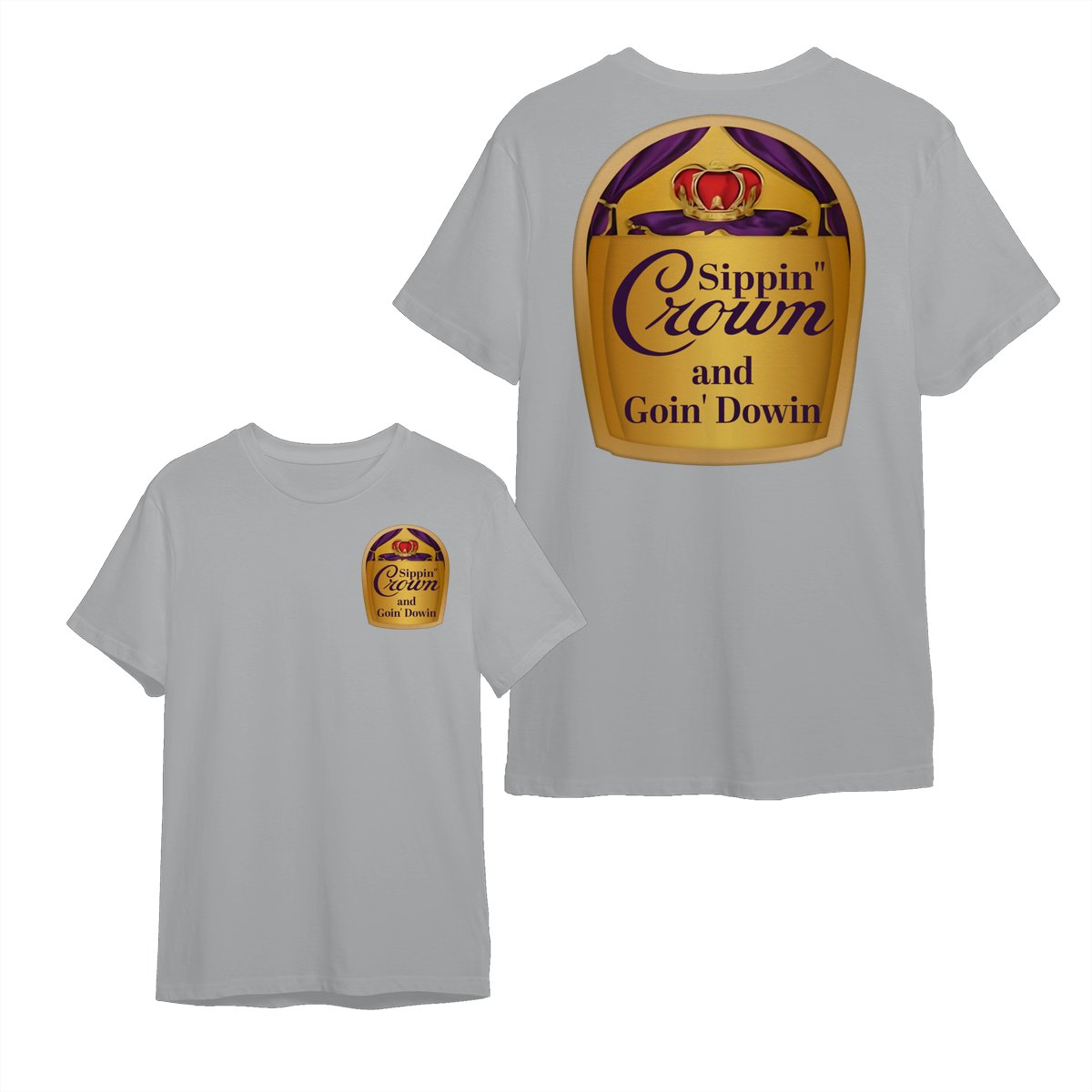 Sippin’ Crown And Goin’ Down T-Shirt – Funny Whiskey Lover Graphic Tee, Crown Bottle Design Shirt For Parties, Tailgates, And Casual Nights Out